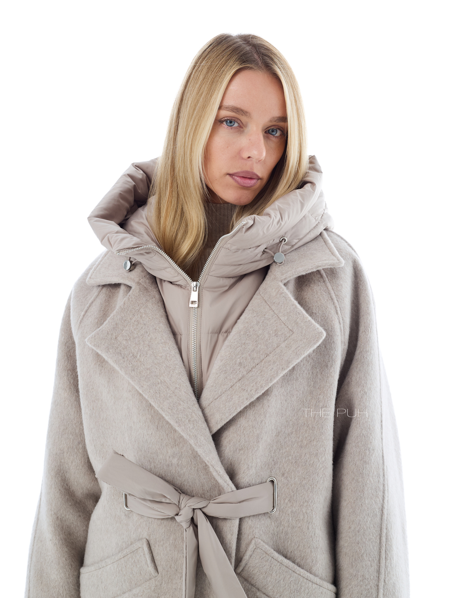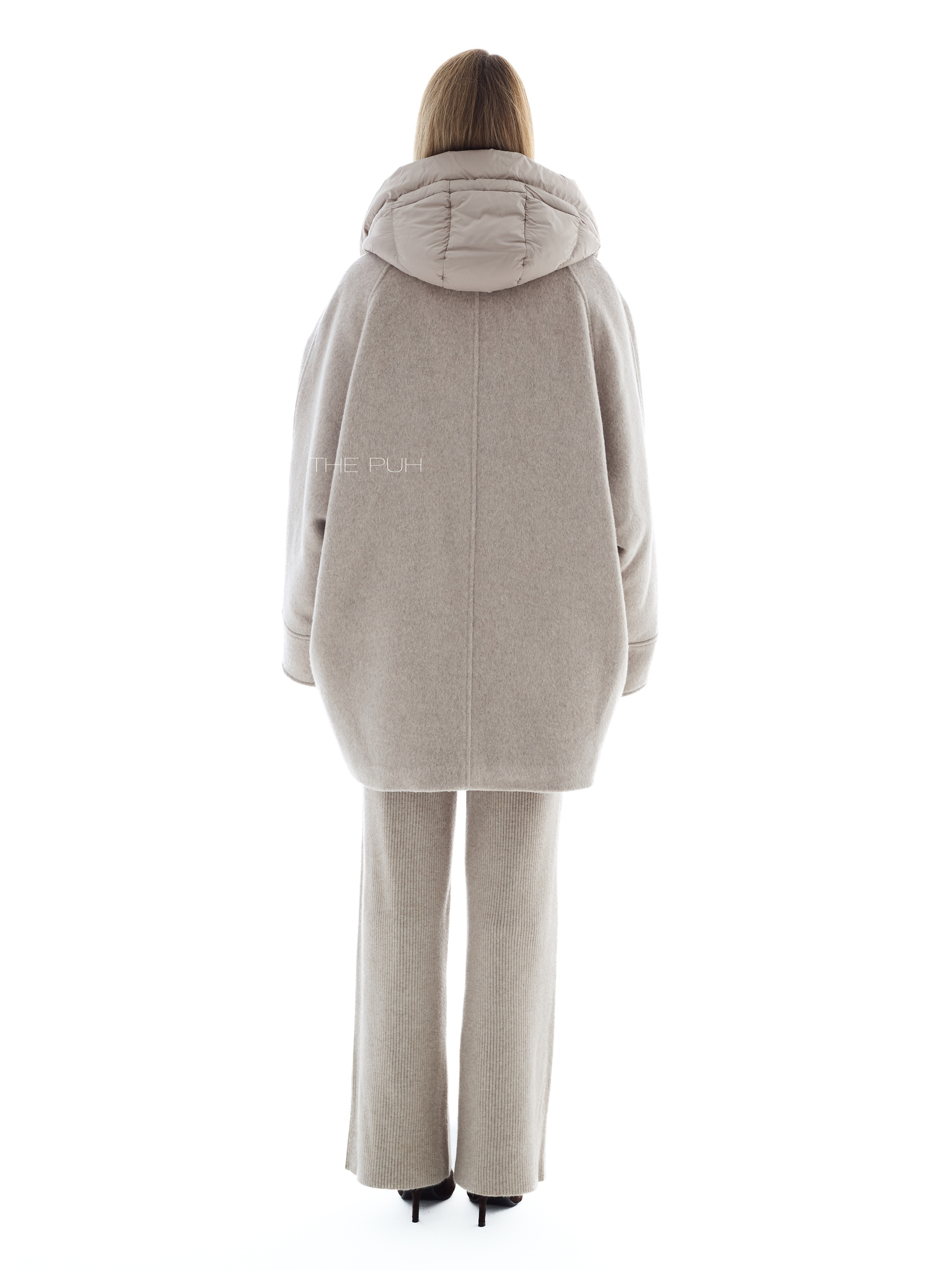 Бежевое пальто силуэта "летучая мышь" со съемной манишкой и поясом – стильная модель, где утепленная манишка с капюшоном защищает от непогоды, а элегантный пояс подчеркивает силуэт. Теплый пуховый наполнитель и лаконичный дизайн делают его универсальным выбором как для ранней, так и для поздней осени.