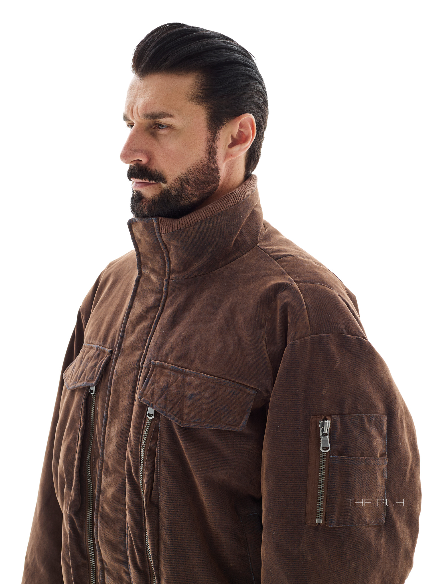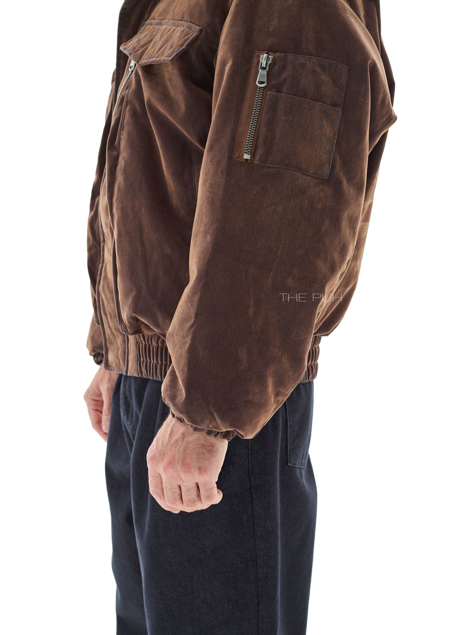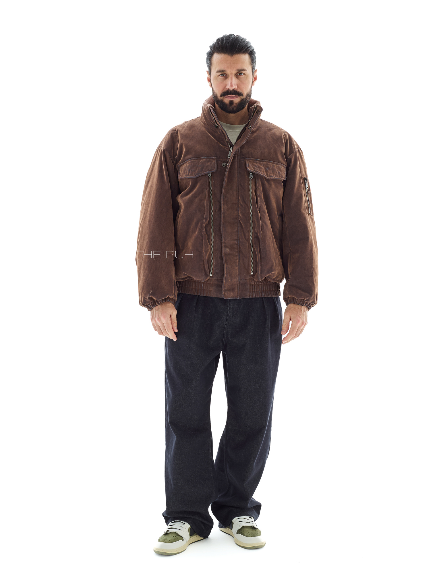 Объемный бомбер на молнии выполнен из шоколадного денима с эффектом варки. Модель утеплена гусиным пухом и декорирована стегаными клапанами и карманами на молниях спереди.