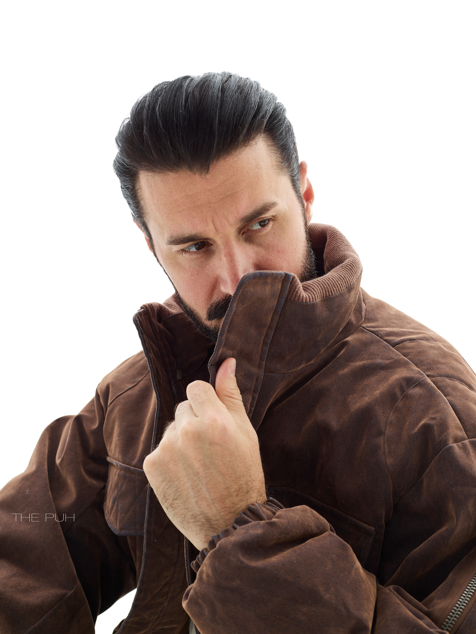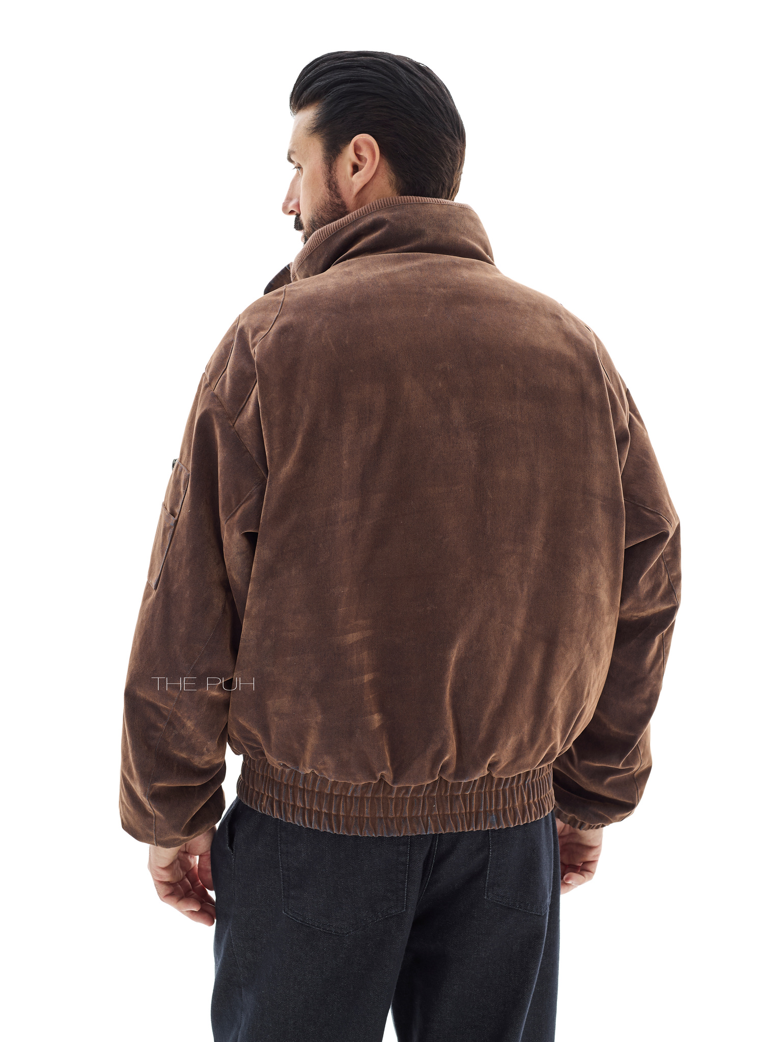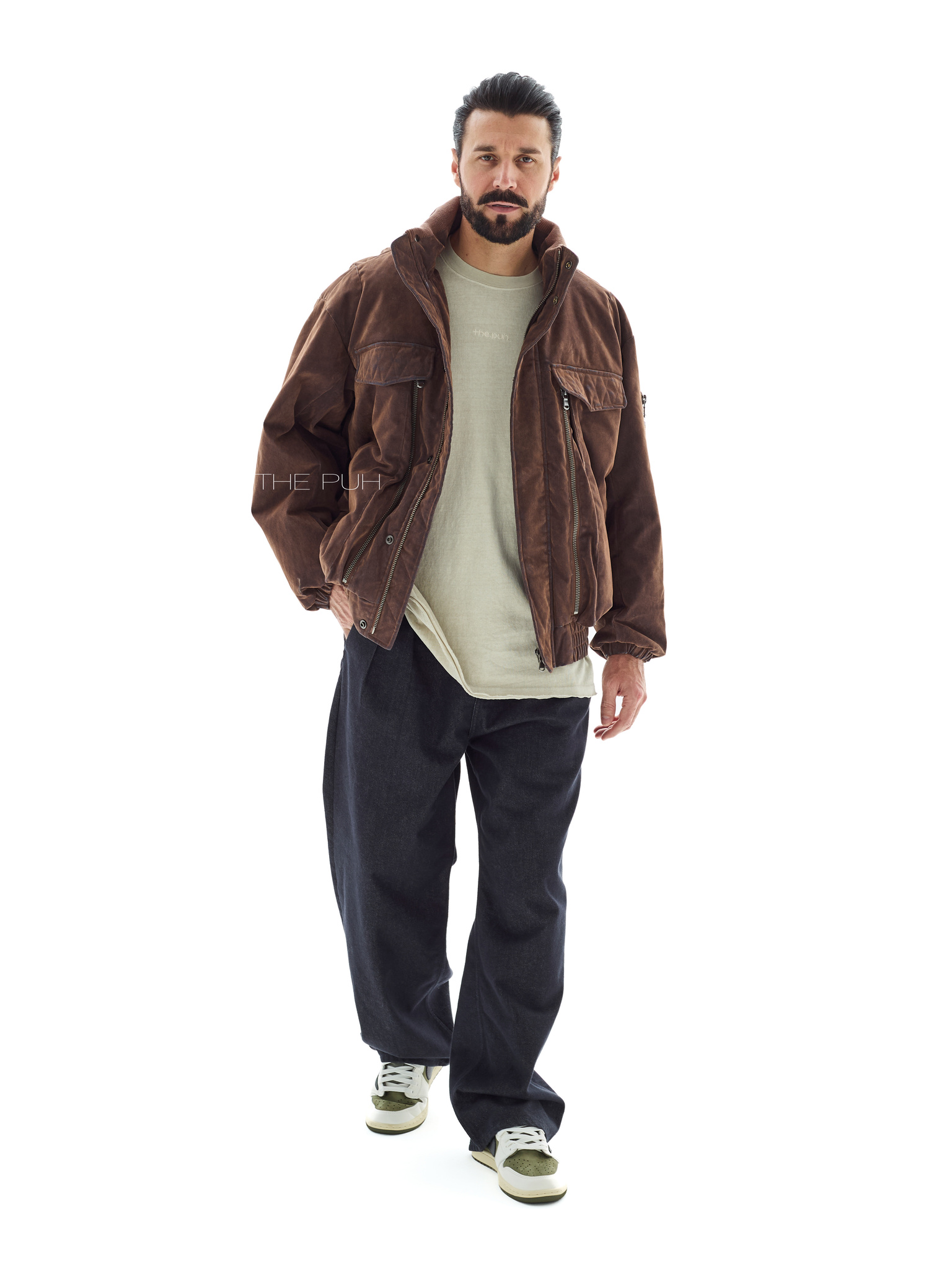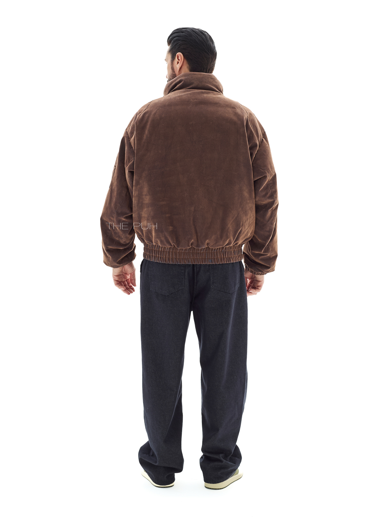 Объемный бомбер на молнии выполнен из шоколадного денима с эффектом варки. Модель утеплена гусиным пухом и декорирована стегаными клапанами и карманами на молниях спереди.