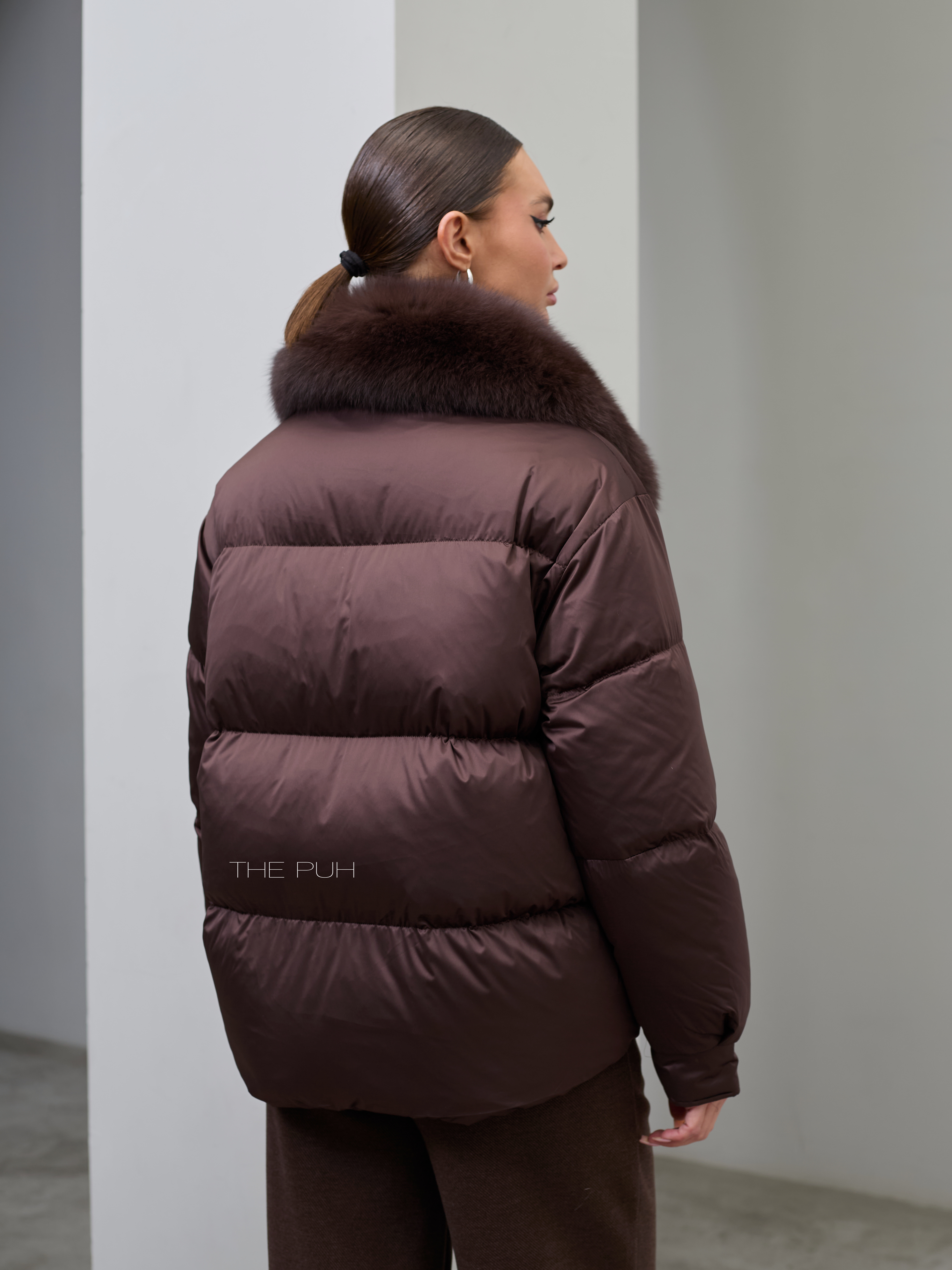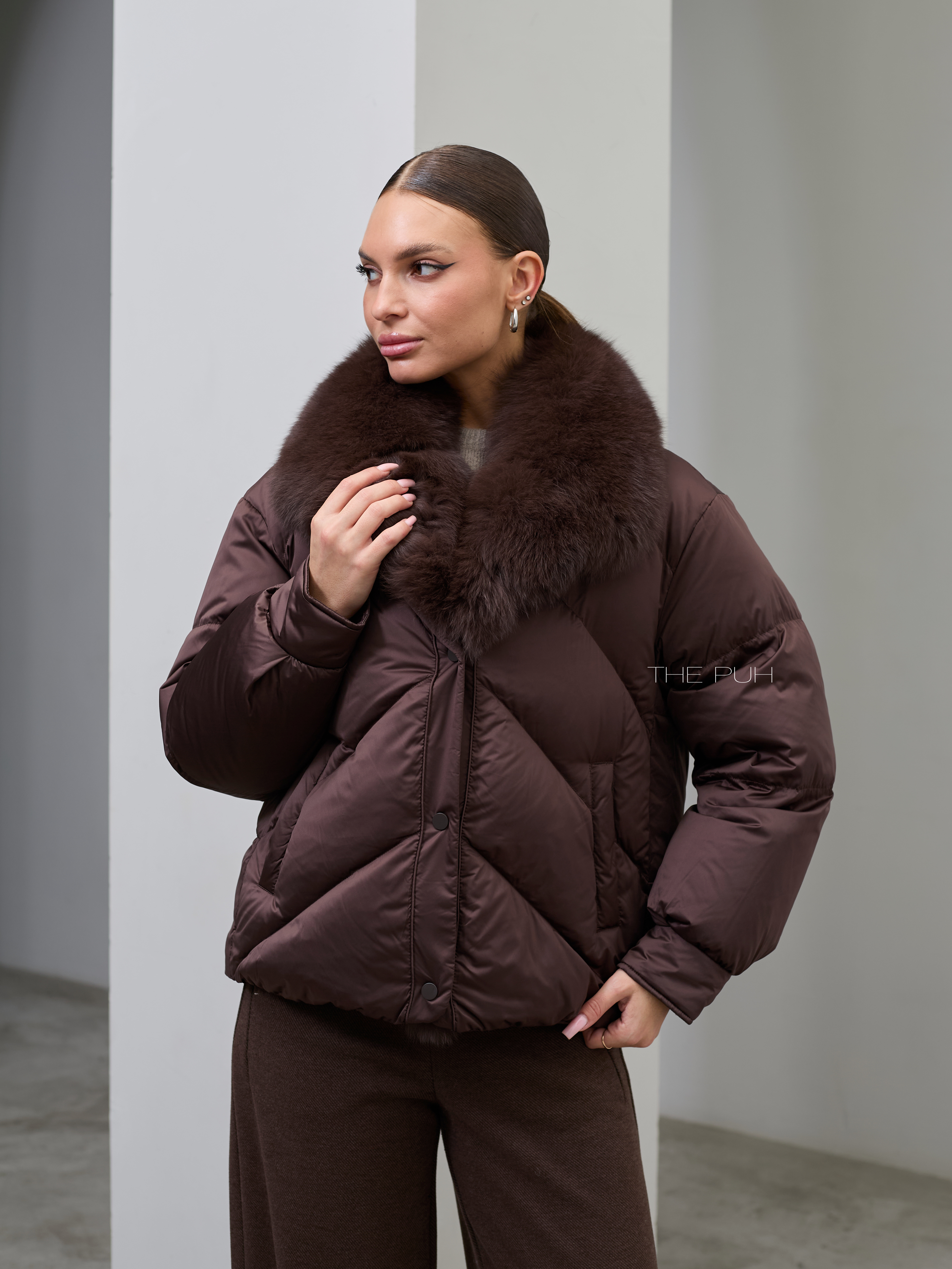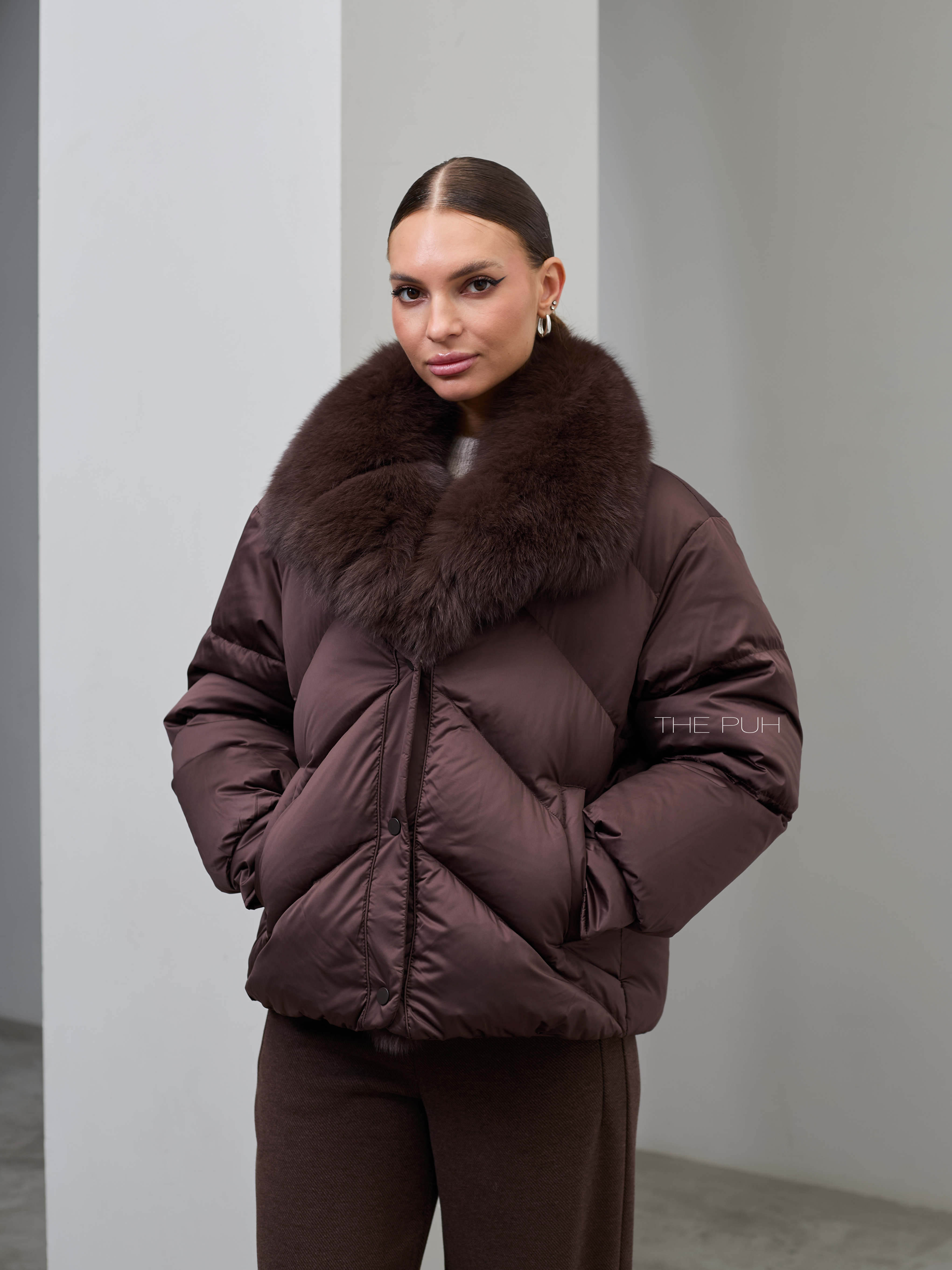 Короткий шоколадный пуховик сохранит тепло в морозную погоду, а роскошный лисий воротник придает изысканность образу и защищает шею и грудь от ветра и холода. Удобный крой и универсальная длина позволяет свободно двигаться, сохраняя максимум тепла. Модель застегивается на кнопки. Идеально подходит для автовладельцев.