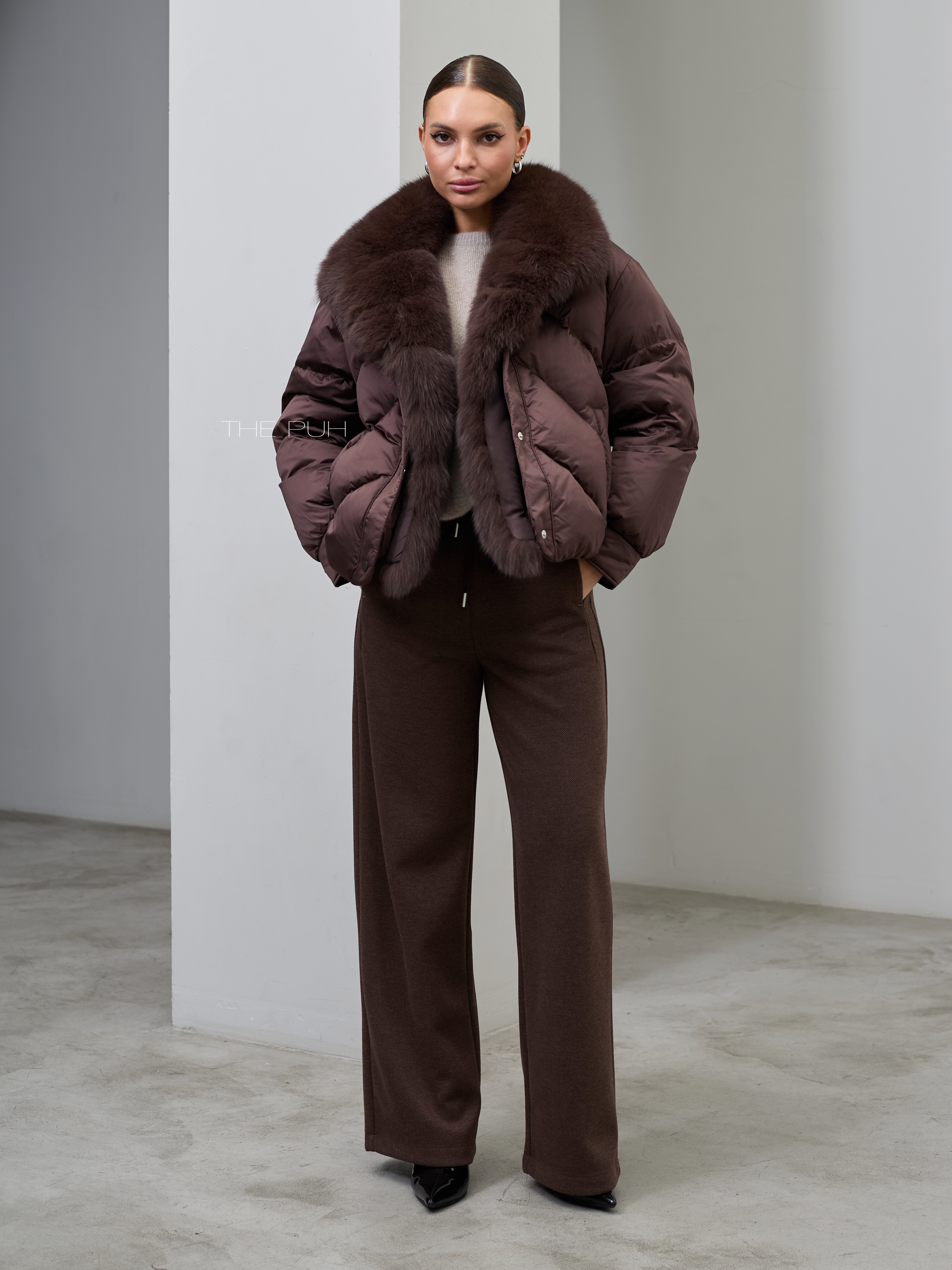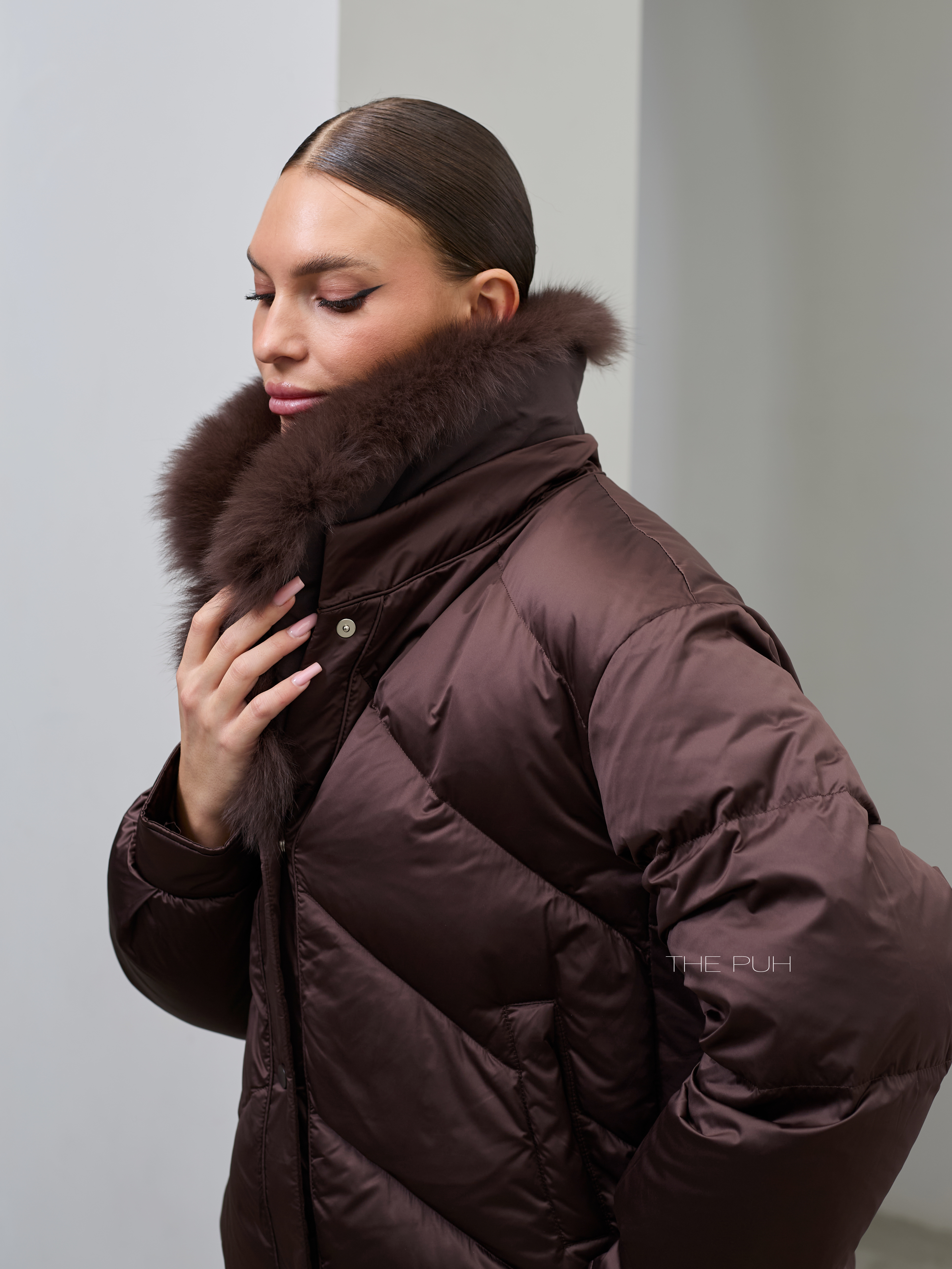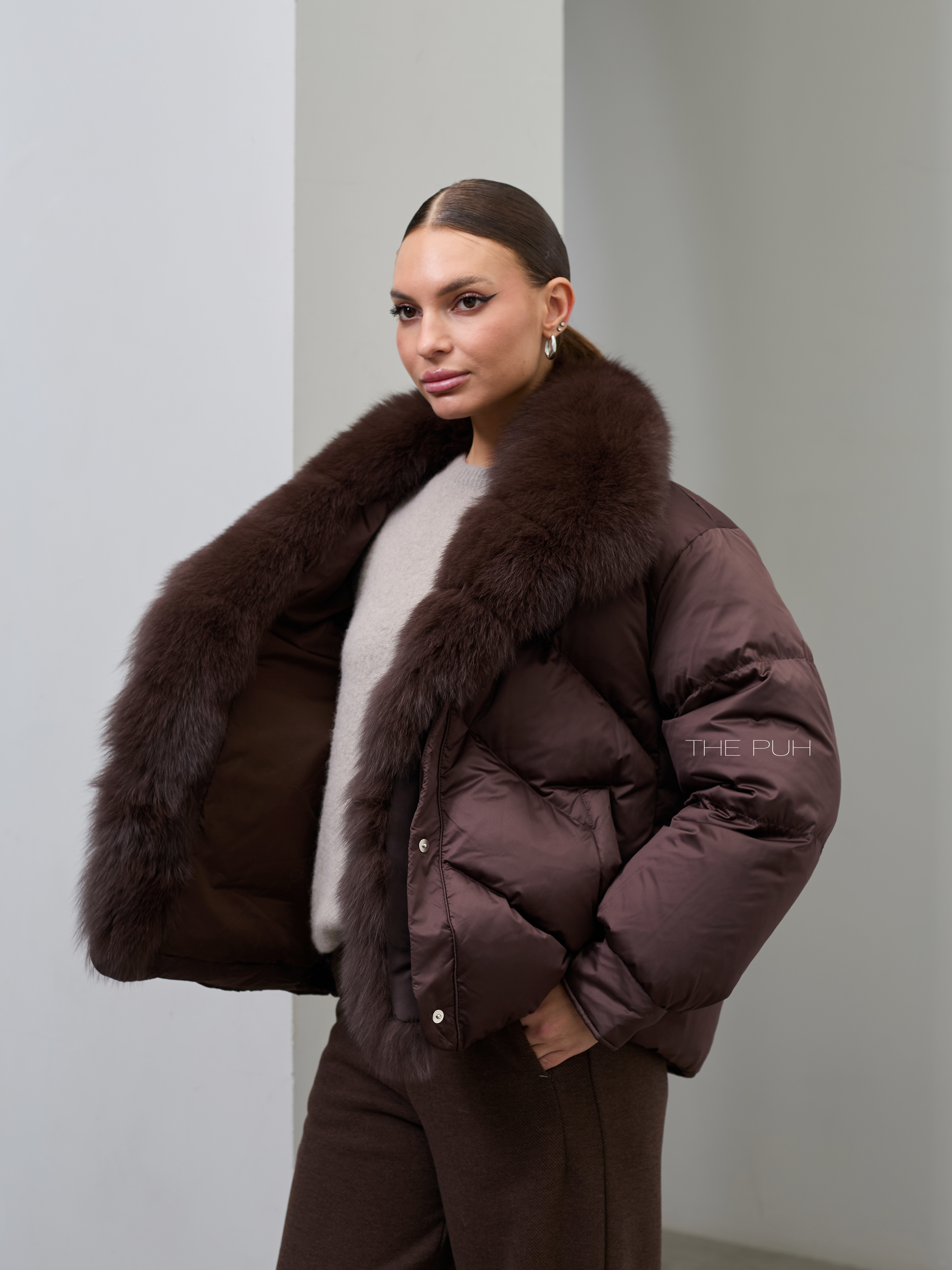 Короткий шоколадный пуховик сохранит тепло в морозную погоду, а роскошный лисий воротник придает изысканность образу и защищает шею и грудь от ветра и холода. Удобный крой и универсальная длина позволяет свободно двигаться, сохраняя максимум тепла. Модель застегивается на кнопки. Идеально подходит для автовладельцев.