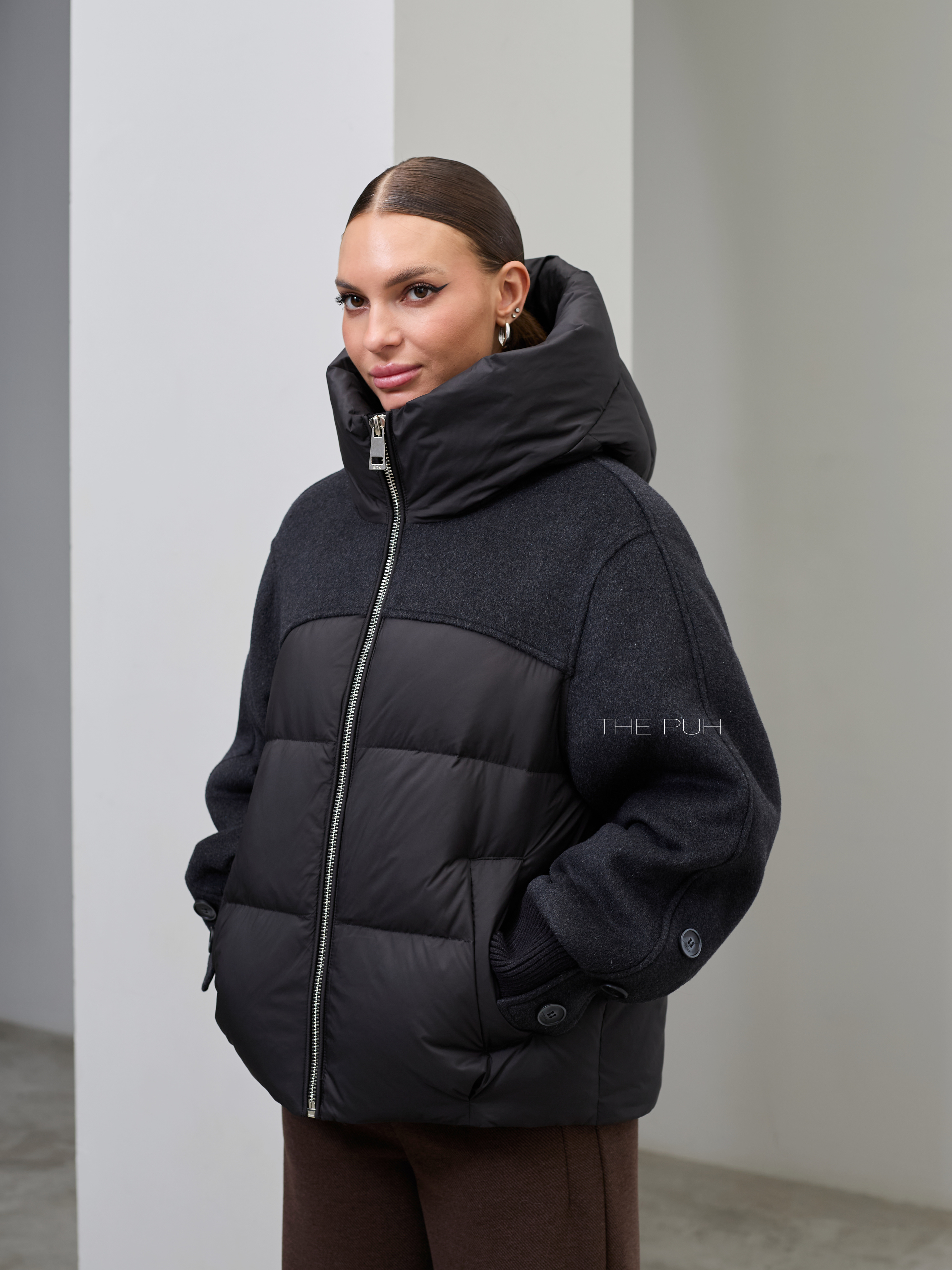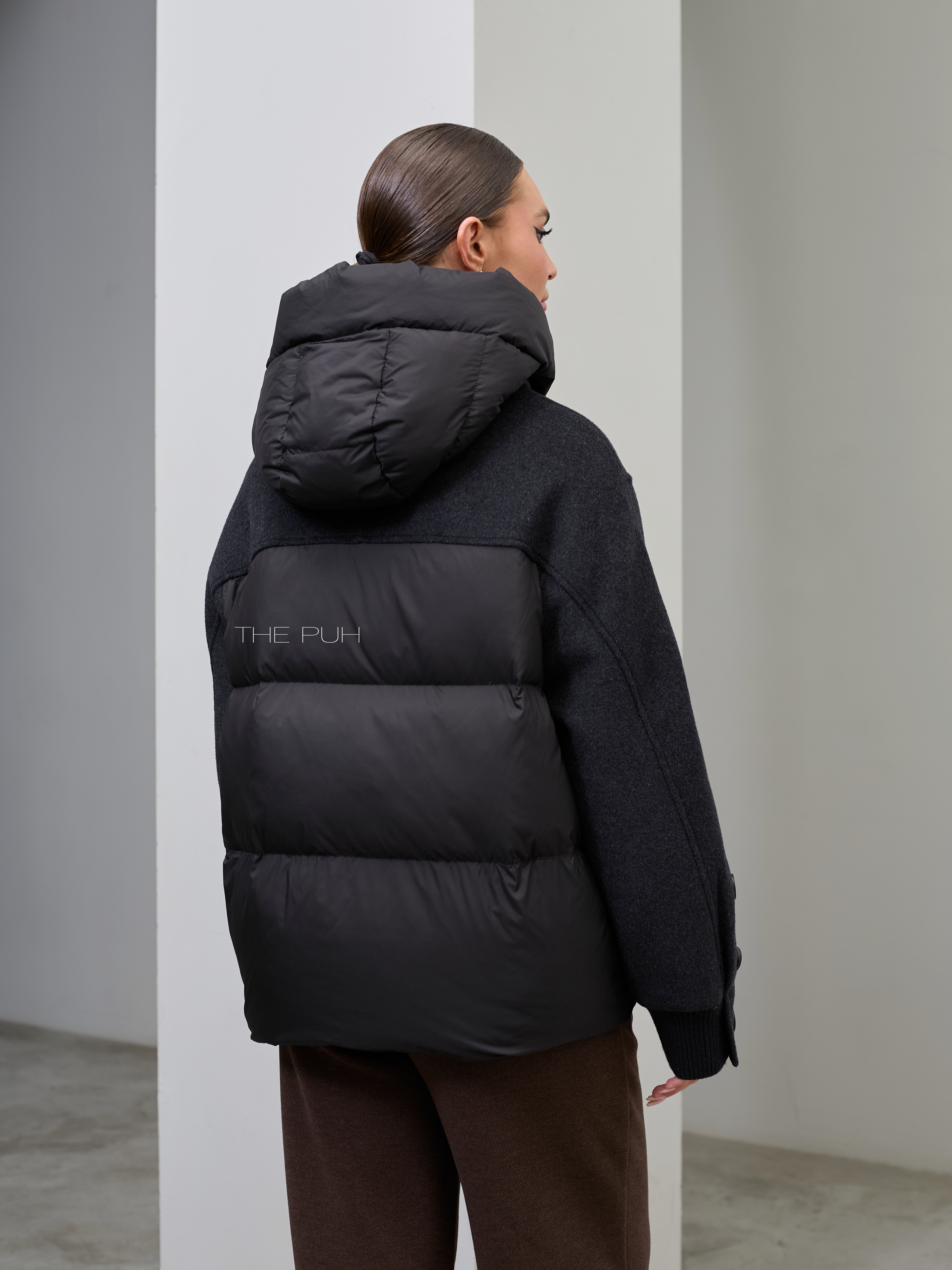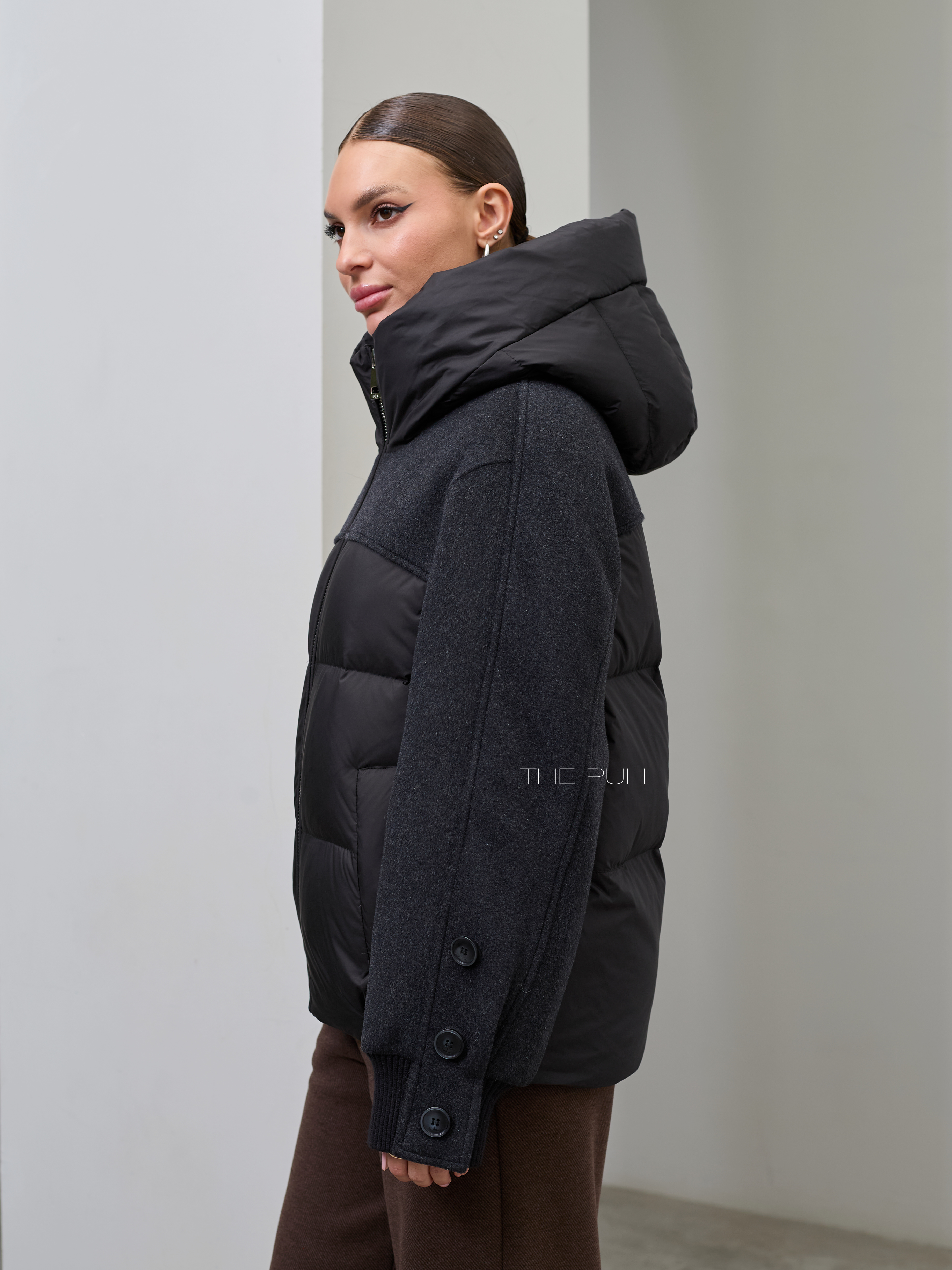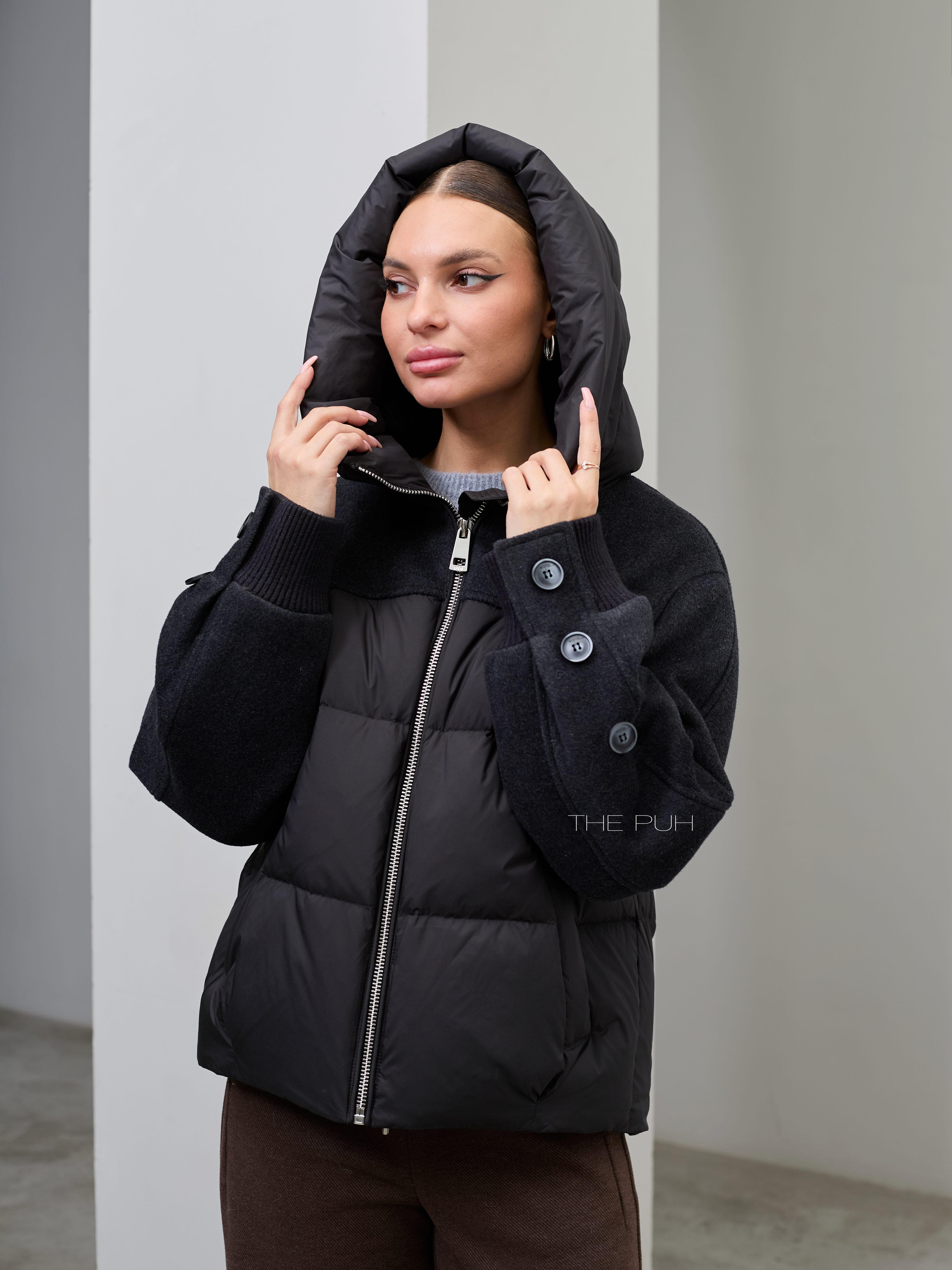 Теплый комбинированный черно-графитовый пуховик с капюшоном — ваш надежный спутник зимой! Удобная молния, стильный дизайн и практичные карманы подчеркнут комфорт ношения. Высокий воротник защитит шею от холода, а универсальный цвет подойдет к любому образу.