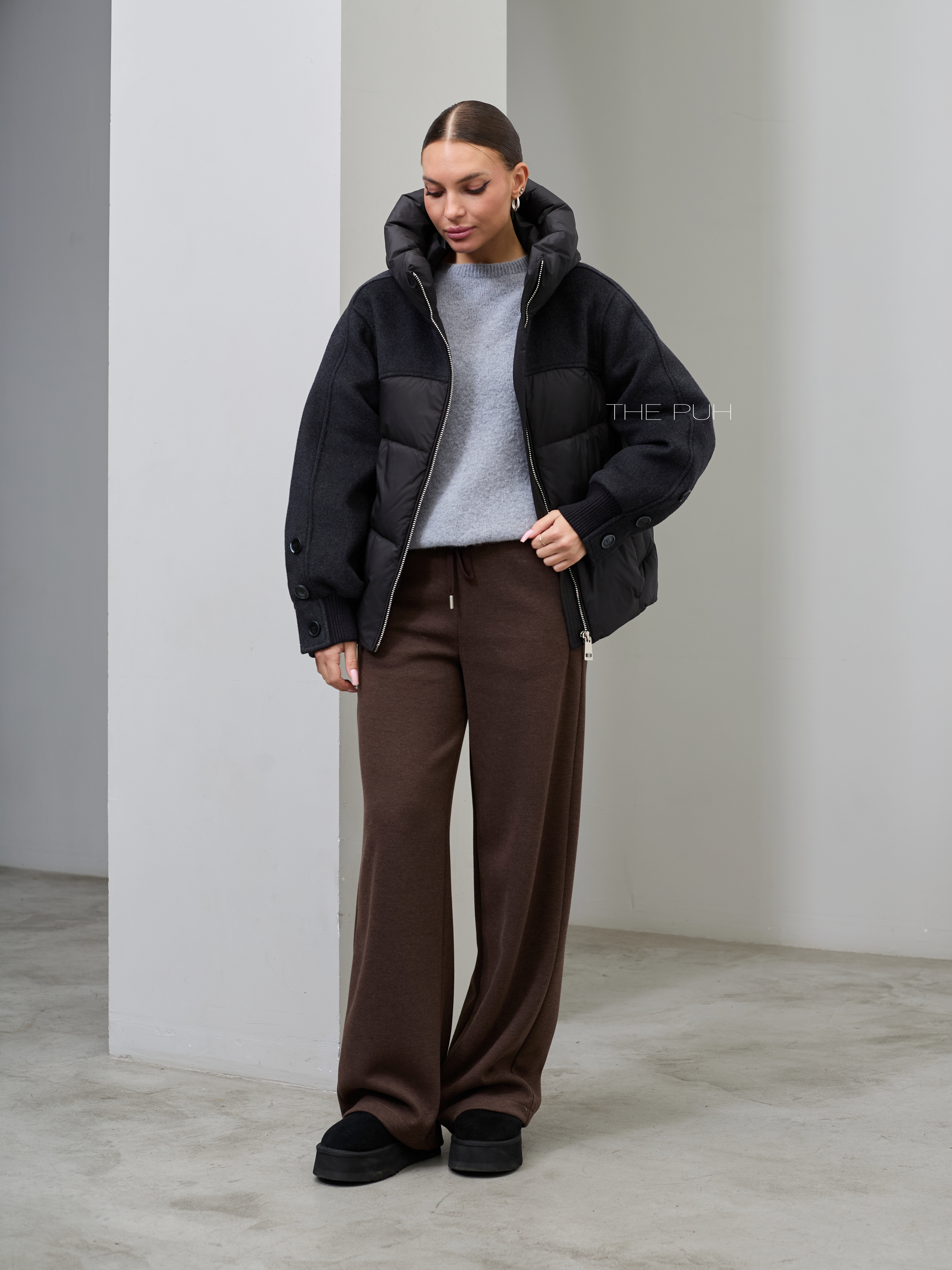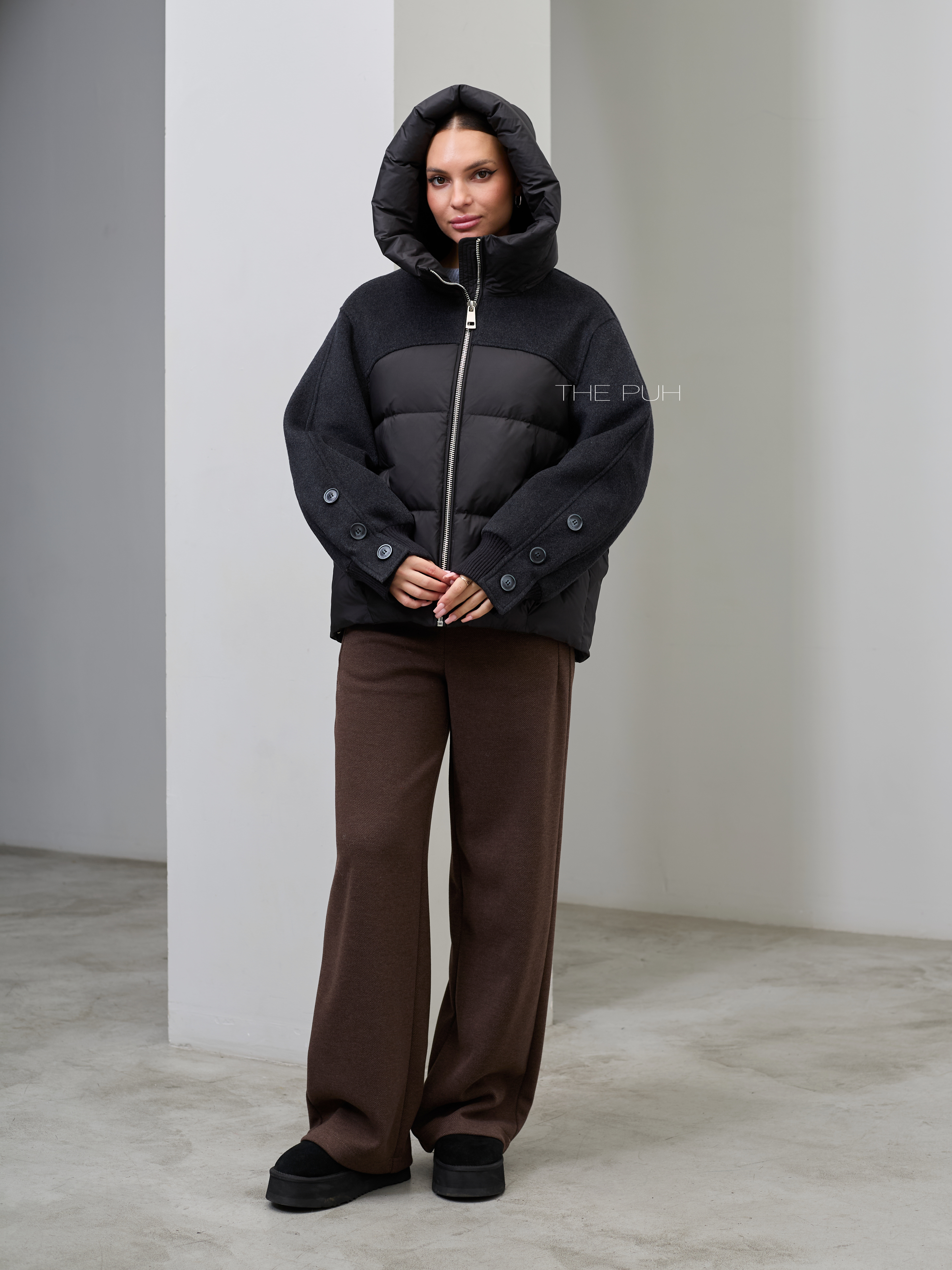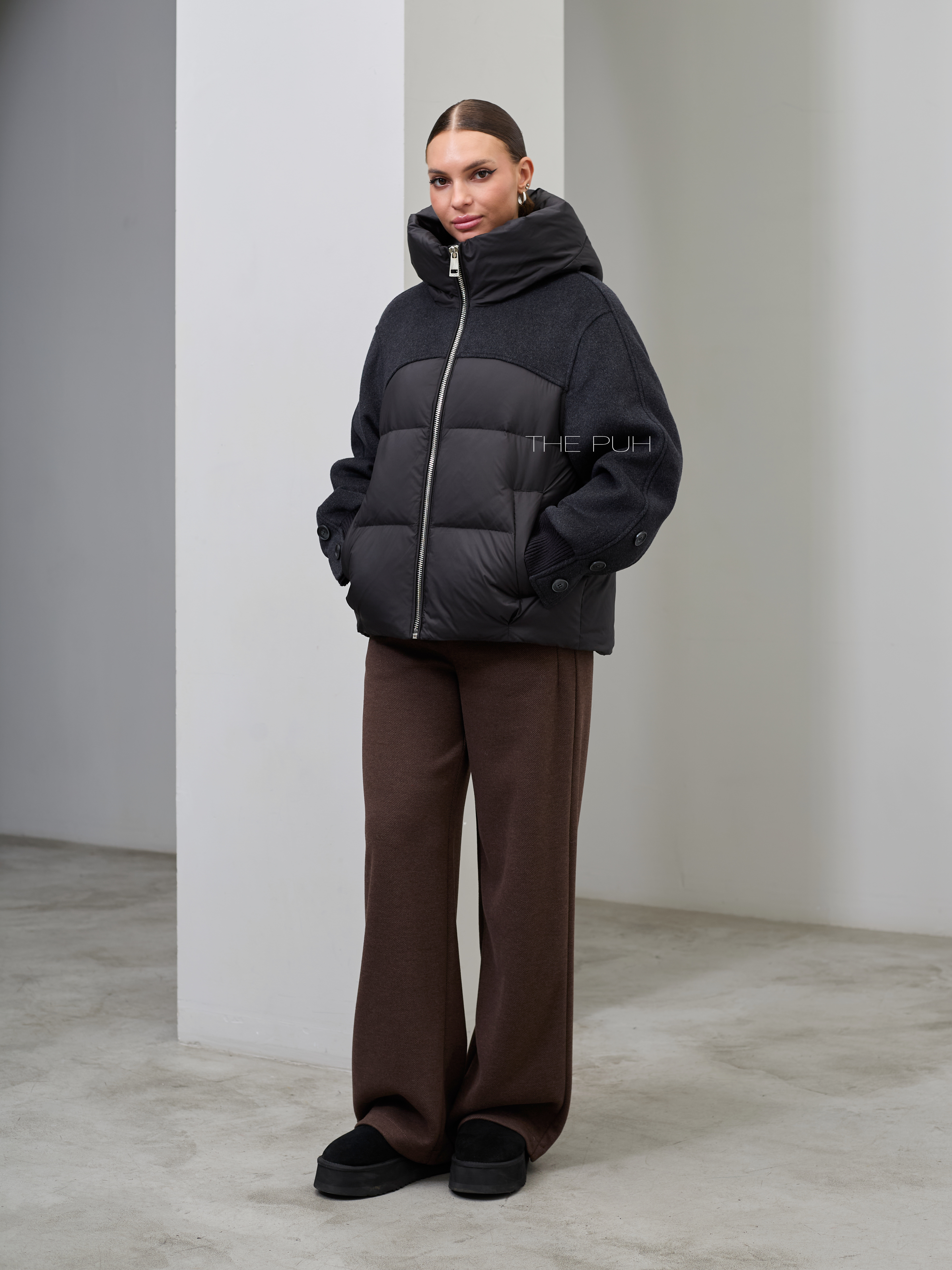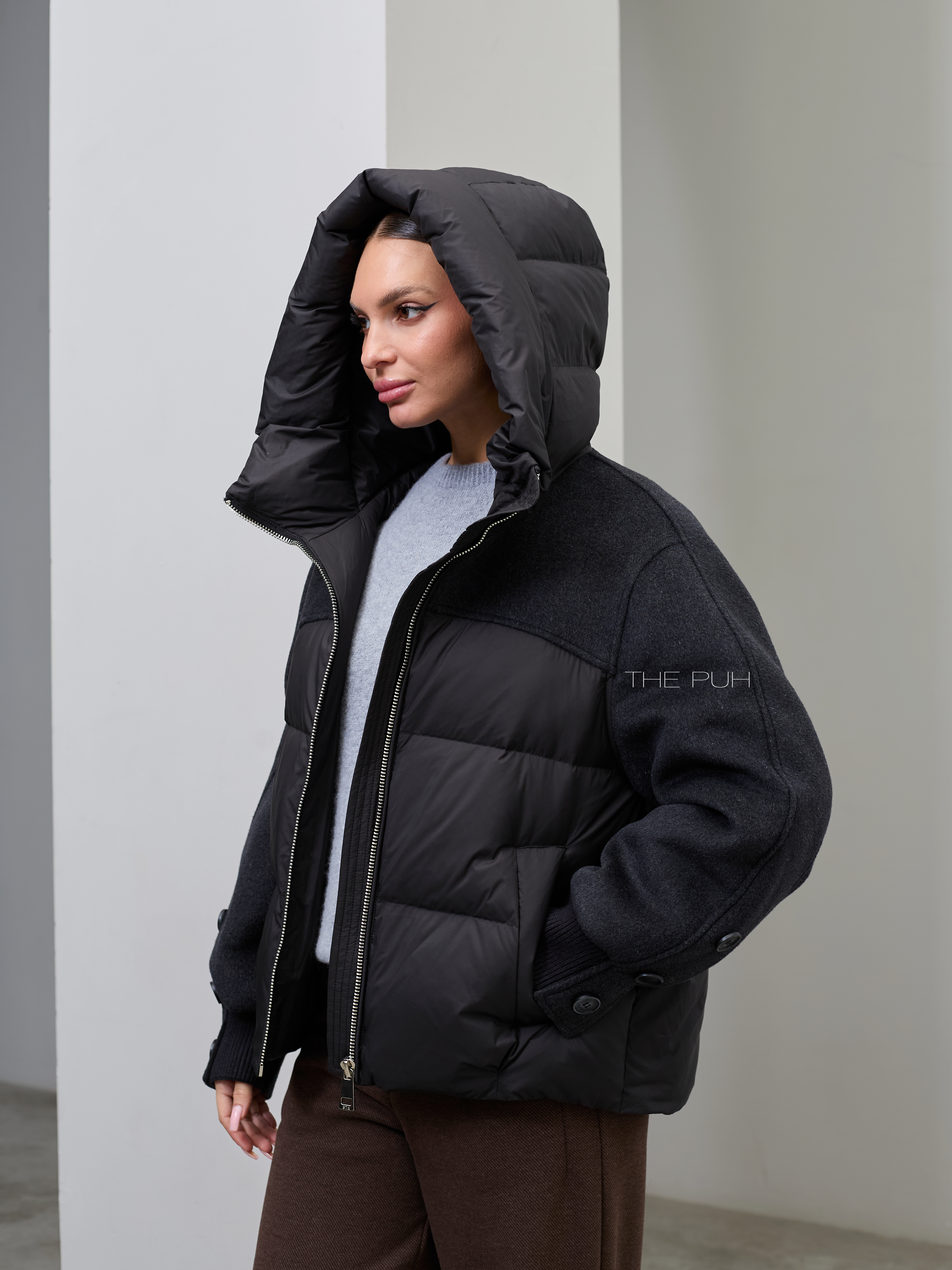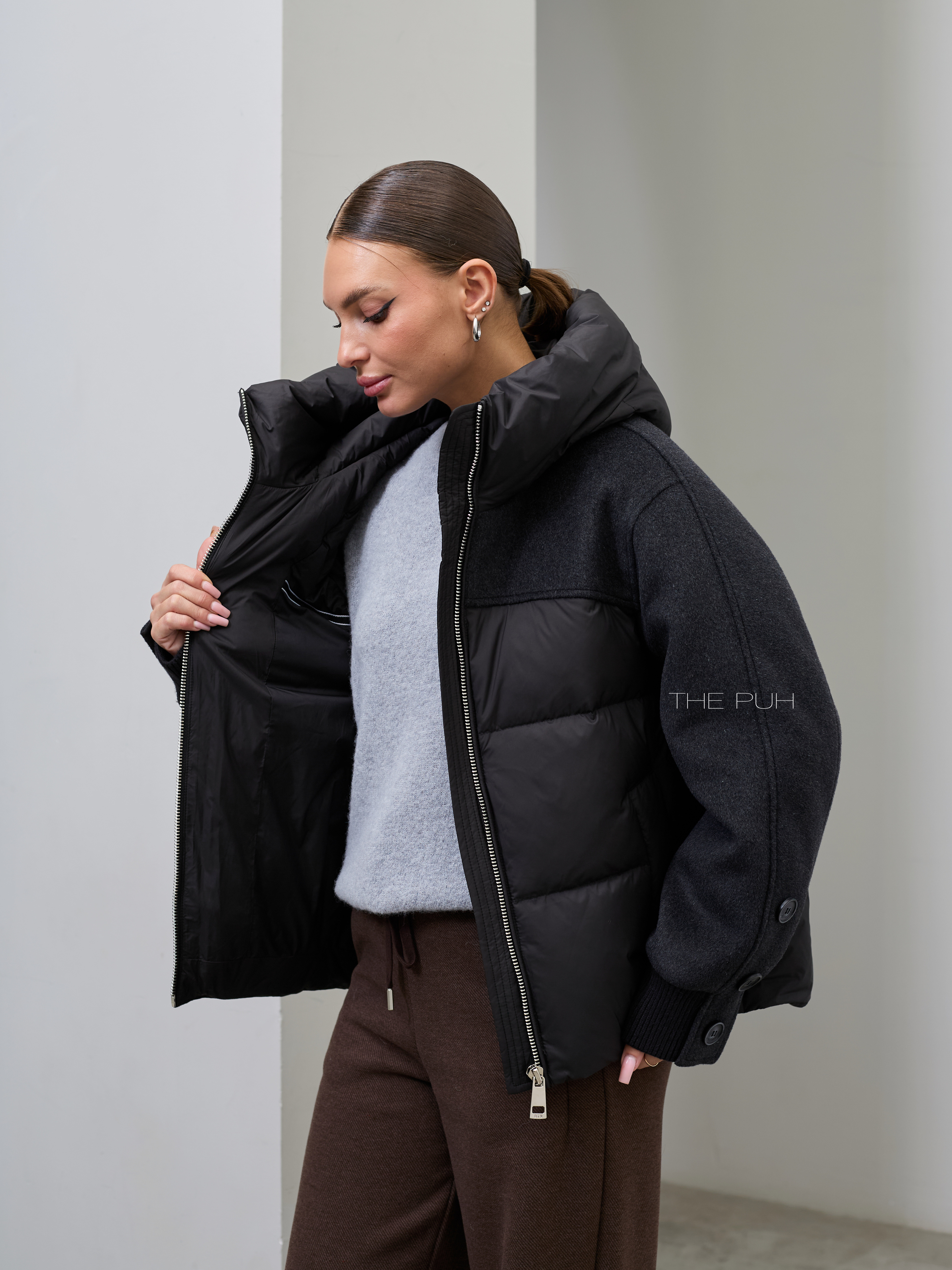 Теплый комбинированный черно-графитовый пуховик с капюшоном — ваш надежный спутник зимой! Удобная молния, стильный дизайн и практичные карманы подчеркнут комфорт ношения. Высокий воротник защитит шею от холода, а универсальный цвет подойдет к любому образу.