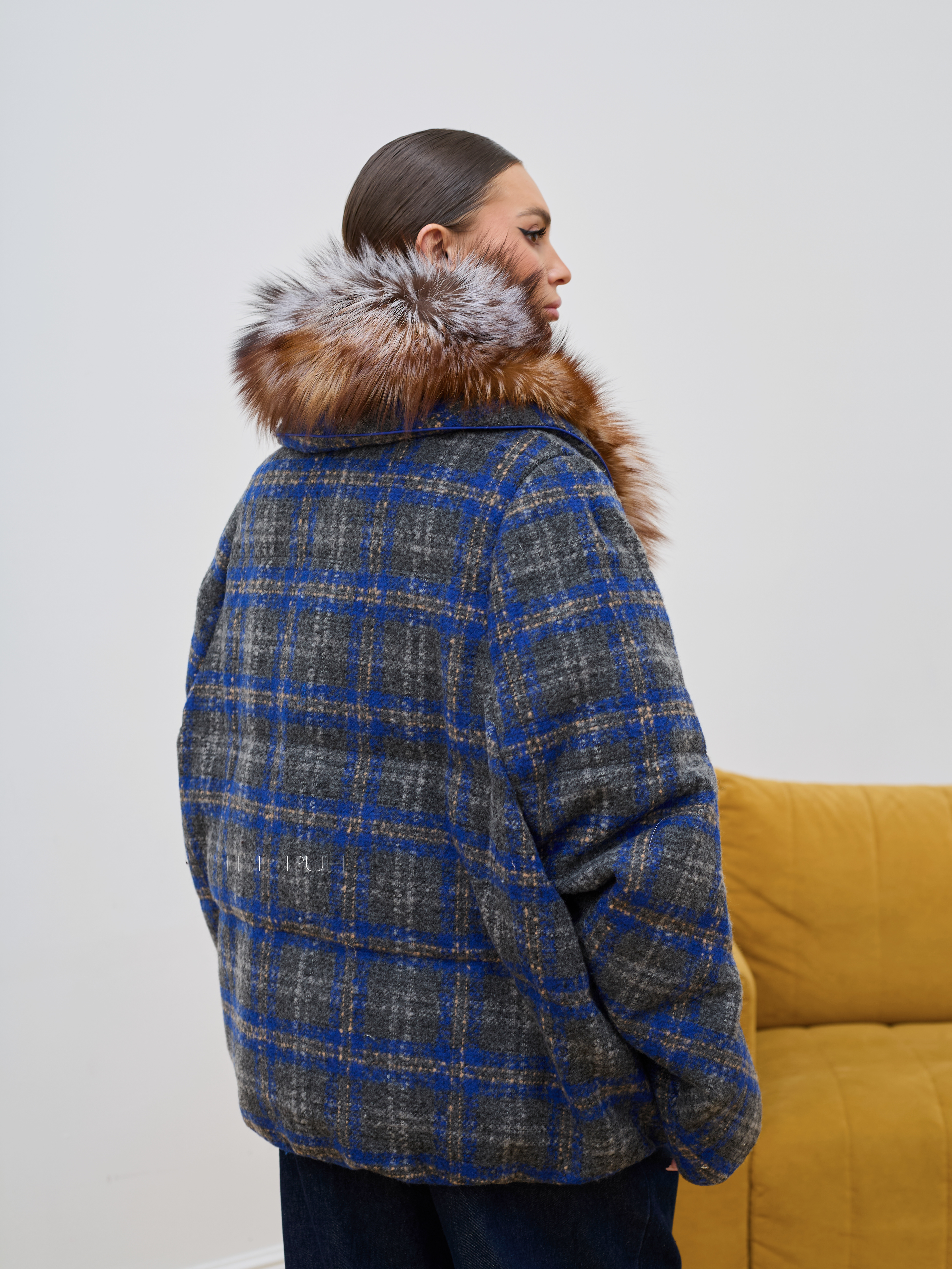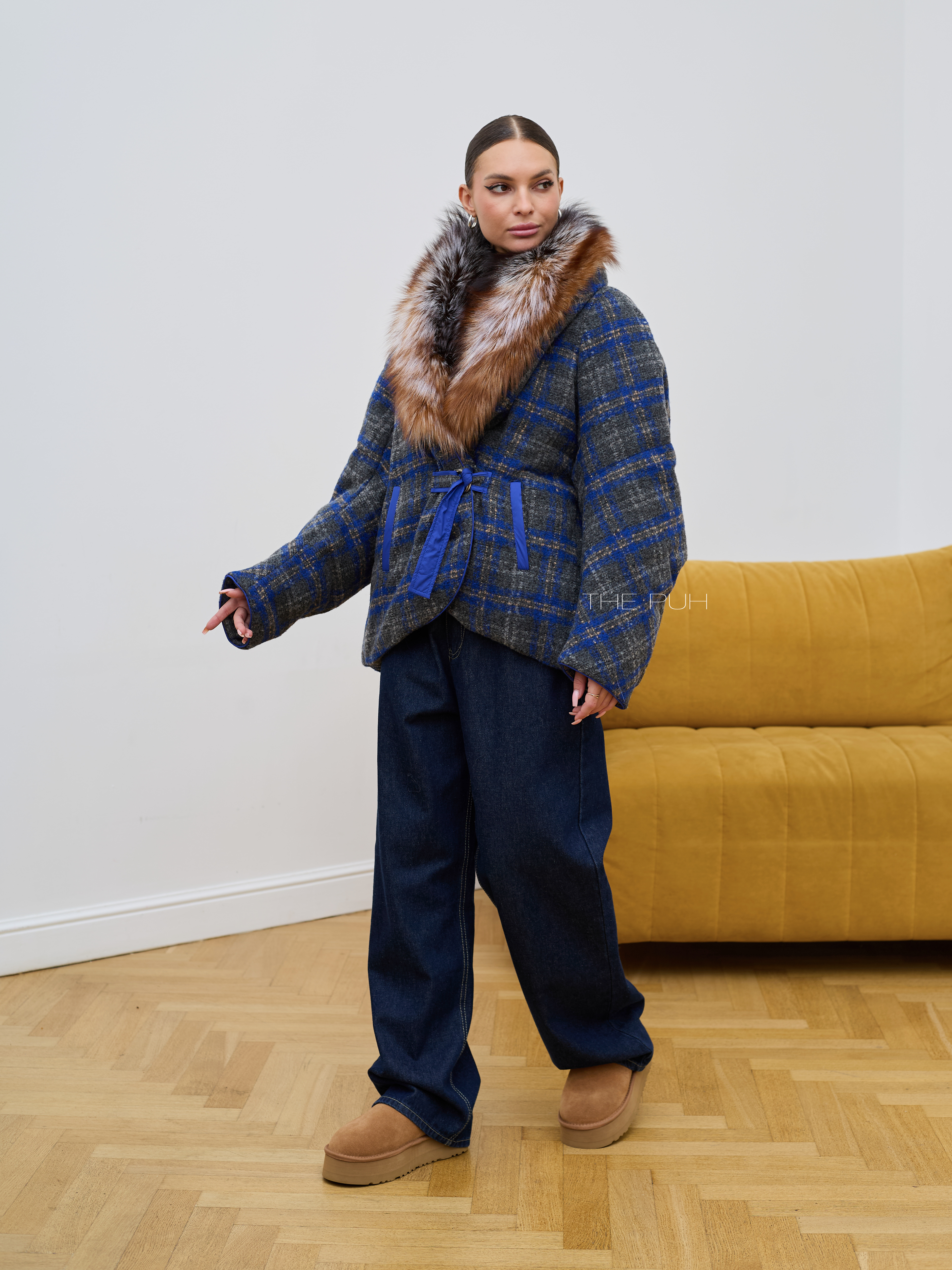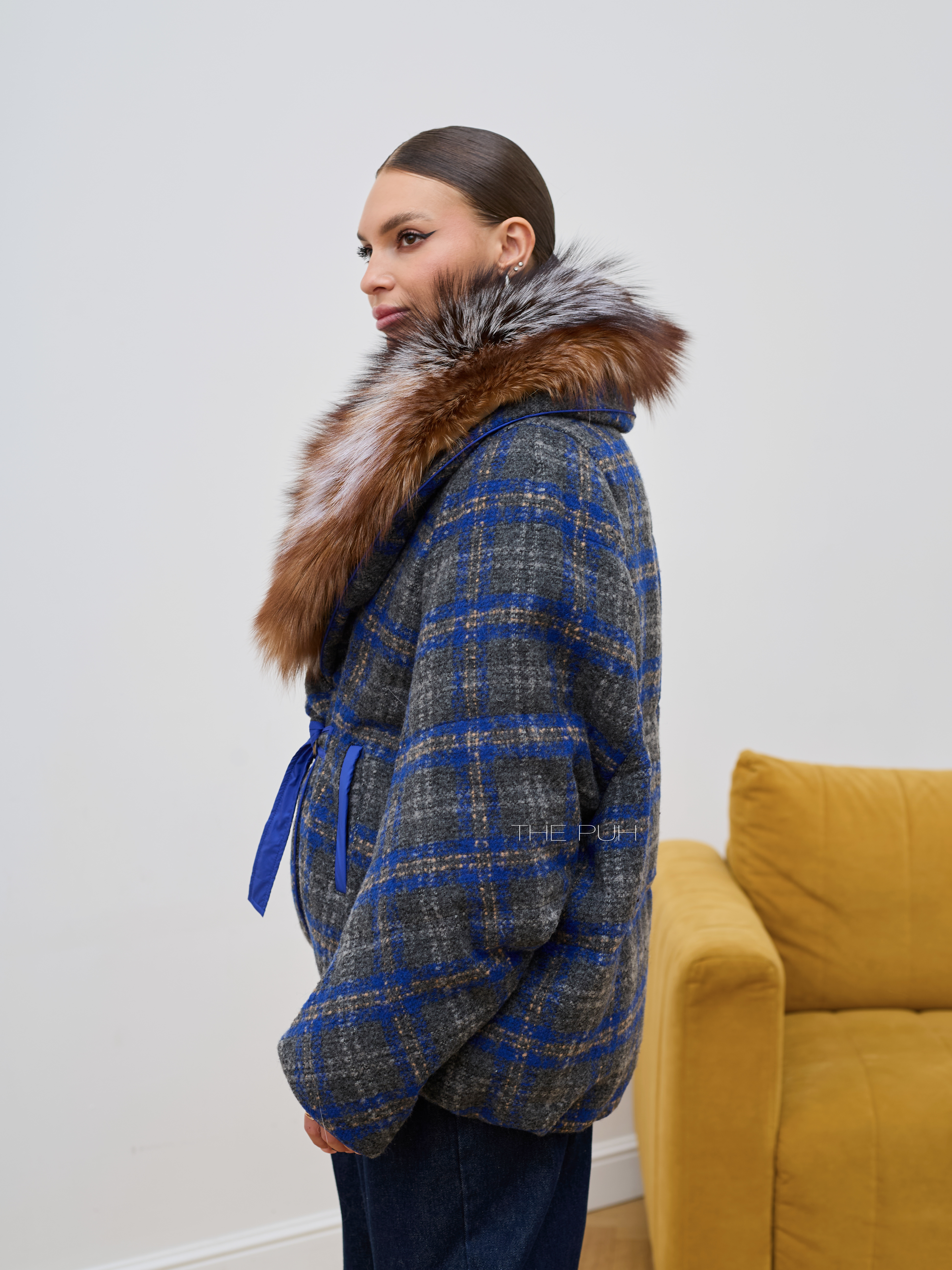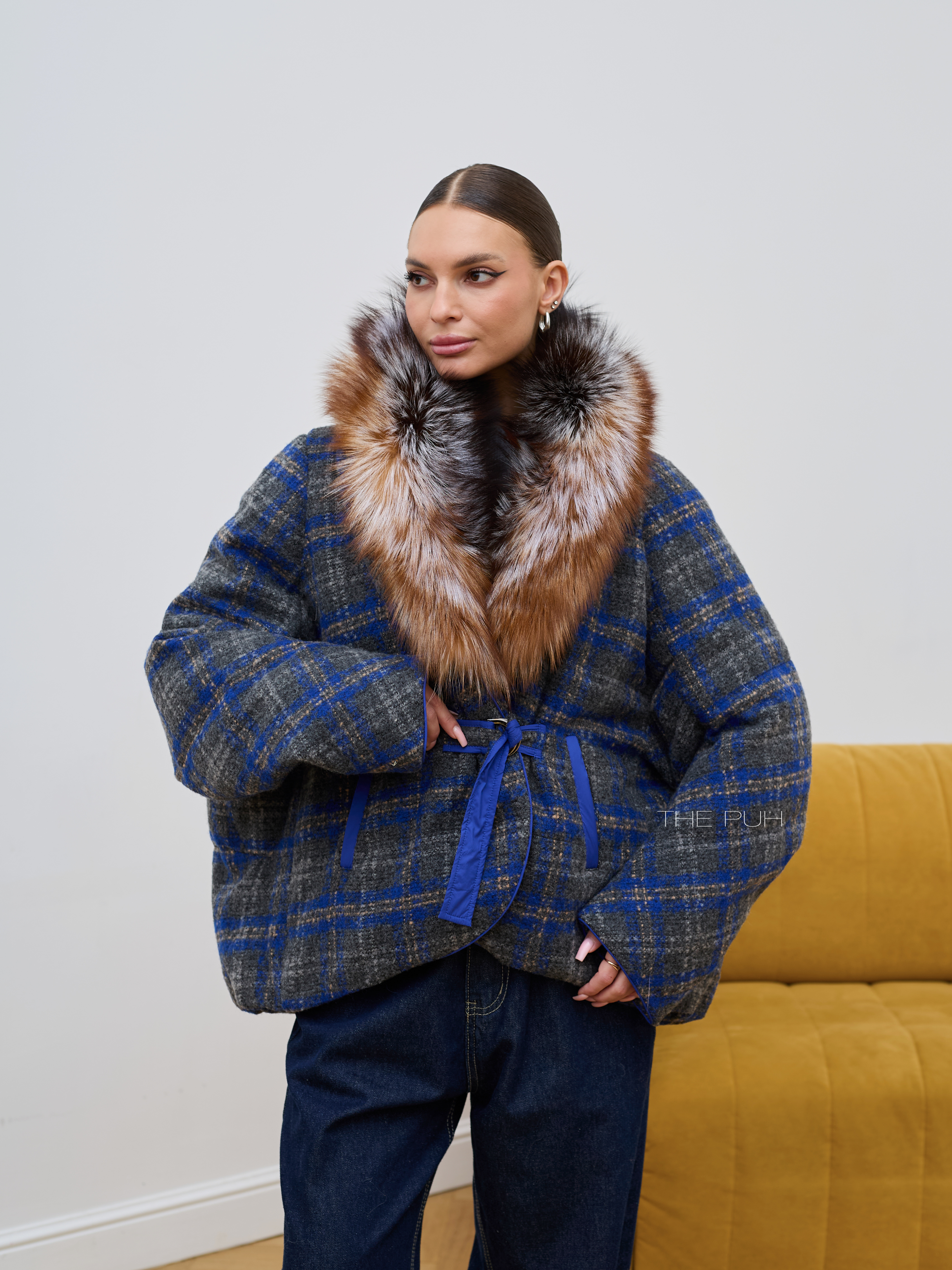 Синий текстильный оверсайз пуховик в клетку с шалевым воротником и съемной опушкой из меха енота. Модель расслабленного объемного кроя застегивается на ленту-затяжку спереди и утеплена натуральным гусиным пухом и пером. По низу изделия есть скрытая кулиска, позволяющая затянуть его и контролировать поддувание ветра снизу.