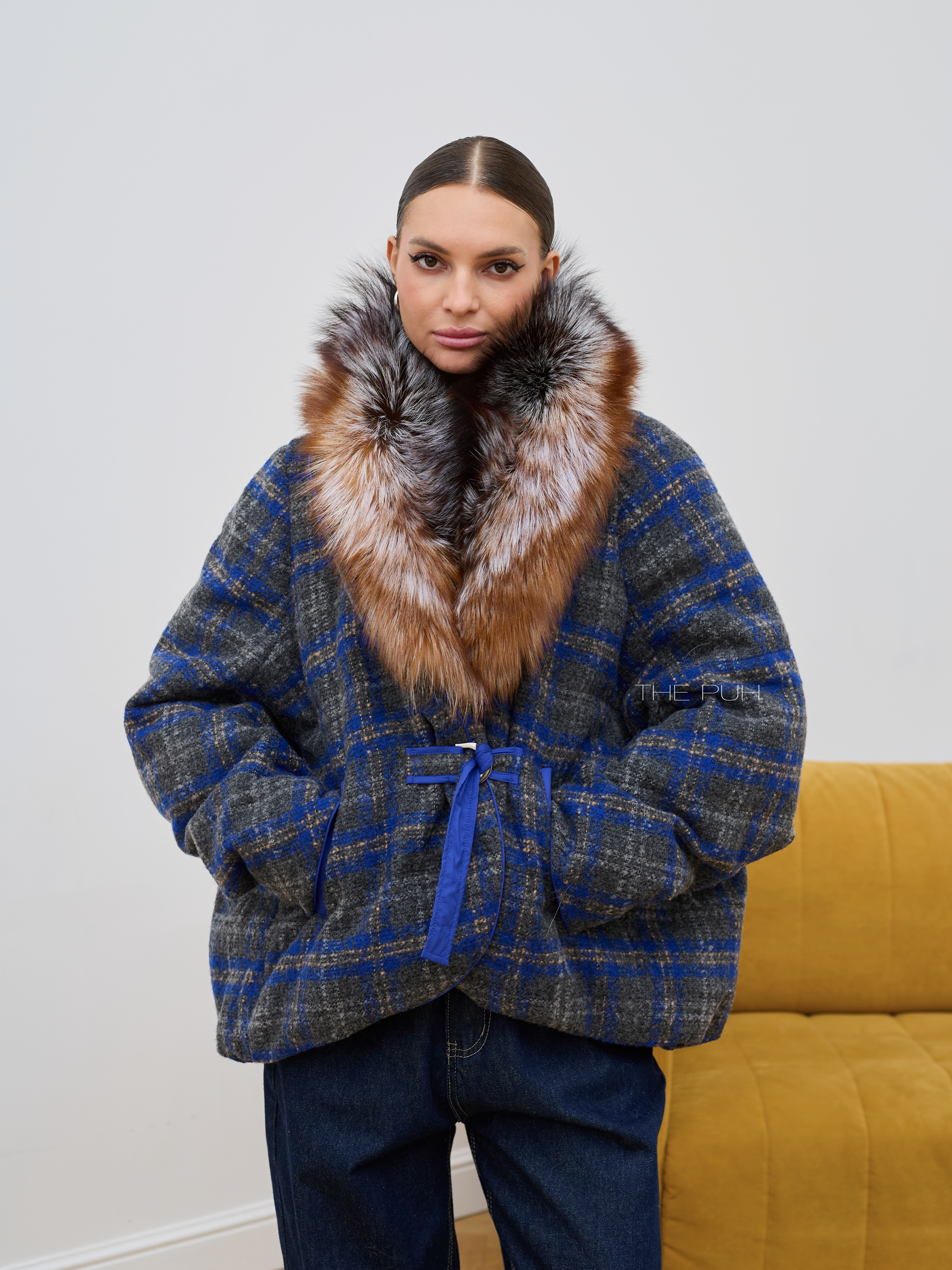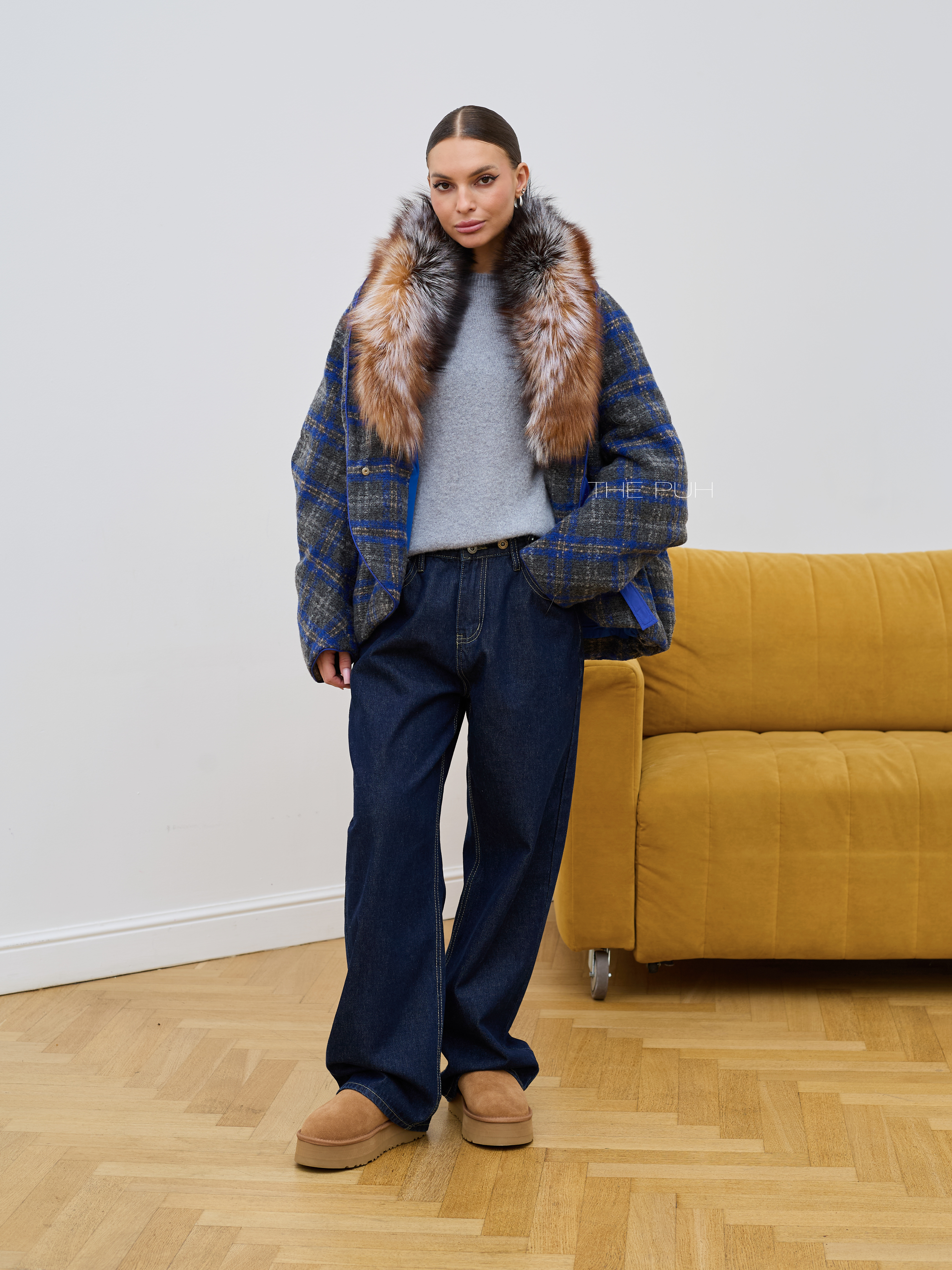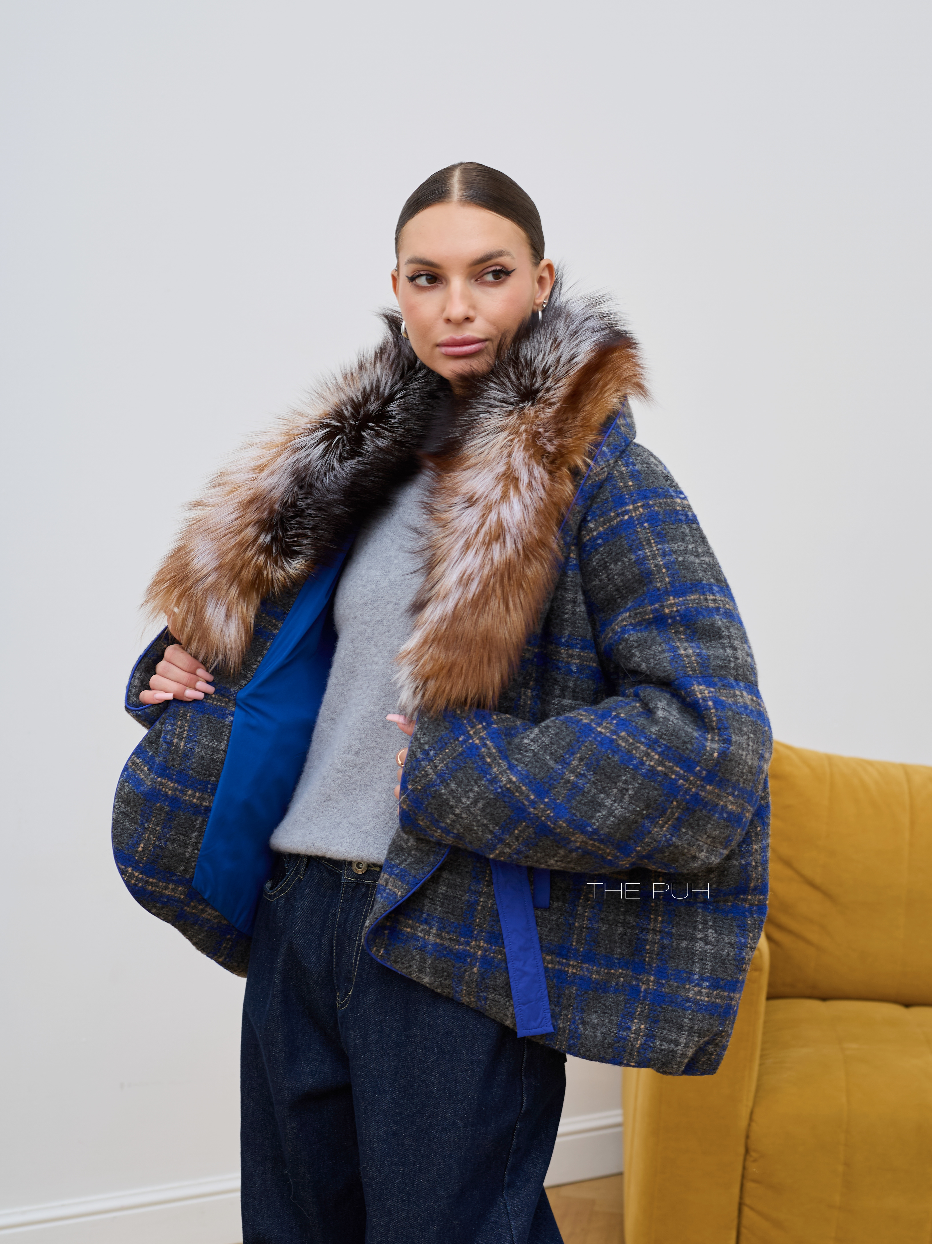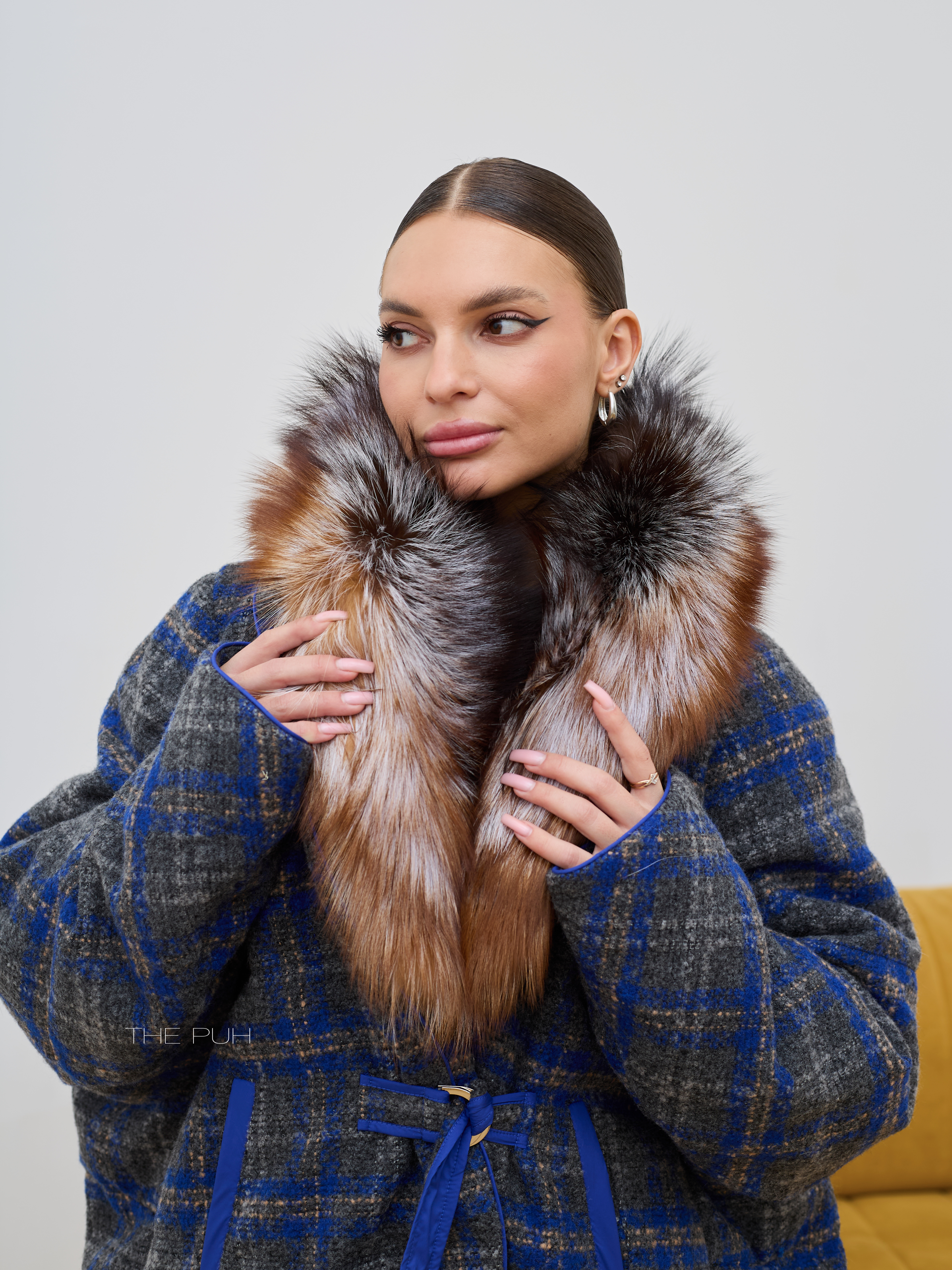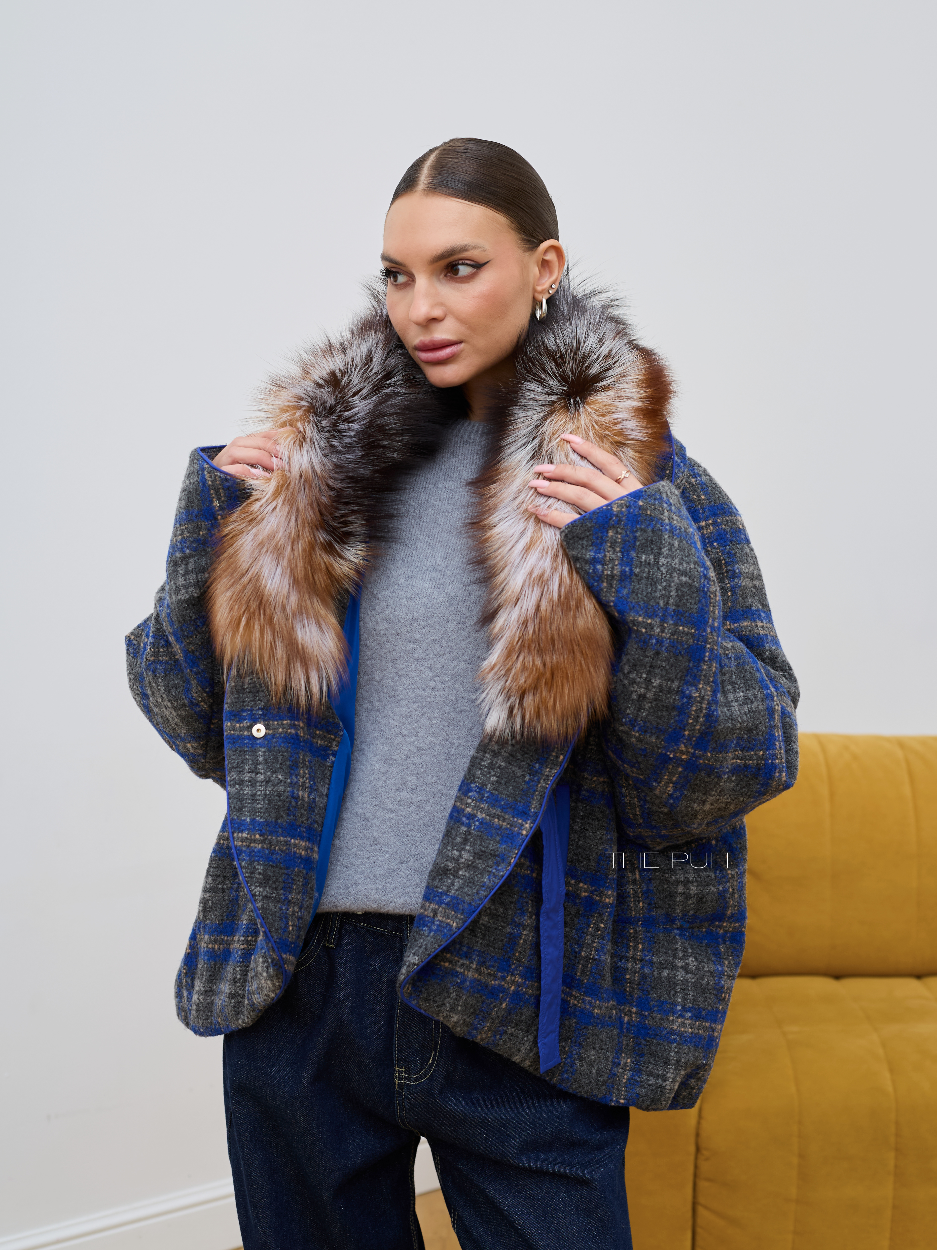Синий текстильный оверсайз пуховик в клетку с шалевым воротником и съемной опушкой из меха енота. Модель расслабленного объемного кроя застегивается на ленту-затяжку спереди и утеплена натуральным гусиным пухом и пером. По низу изделия есть скрытая кулиска, позволяющая затянуть его и контролировать поддувание ветра снизу.