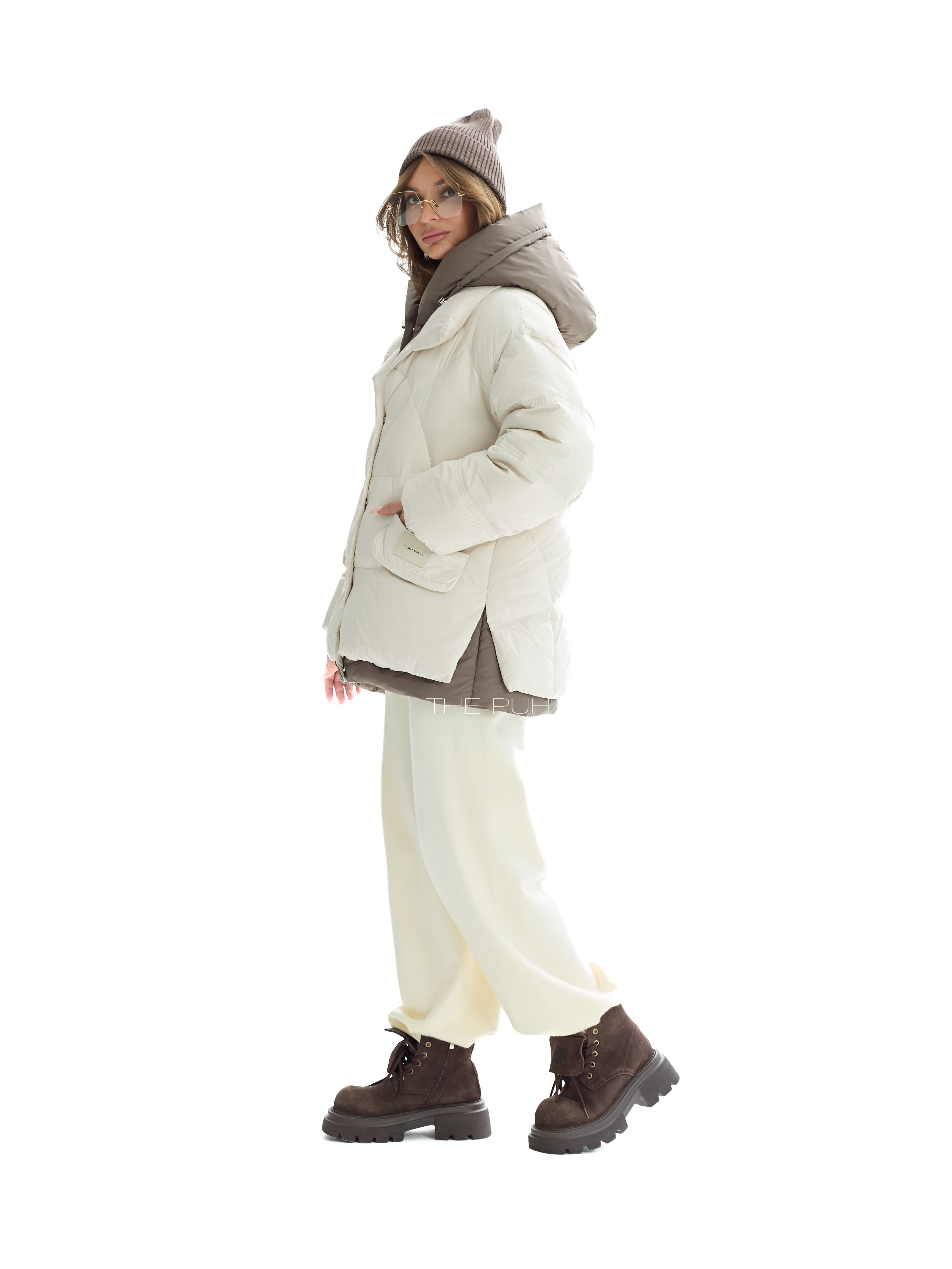 Детали изделия: дутая модель свободного кроя, объемный отложной воротник, пуховик с отстегивающейся фальшь-жилеткой на кнопках и молнии с капюшоном, последний на кулиске с фиксатором, спущенные плечи, манжеты на эластичной резинке, боковые карманы с клапаном и нашивкой, боковой разрез снизу, особенность модели - укороченный пуховик и удлиненная жилетка, что создает интересный контраст в силуэте.