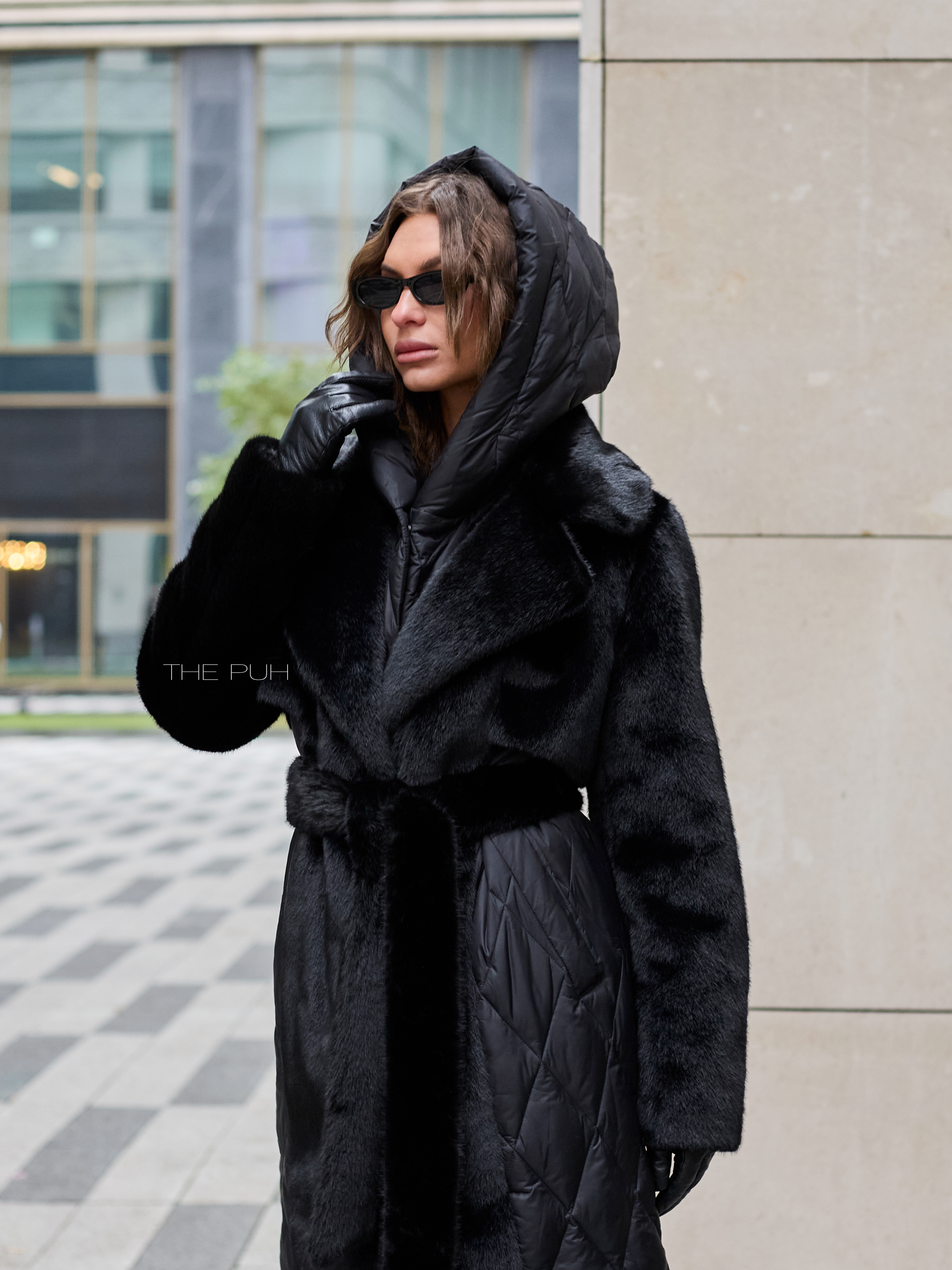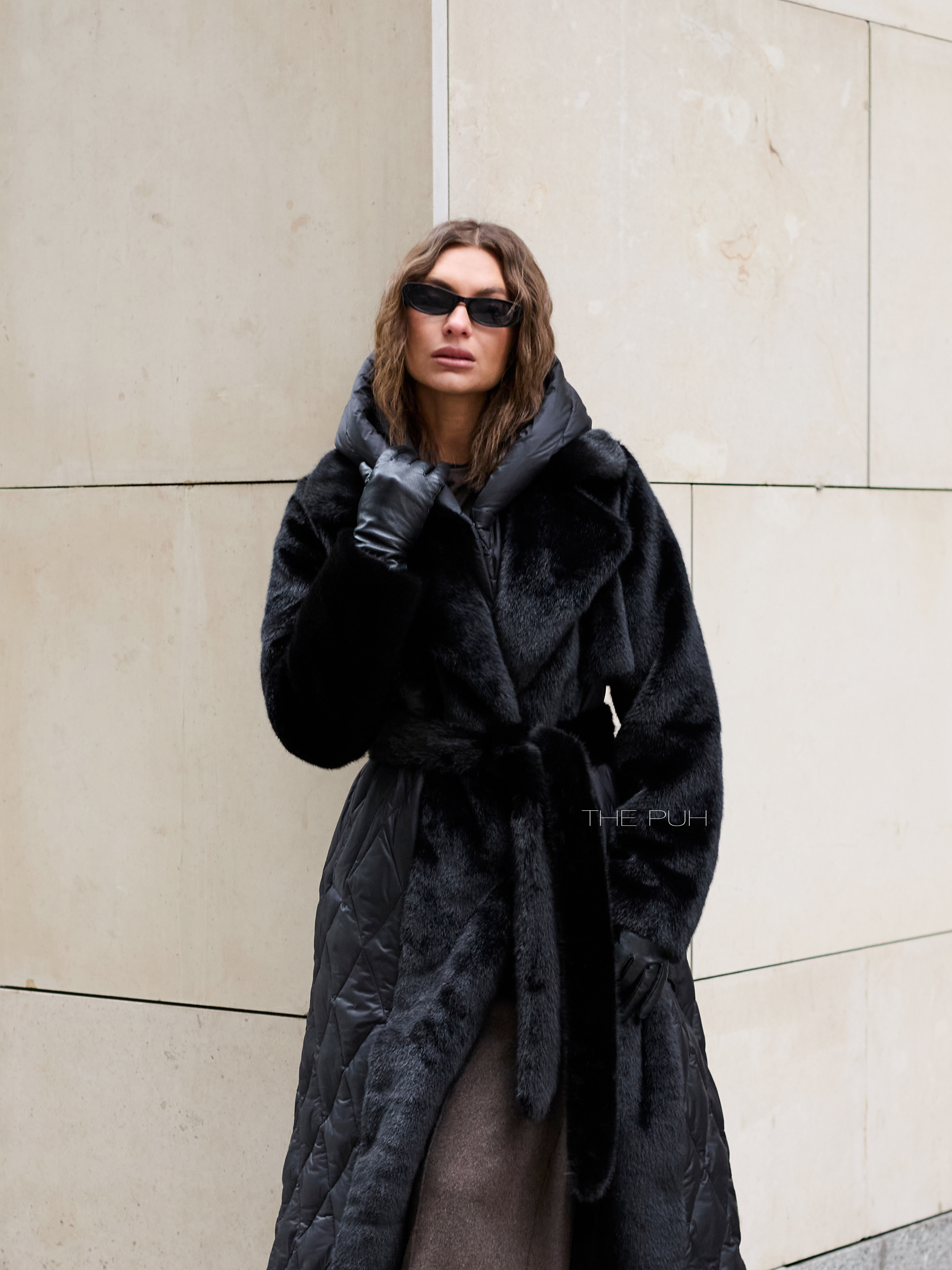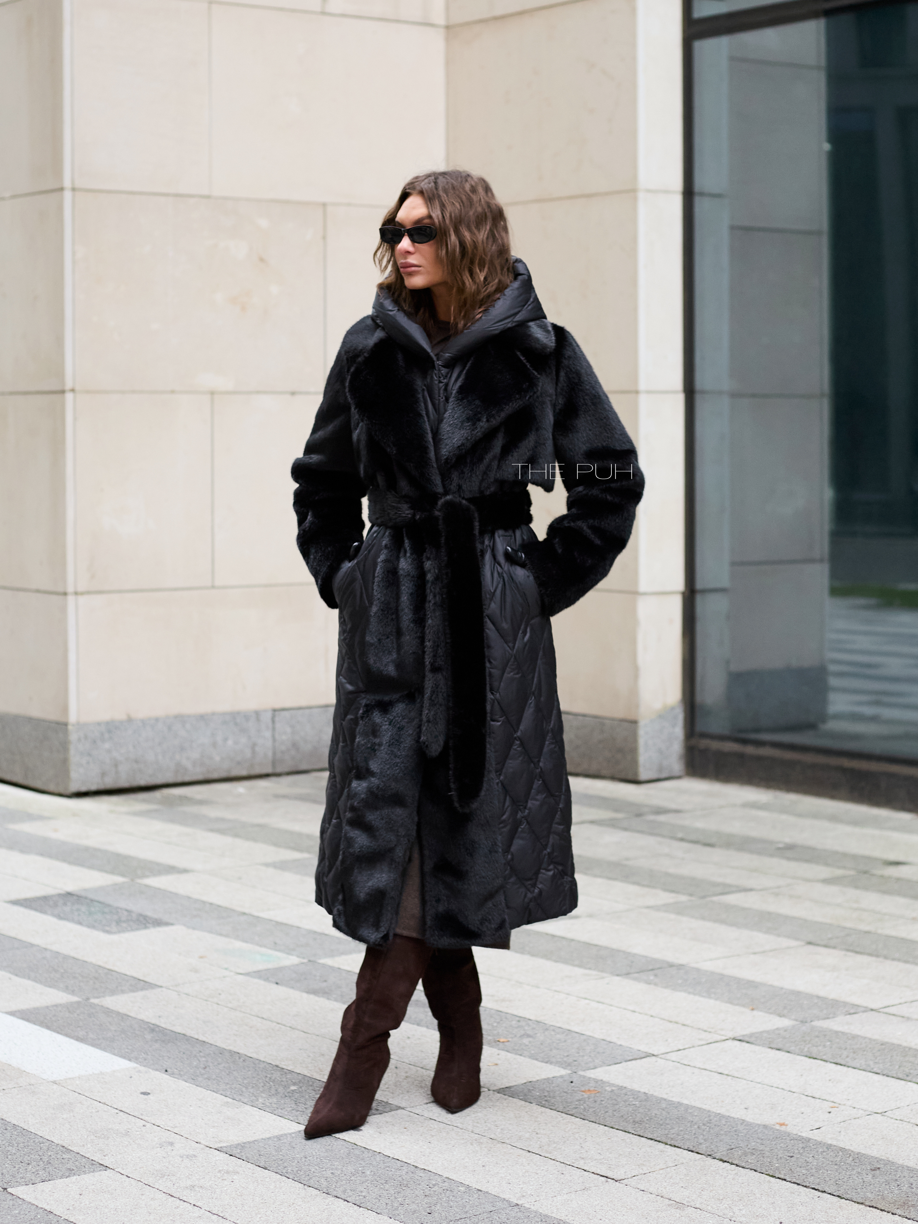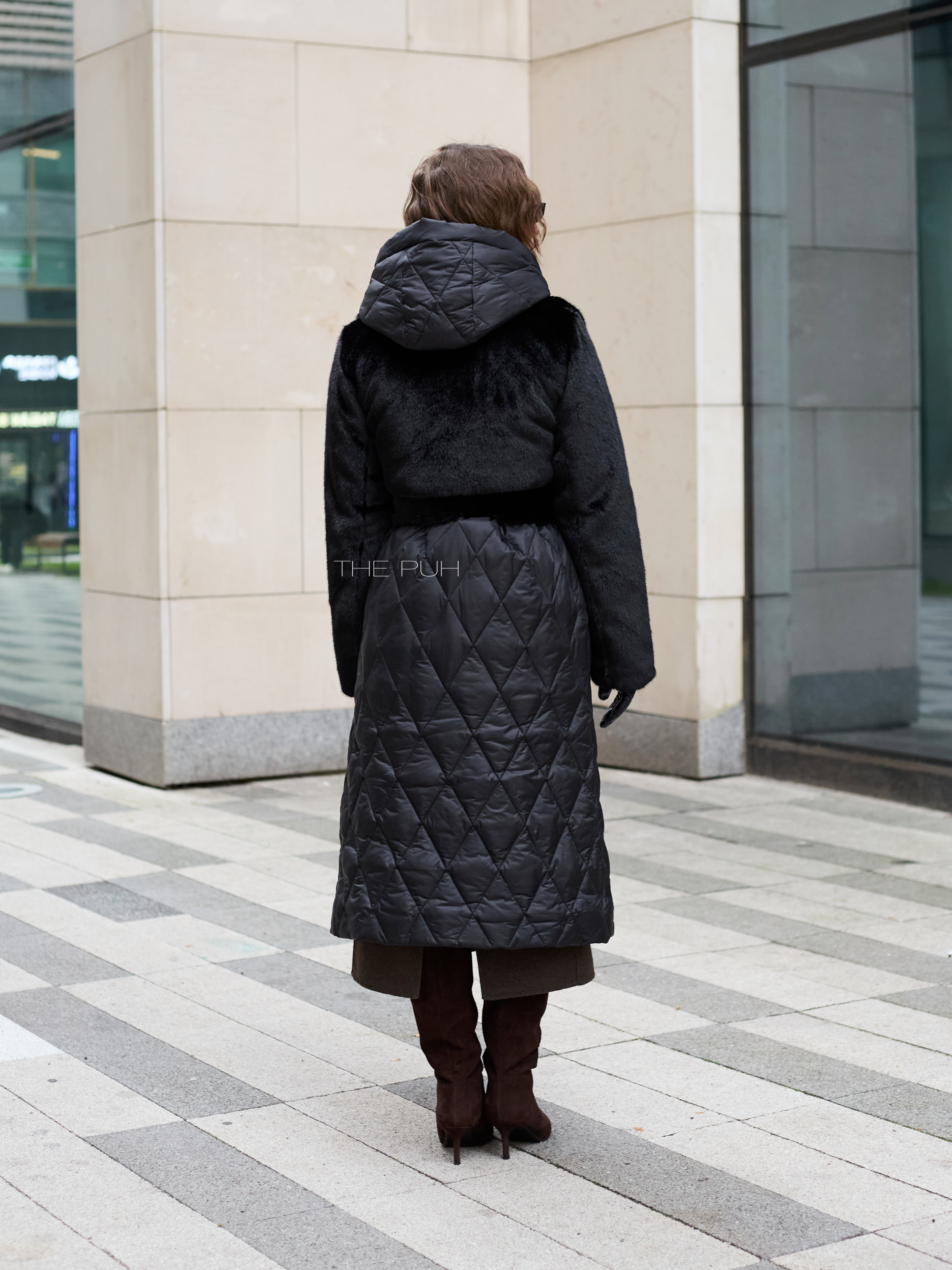 Комбинированный пуховик с отстегивающимся воротом-капюшоном и поясом, который можно носить в различных вариациях и комбинировать со многими вещами повседневного гардероба.