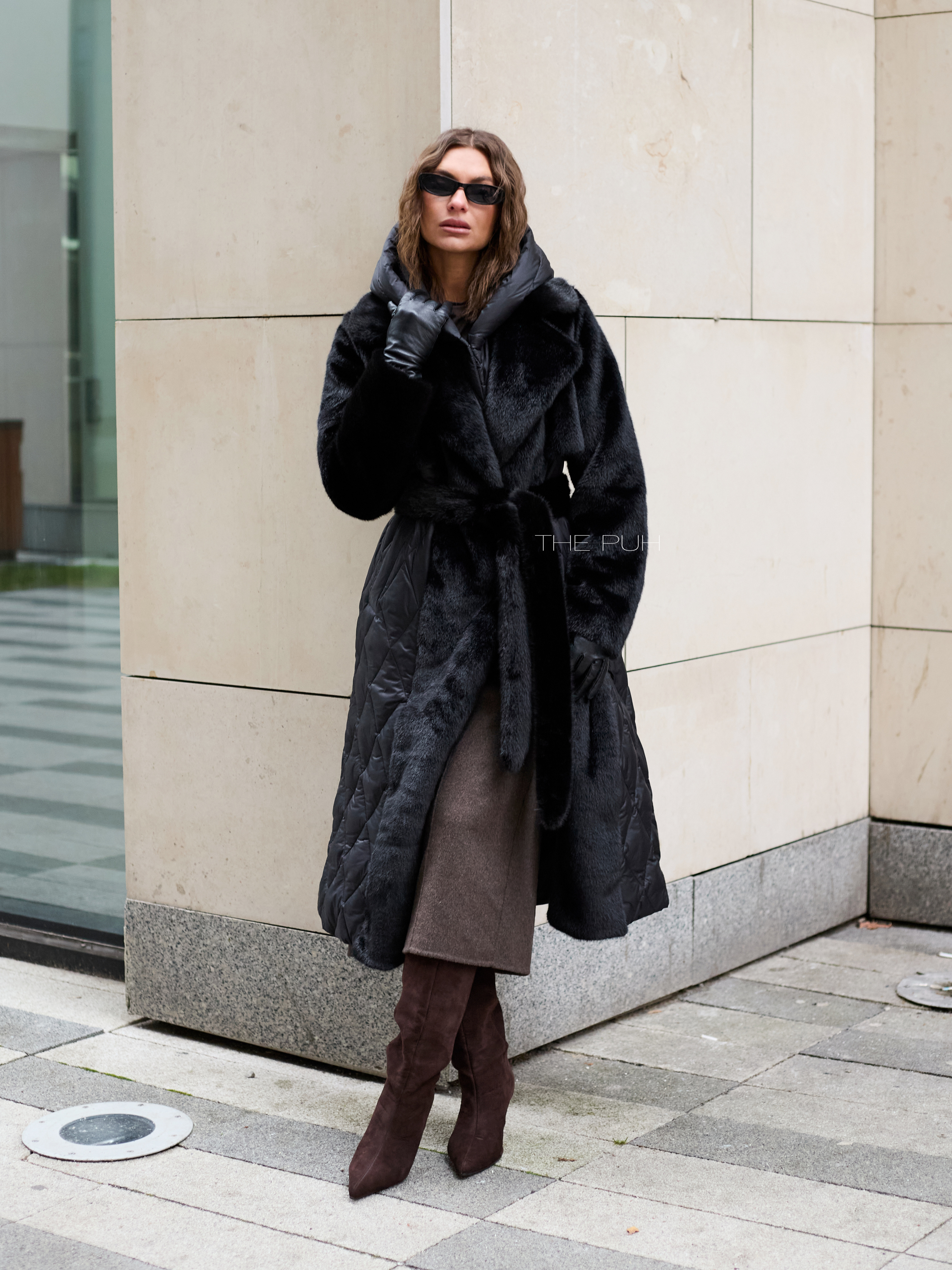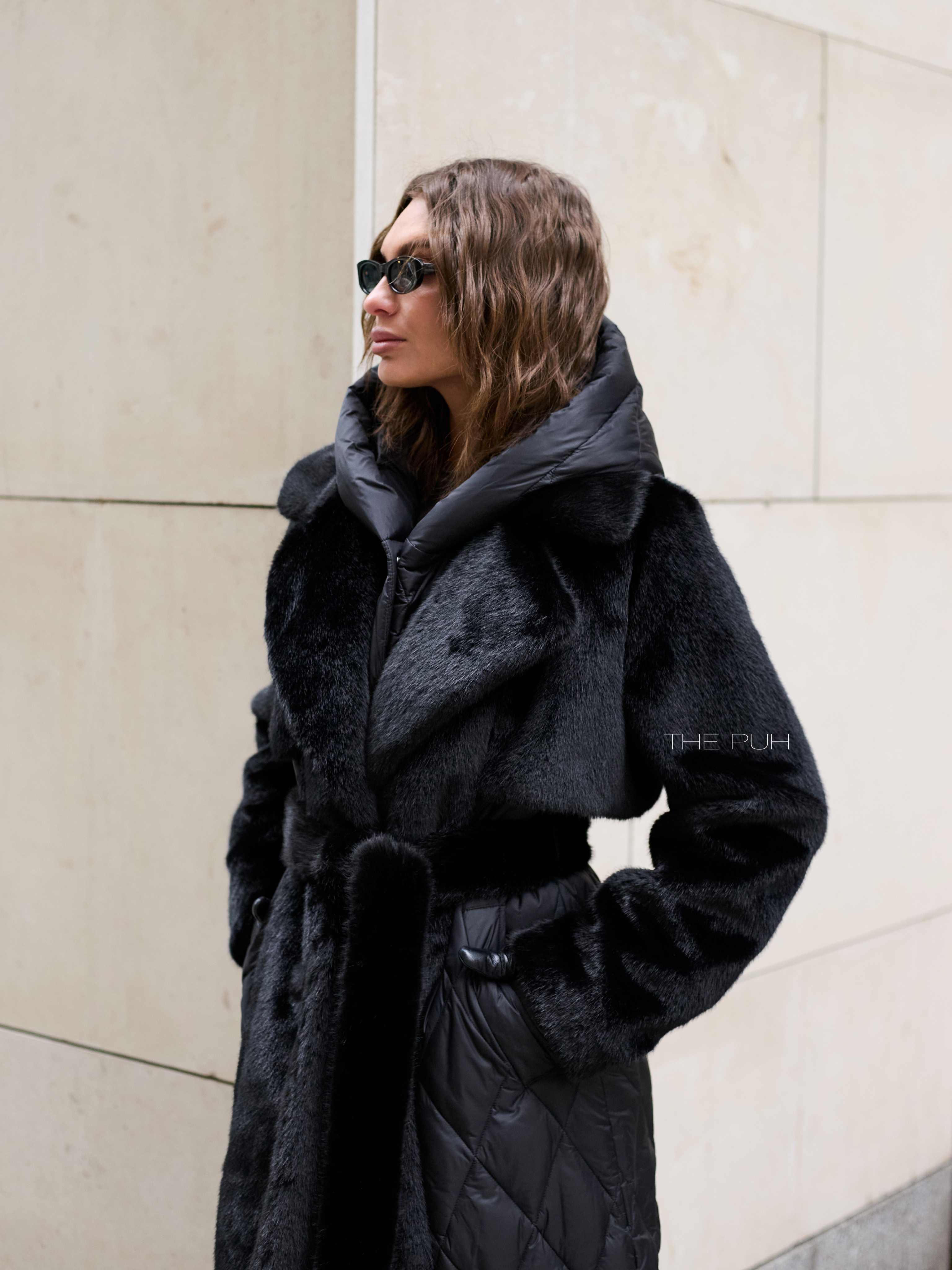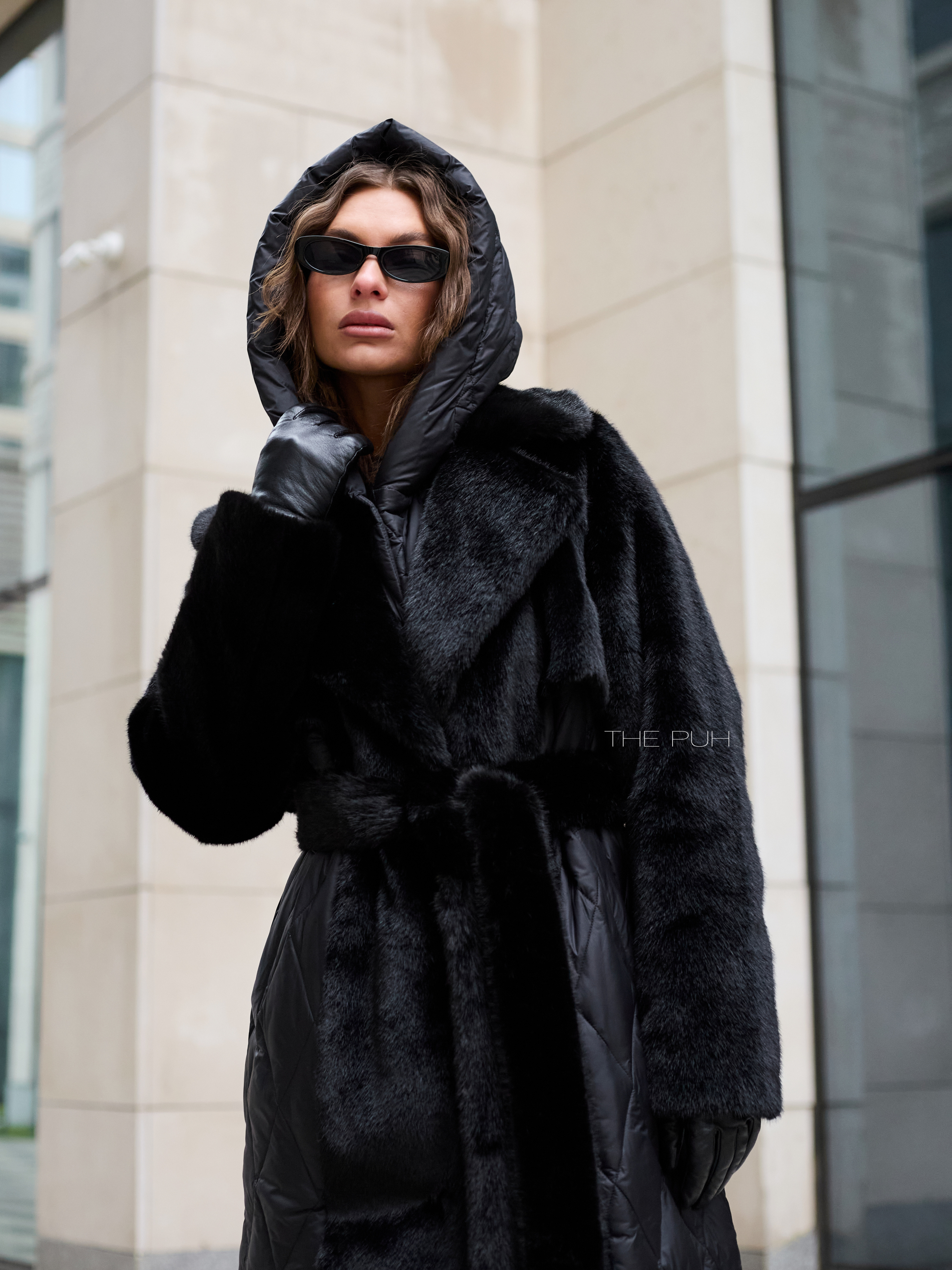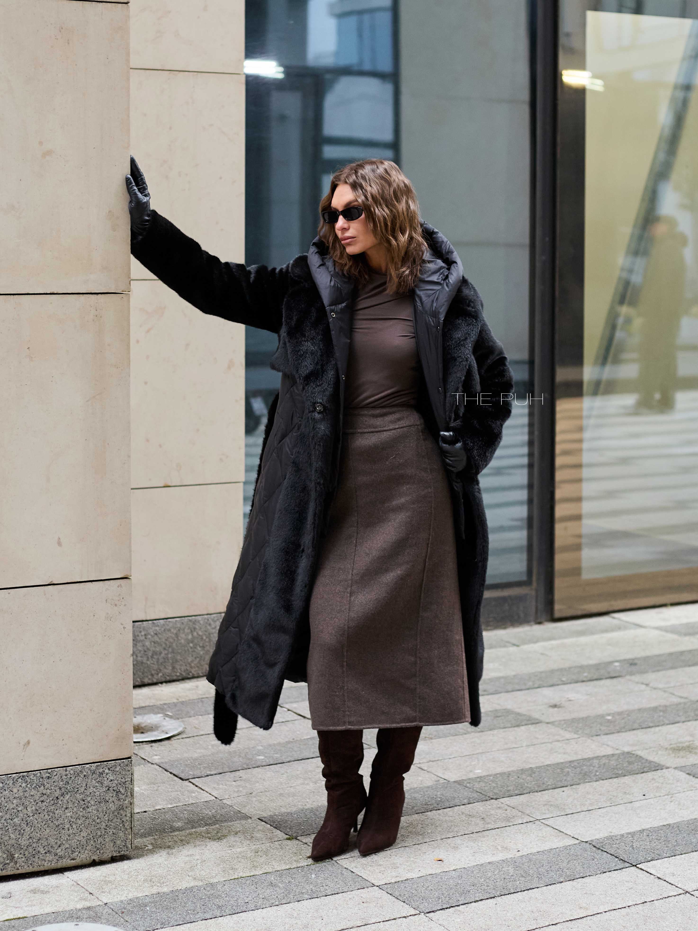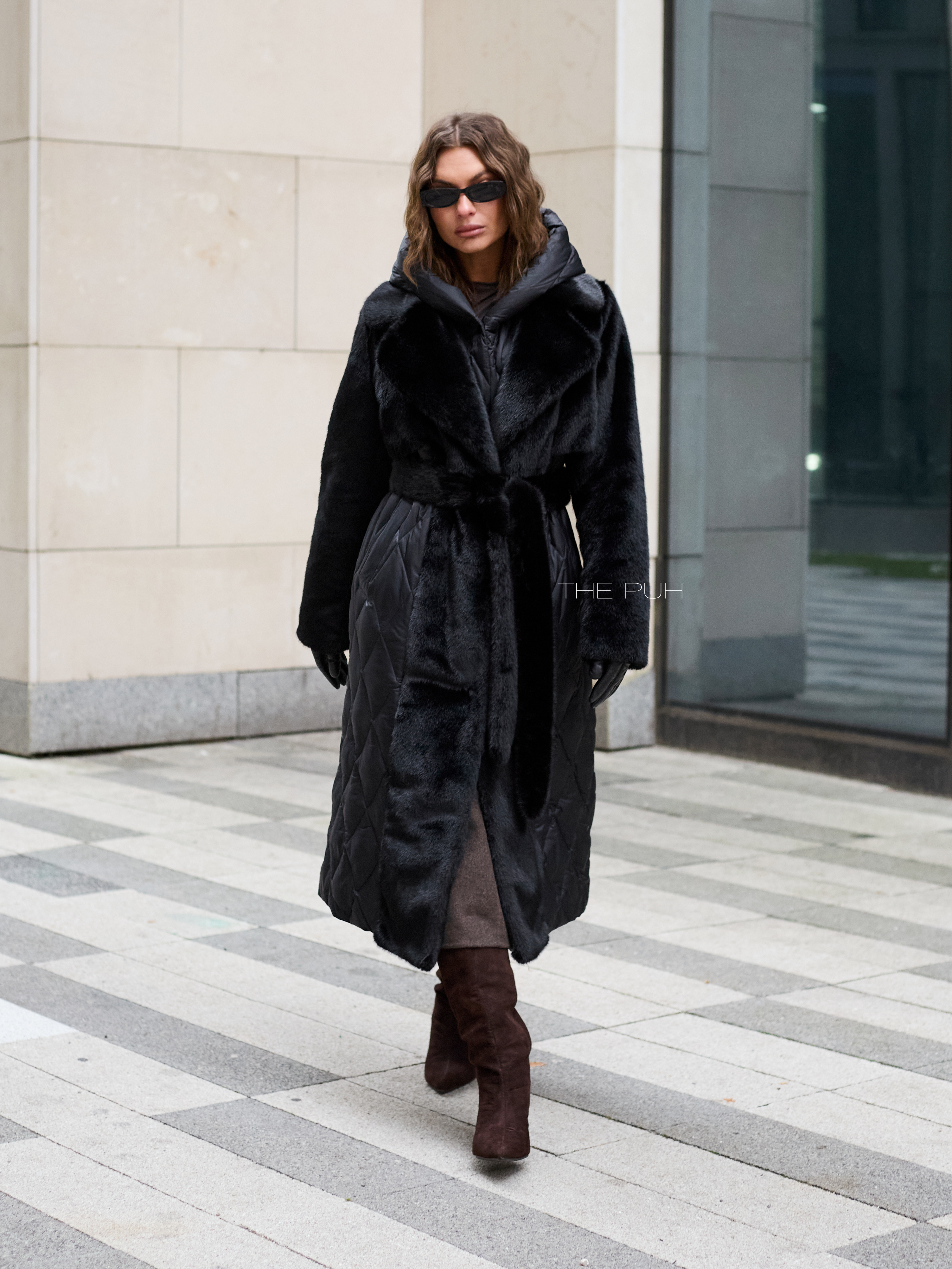 Комбинированный пуховик с отстегивающимся воротом-капюшоном и поясом, который можно носить в различных вариациях и комбинировать со многими вещами повседневного гардероба.