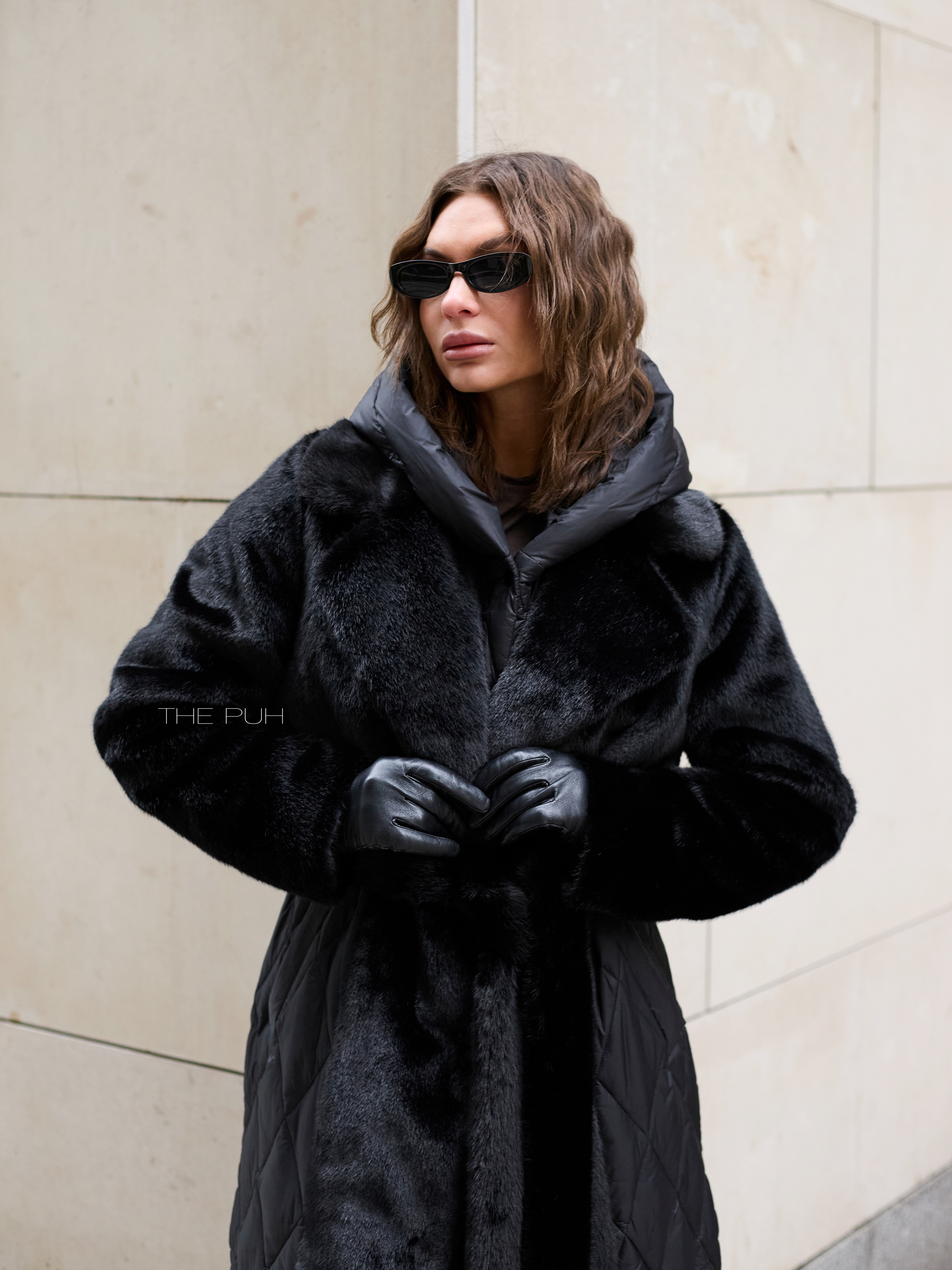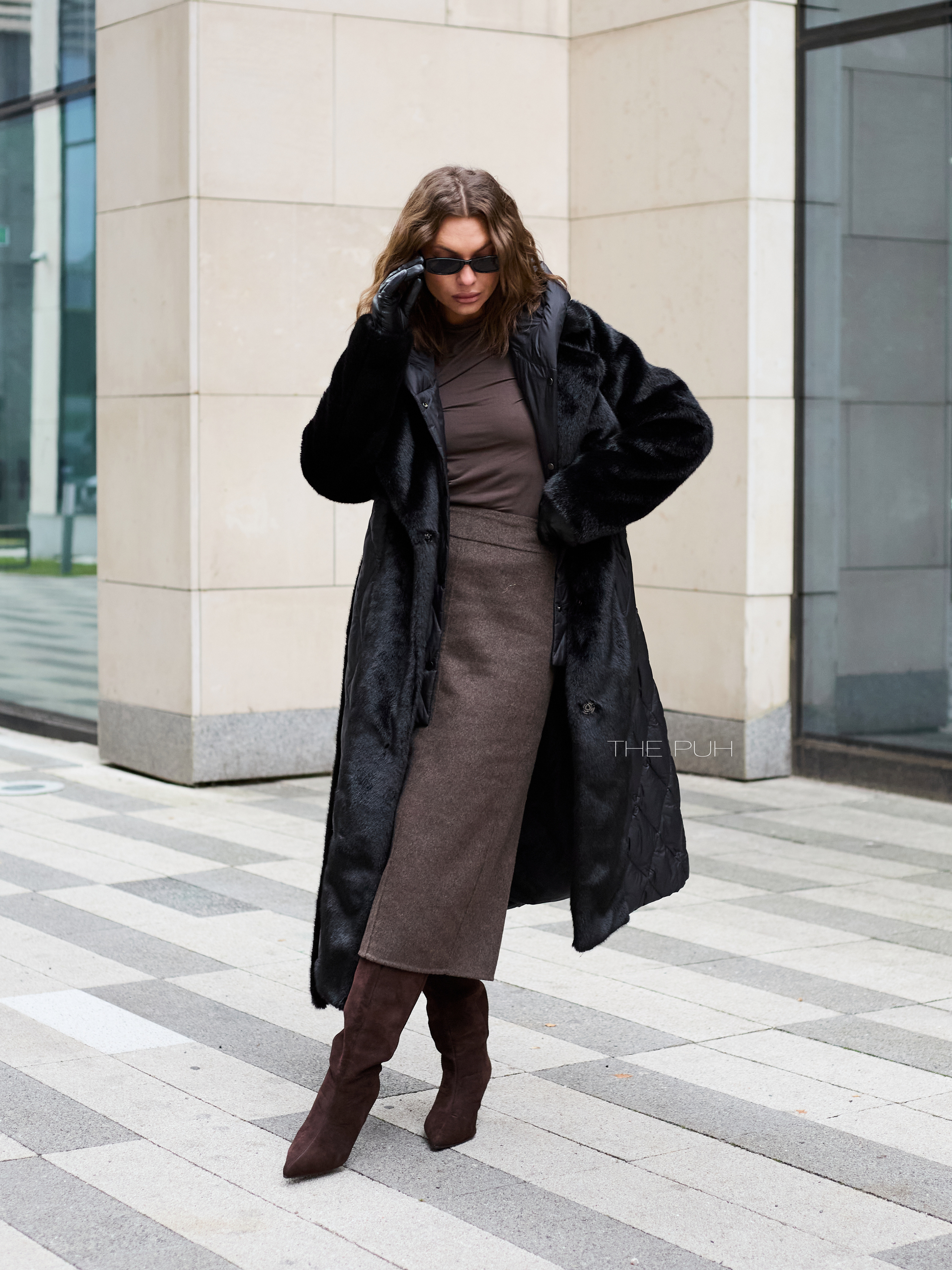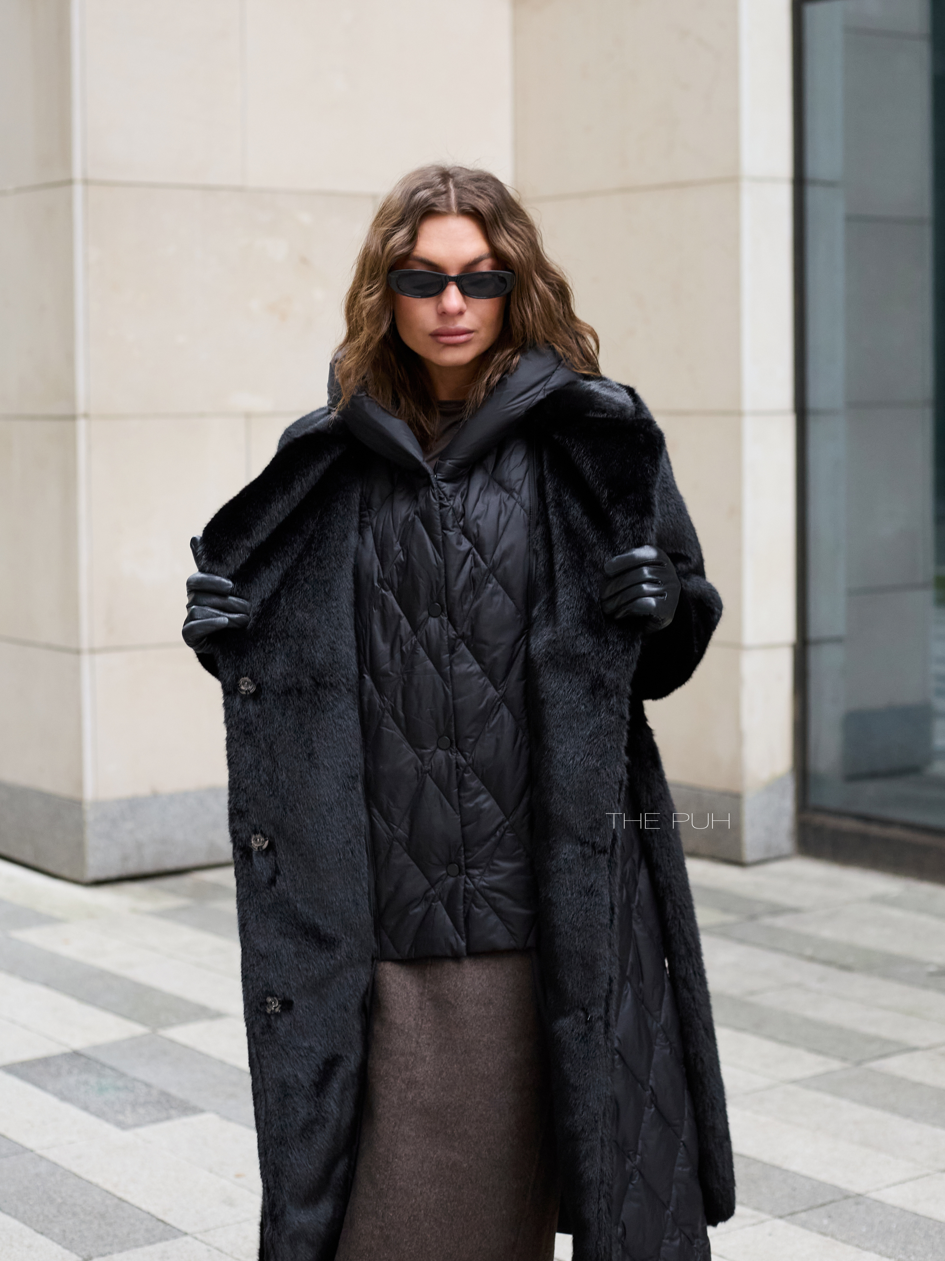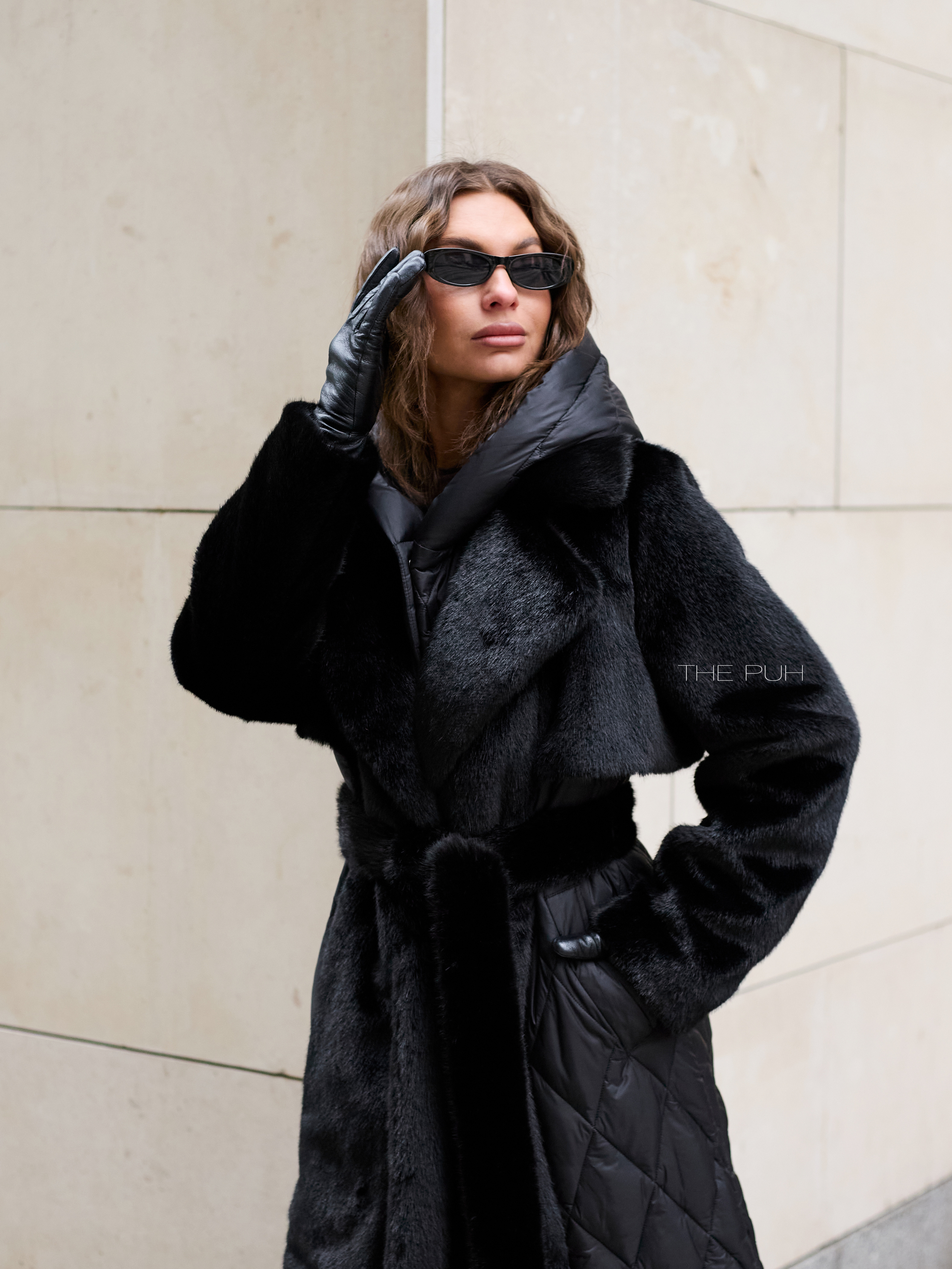 Комбинированный пуховик с отстегивающимся воротом-капюшоном и поясом, который можно носить в различных вариациях и комбинировать со многими вещами повседневного гардероба.
