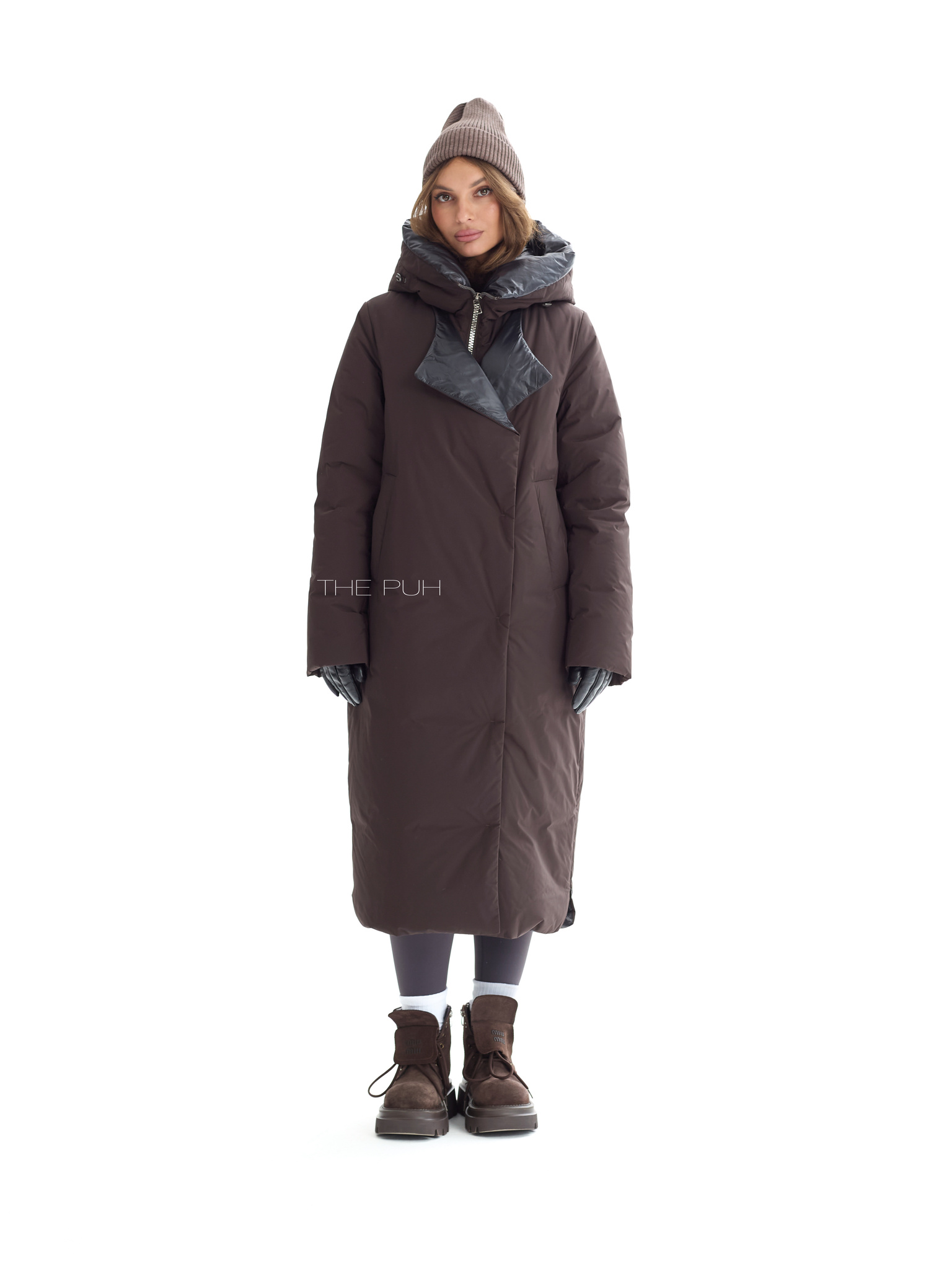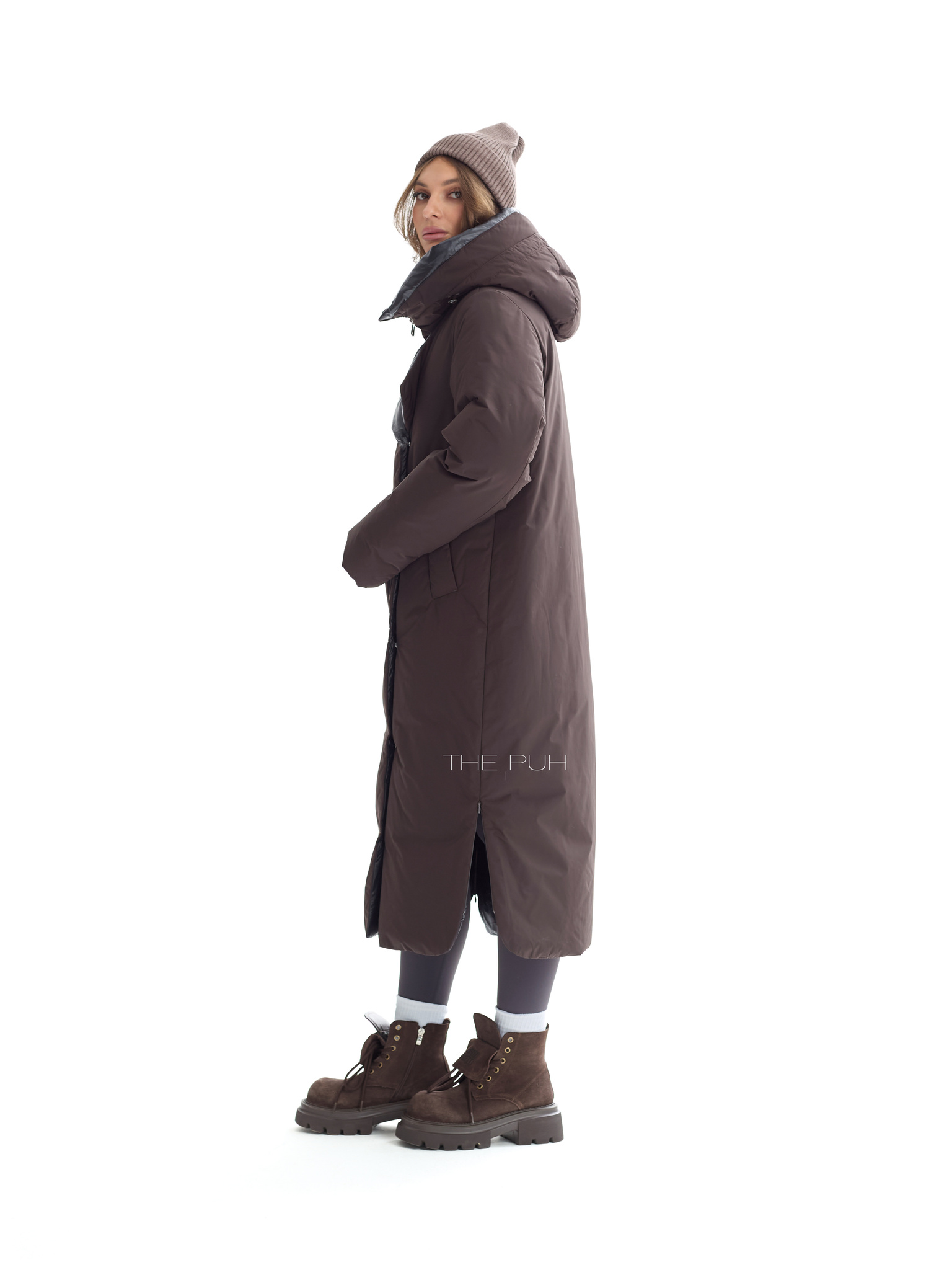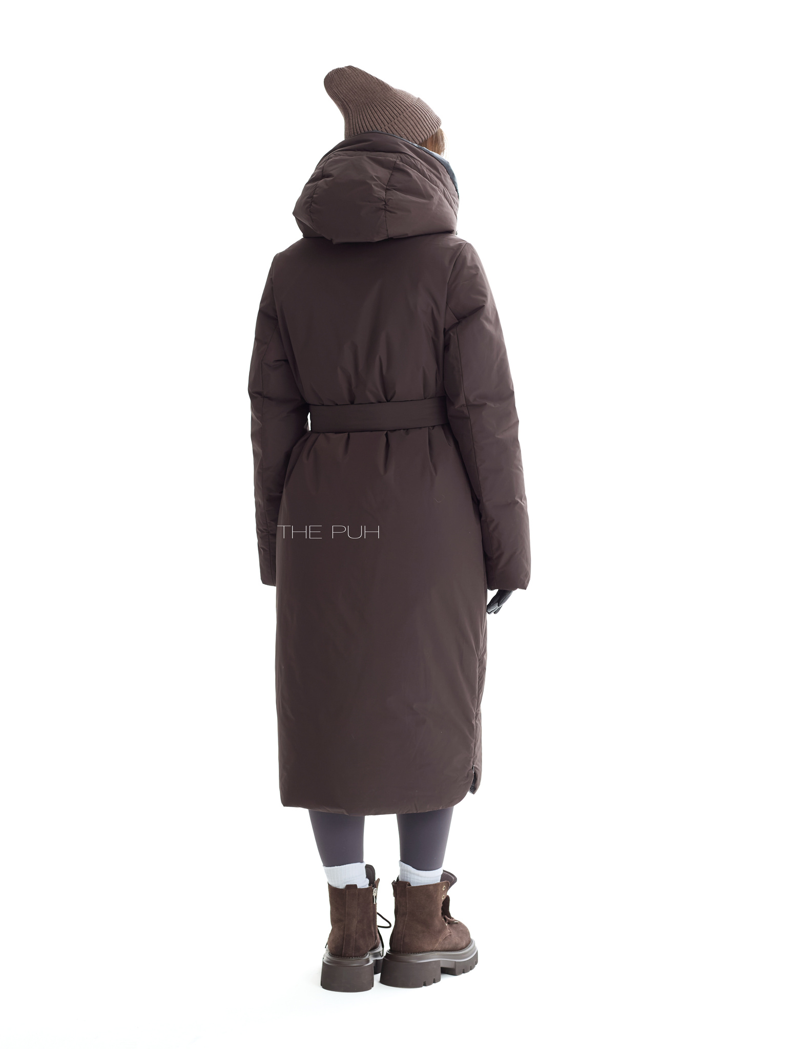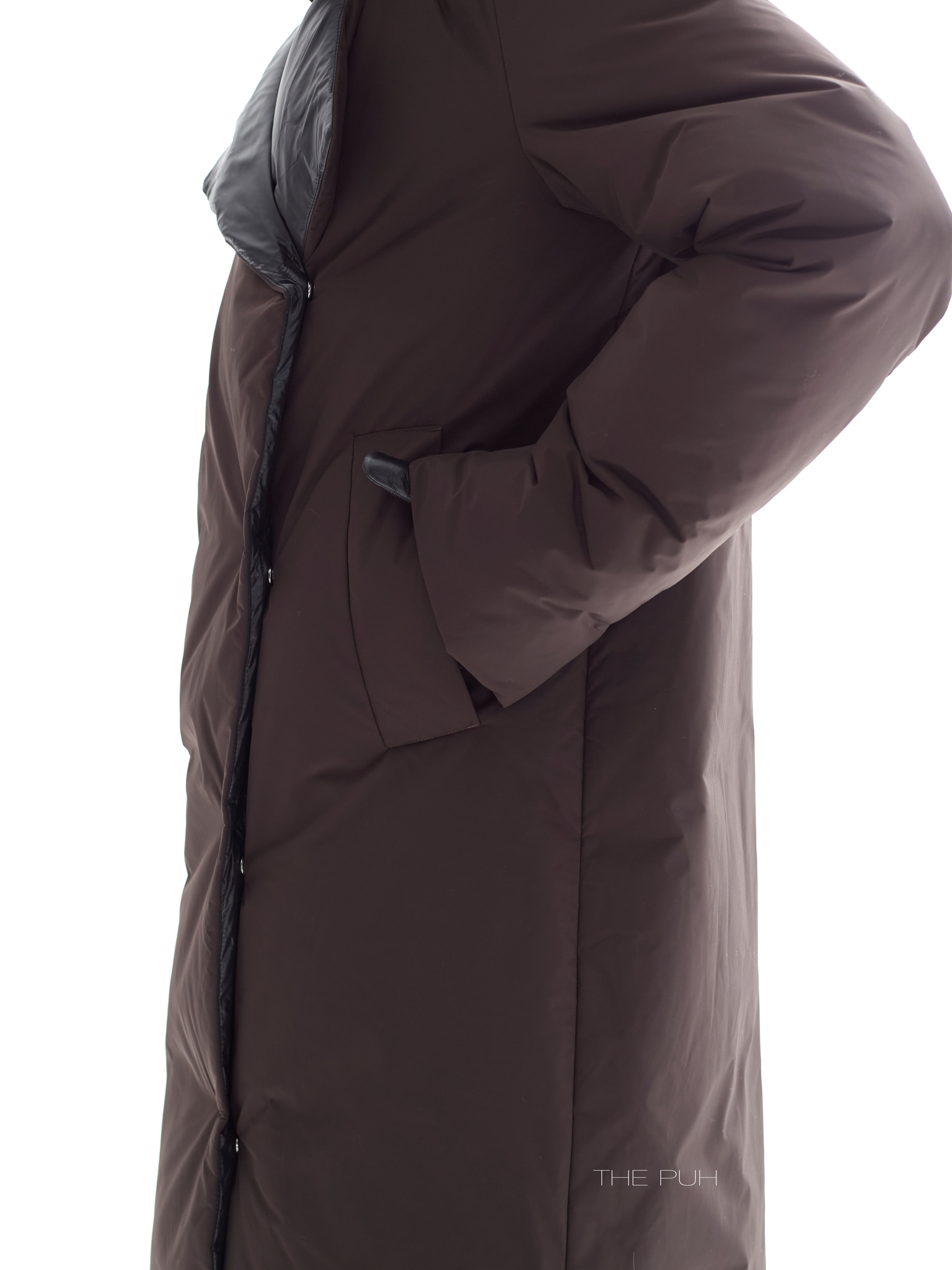 Темно-шоколадный длинный пуховик из матового текстиля с водоотталкивающей пропиткой. Удлиненная модель с дополнительной несъемной манишкой на молнии и капюшоном утеплена натуральным гусиным пухом и подходит для самой глубокой зимы.
