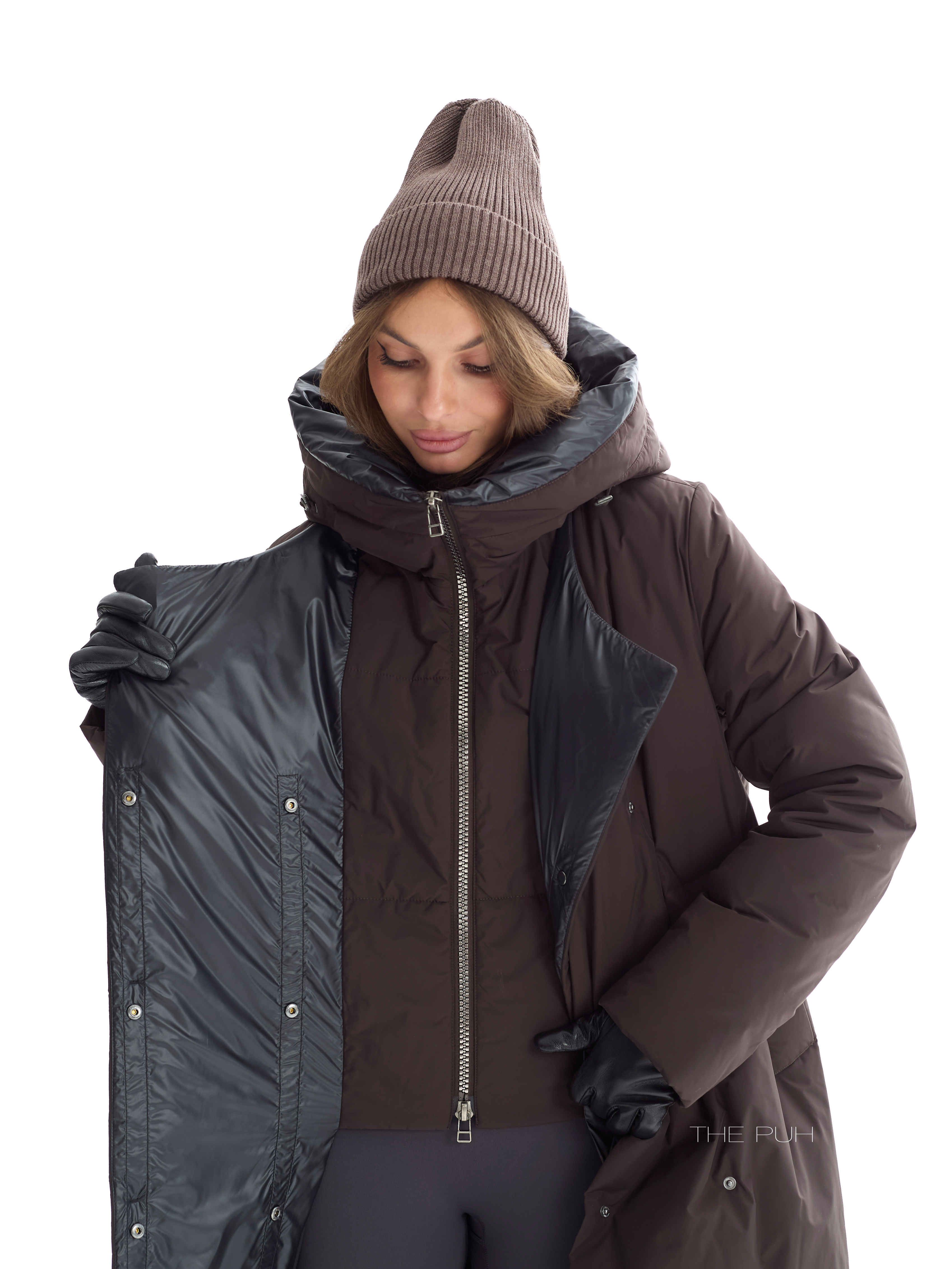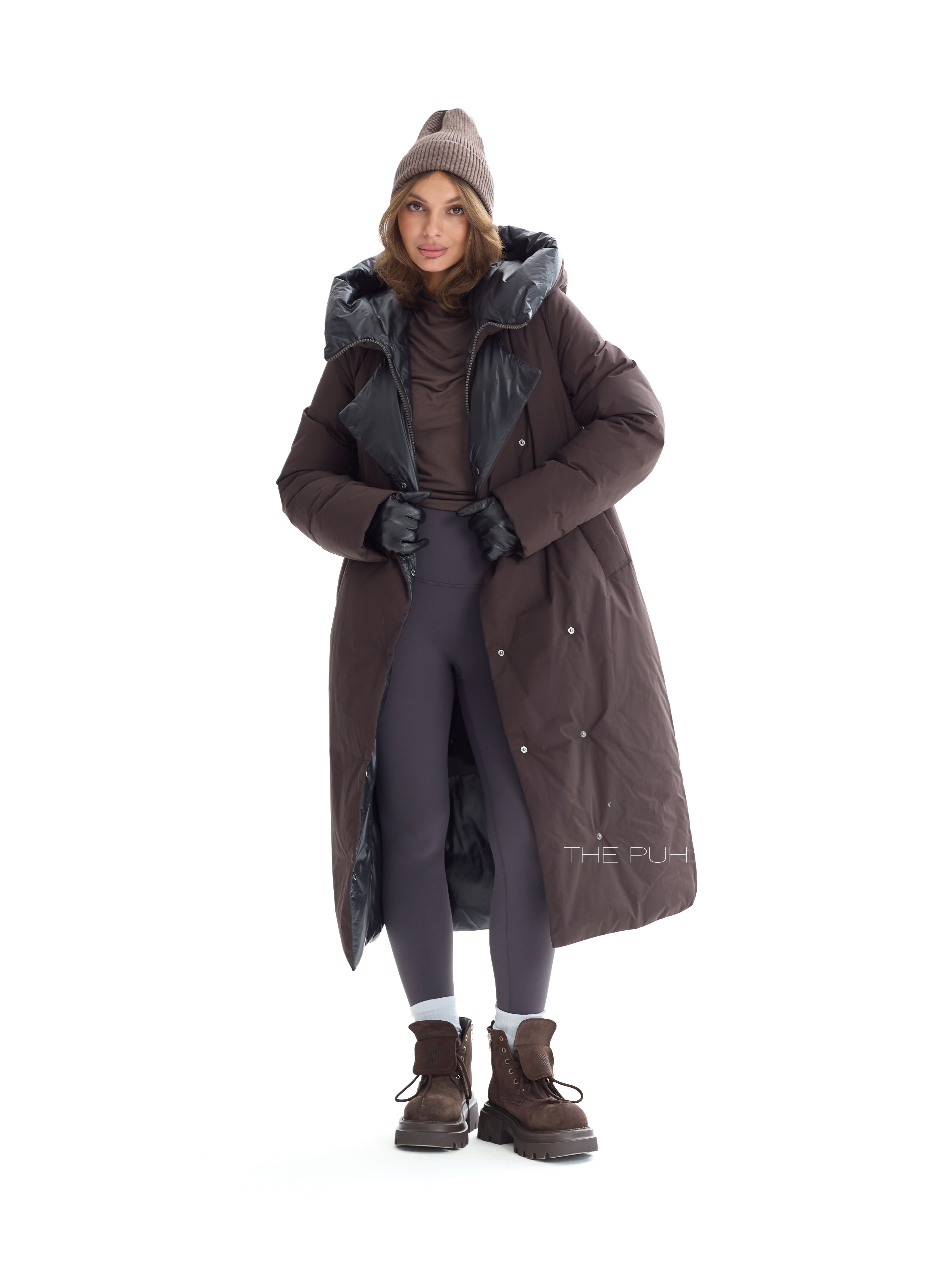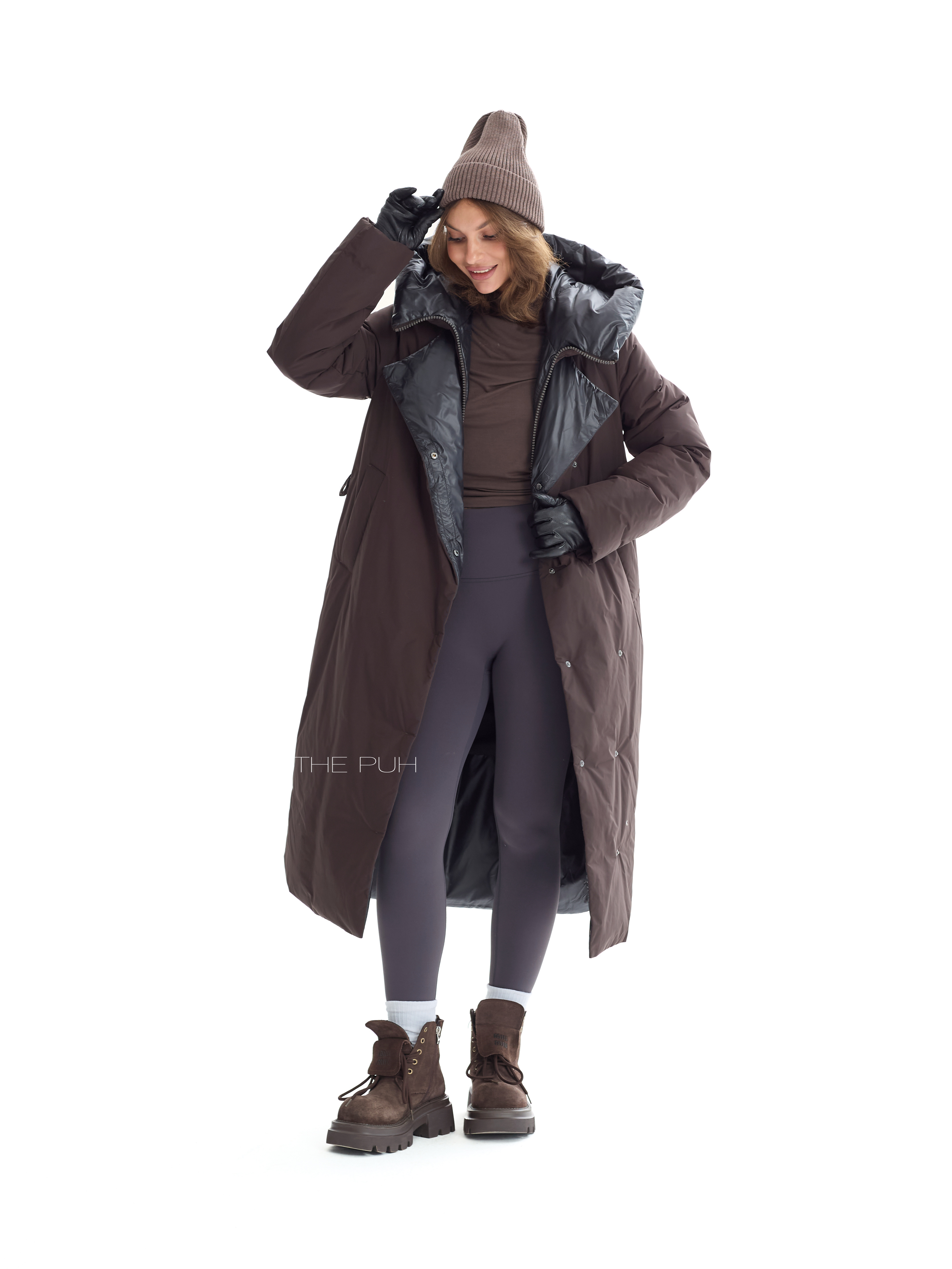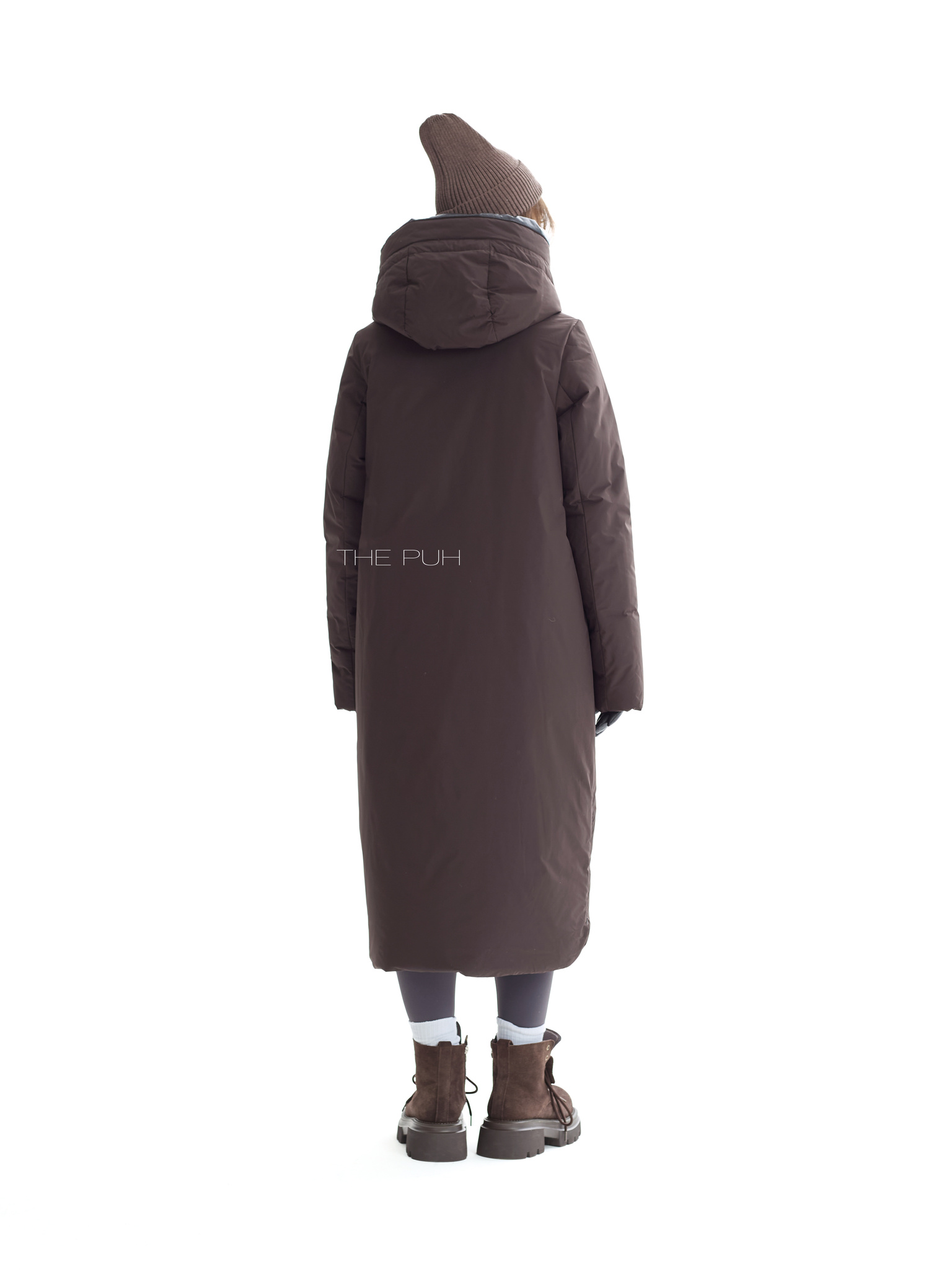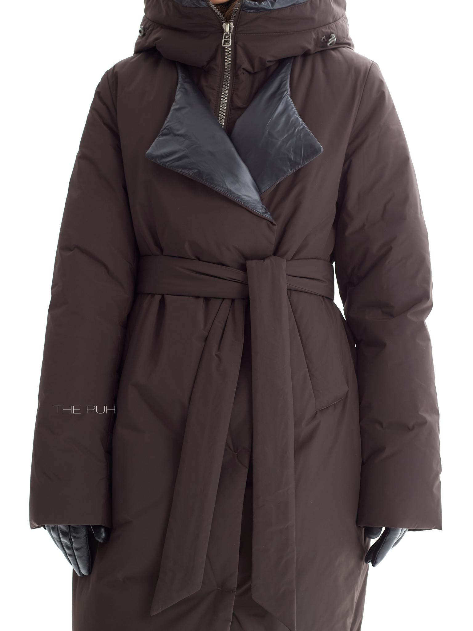 Темно-шоколадный длинный пуховик из матового текстиля с водоотталкивающей пропиткой. Удлиненная модель с дополнительной несъемной манишкой на молнии и капюшоном утеплена натуральным гусиным пухом и подходит для самой глубокой зимы.