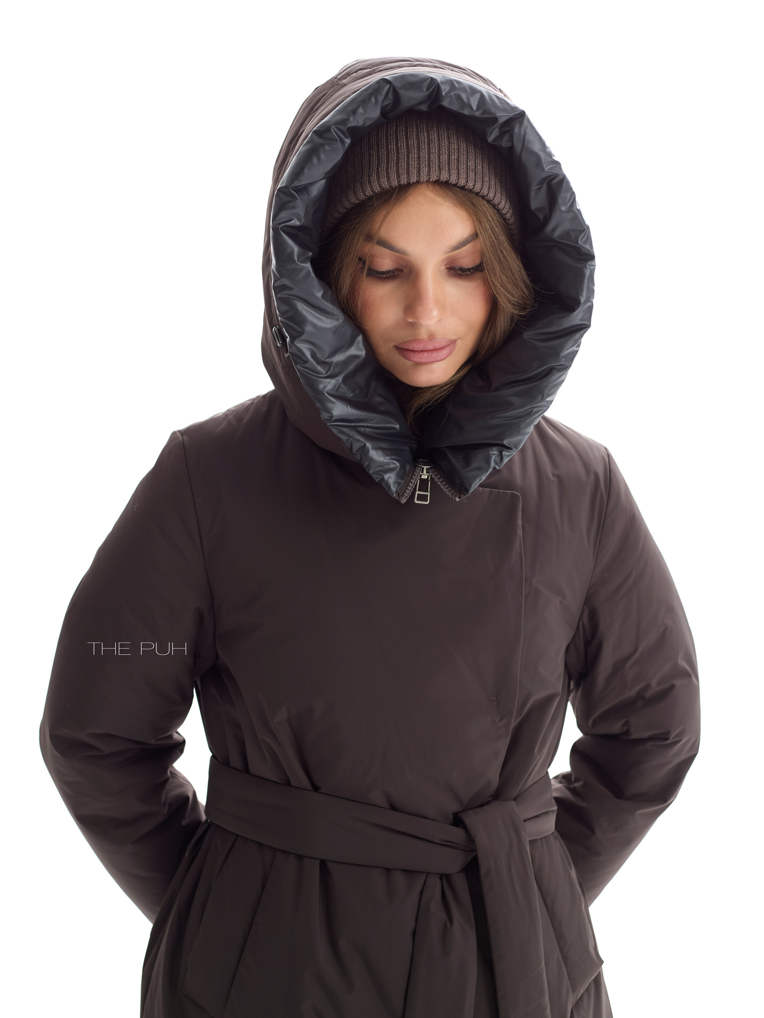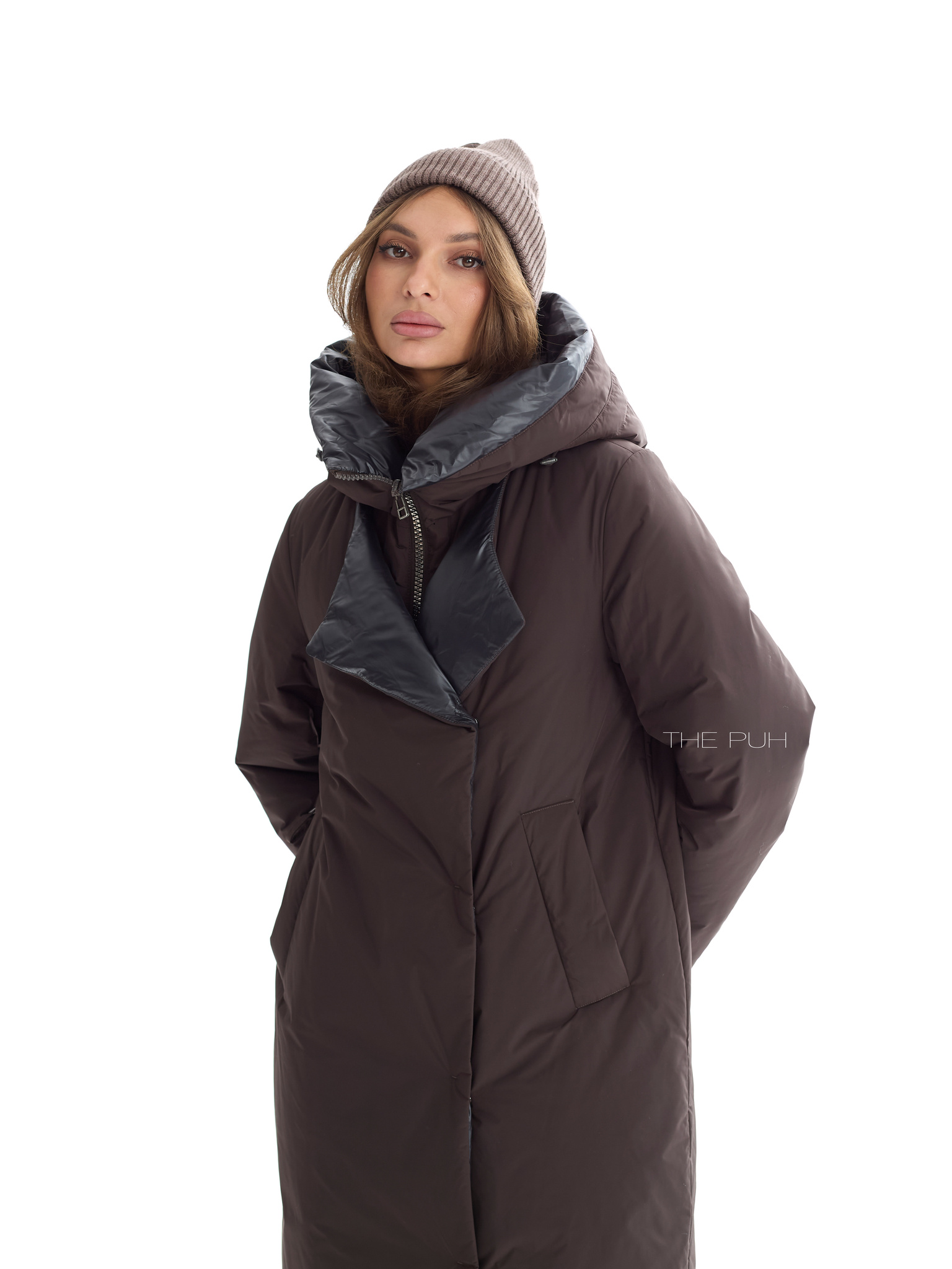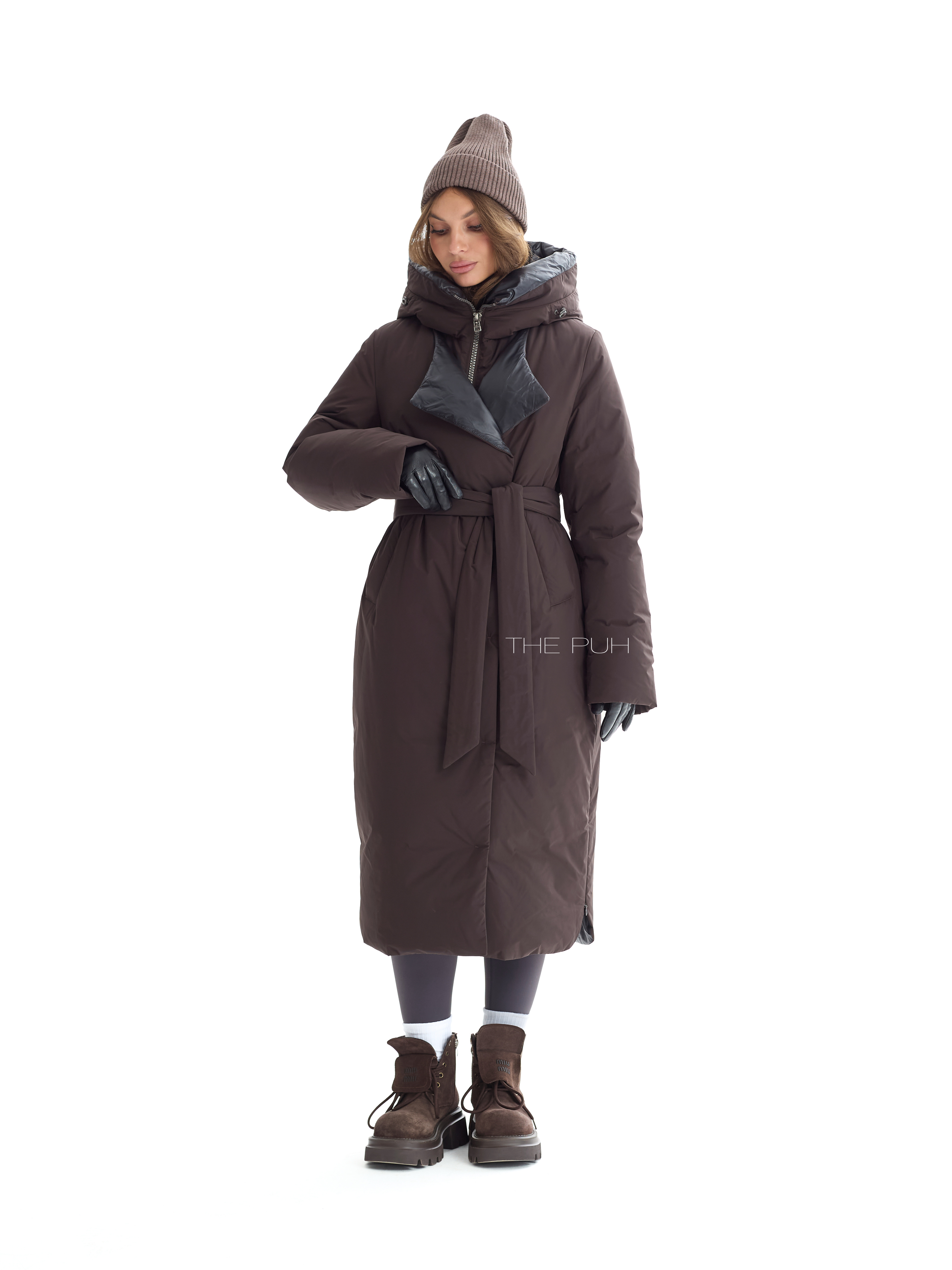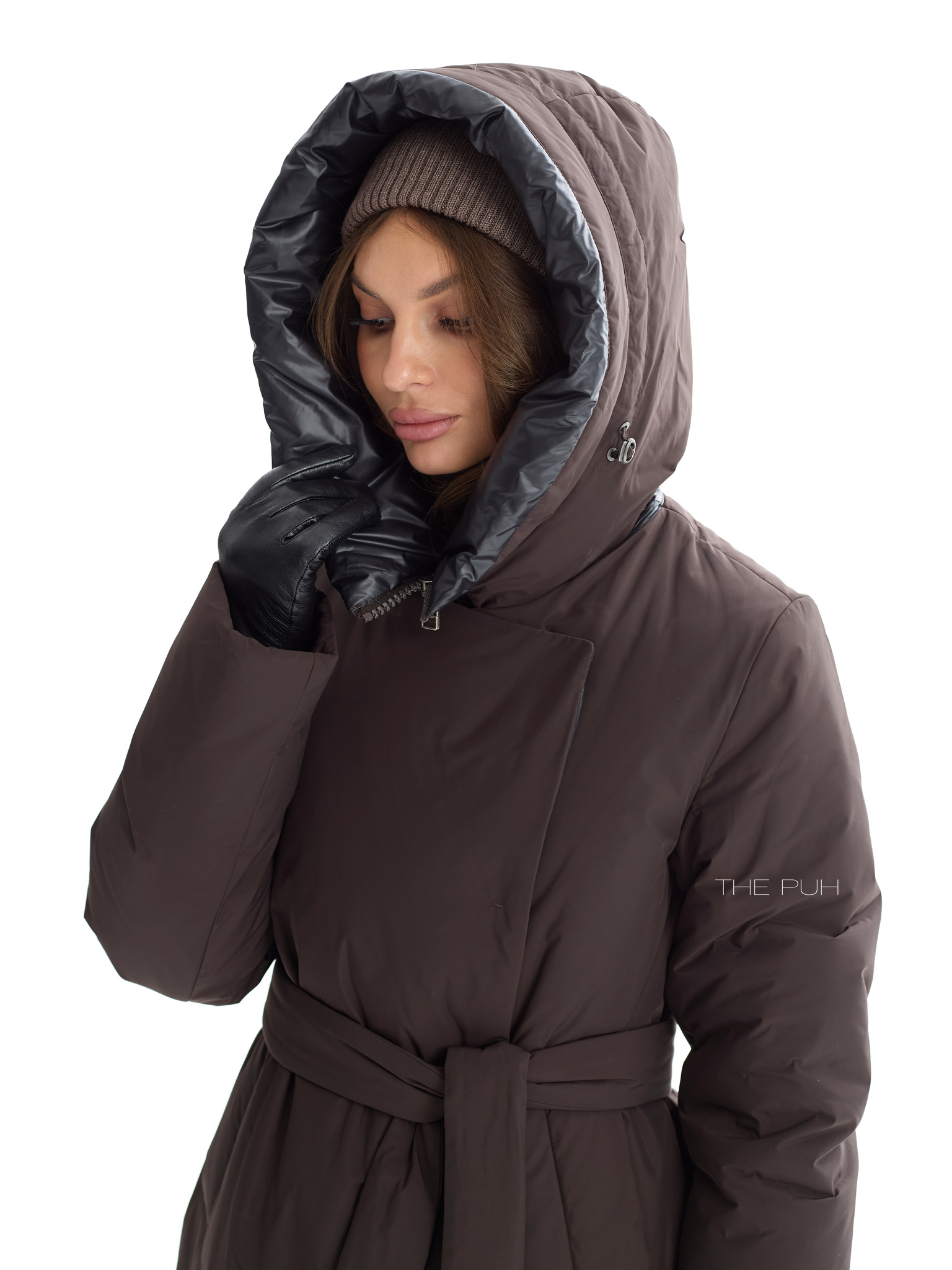 Темно-шоколадный длинный пуховик из матового текстиля с водоотталкивающей пропиткой. Удлиненная модель с дополнительной несъемной манишкой на молнии и капюшоном утеплена натуральным гусиным пухом и подходит для самой глубокой зимы.