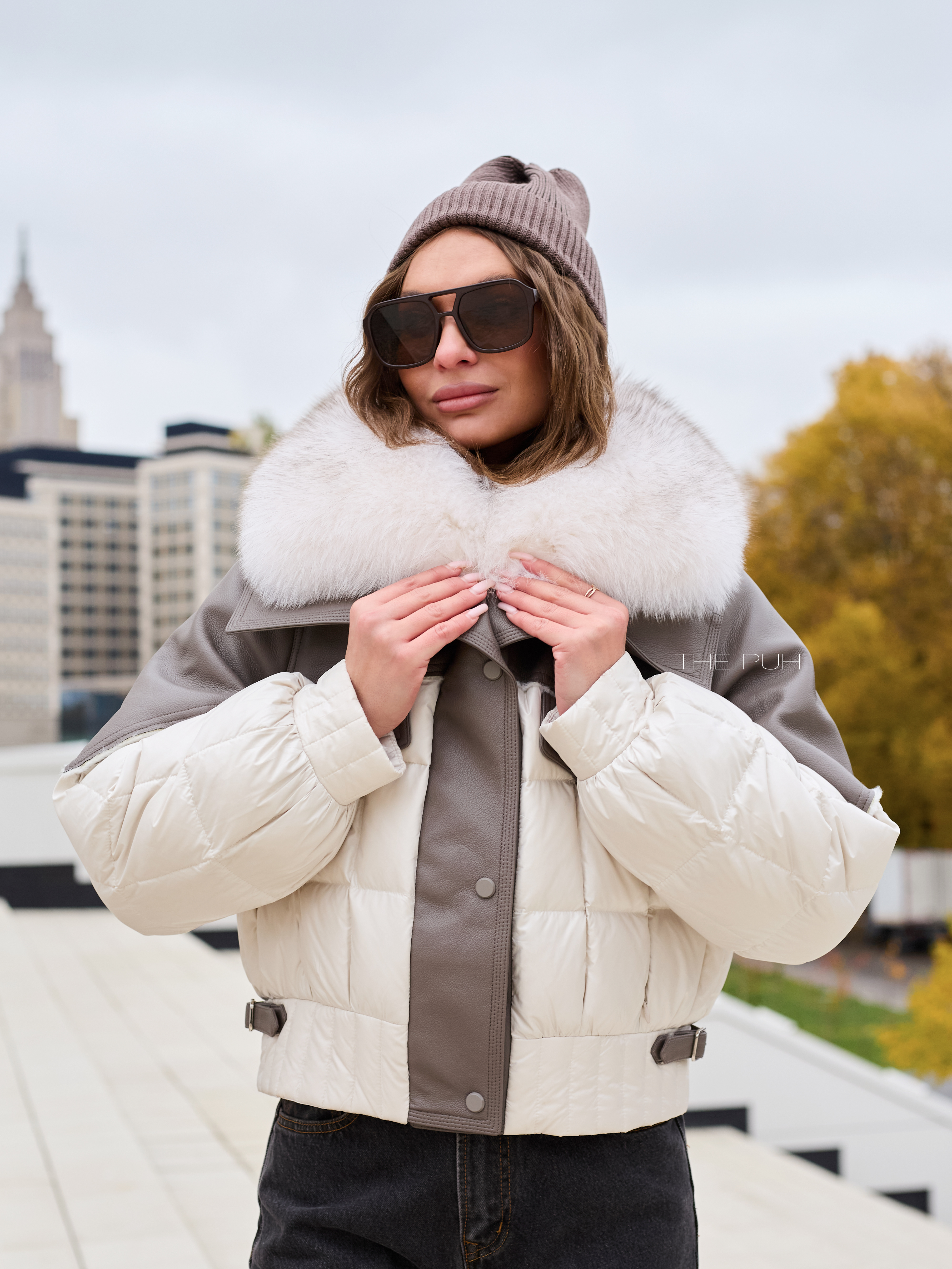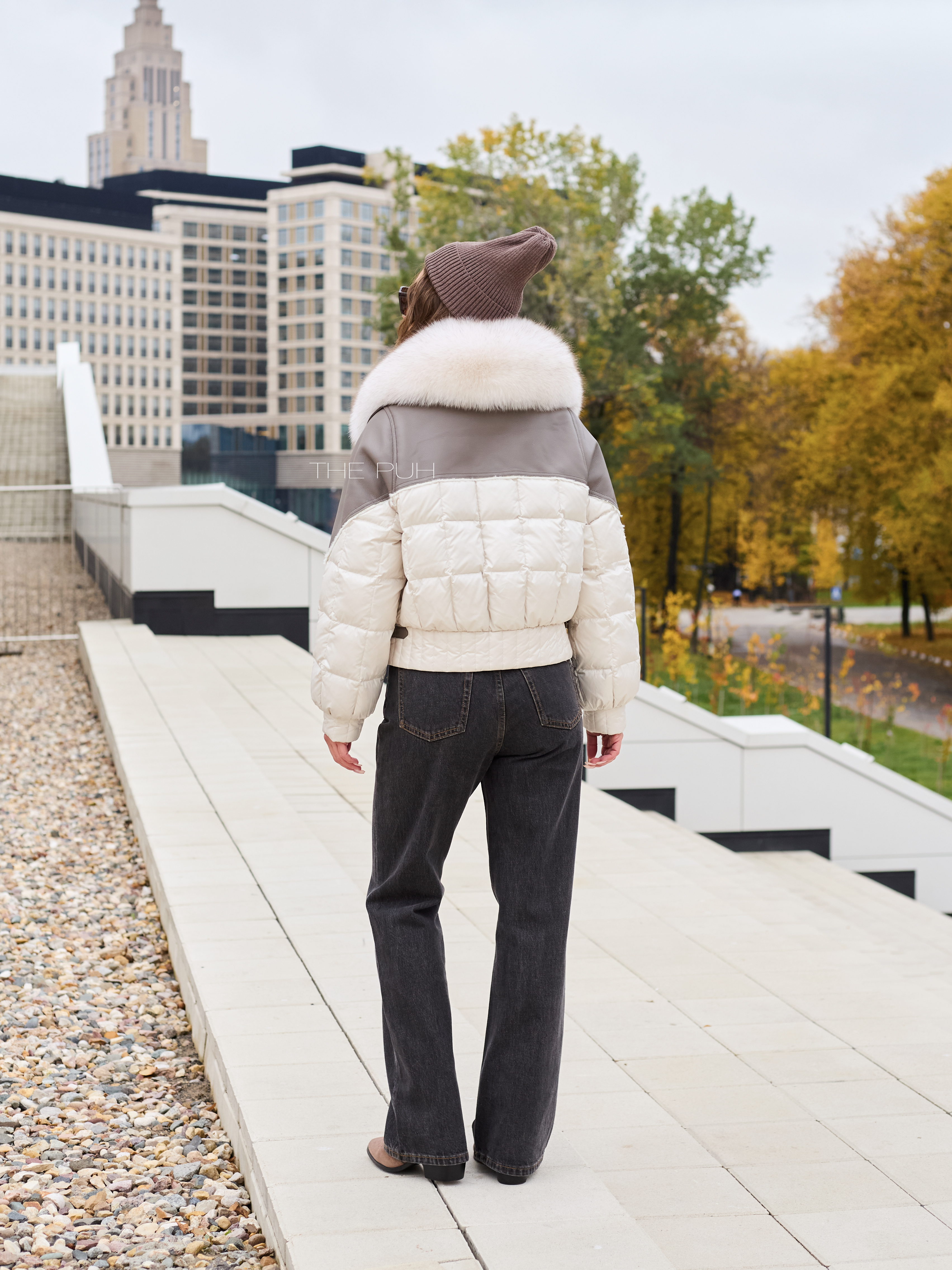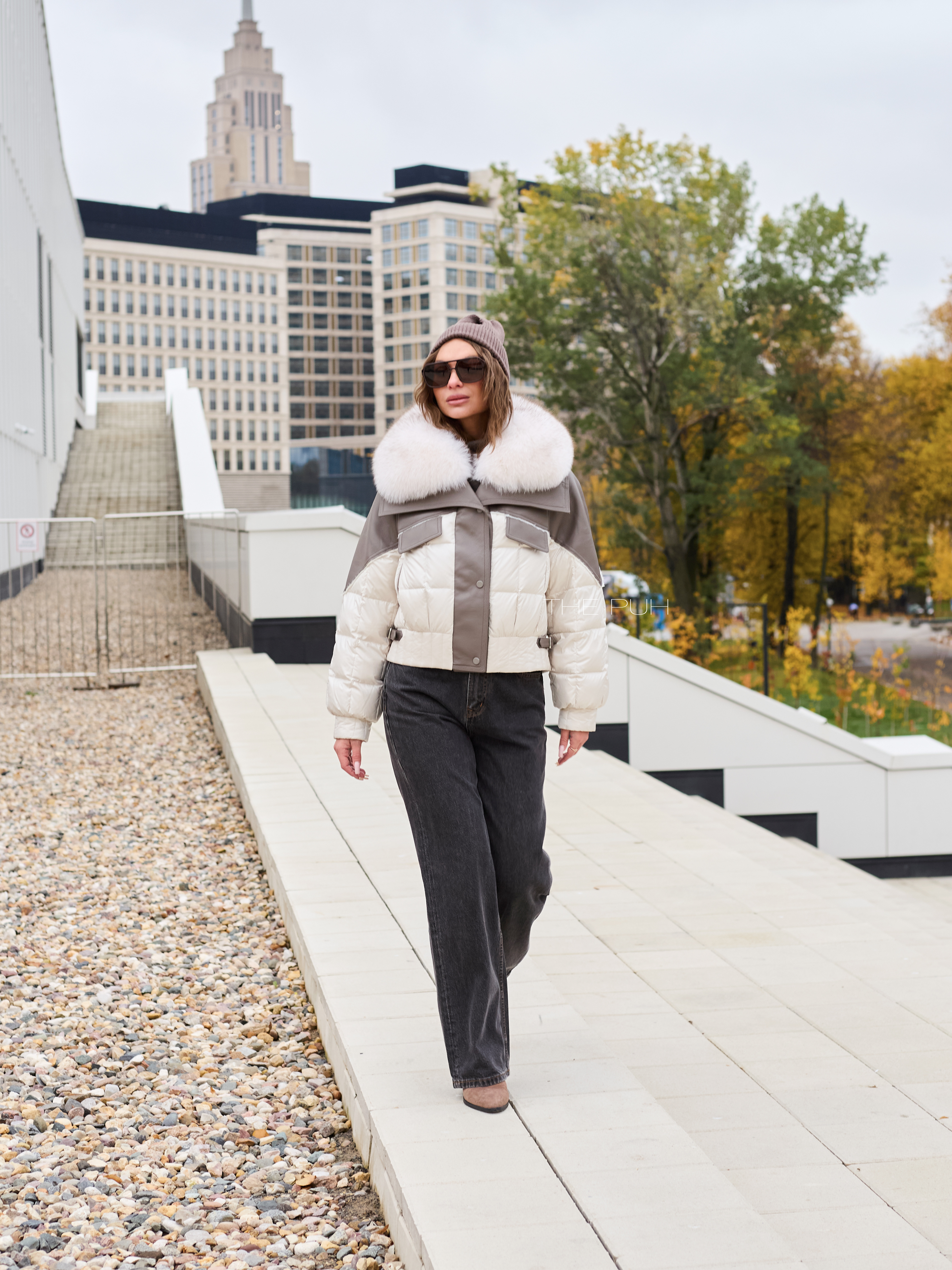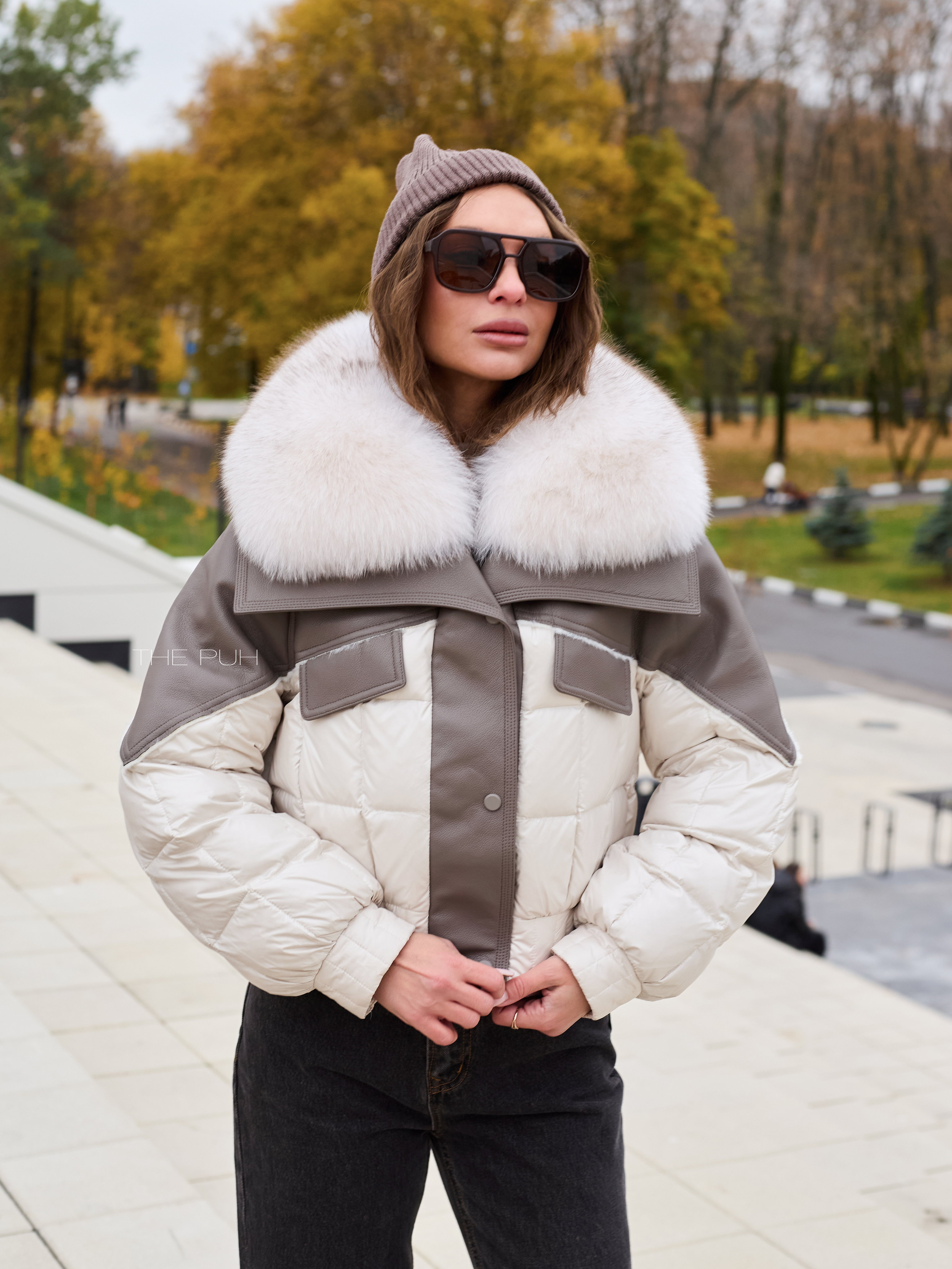 Укороченный пуховик выполнен из кофейной эко-кожи и нейлона молочного цвета и дополнен съемным воротником из меха песца. Модель утеплена натуральным гусиным пухом и пером, так что спокойно выдерживает сильные морозы.