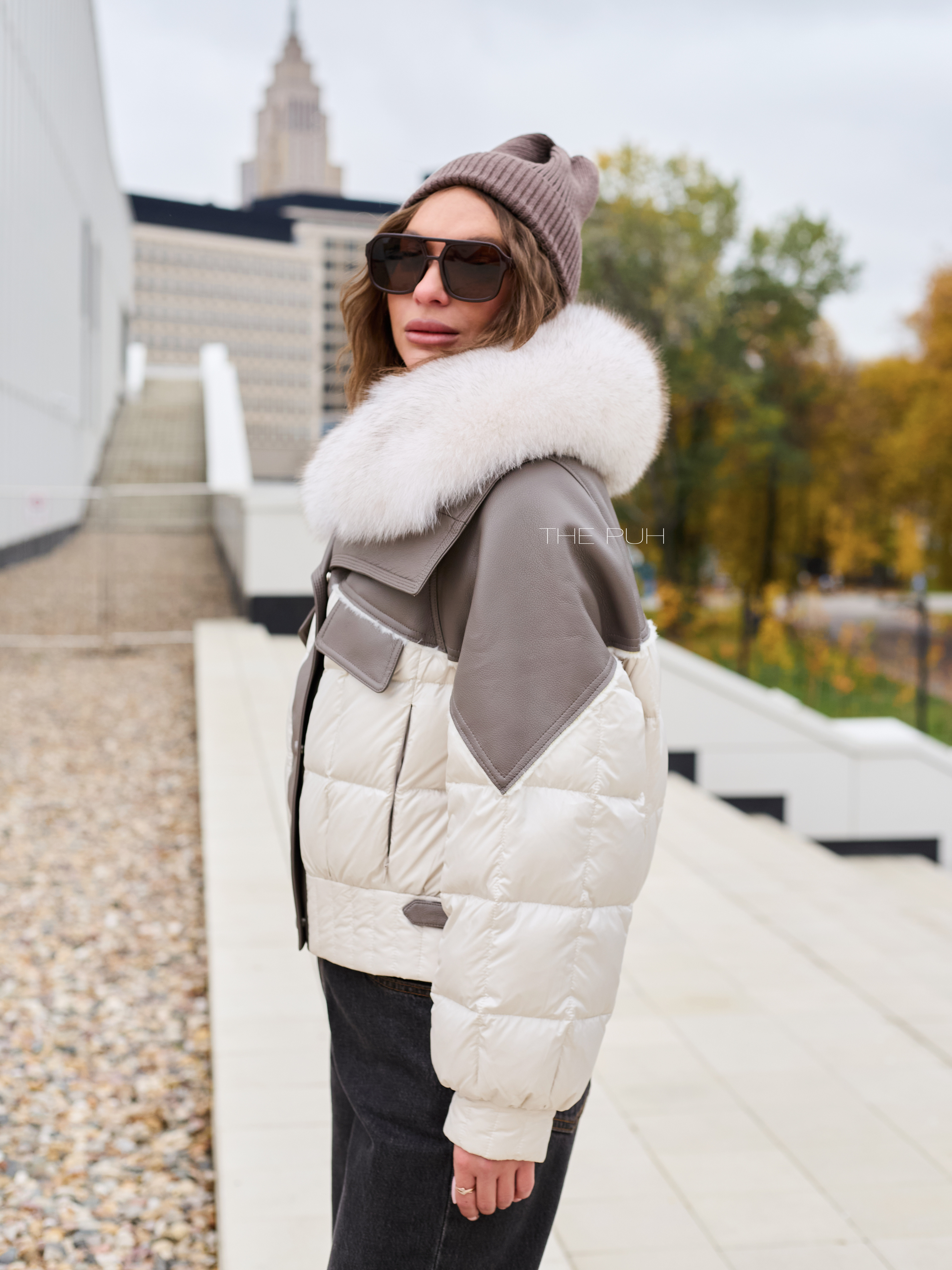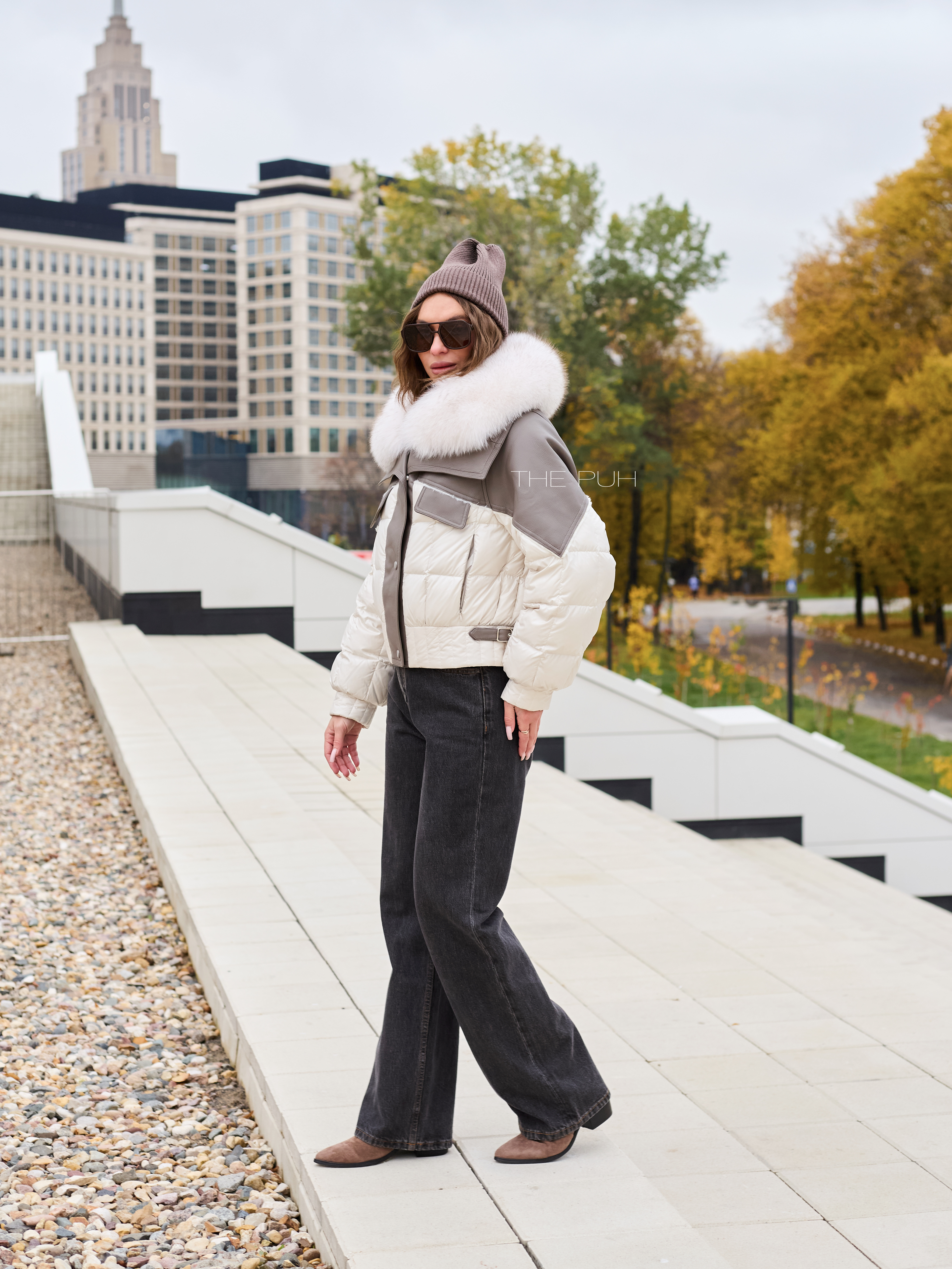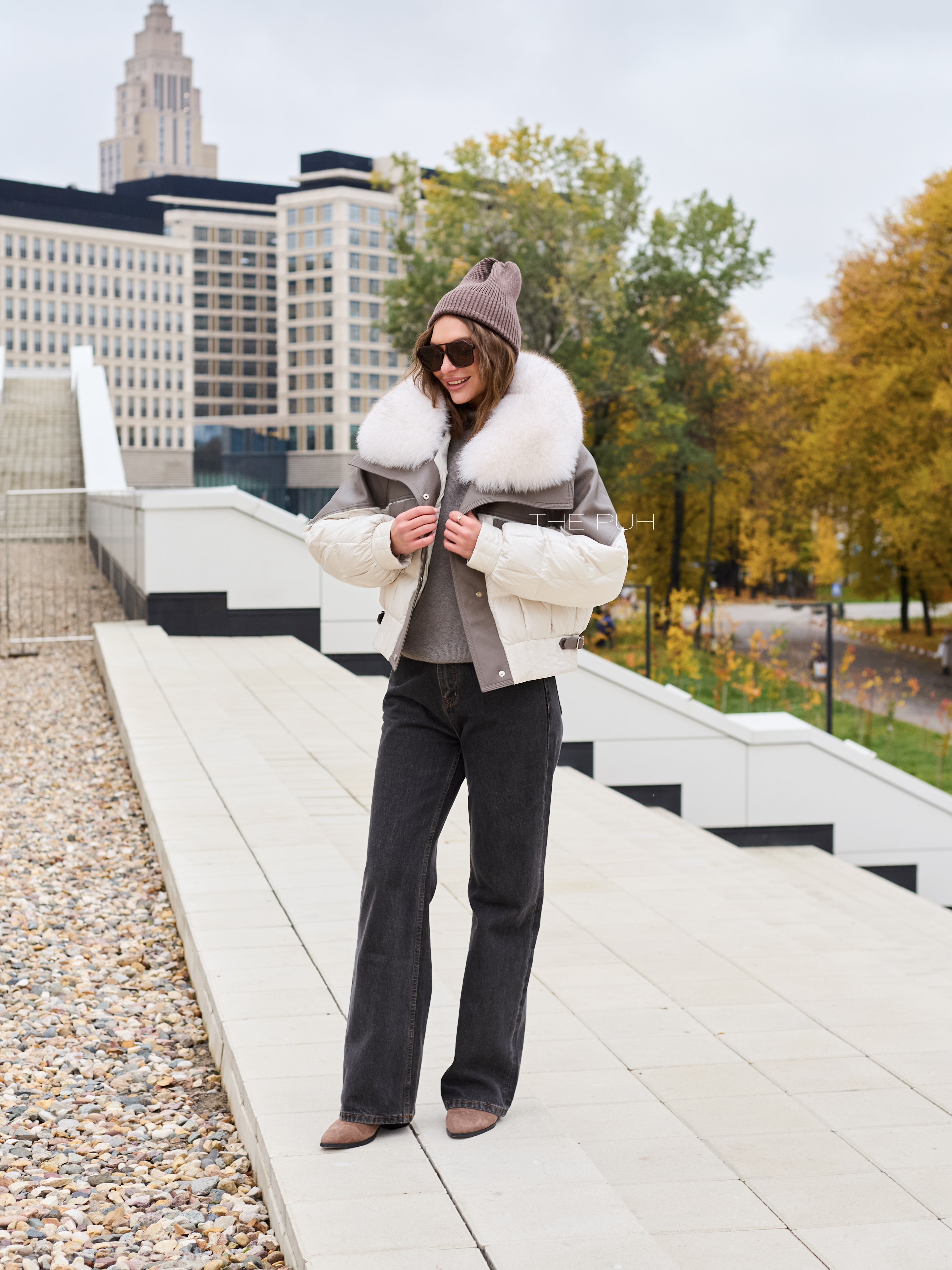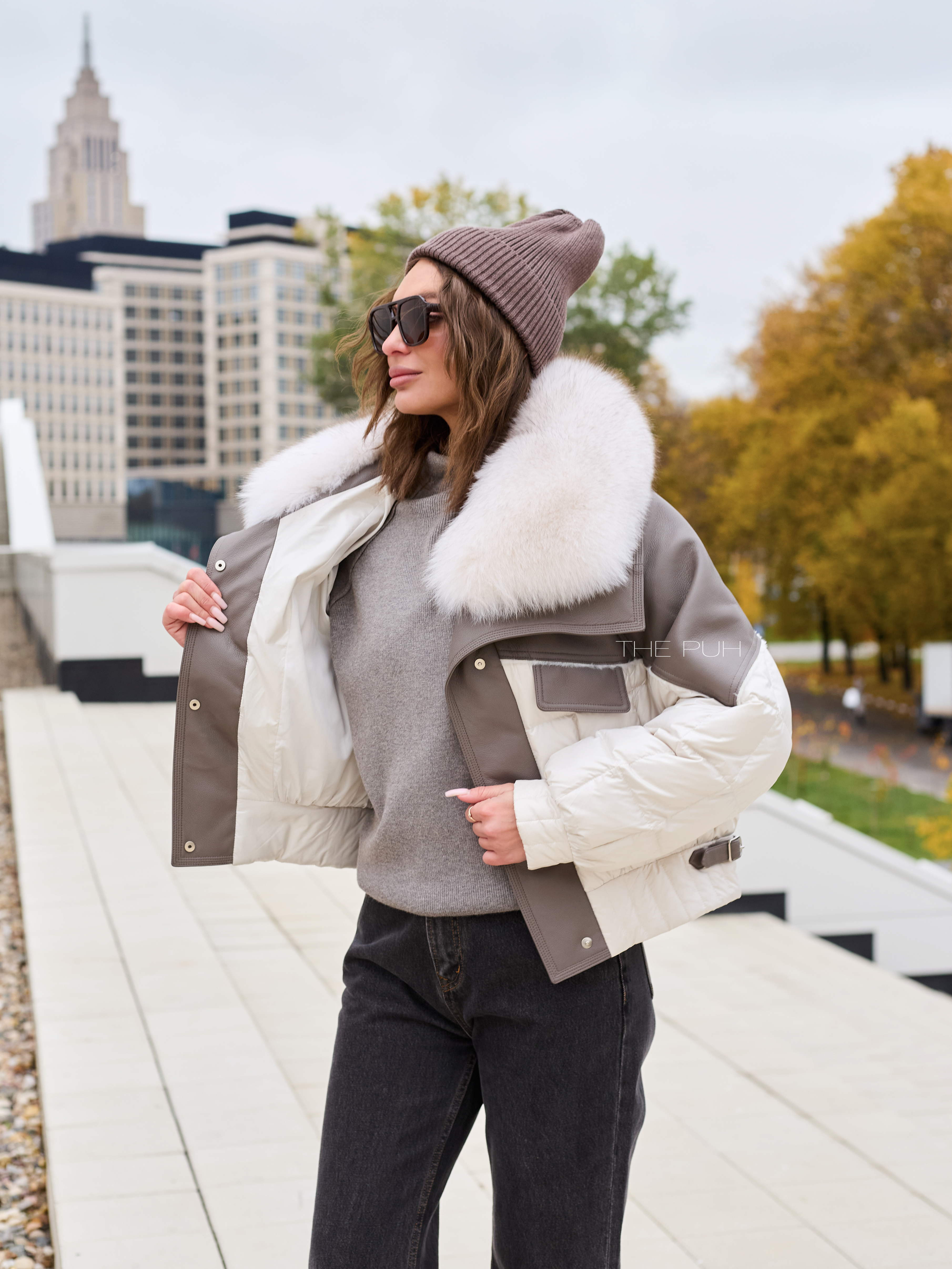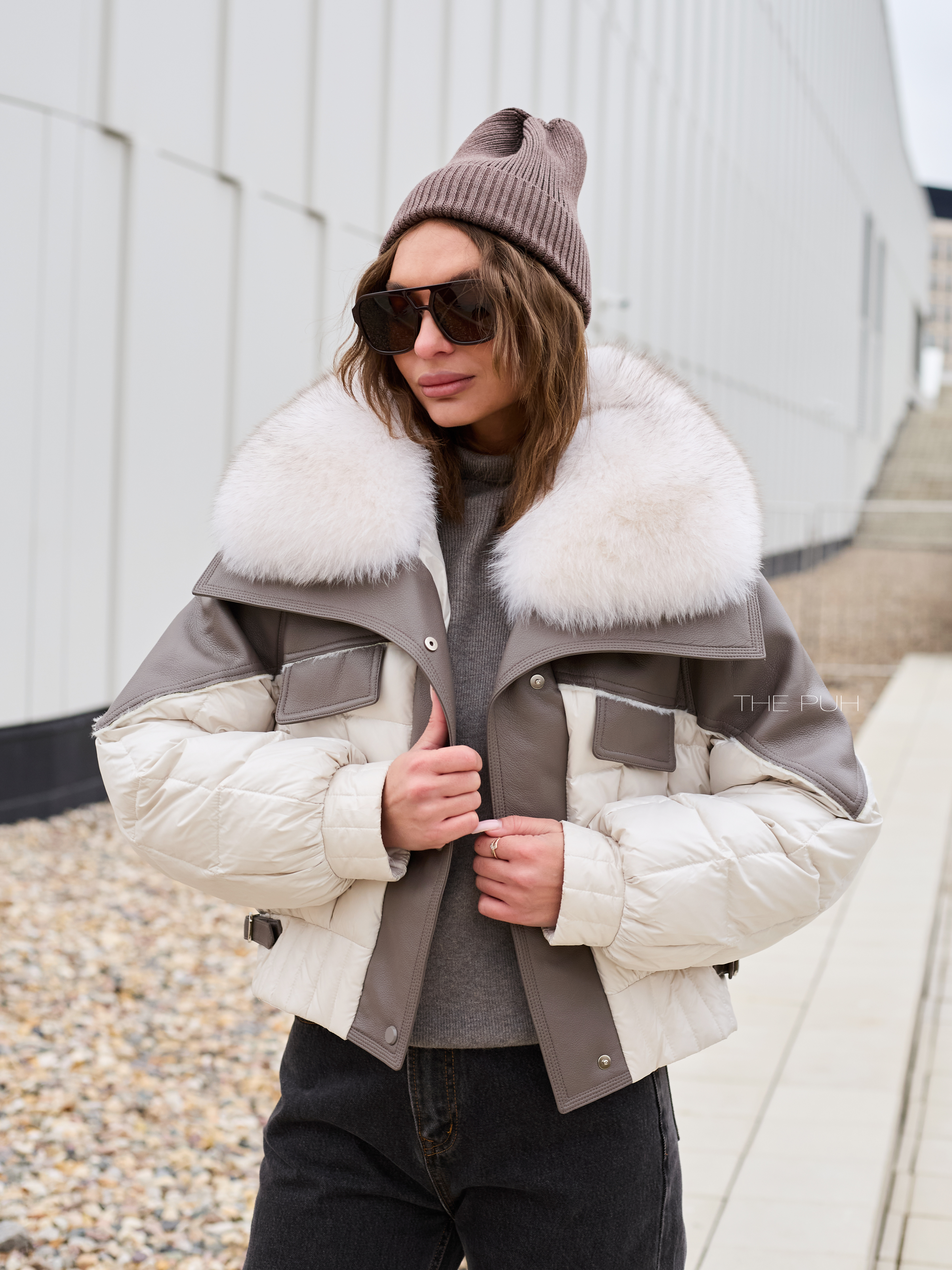 Укороченный пуховик выполнен из кофейной эко-кожи и нейлона молочного цвета и дополнен съемным воротником из меха песца. Модель утеплена натуральным гусиным пухом и пером, так что спокойно выдерживает сильные морозы.