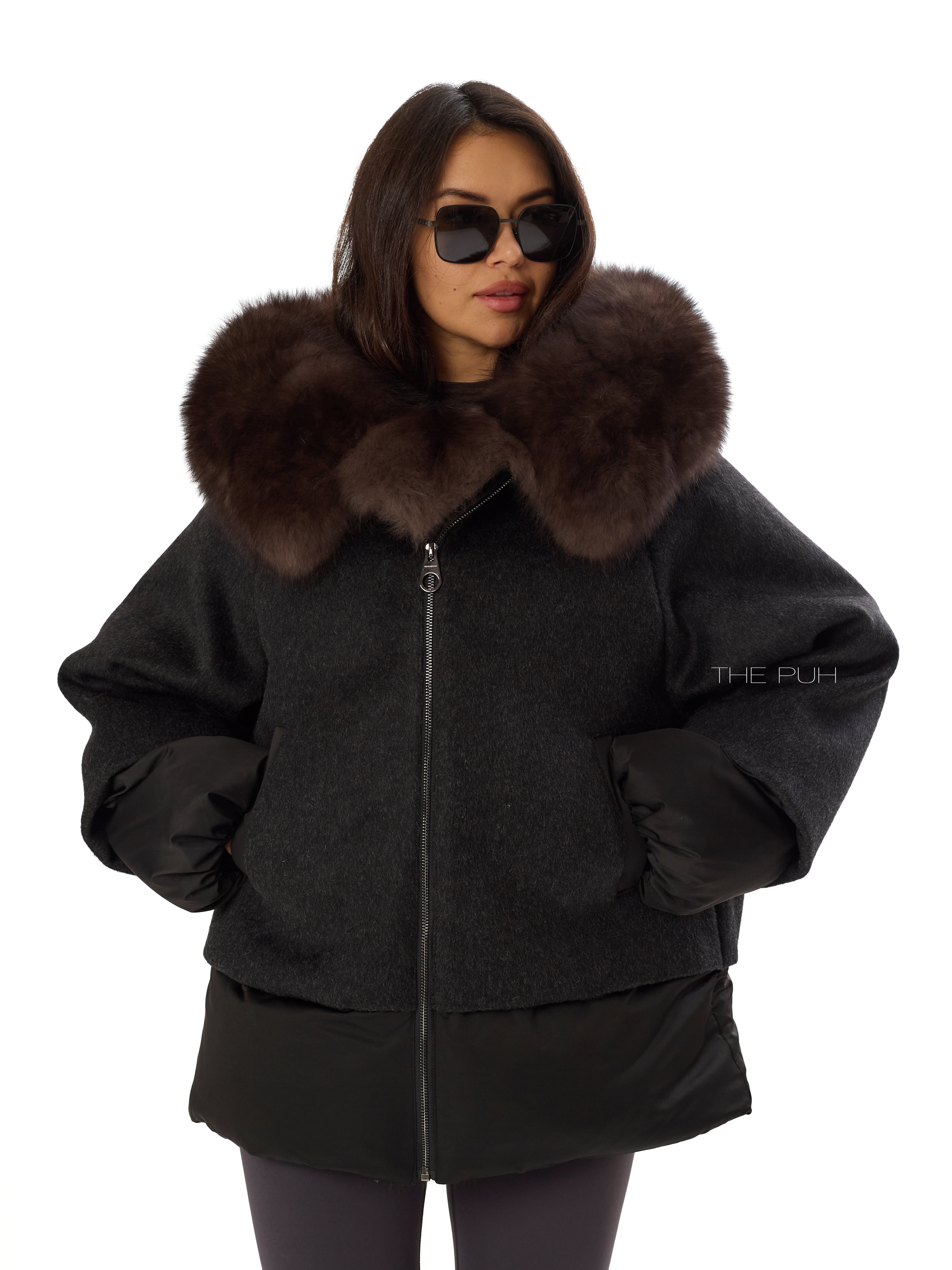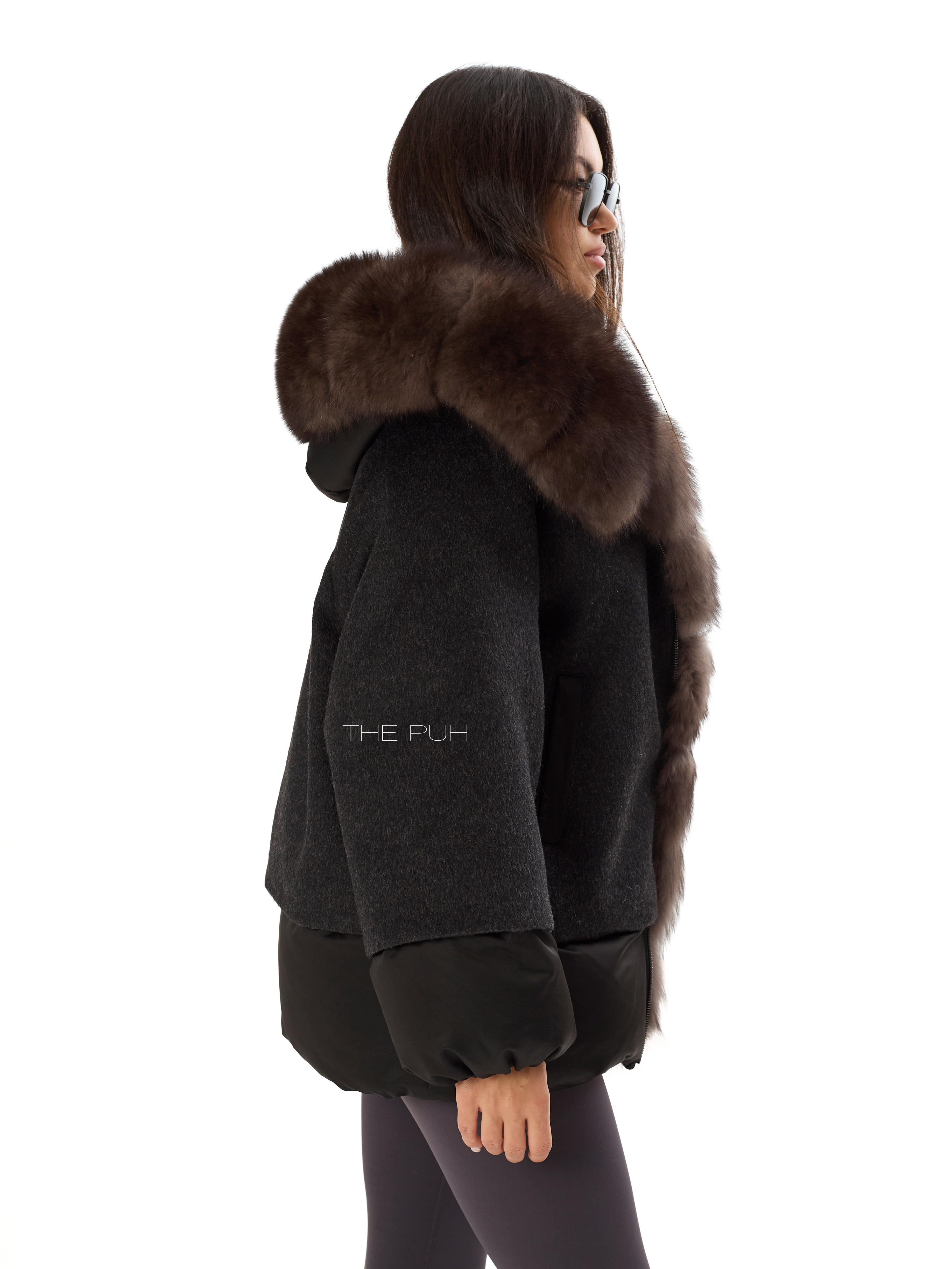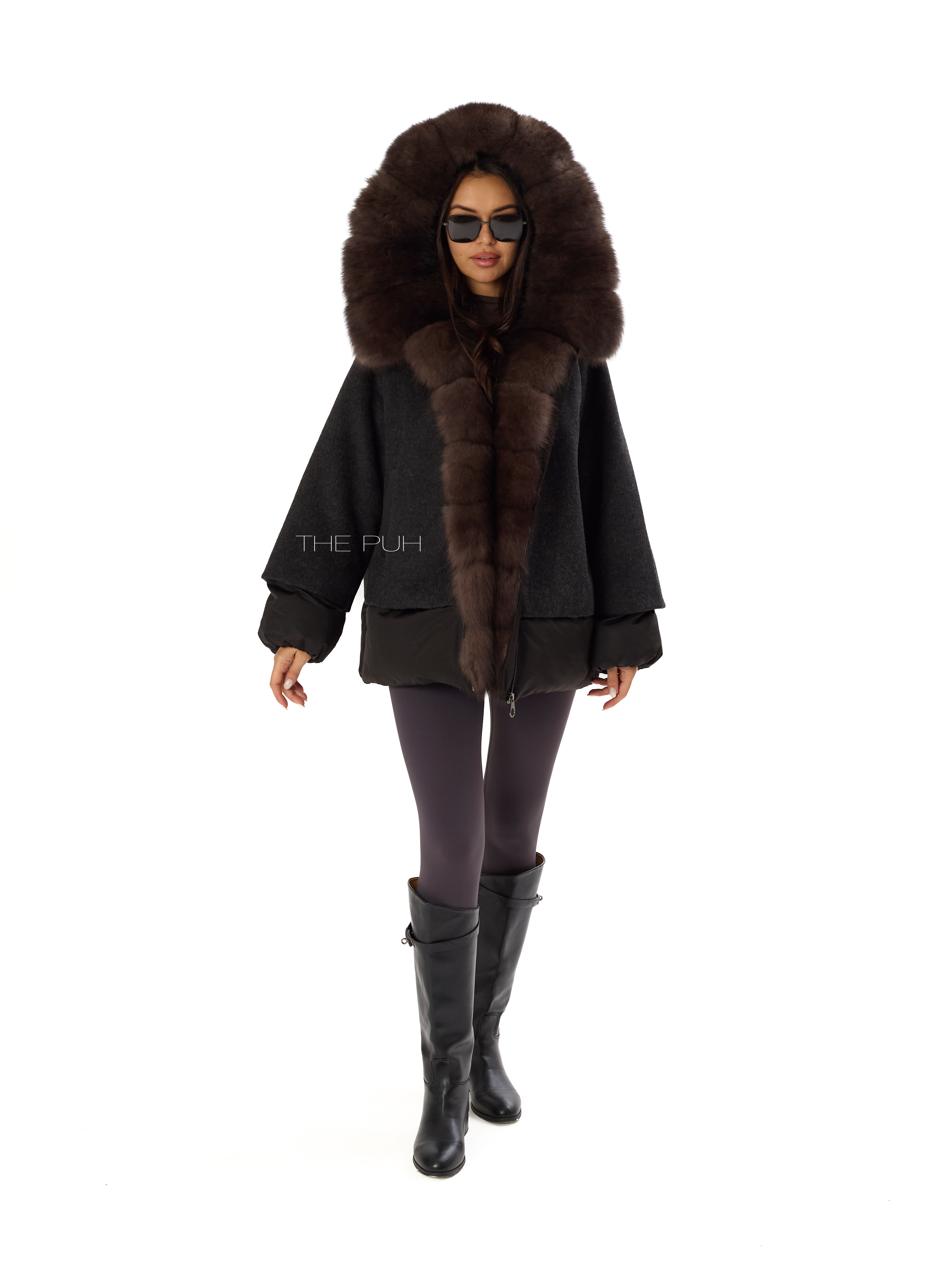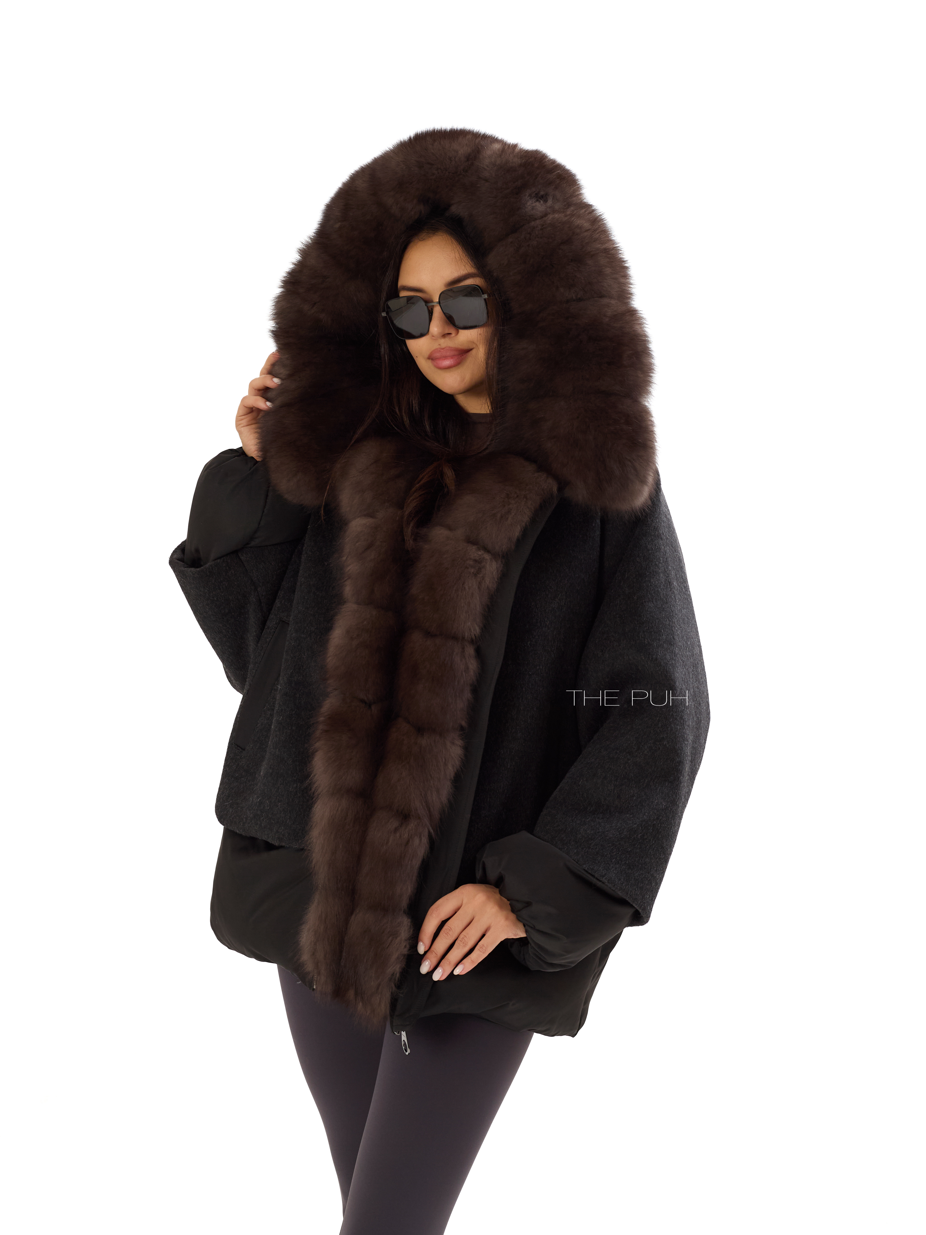Объемный черный пуховик выполнен из комбинированных материалов и дополнен съемной оторочкой из меха песца на полочках и капюшоне. Модель прямого свободного кроя с кулиской по низу.
