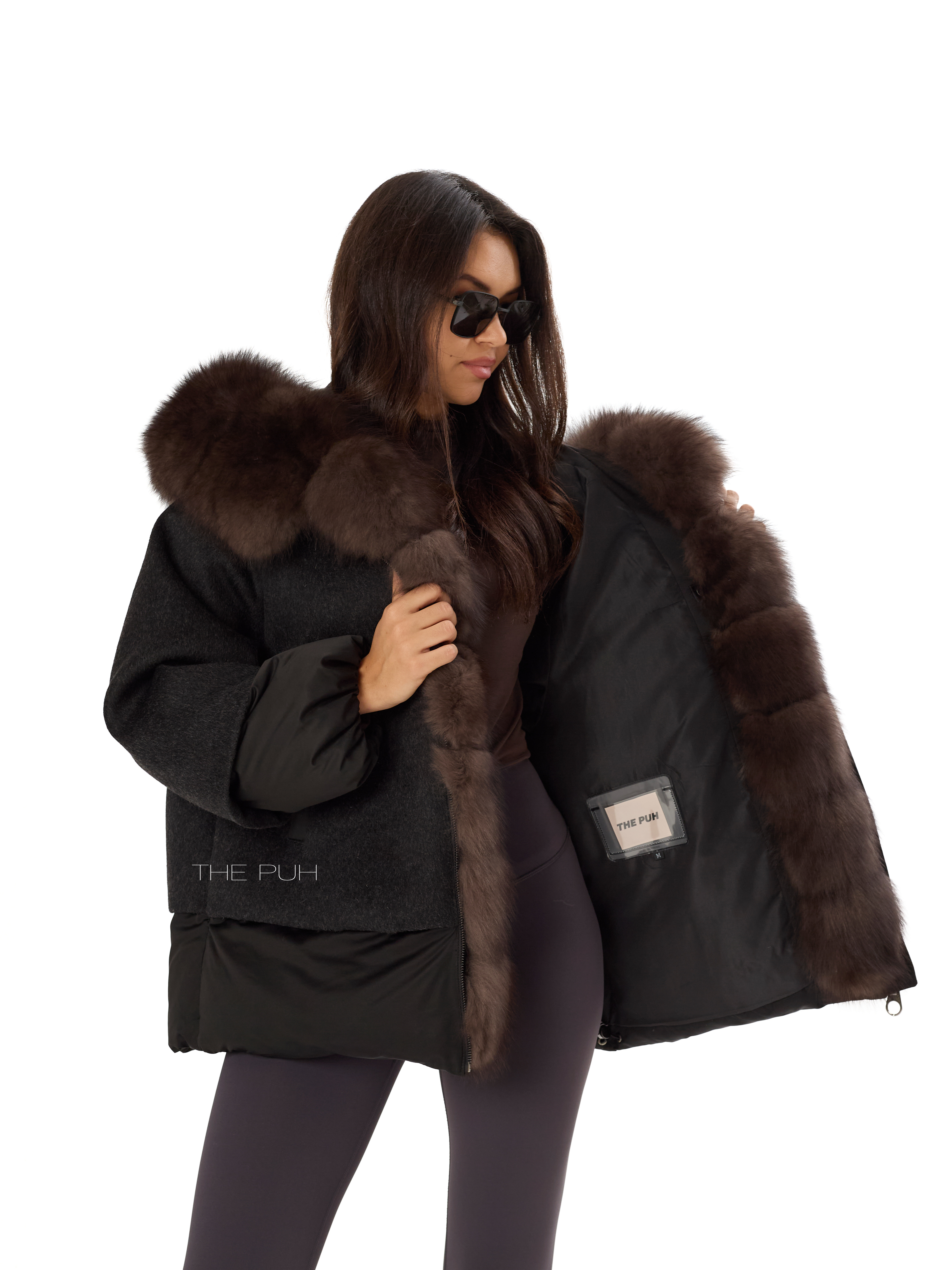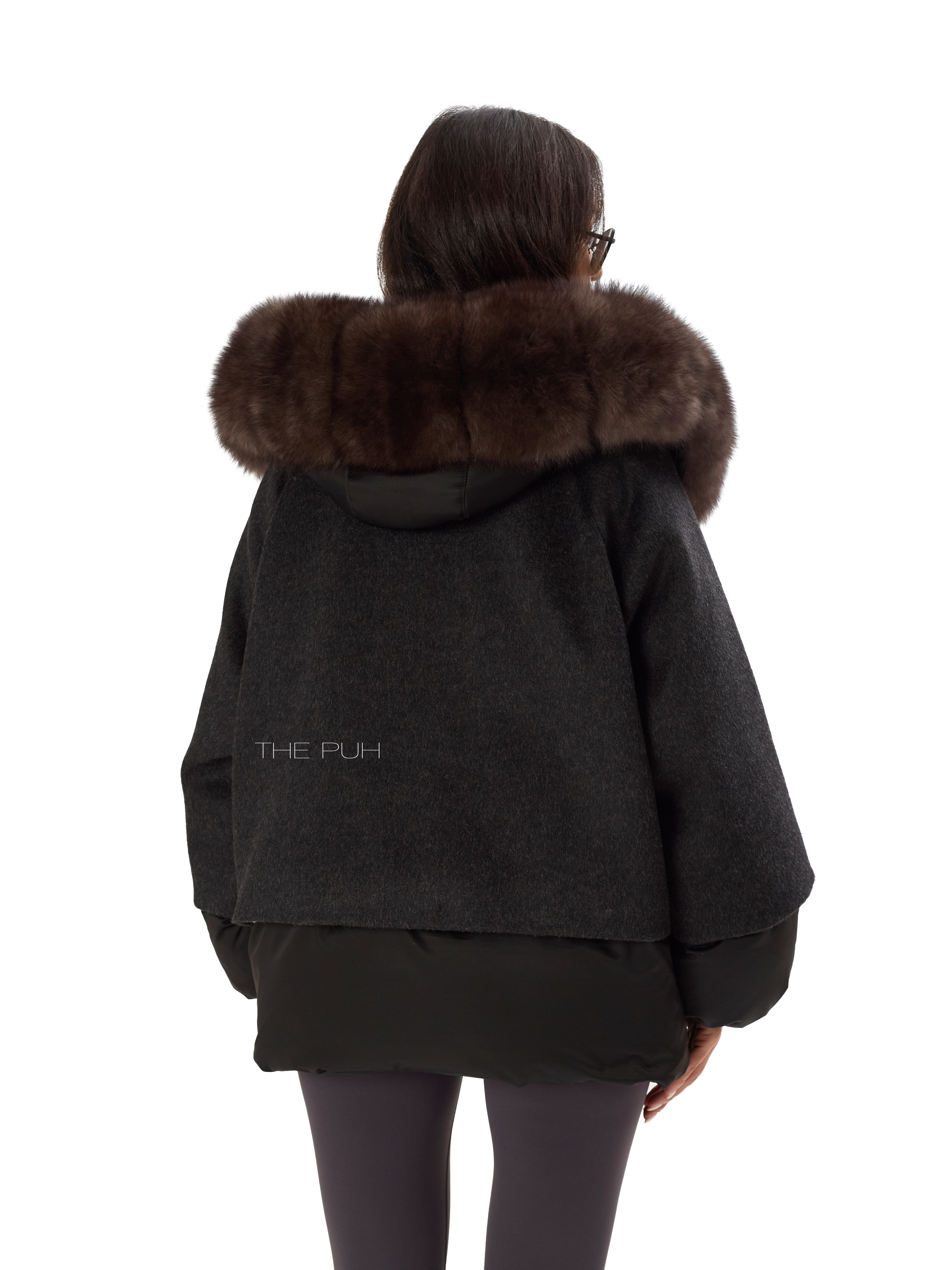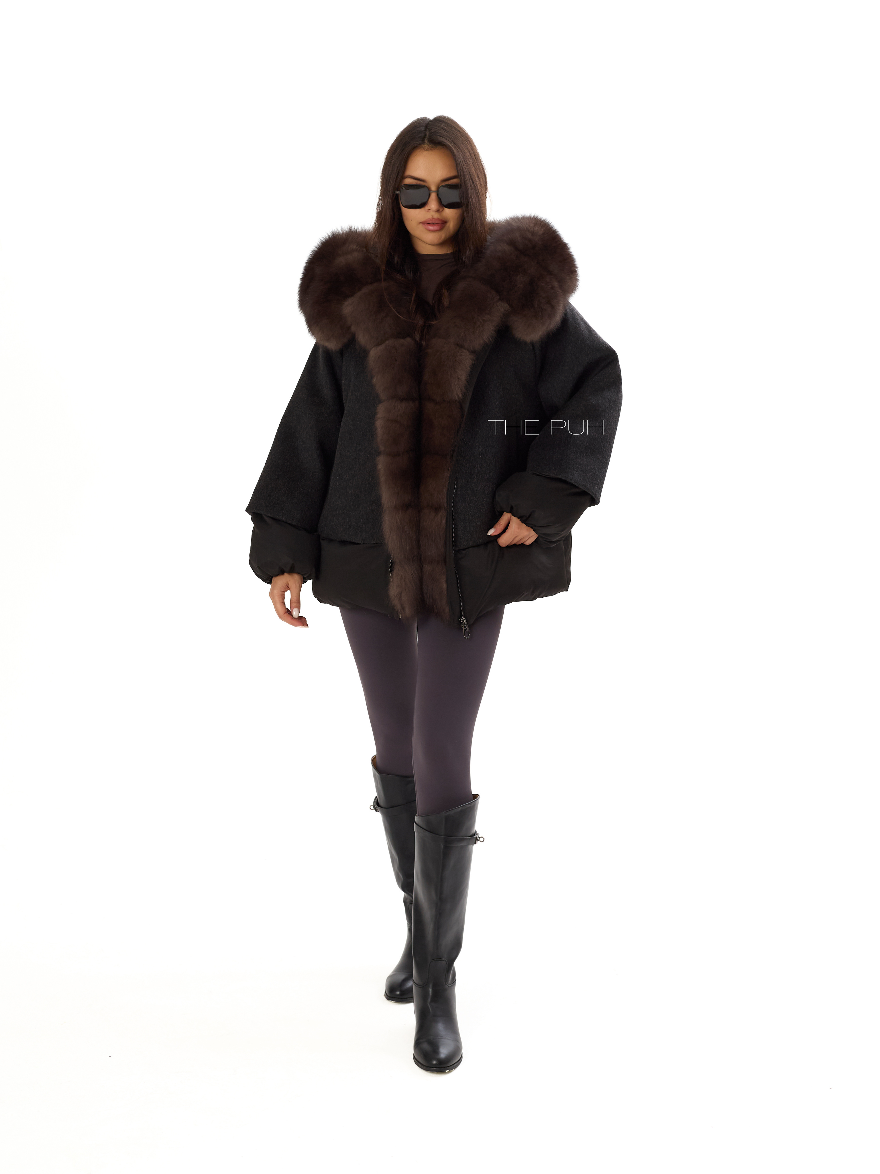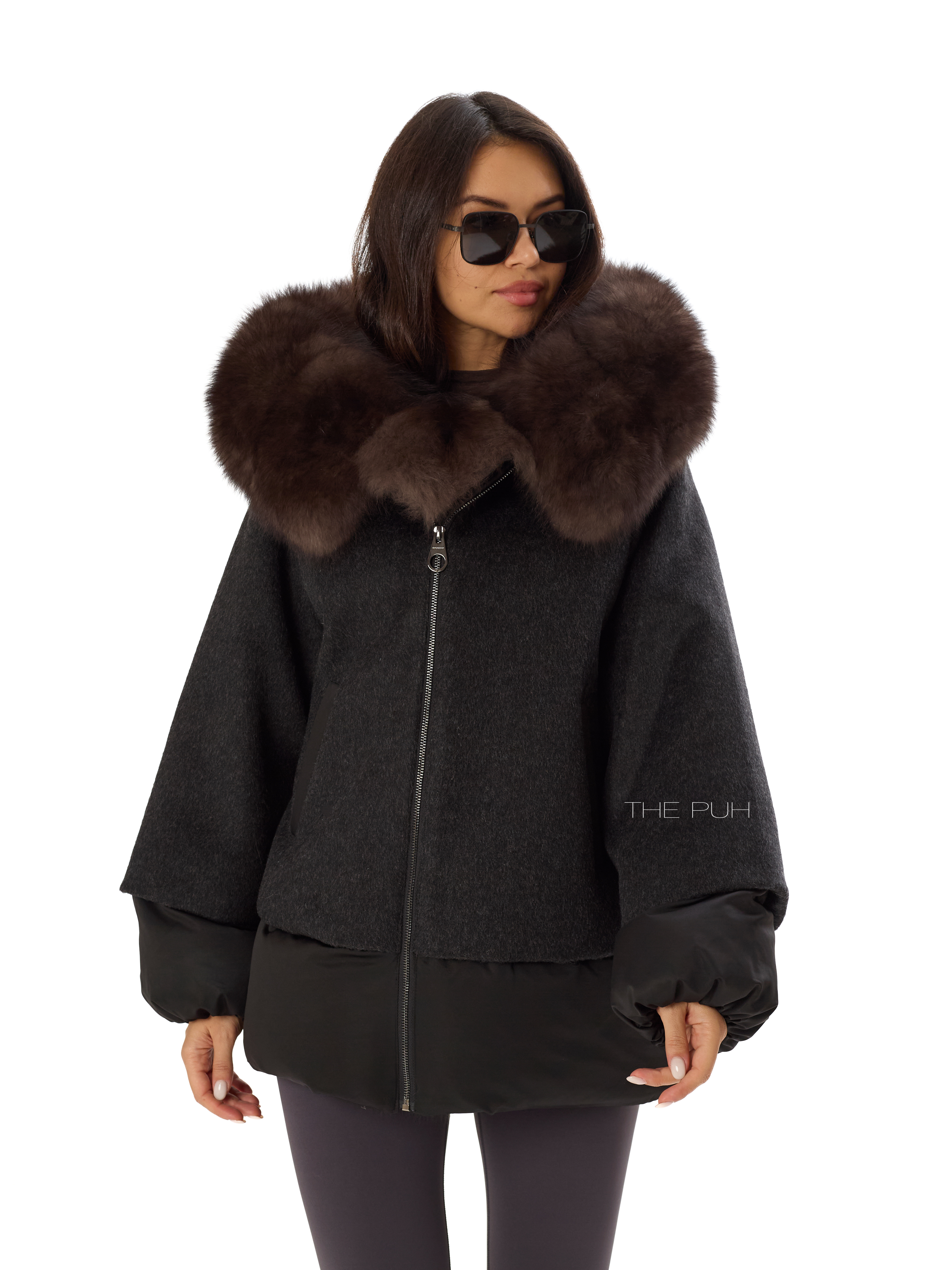 Объемный черный пуховик выполнен из комбинированных материалов и дополнен съемной оторочкой из меха песца на полочках и капюшоне. Модель прямого свободного кроя с кулиской по низу.