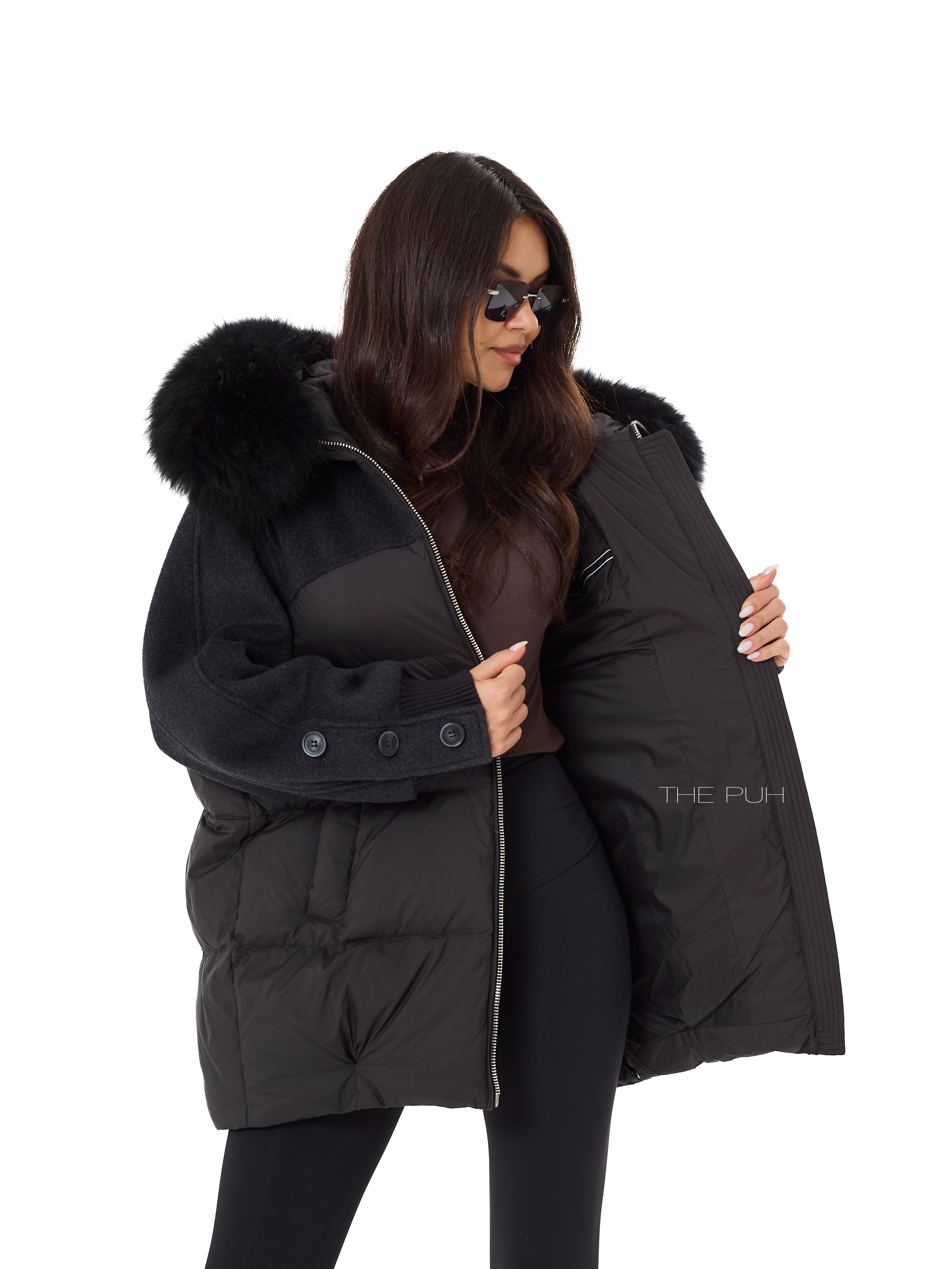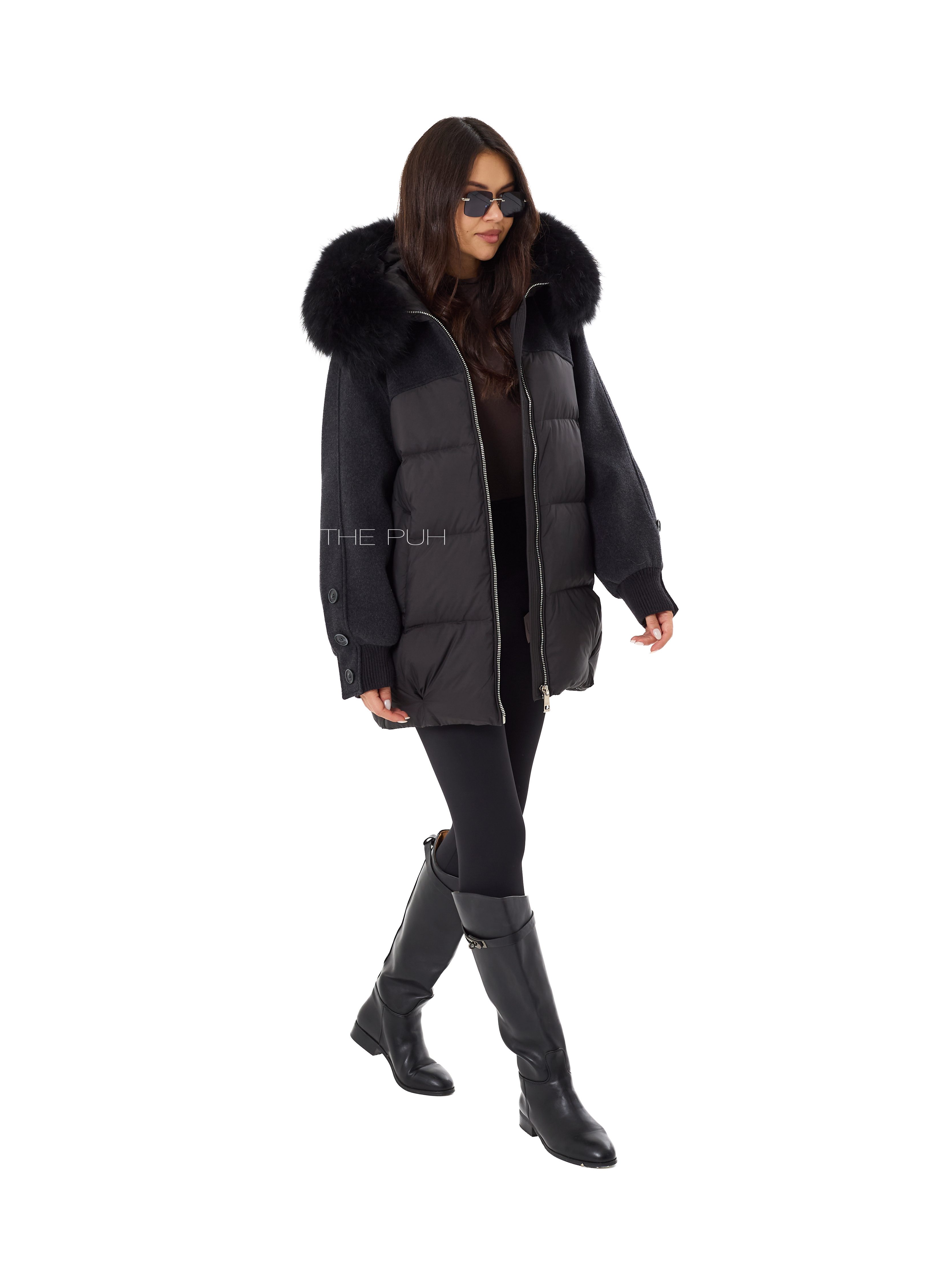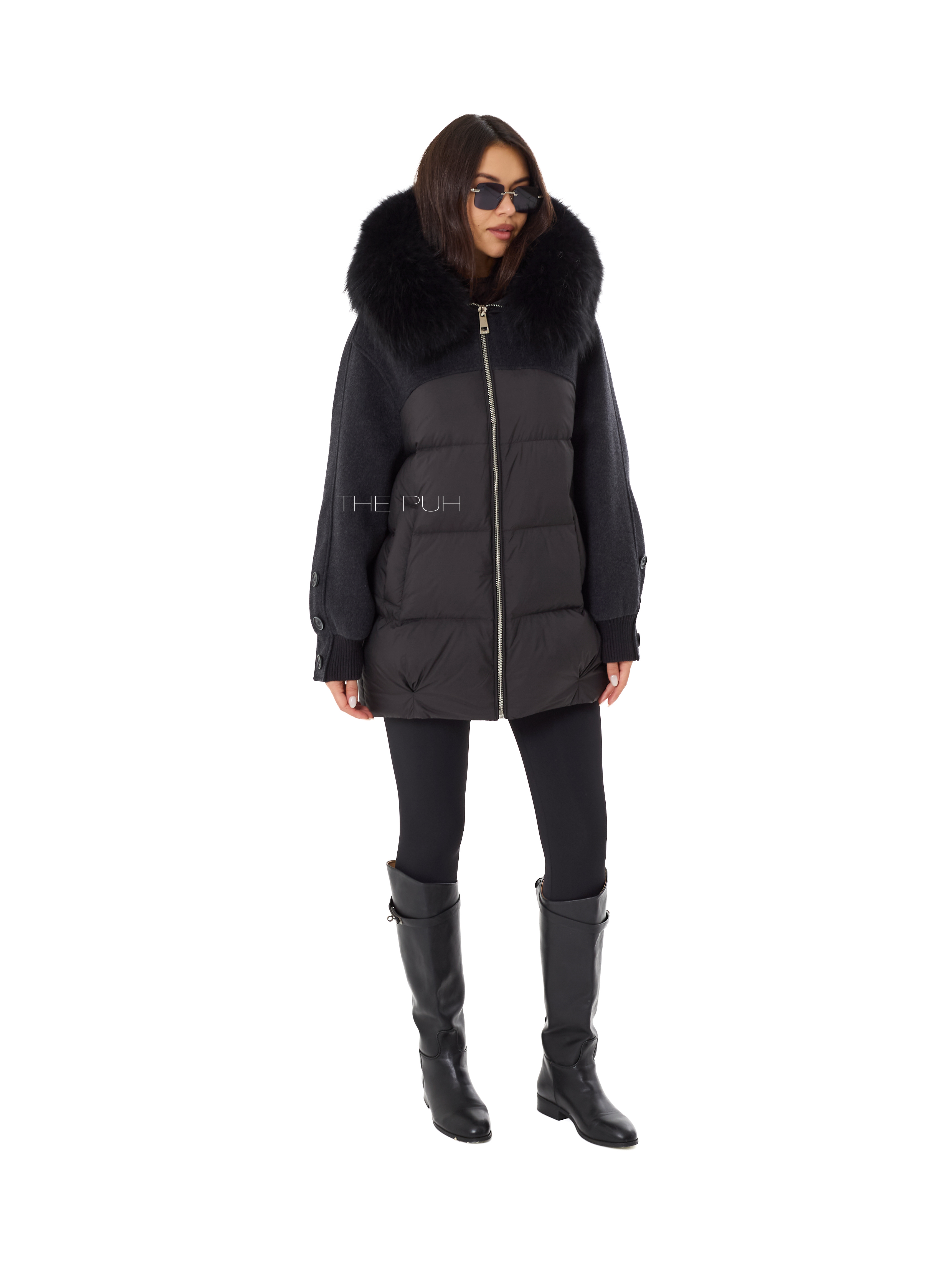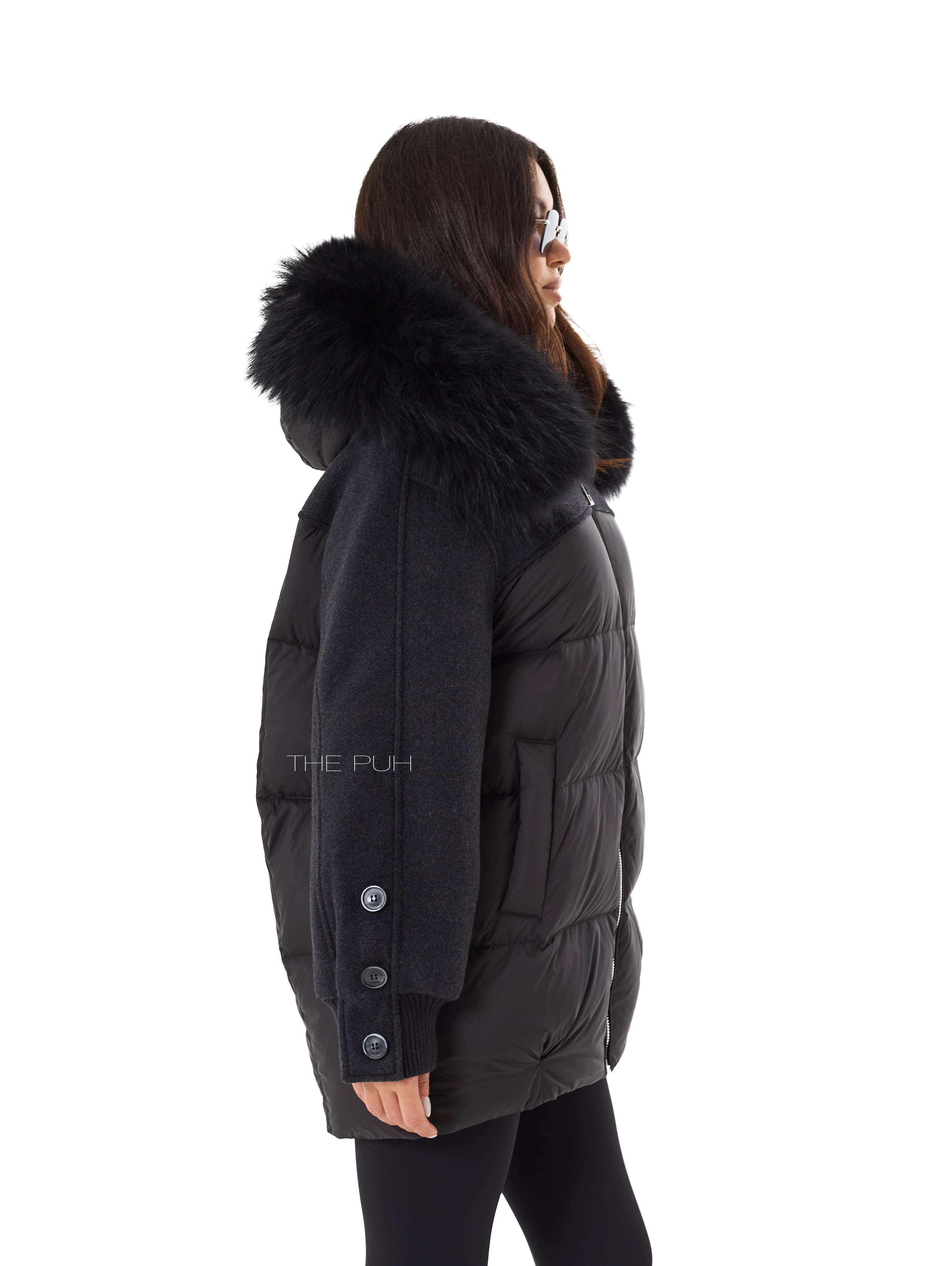 Удлиненный черный пуховик из комбинированных материалов. Модель на молнии дополнена пуговицами на рукавах и оторочкой из меха енота на капюшоне.