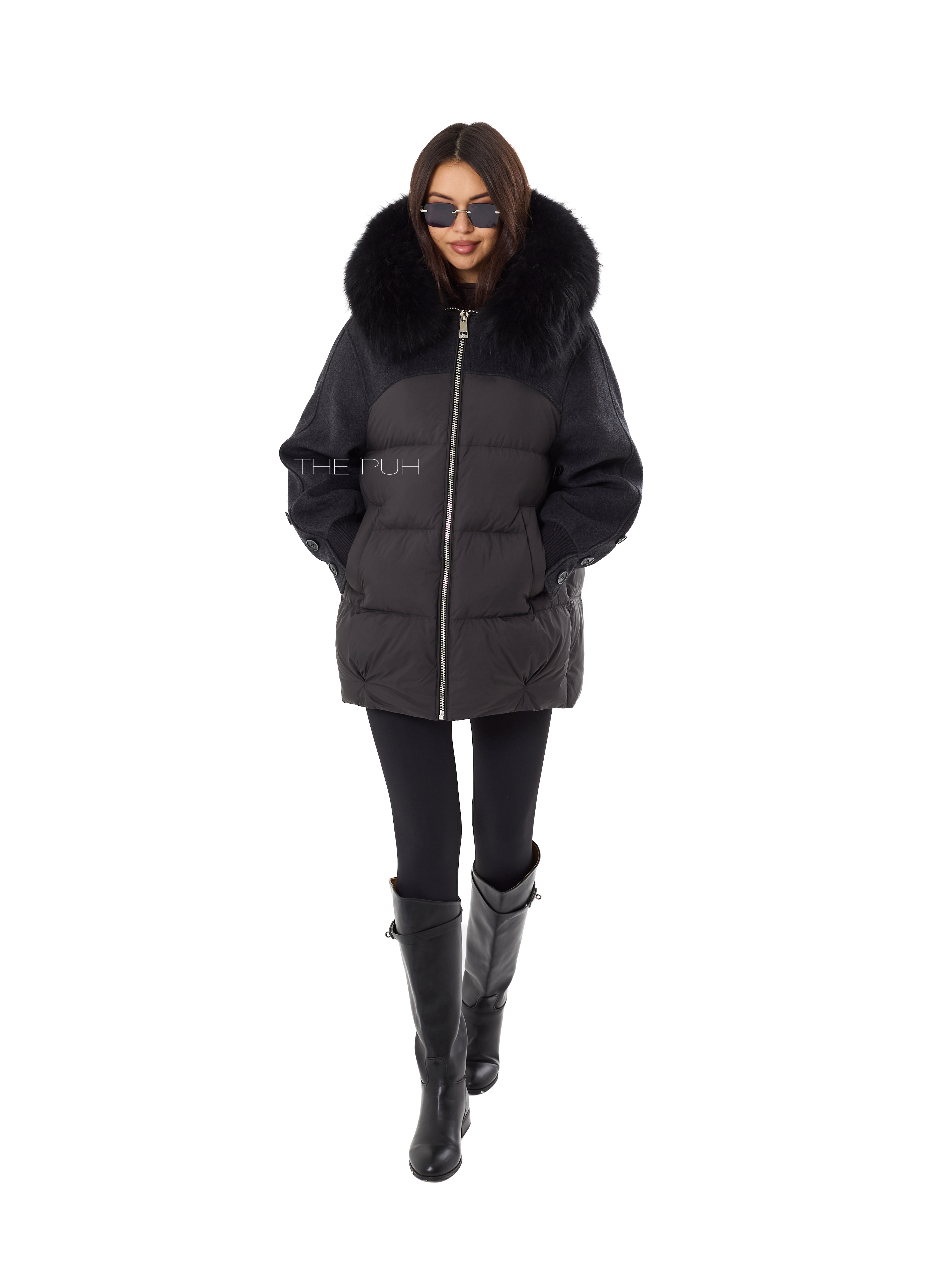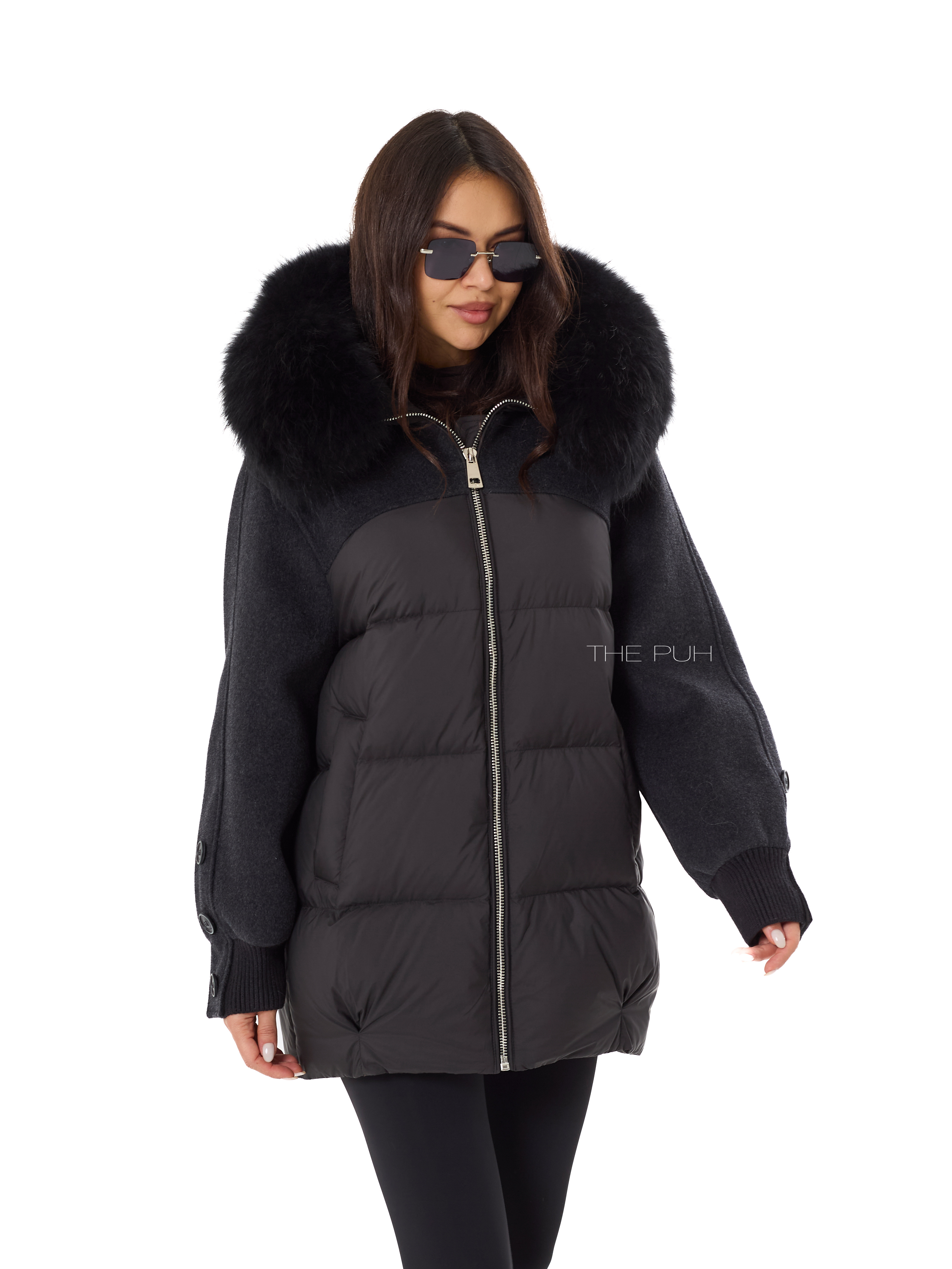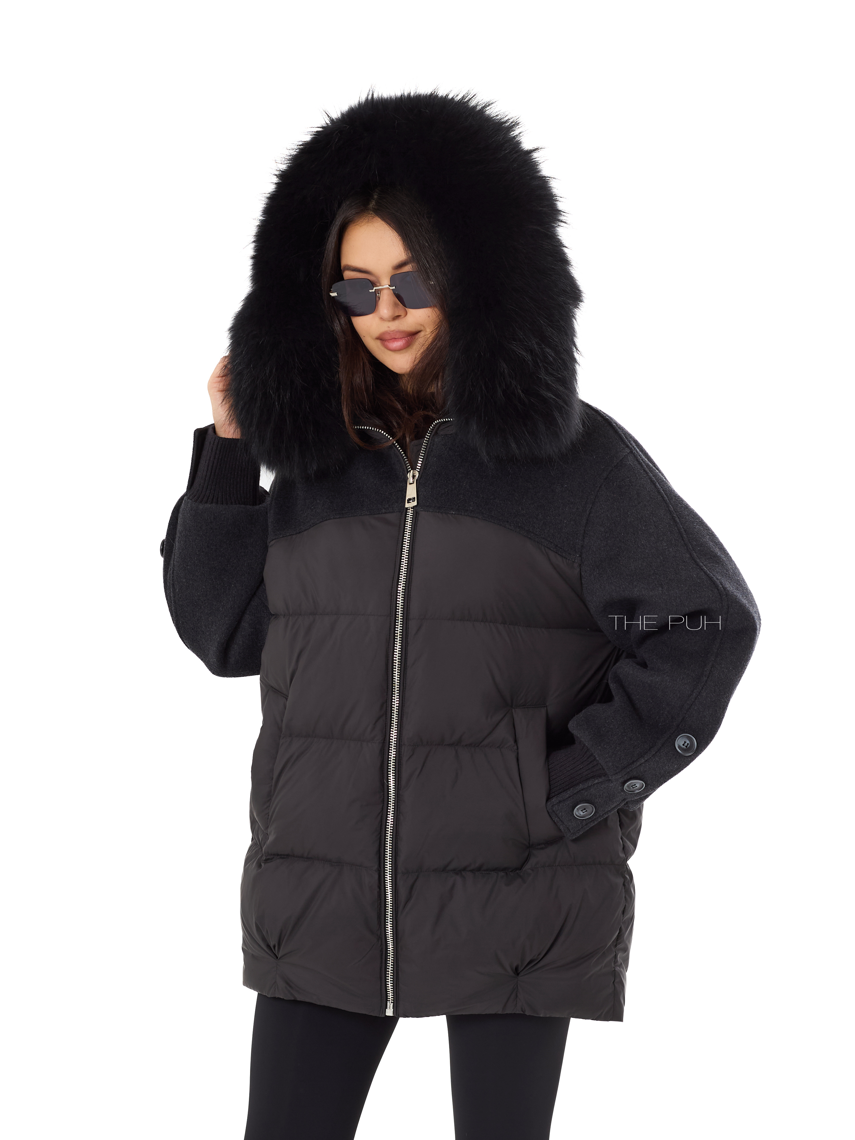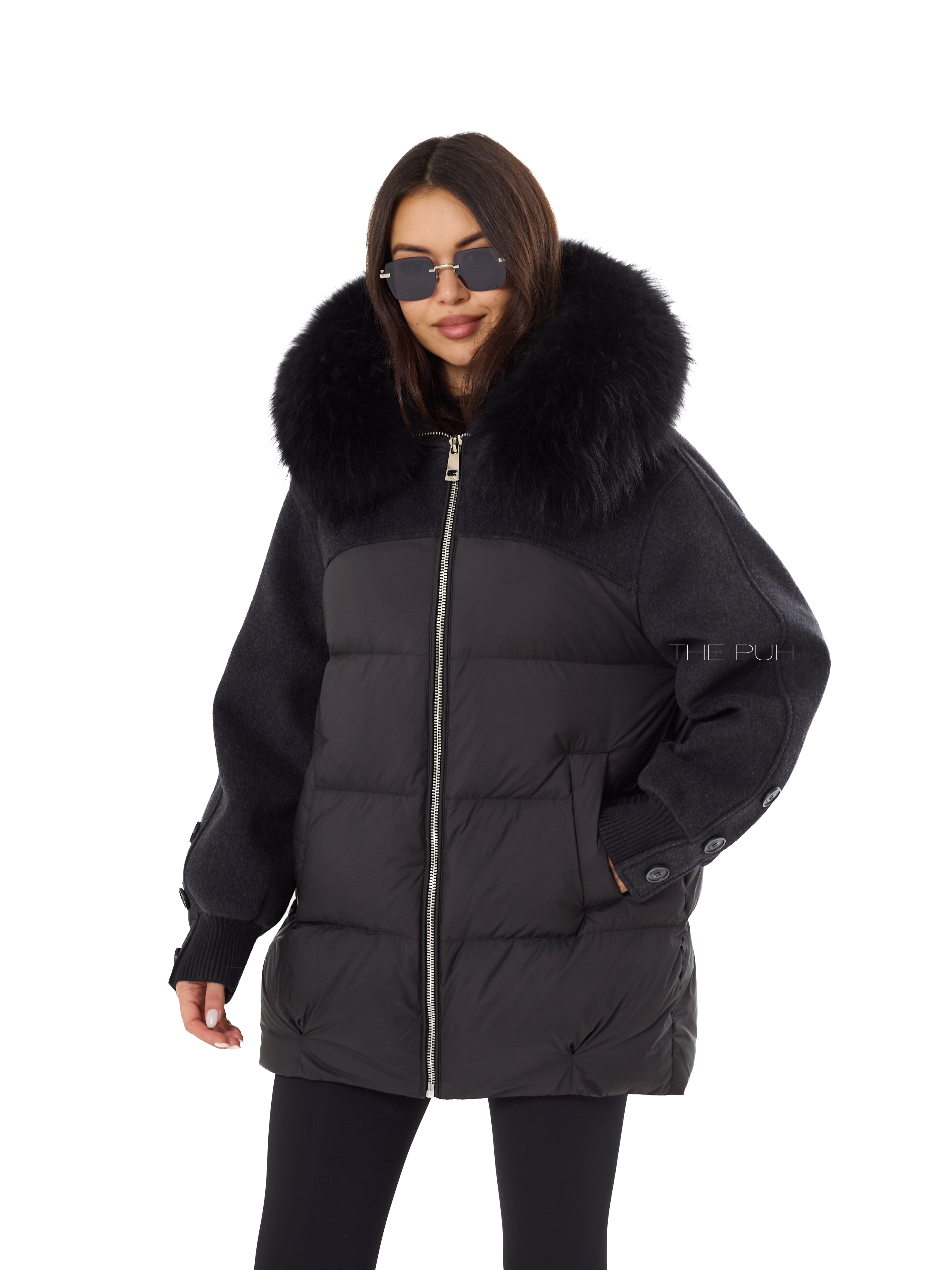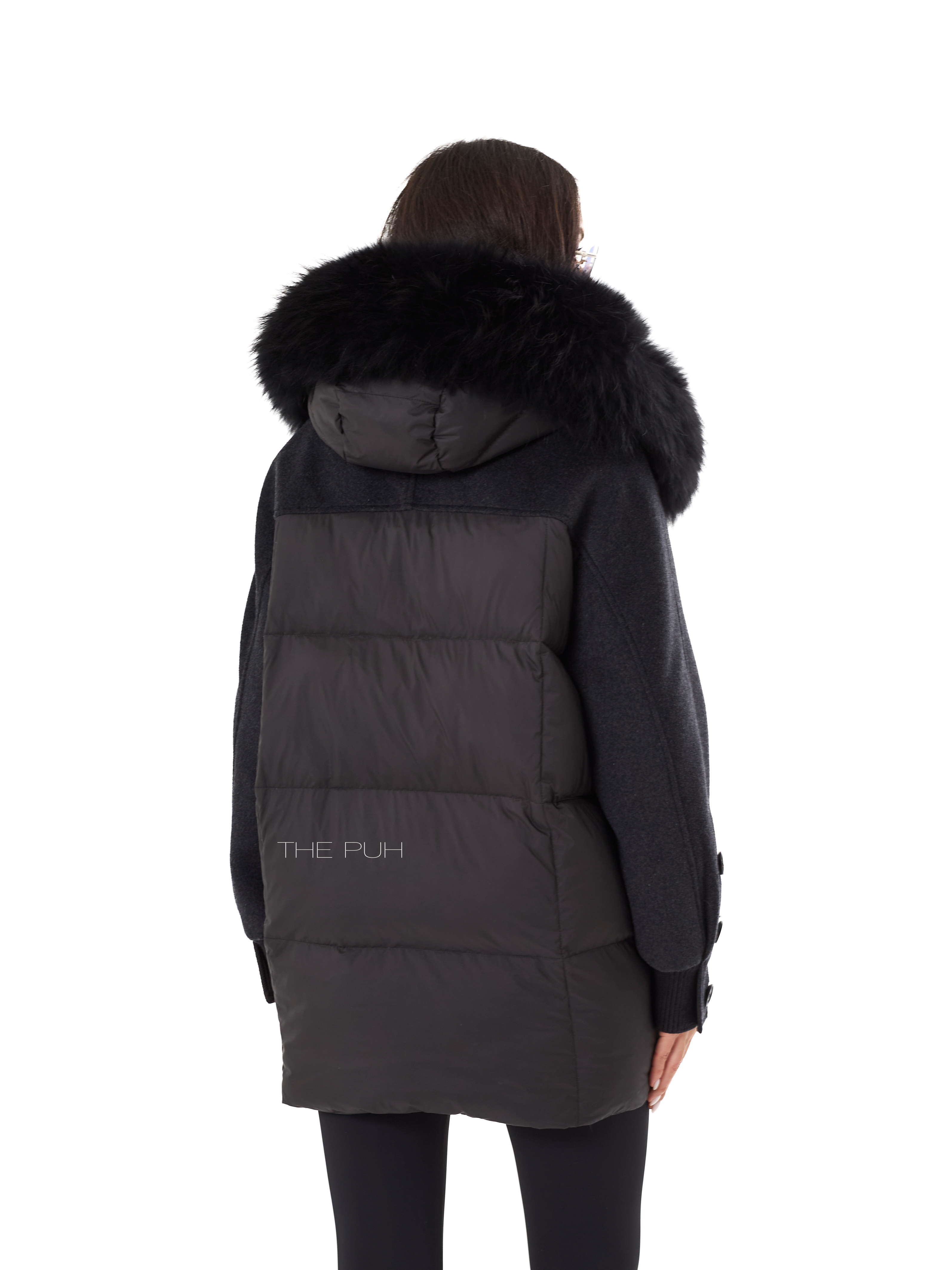 Удлиненный черный пуховик из комбинированных материалов. Модель на молнии дополнена пуговицами на рукавах и оторочкой из меха енота на капюшоне.