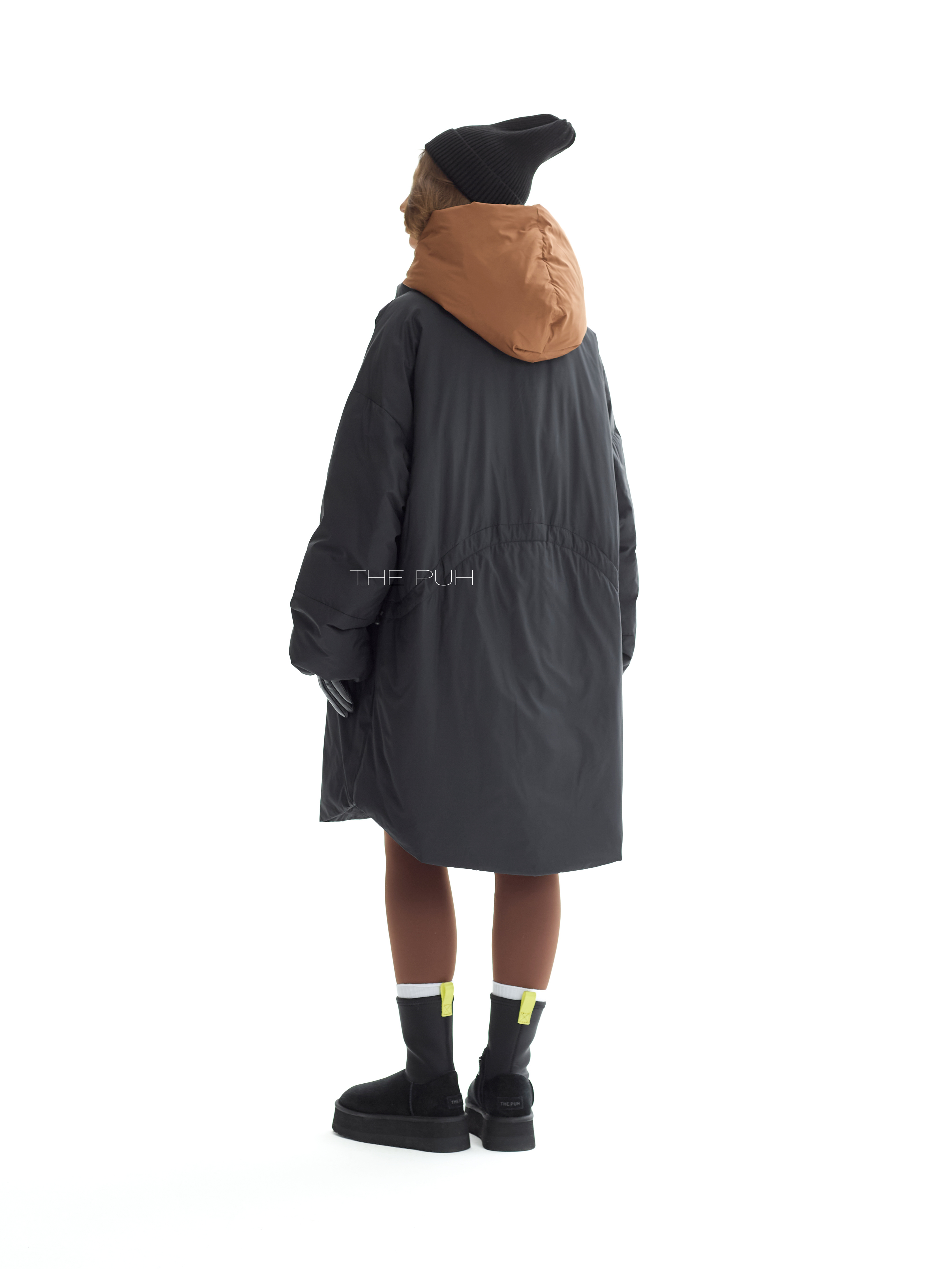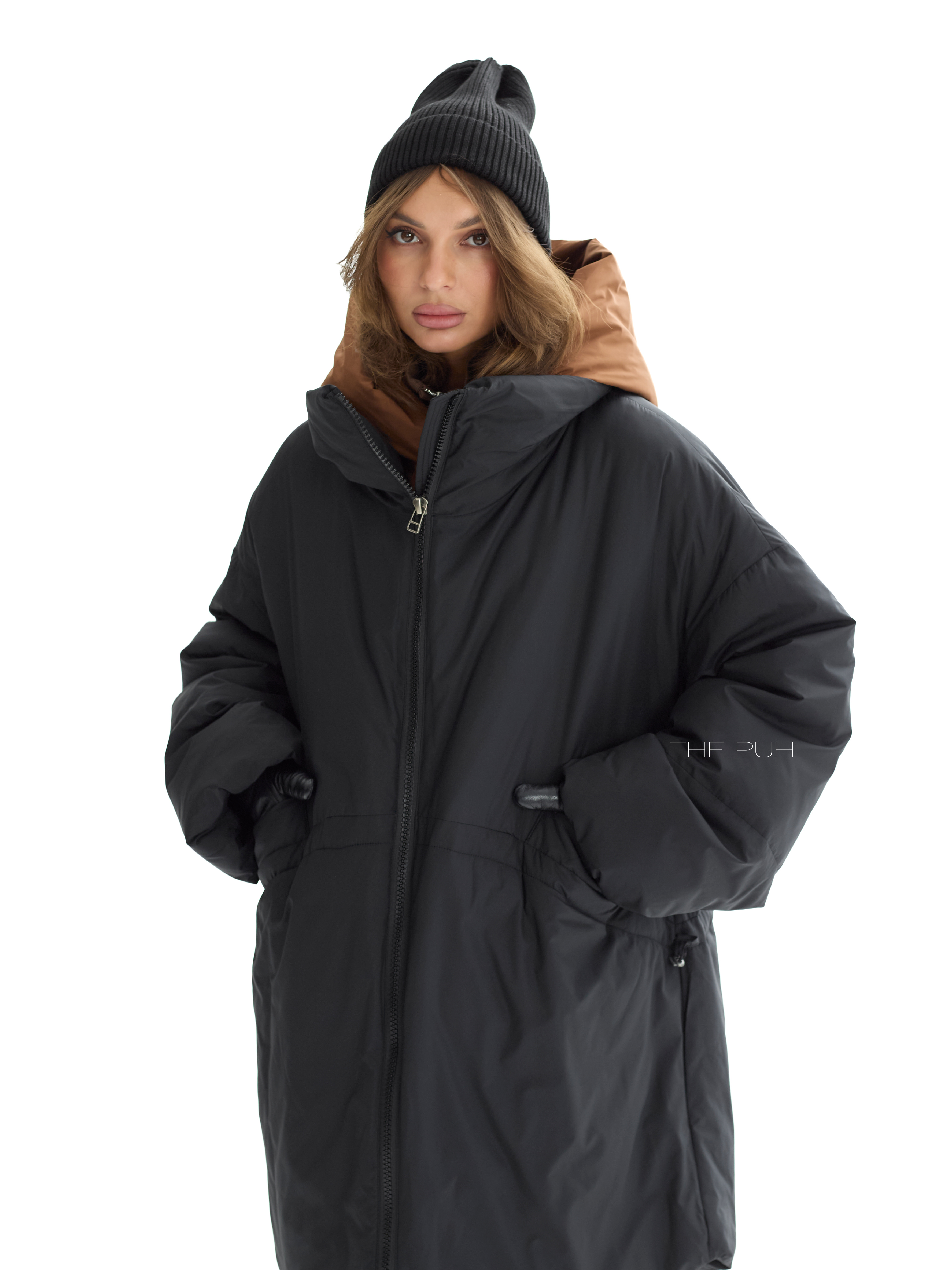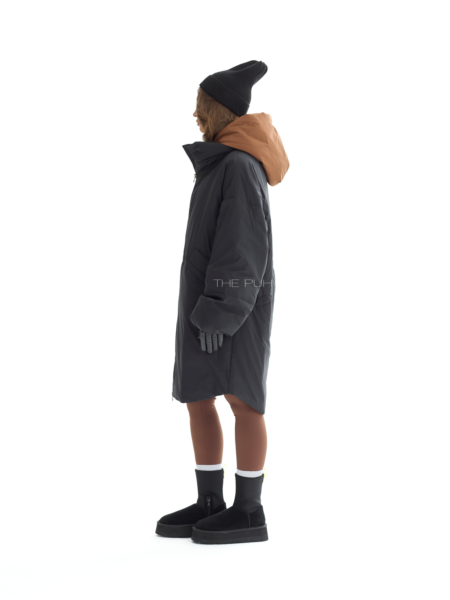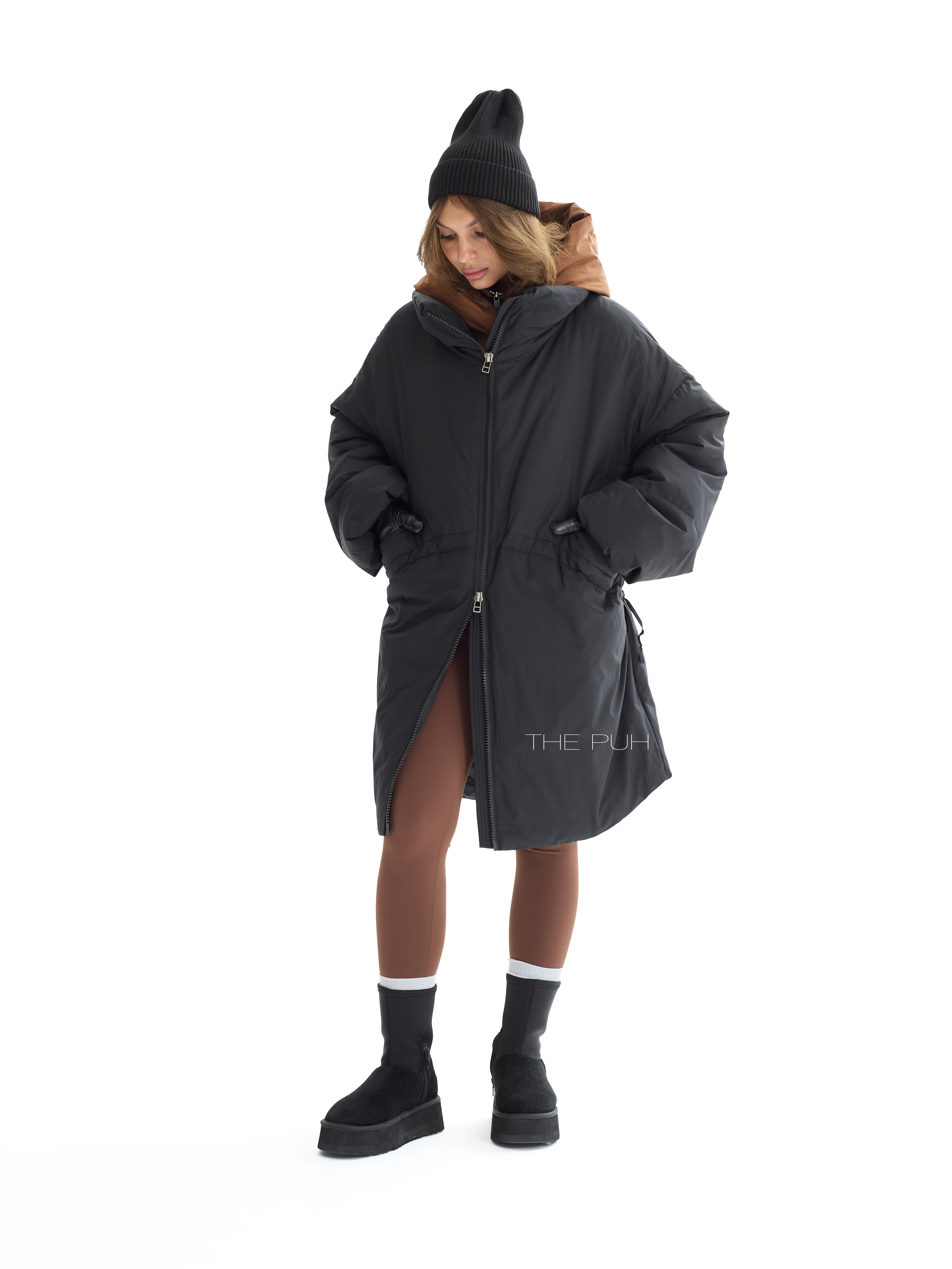 Прямая модель с застежкой на молнии, внутри вшитая манишка коричневого цвета с капюшоном и застежкой на магнитах, прямые рукава с кулиской на манжетах, два боковых кармана в разрезе, регулируемый пояс на затяжках с боковыми фиксаторами.