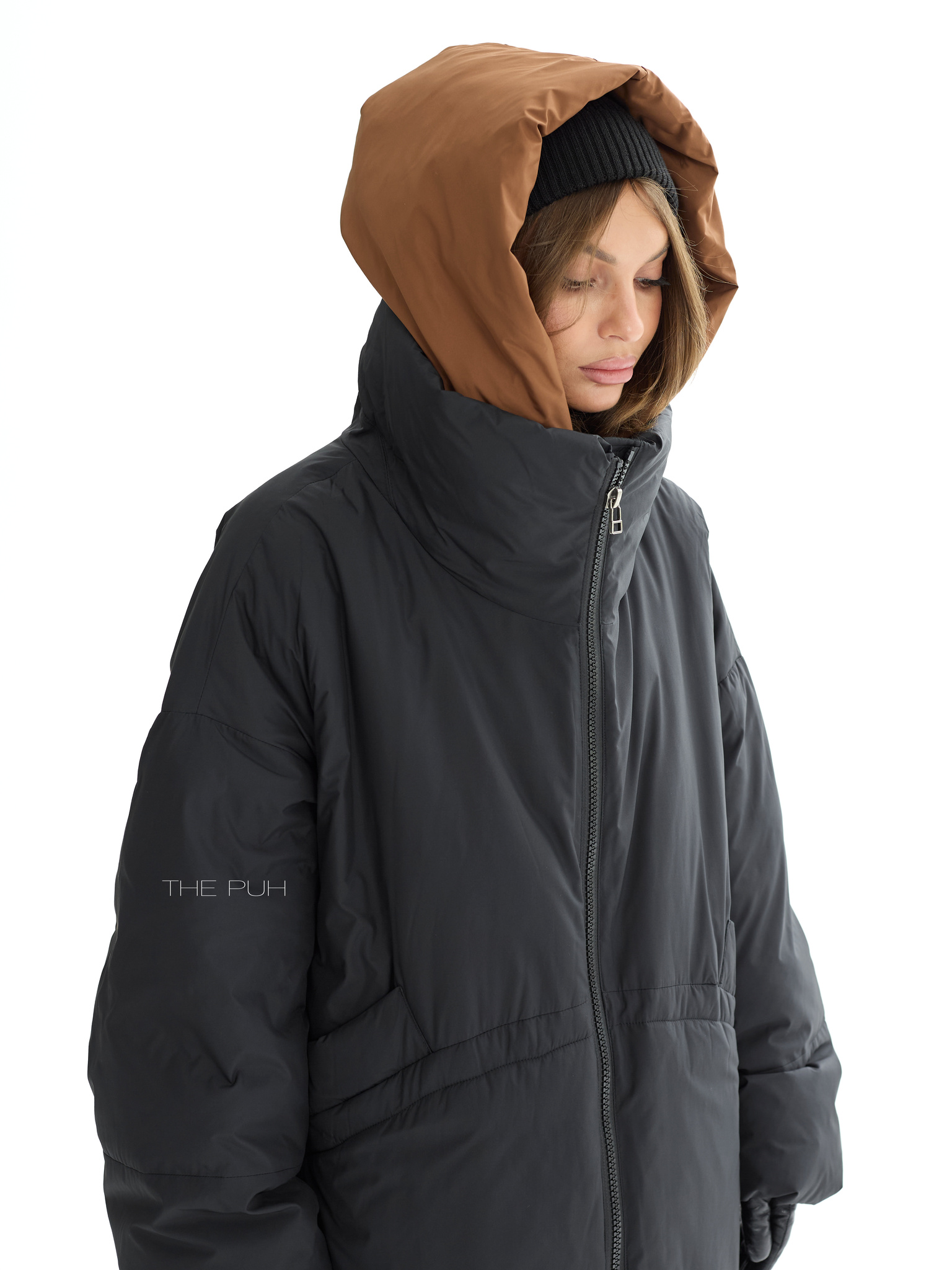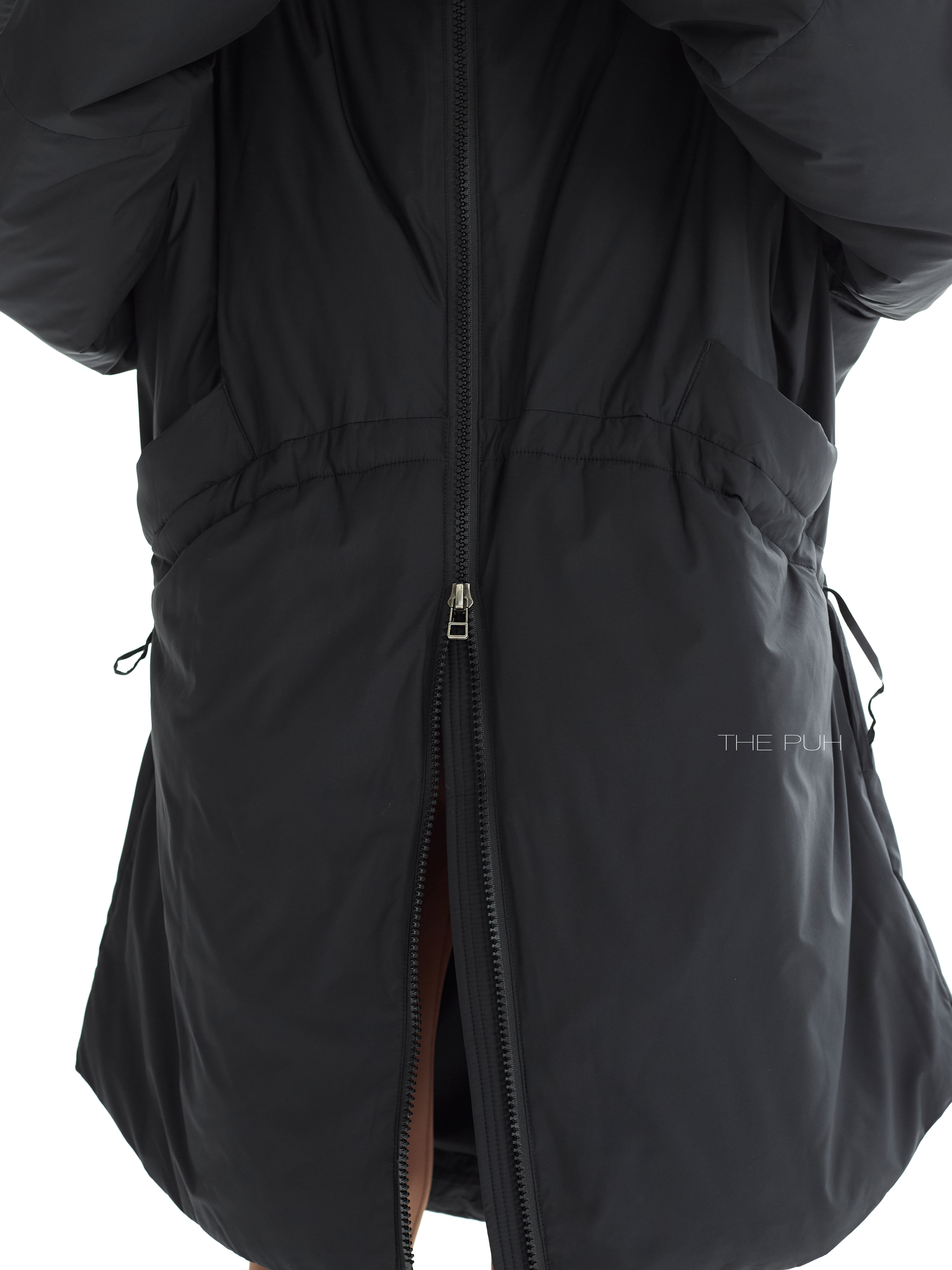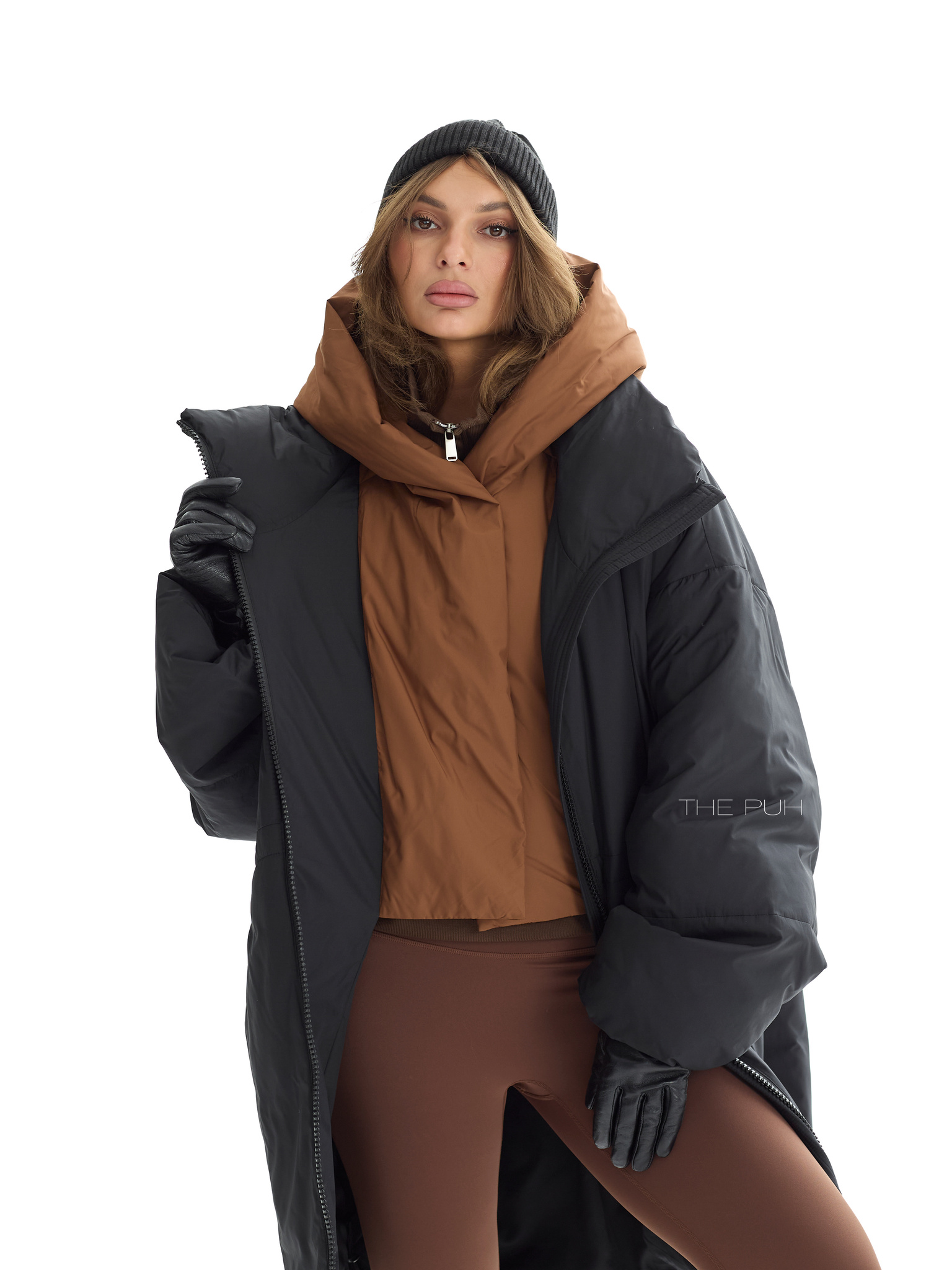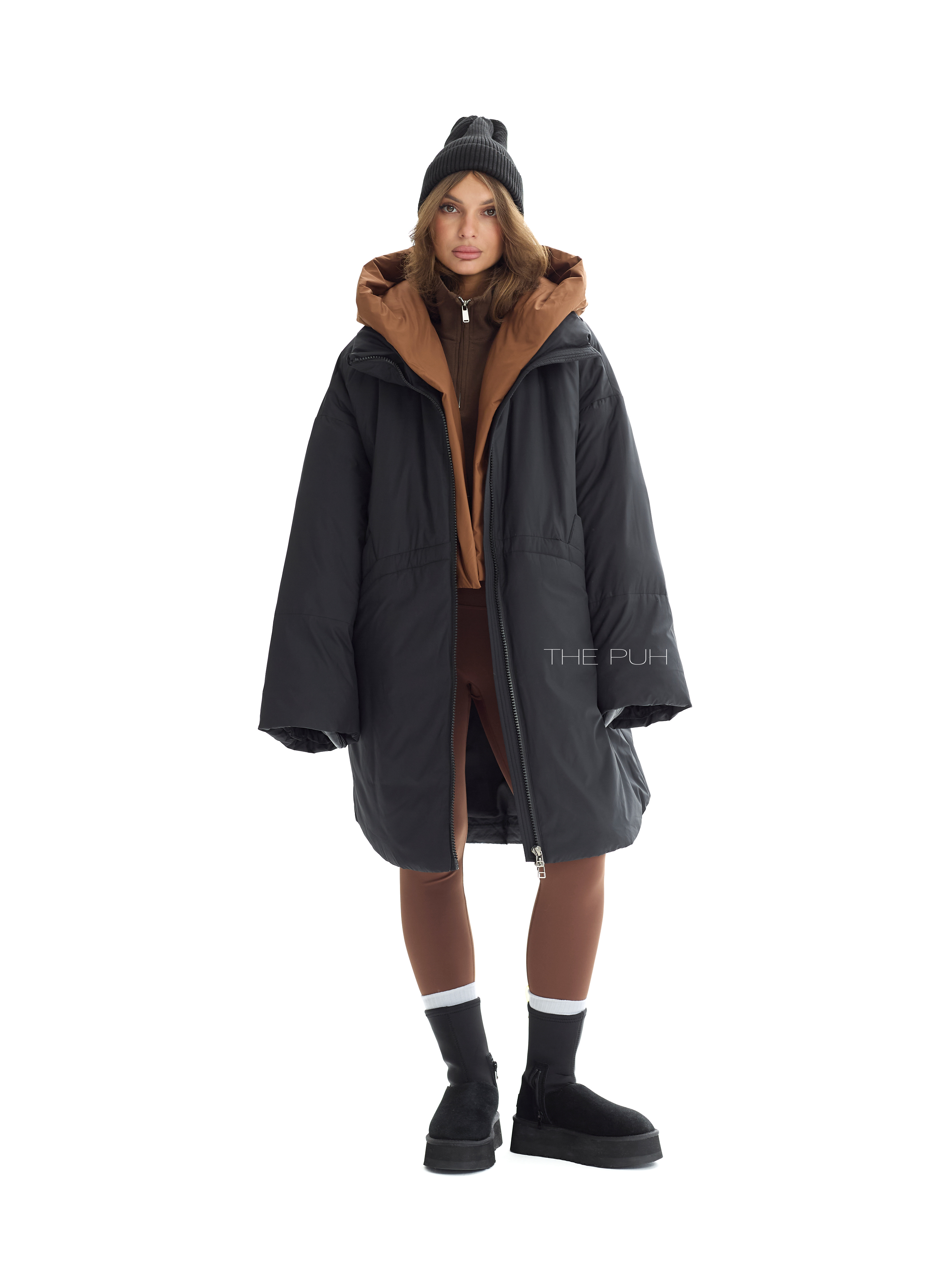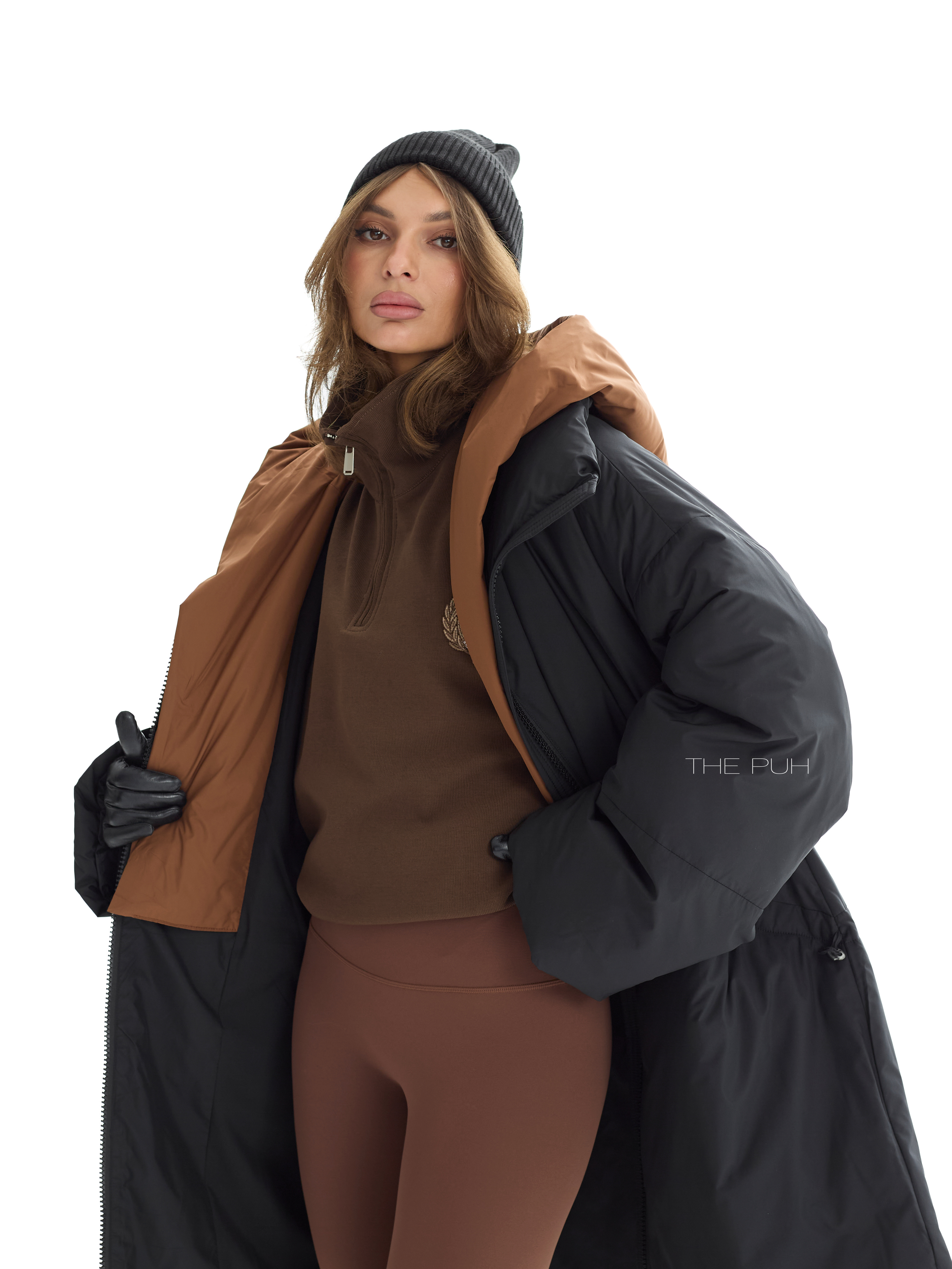 Прямая модель с застежкой на молнии, внутри вшитая манишка коричневого цвета с капюшоном и застежкой на магнитах, прямые рукава с кулиской на манжетах, два боковых кармана в разрезе, регулируемый пояс на затяжках с боковыми фиксаторами.
