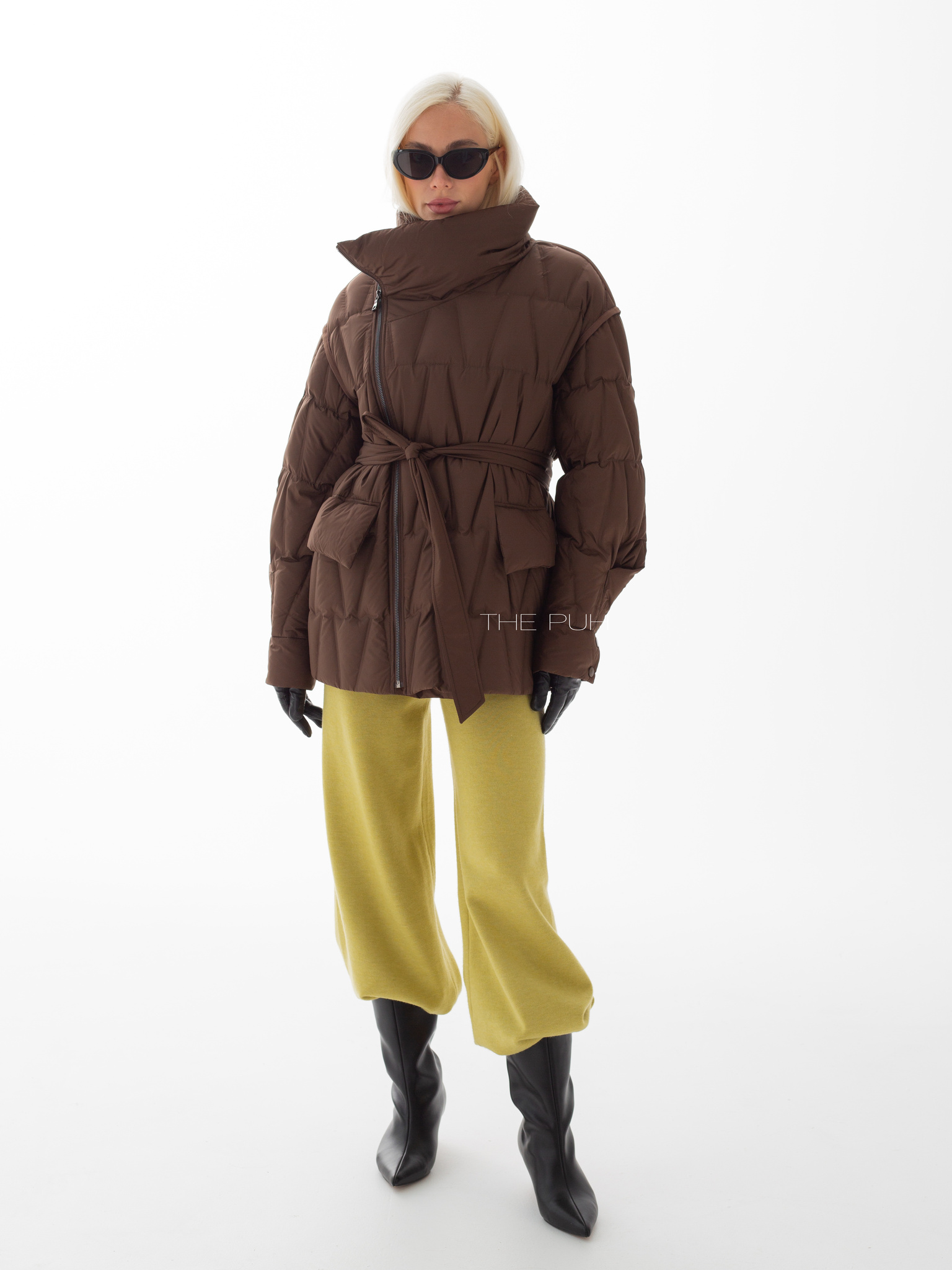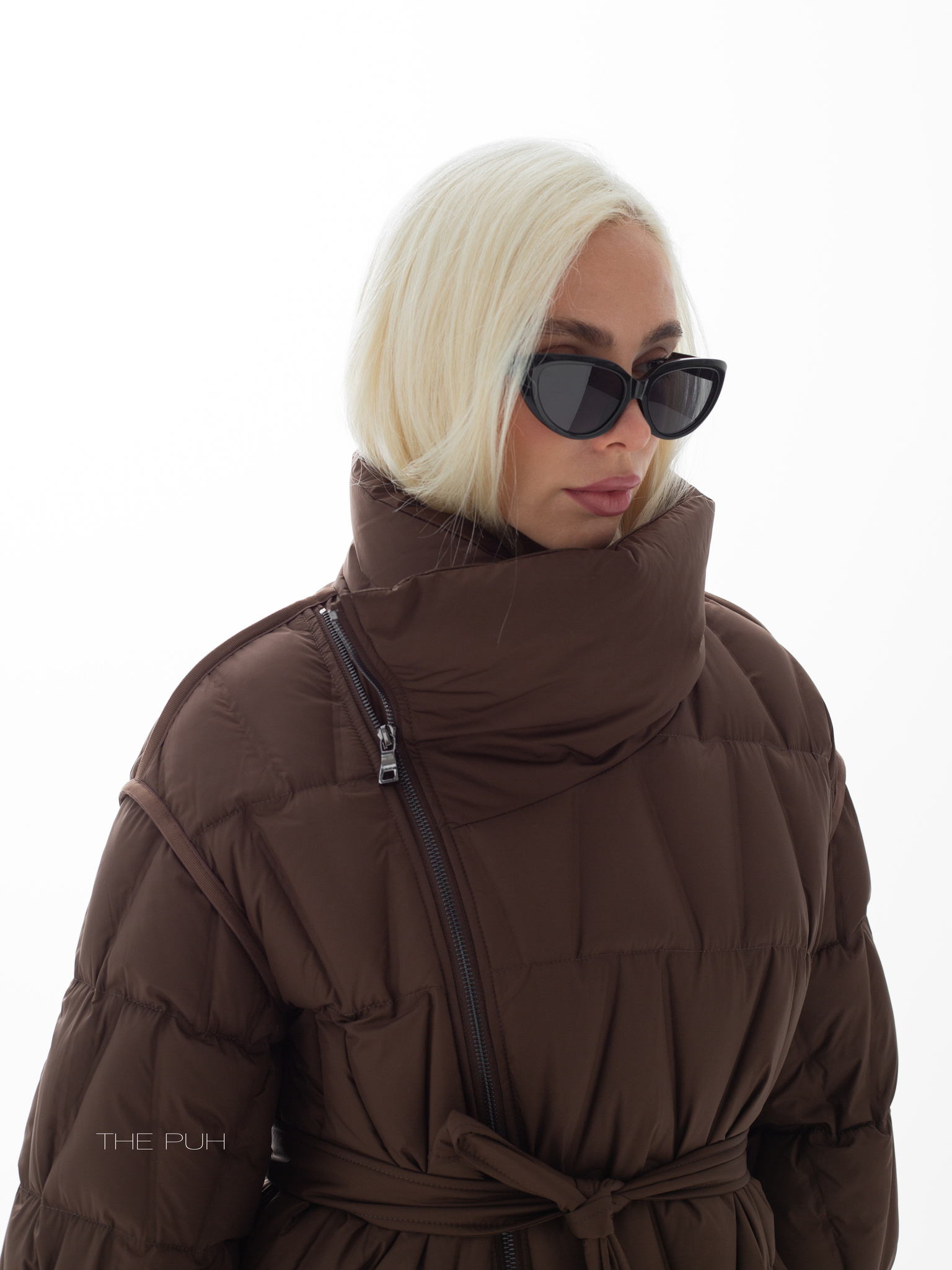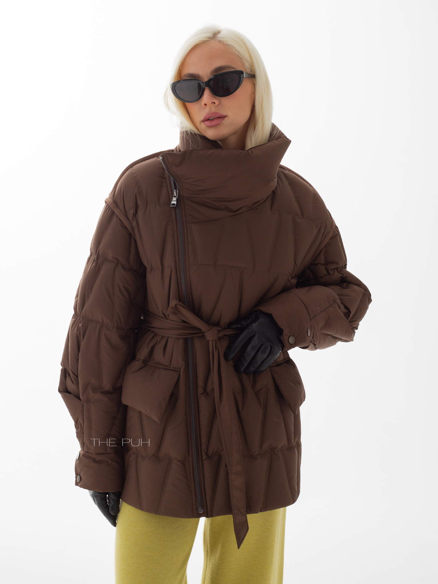 Удлиненный пуховик до середины бедра с поясом. Модель на молнии-косухе декорирована фигурной стежкой в елочку, объемным воротником и манжетами на кнопках.