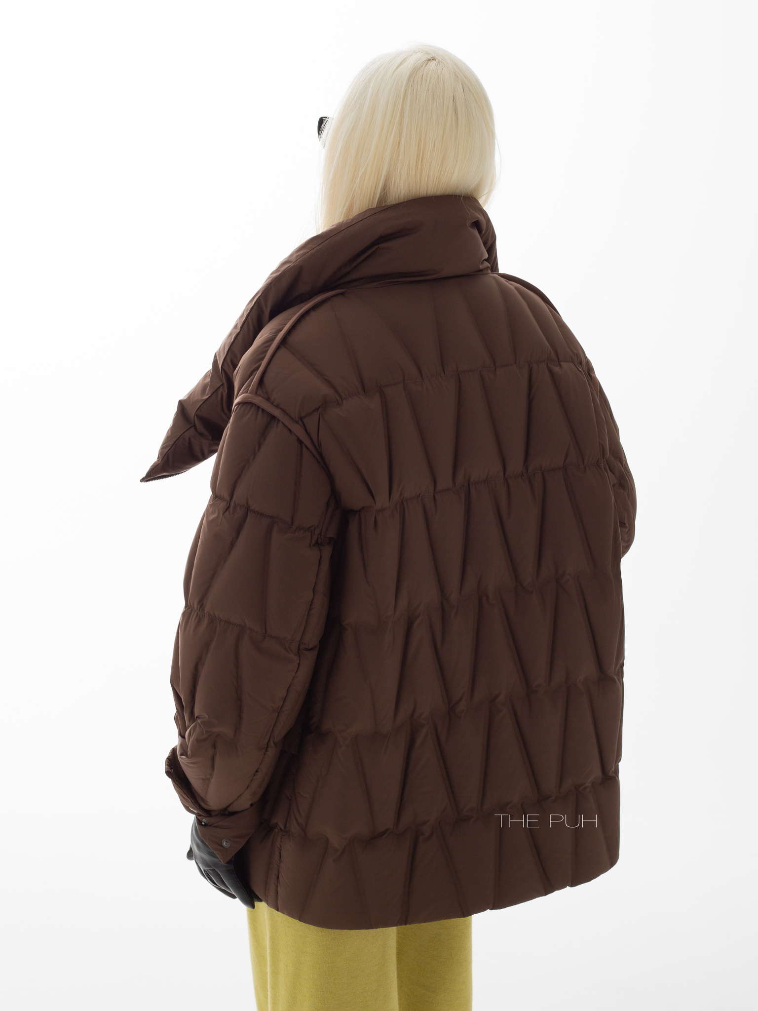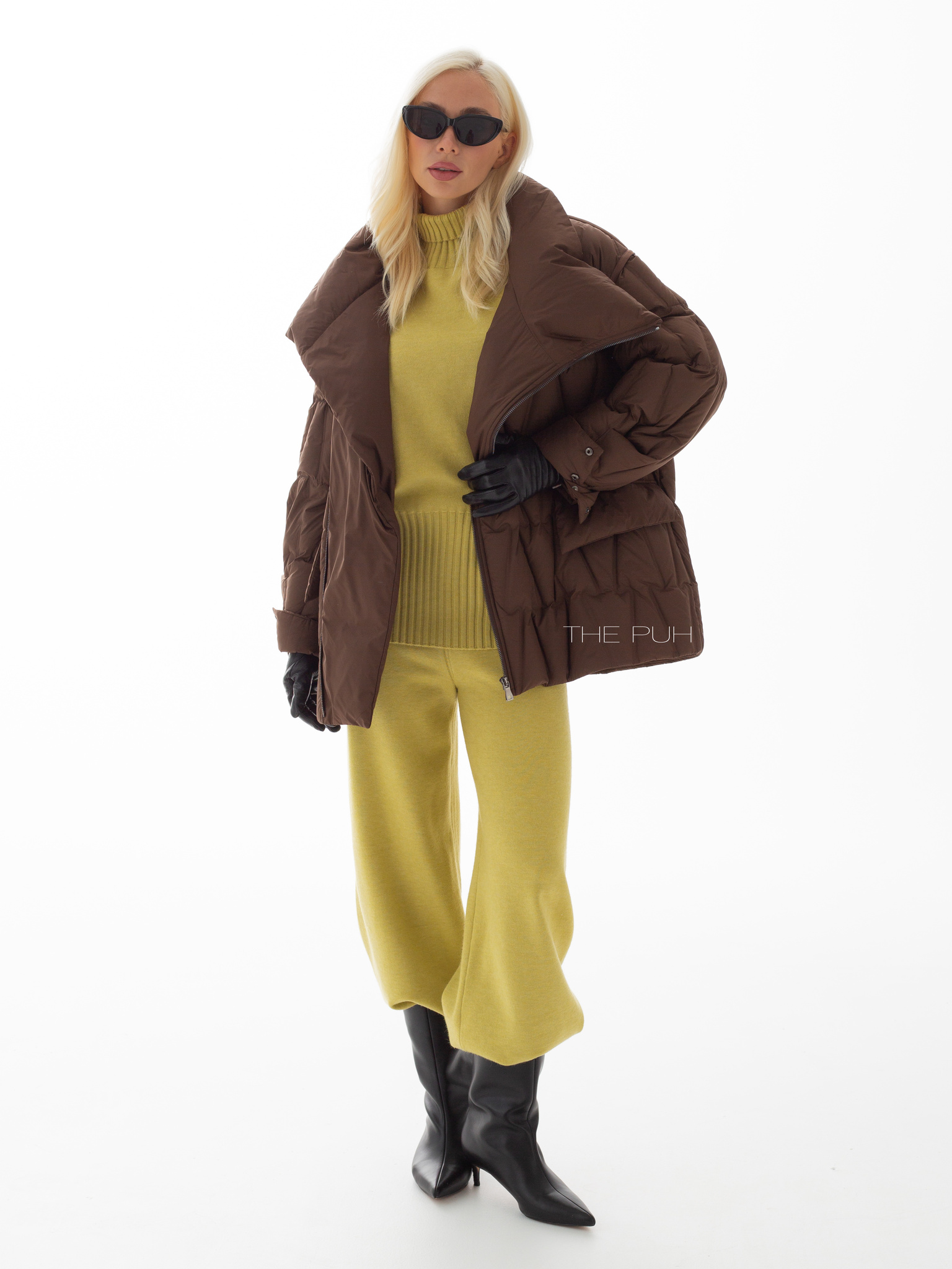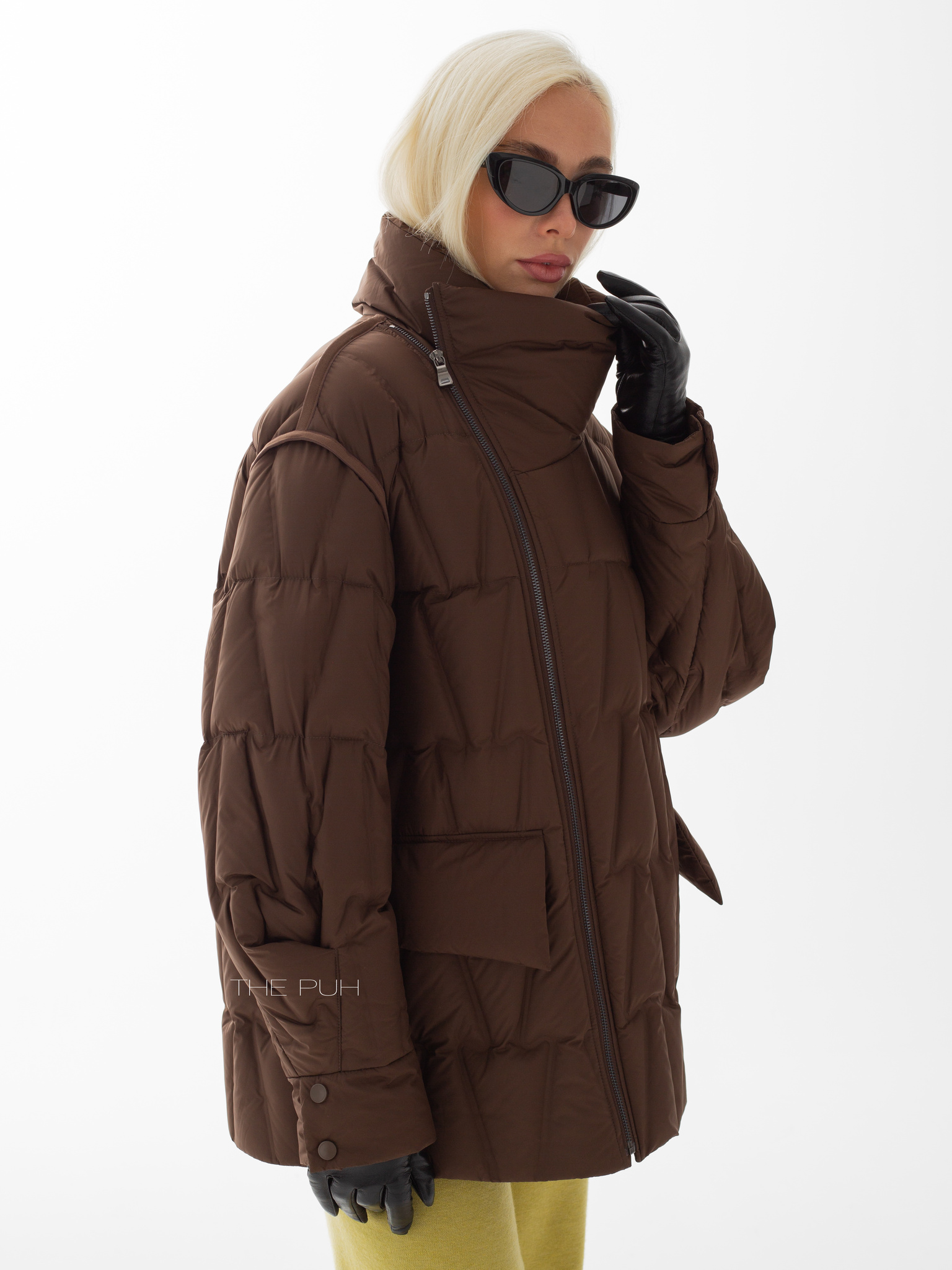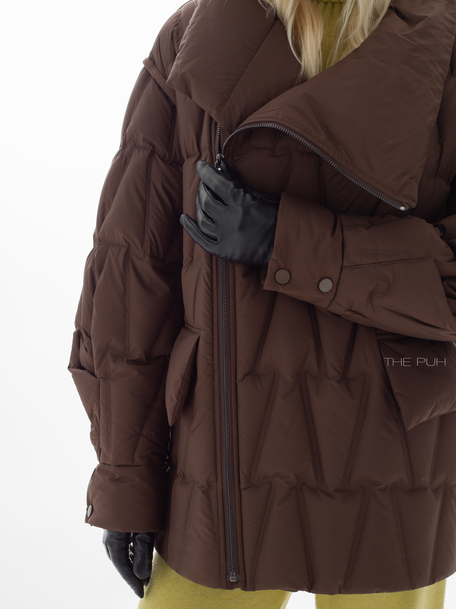 Удлиненный пуховик до середины бедра с поясом. Модель на молнии-косухе декорирована фигурной стежкой в елочку, объемным воротником и манжетами на кнопках.