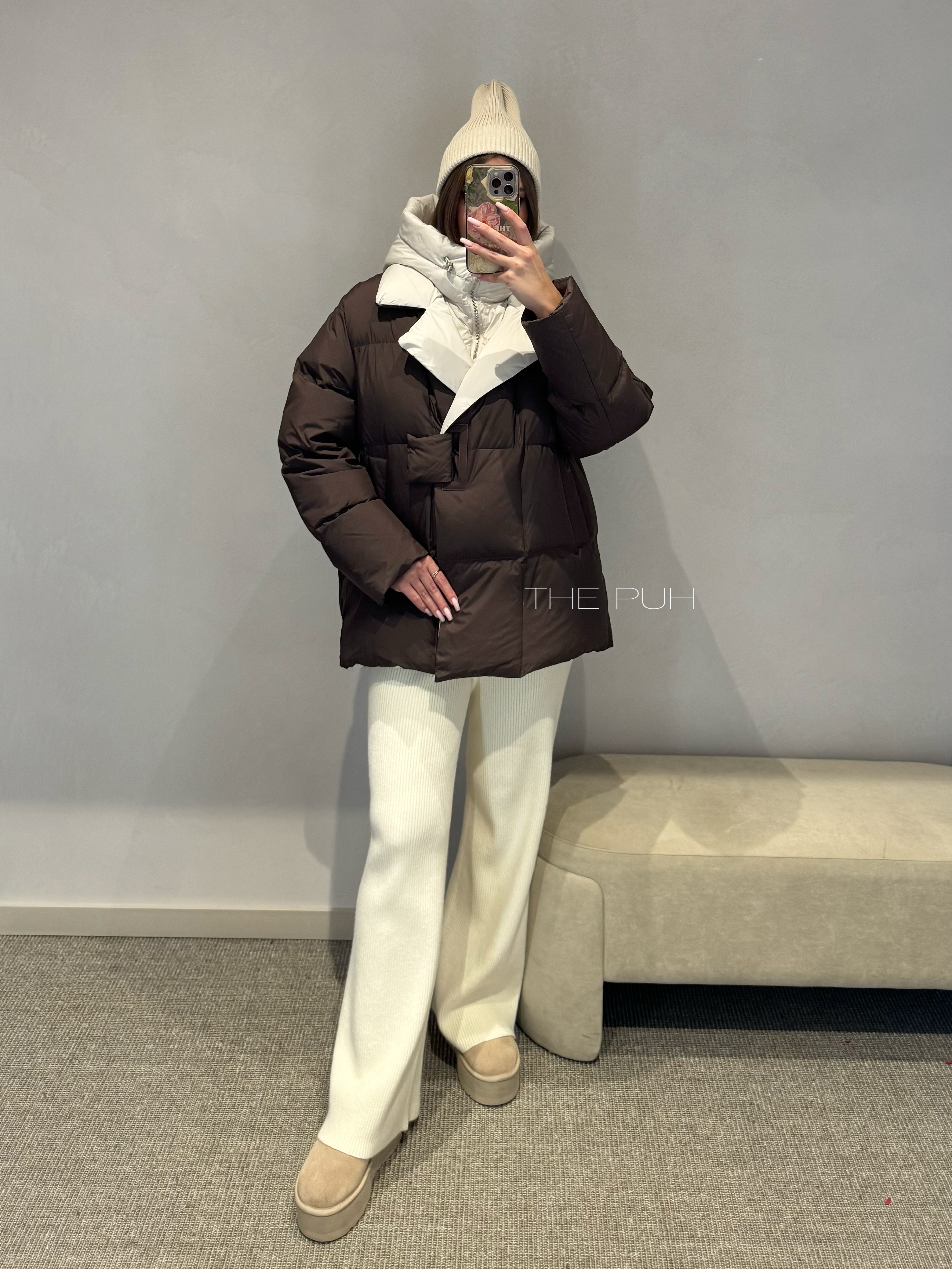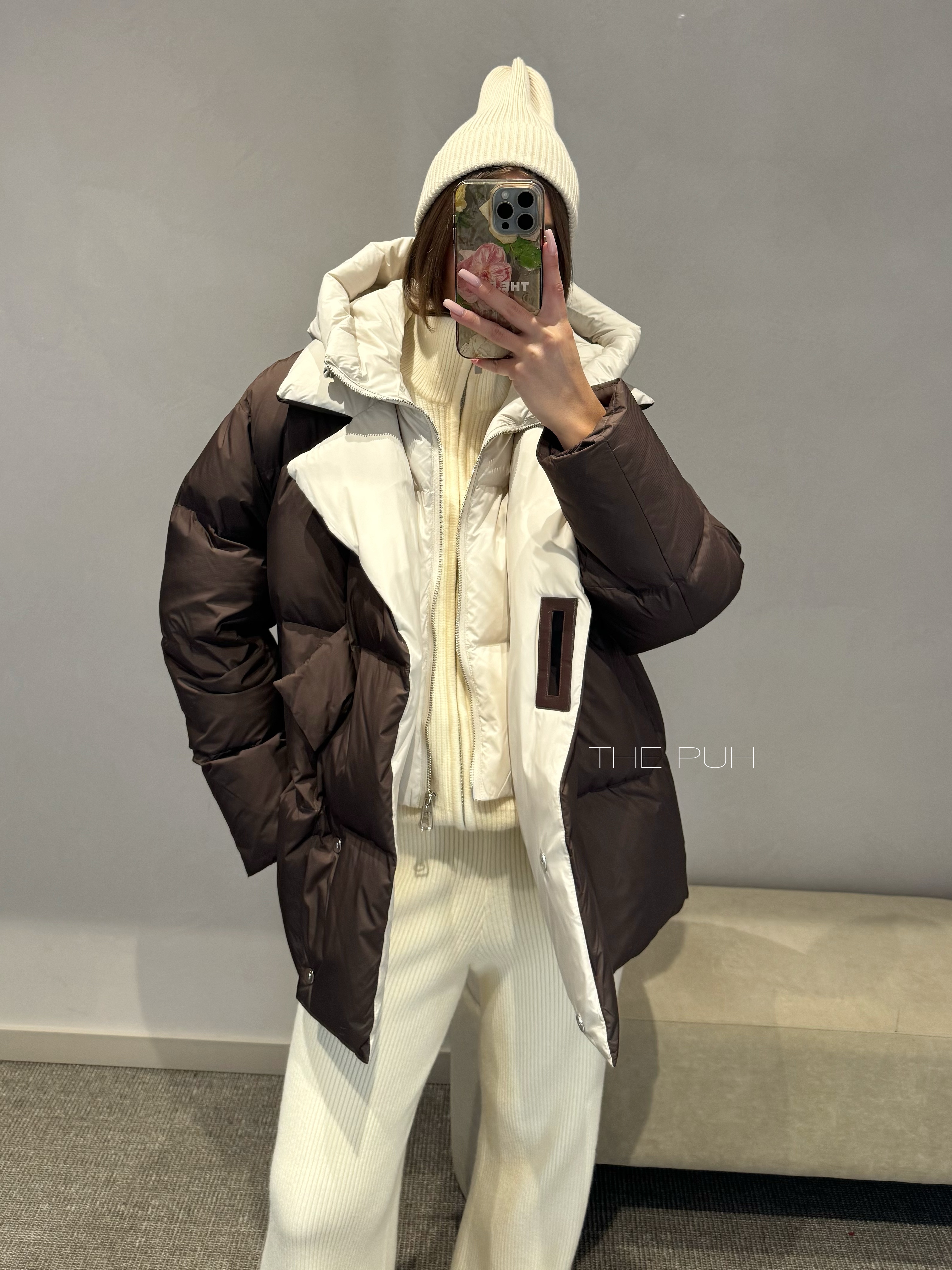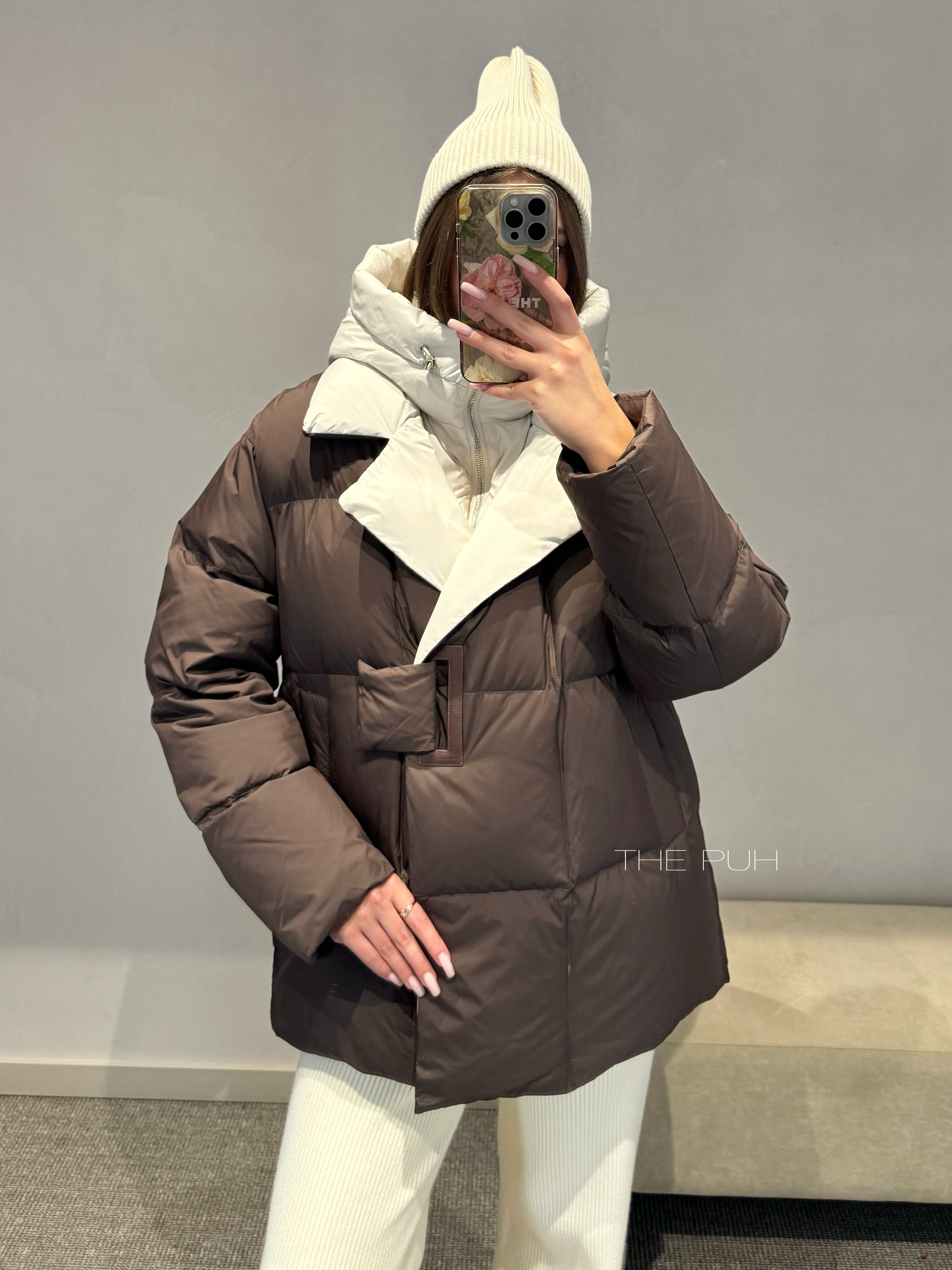 Шоколадный пуховик со съемной кремовой манишкой-капюшоном. Удлиненная модель утеплена натуральным пухом и согреет в самые сильные морозы.