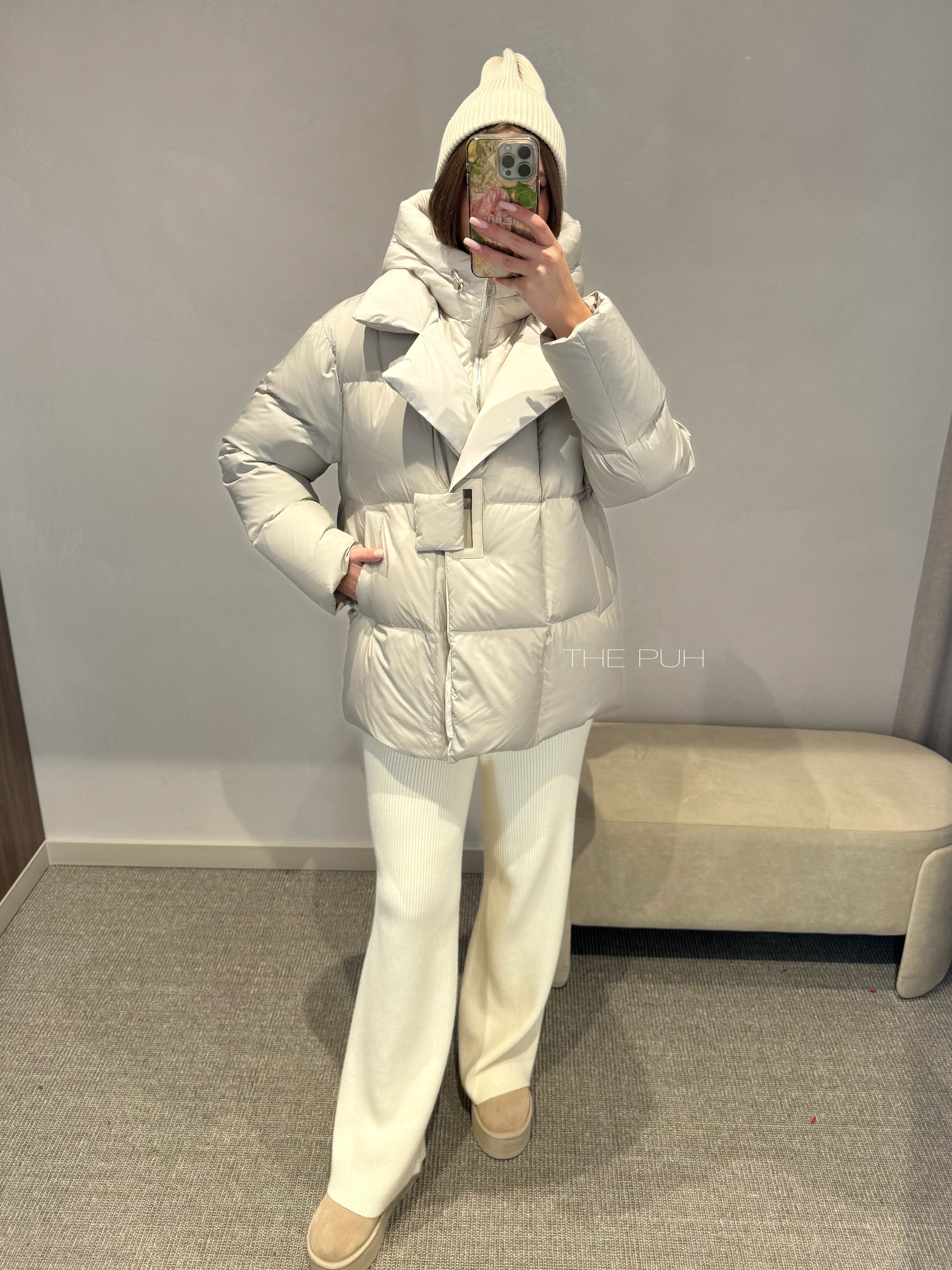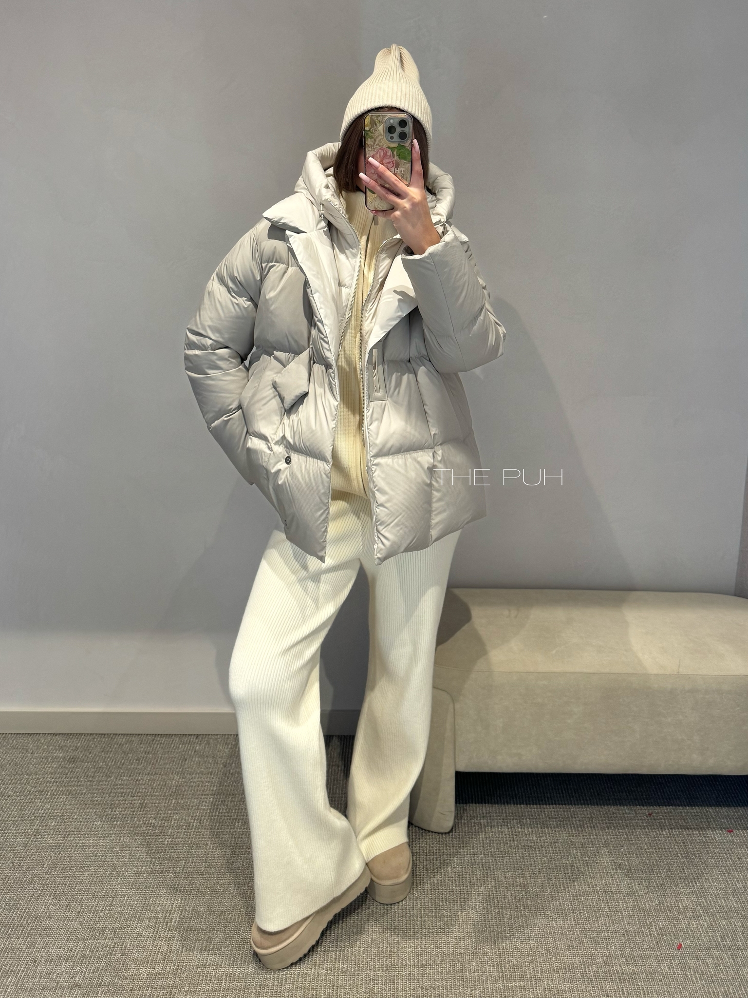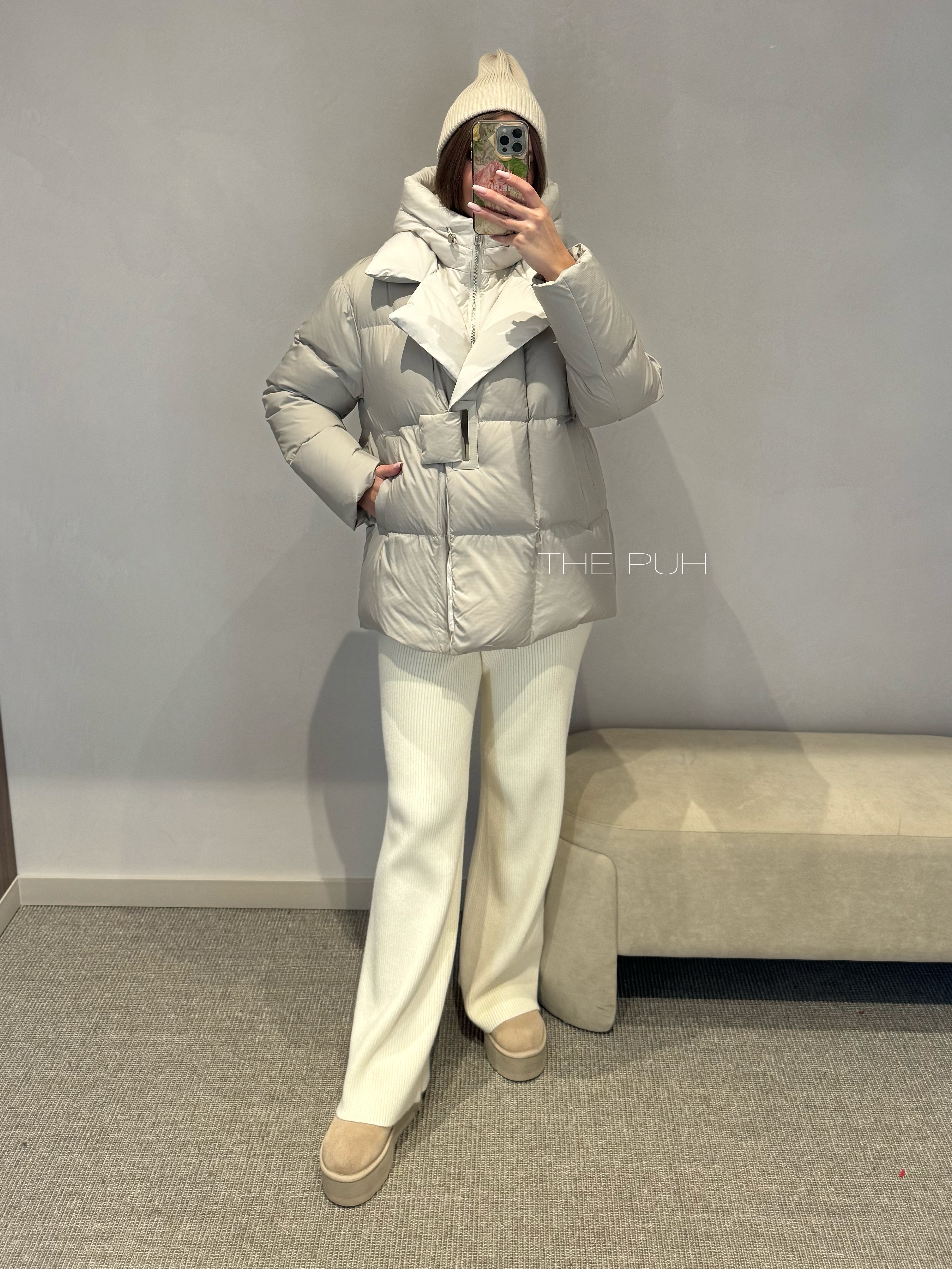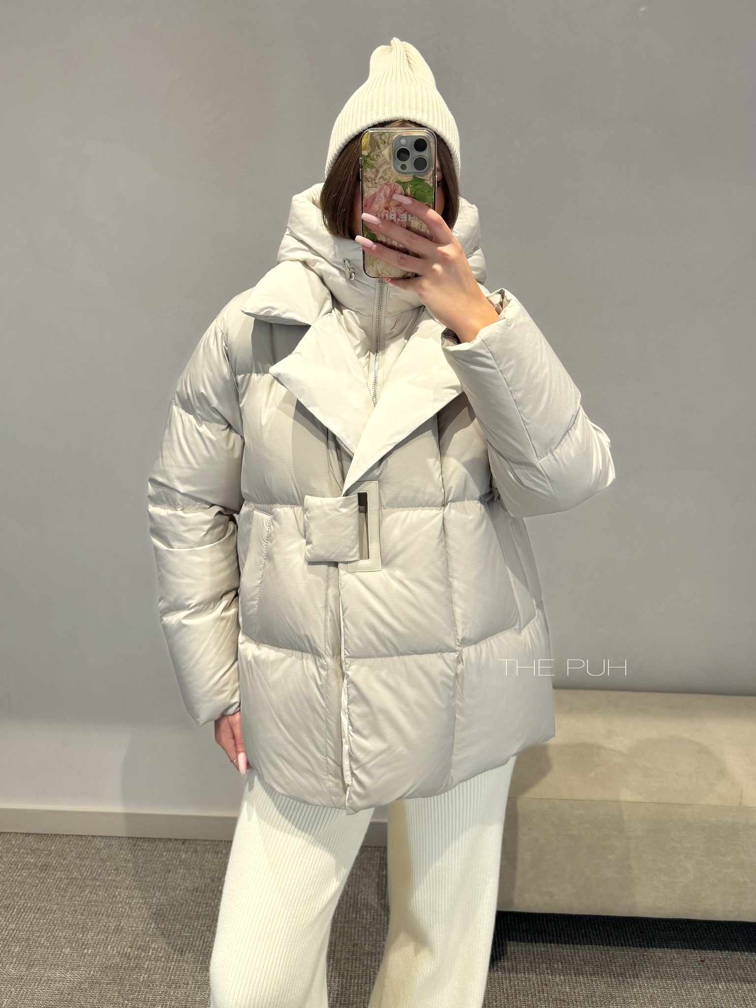 Серый пуховик со съемной молочной манишкой-капюшоном. Удлиненная модель утеплена натуральным пухом и согреет в самые сильные морозы.