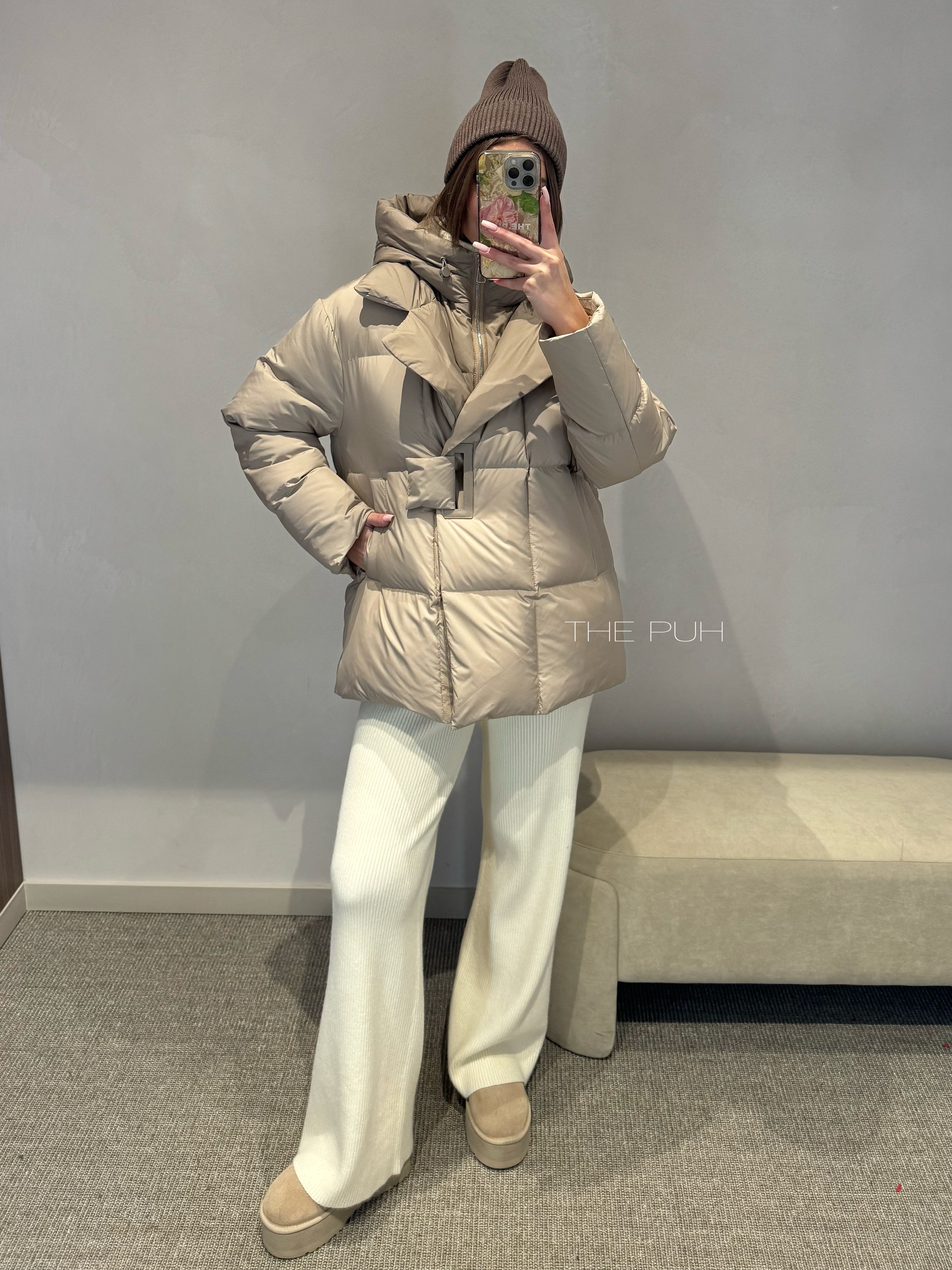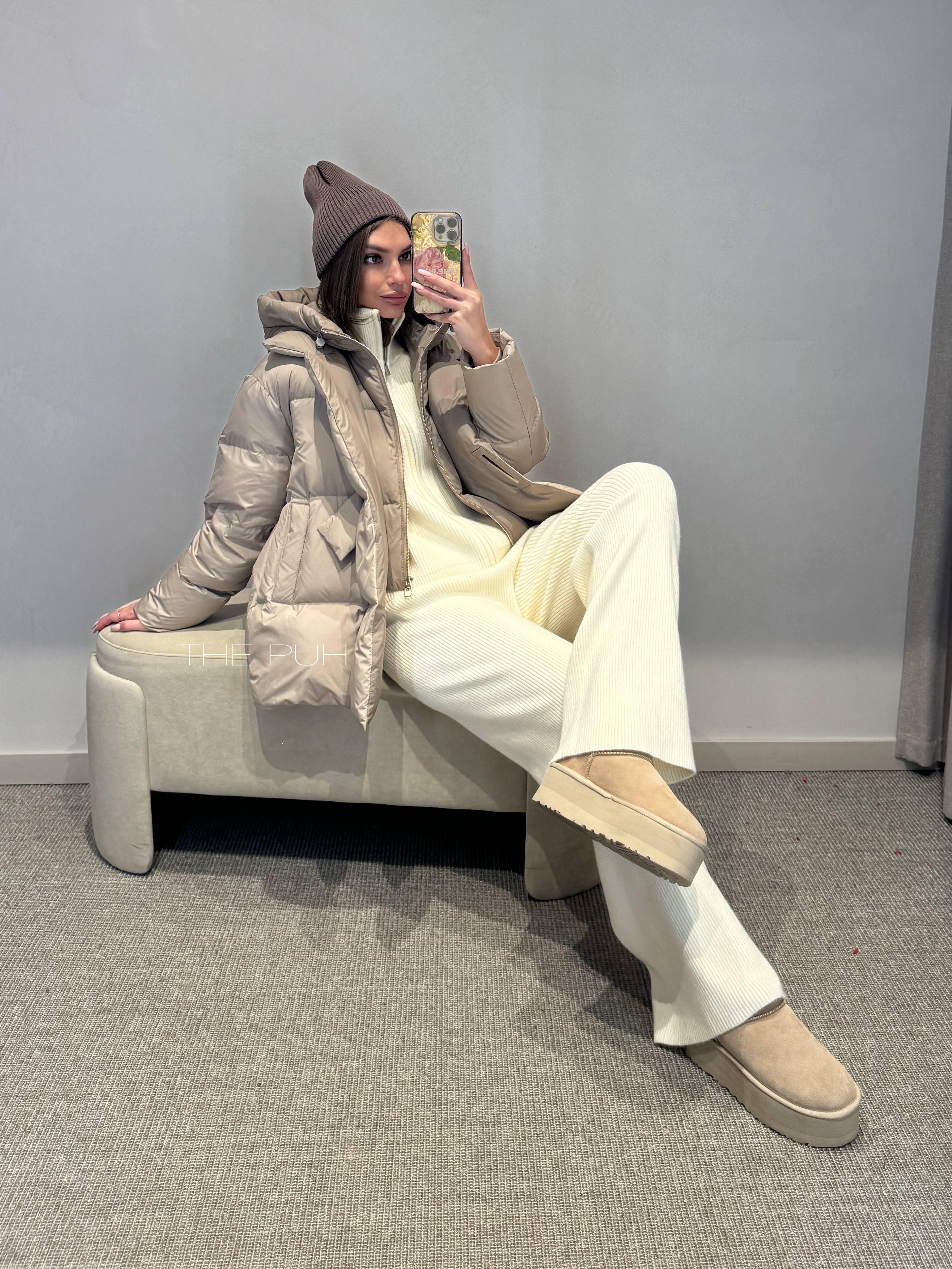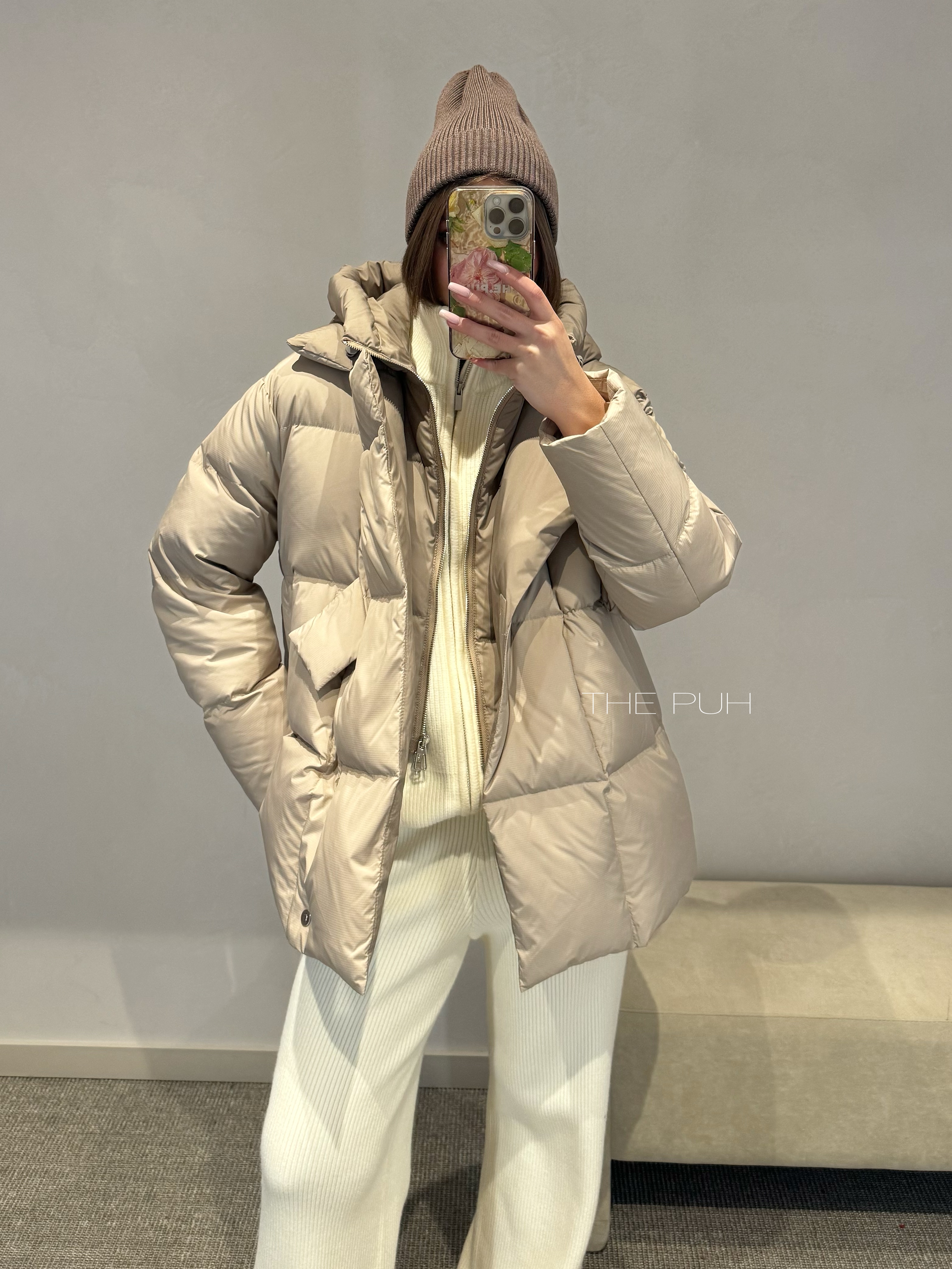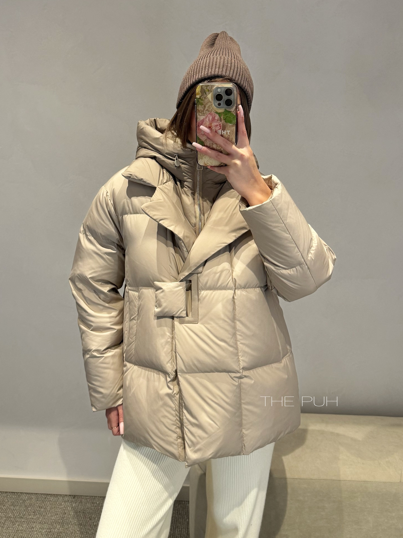 Бежевый пуховик со съемной манишкой-капюшоном. Удлиненная модель утеплена натуральным пухом и согреет в самые сильные морозы.