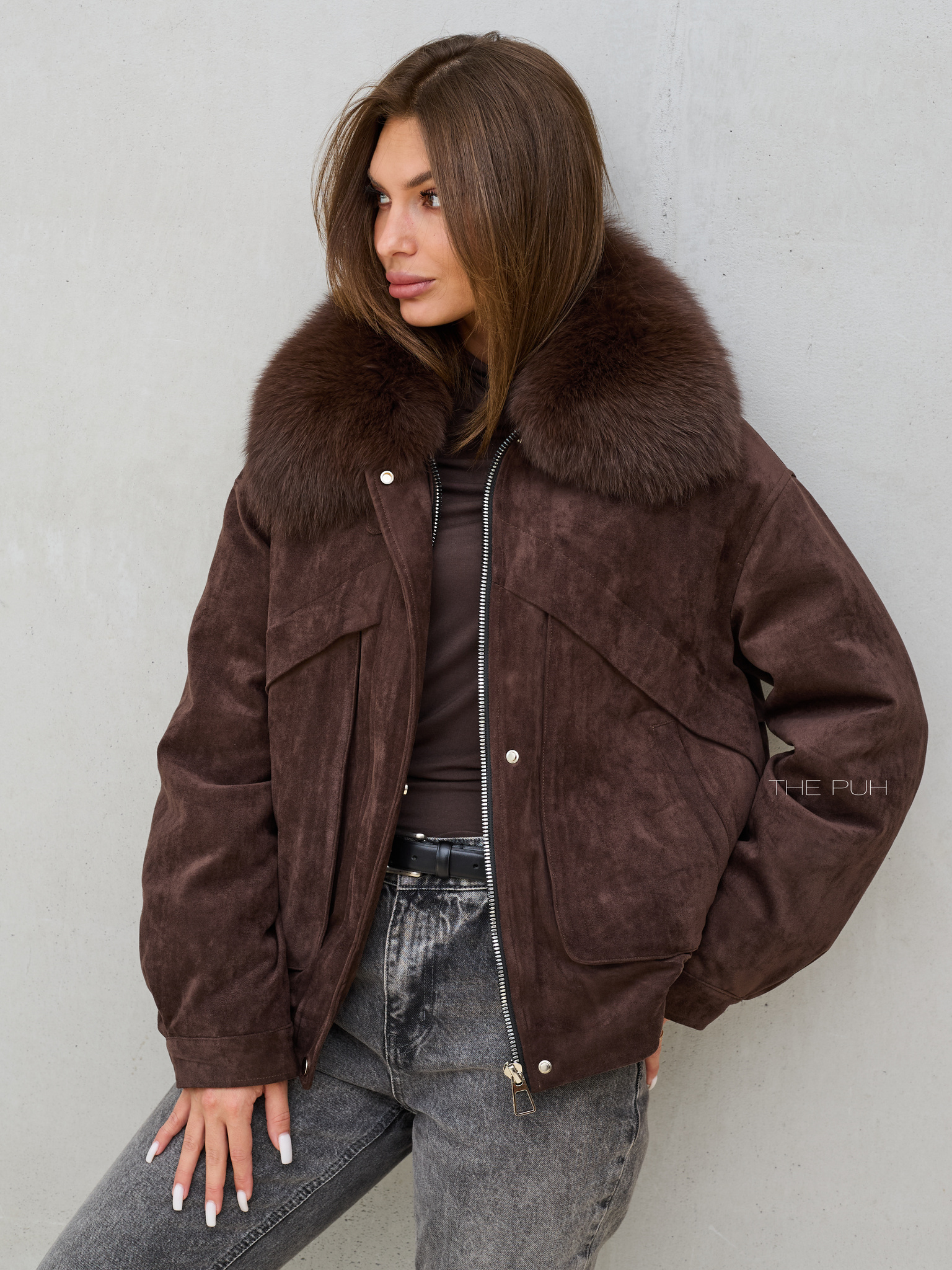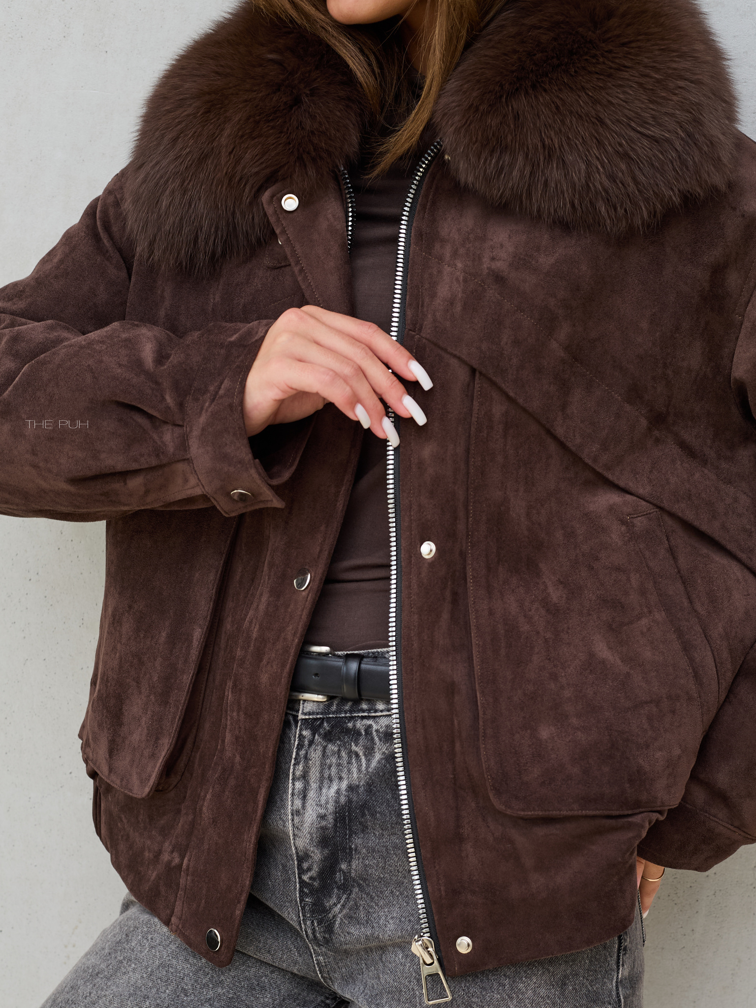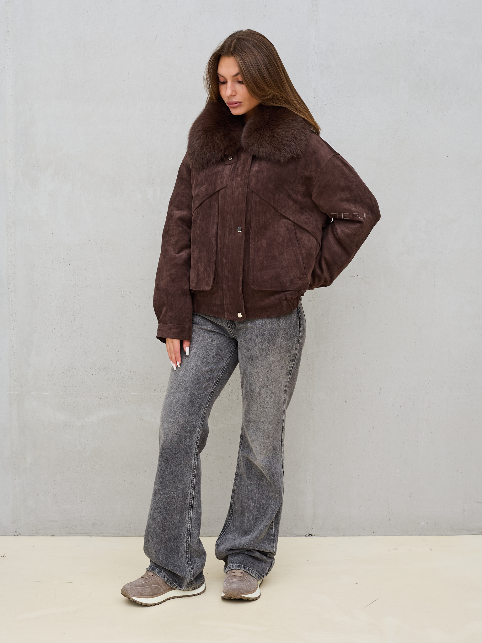 Объемная куртка из замши глубокого шоколадного оттенка создает элегантный образ с ноткой бунтарства. Съемный воротник позволяет легко адаптировать ее под любой случай — от повседневной прогулки до вечернего выхода.