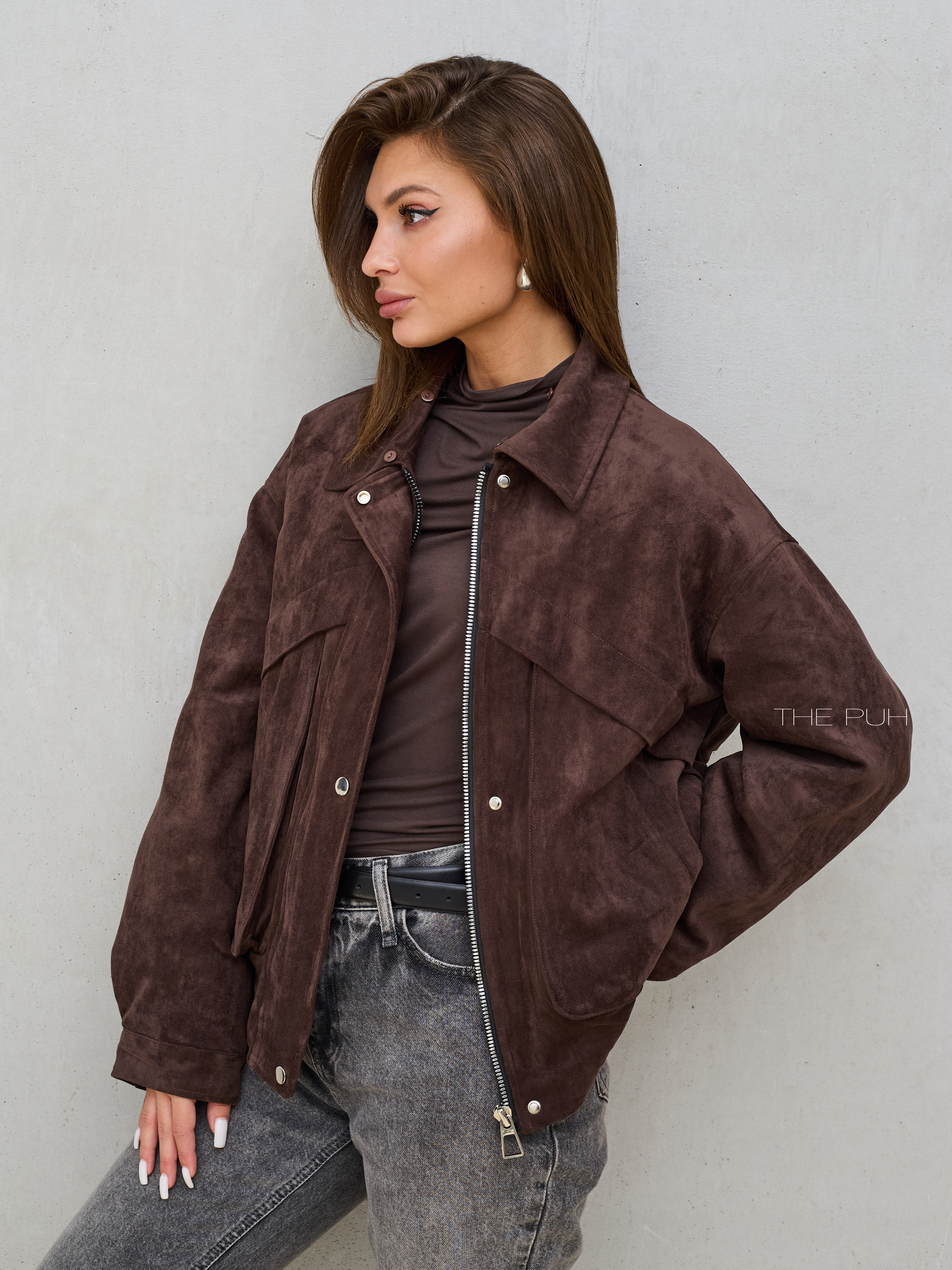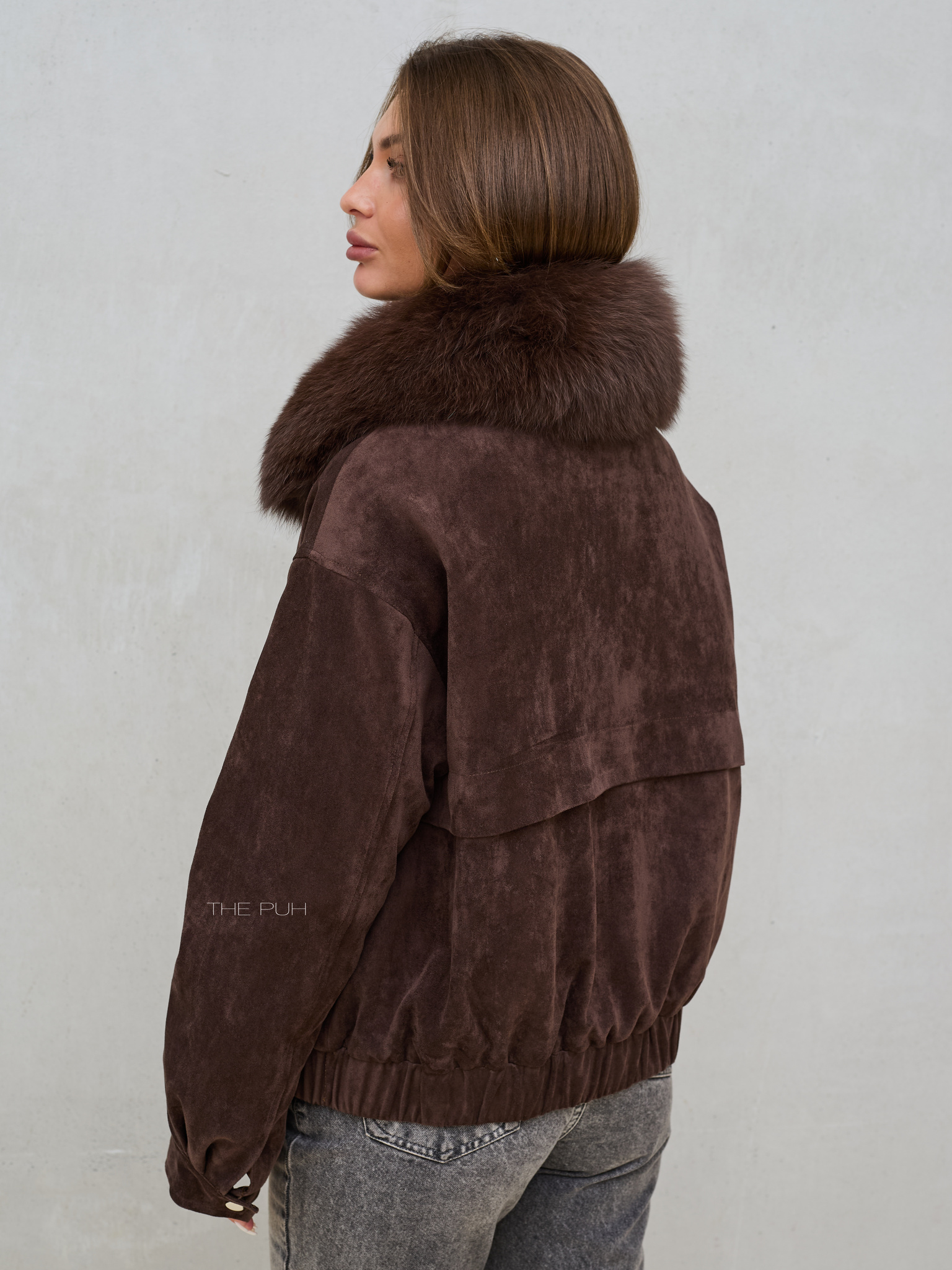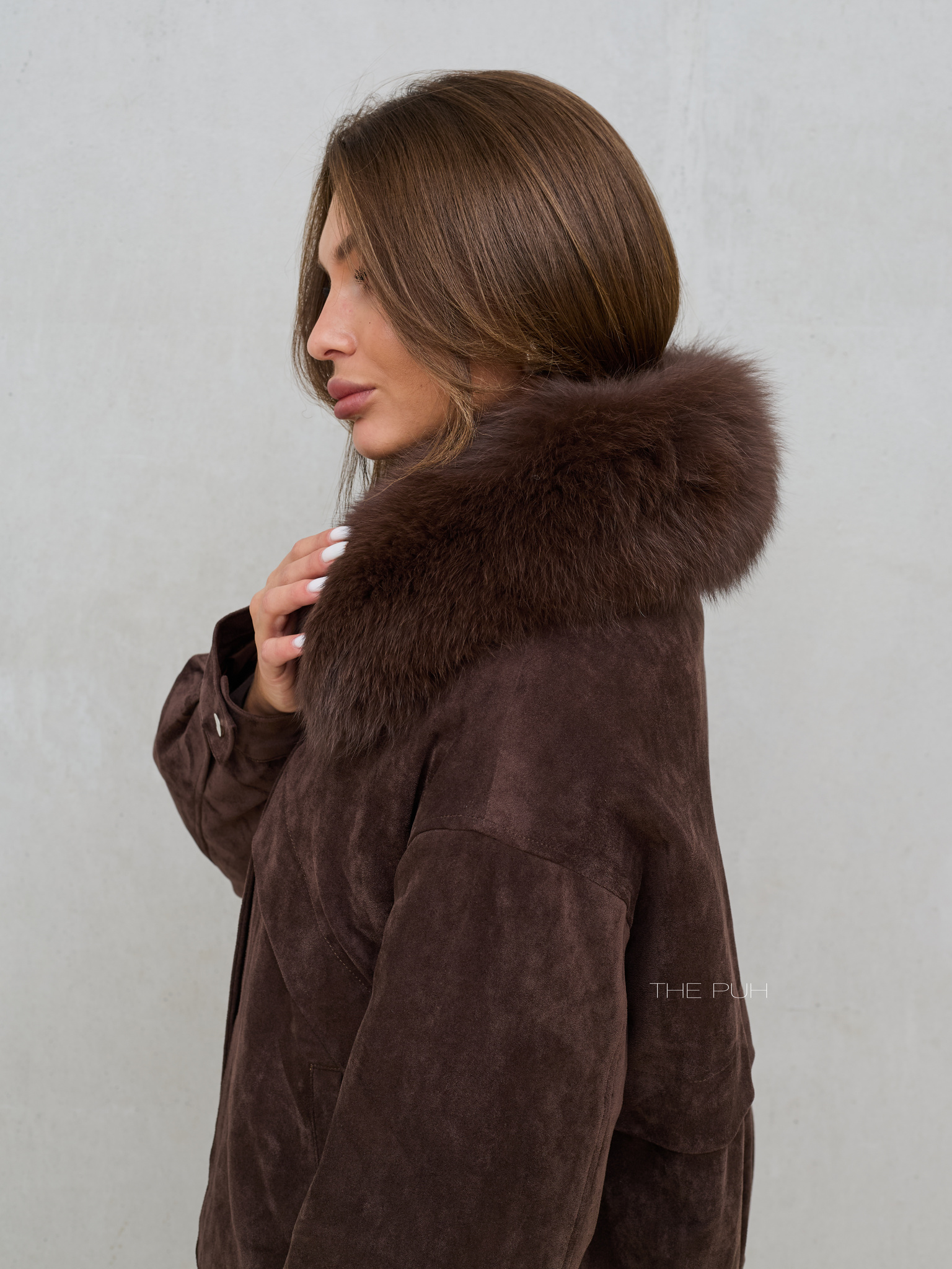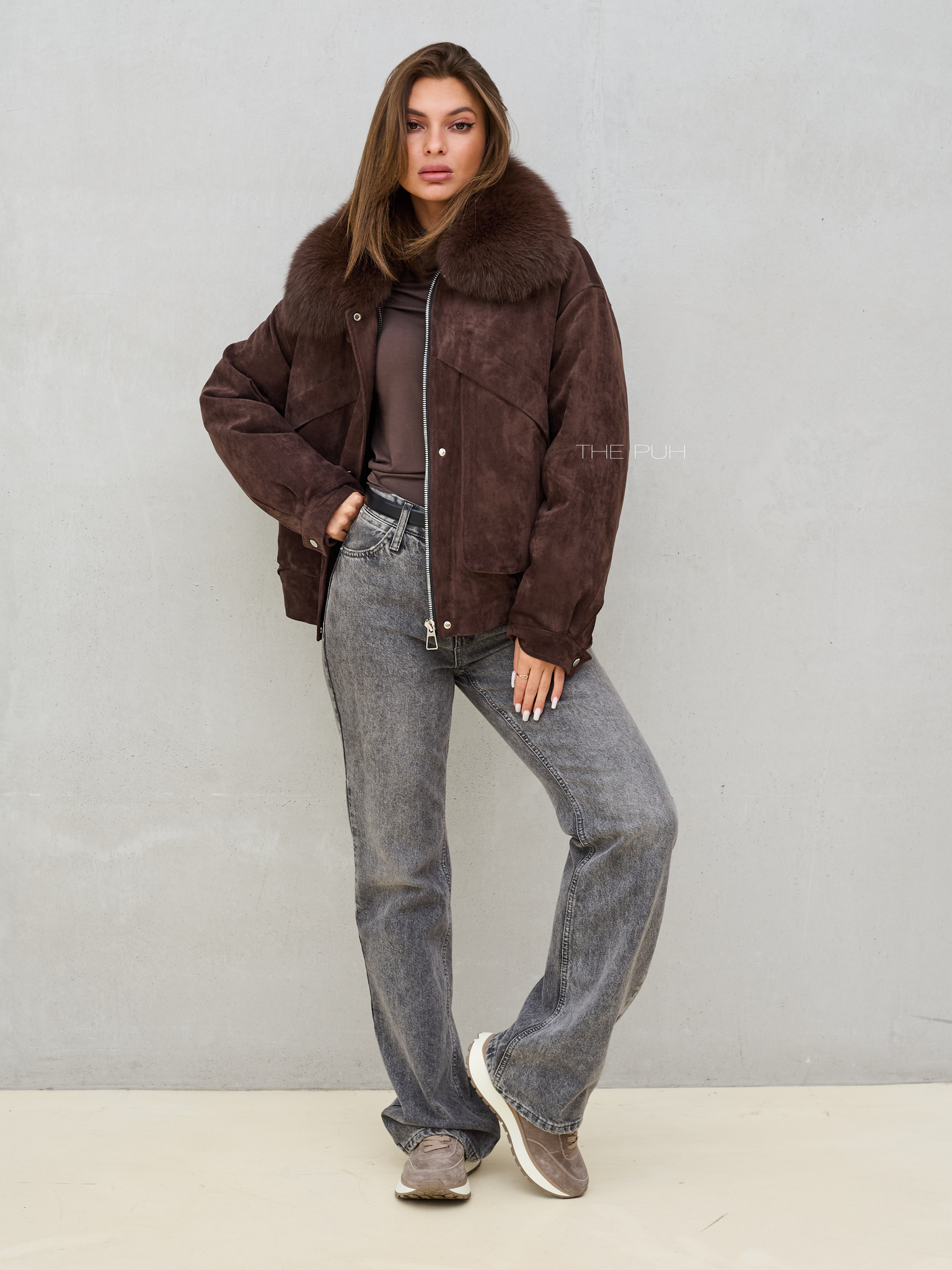 Объемная куртка из замши глубокого шоколадного оттенка создает элегантный образ с ноткой бунтарства. Съемный воротник позволяет легко адаптировать ее под любой случай — от повседневной прогулки до вечернего выхода.