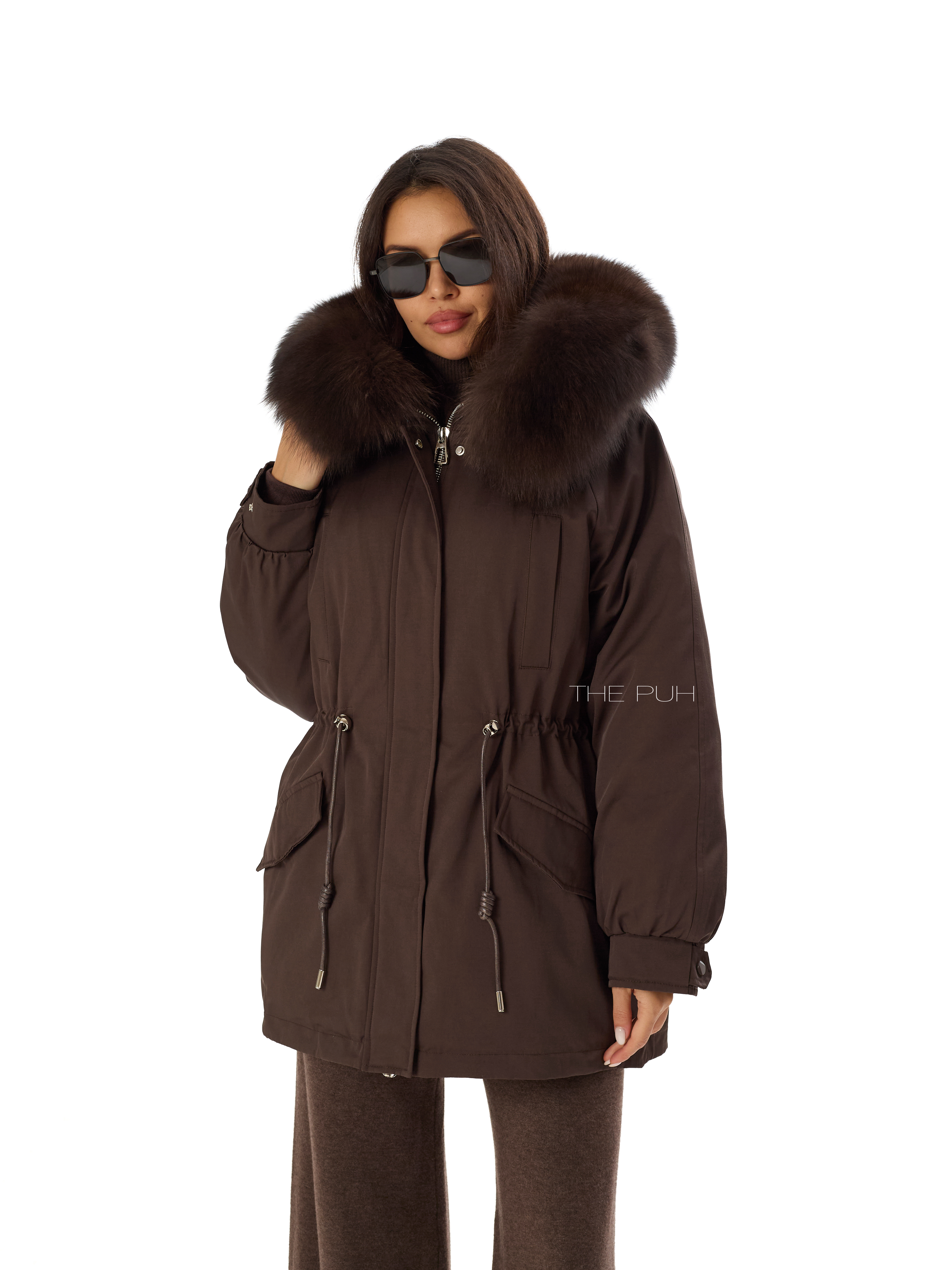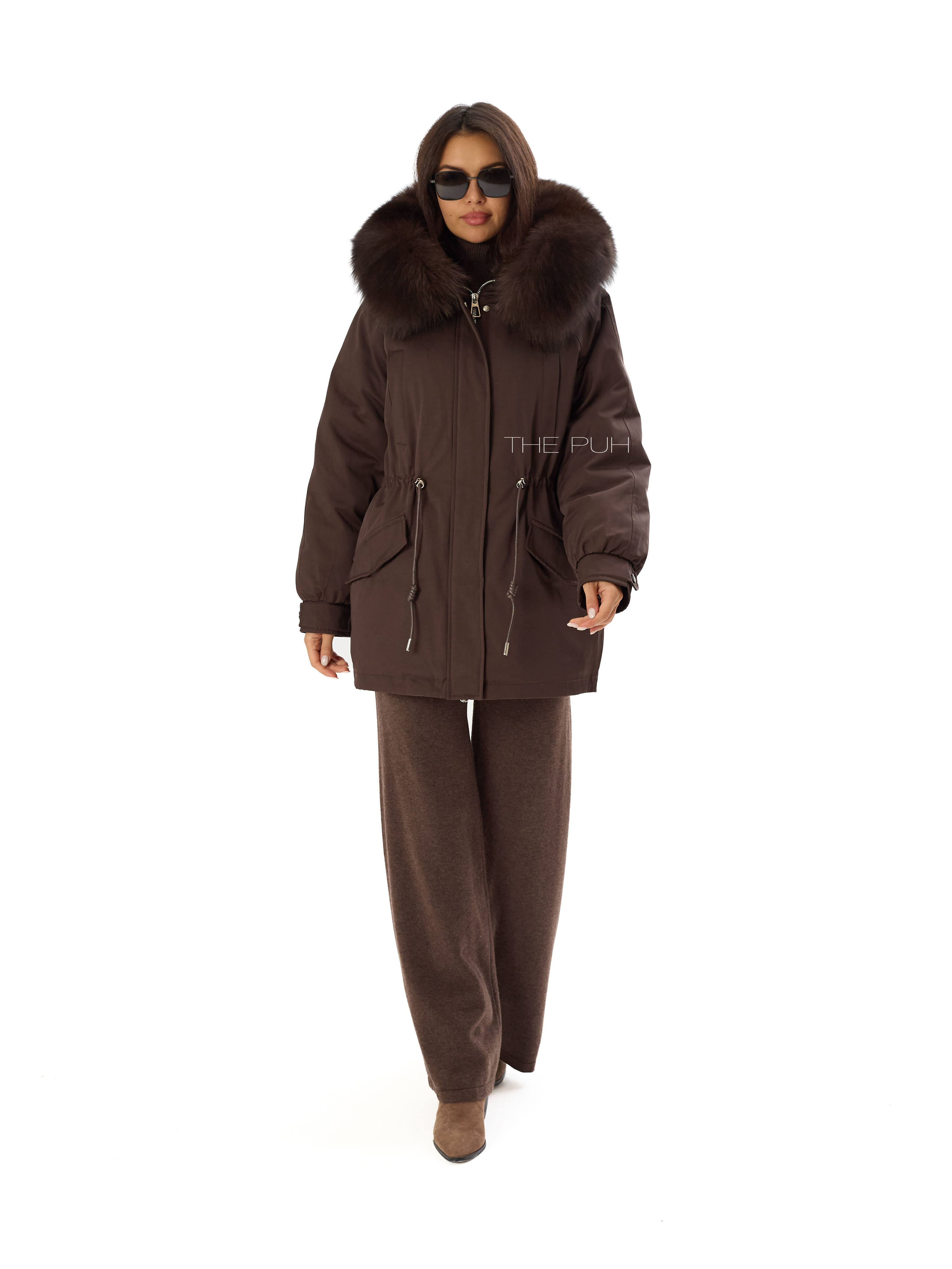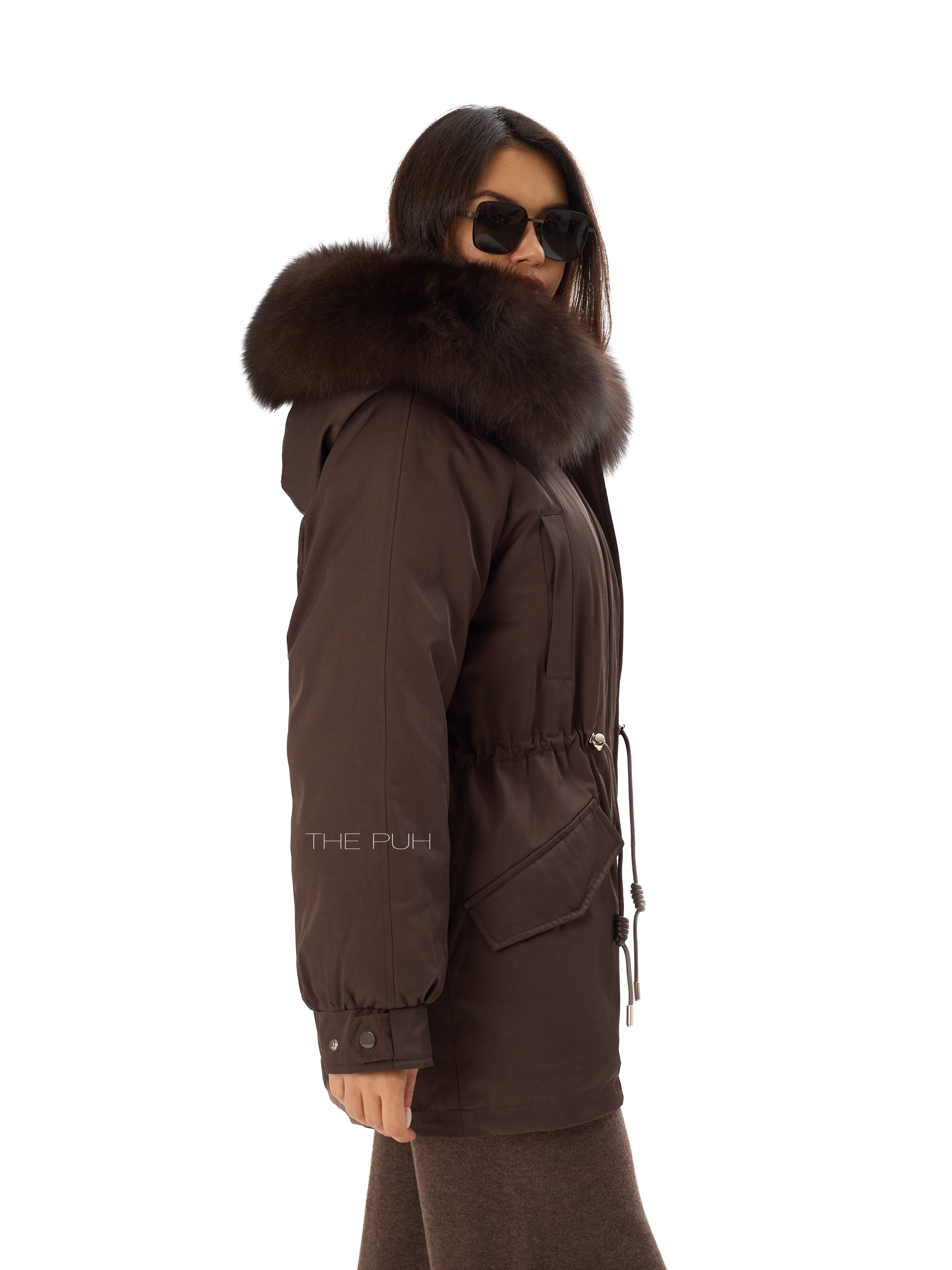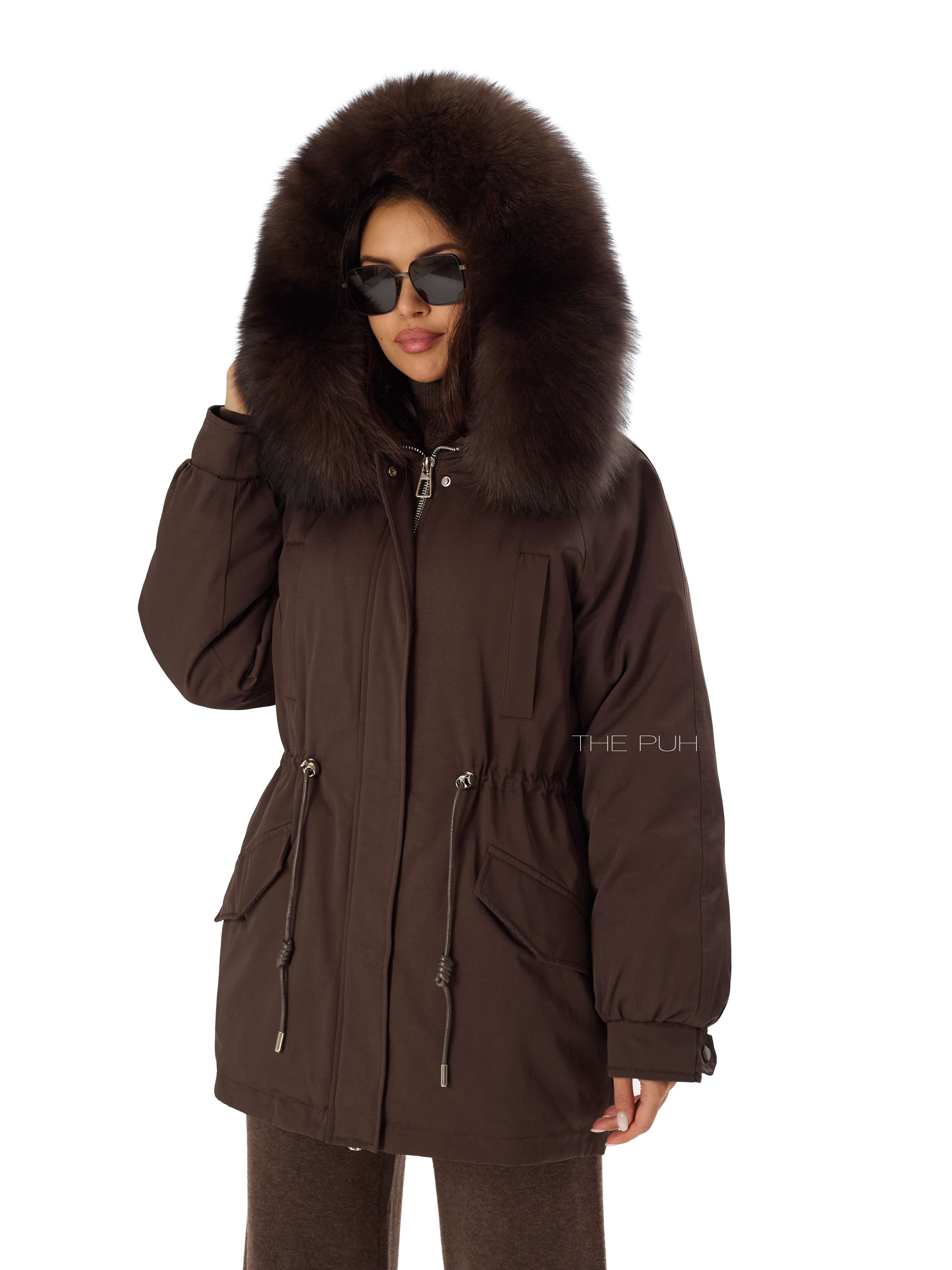 Шоколадная пуховая парка средней длины с оторочкой из меха песца на капюшоне. Модель с кулиской на талии позволяет контролировать прилегание и менять силуэт по желанию. Съемный мех защитит от ветра и осадков.