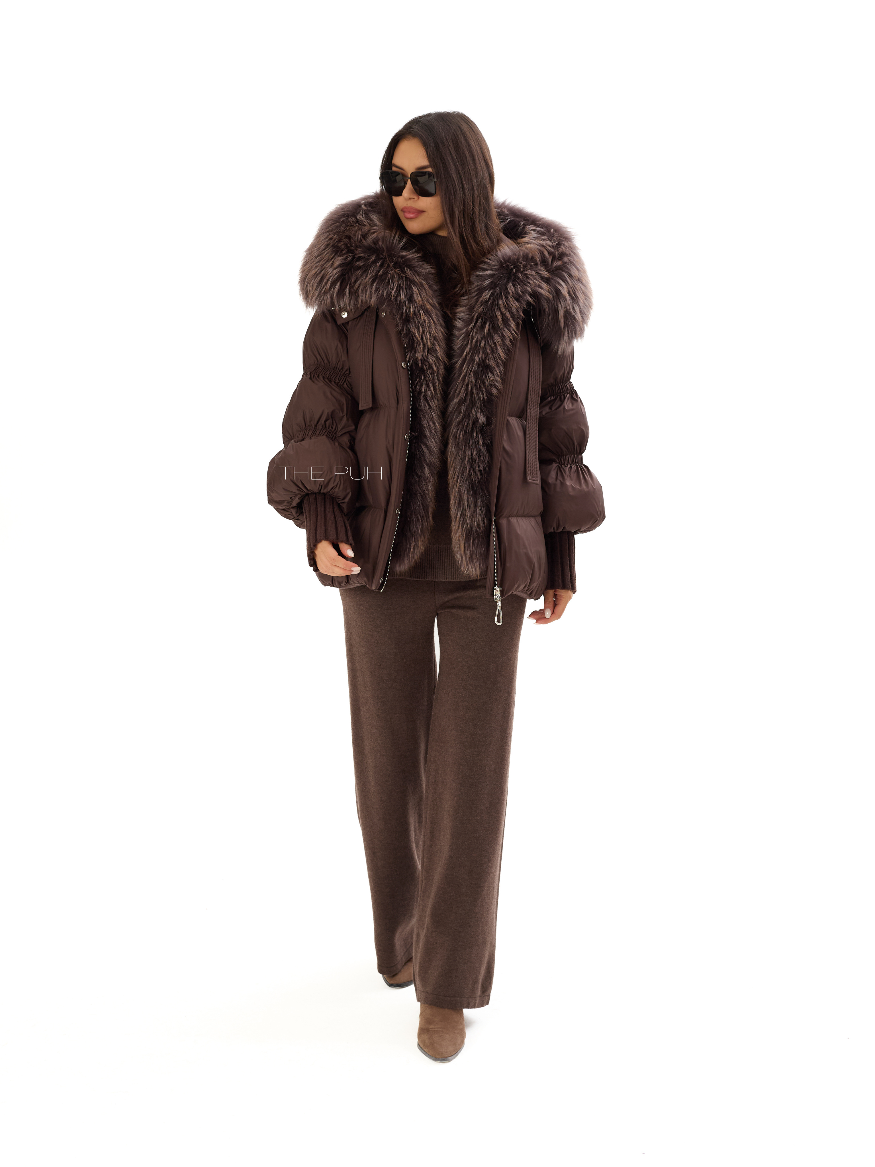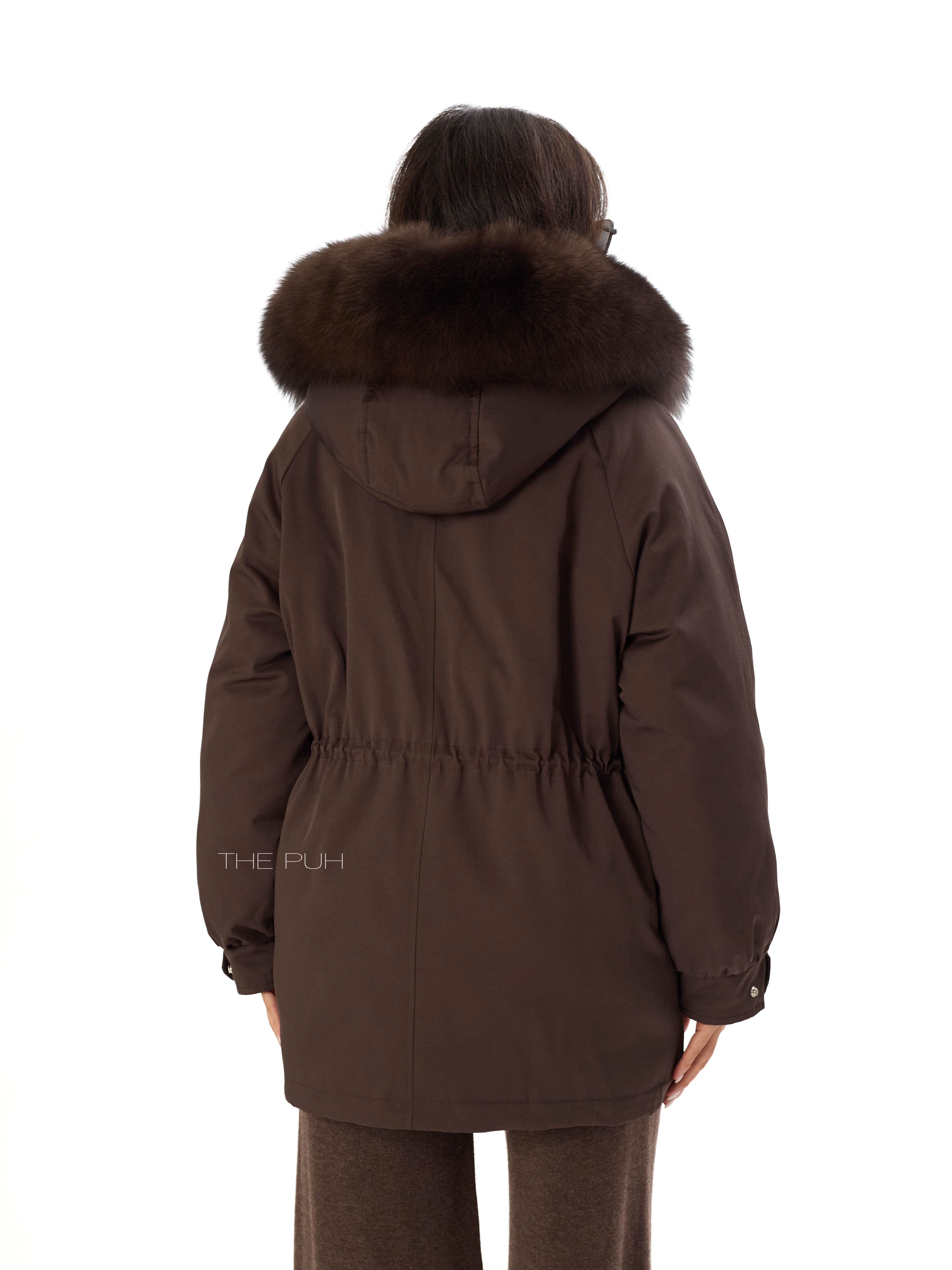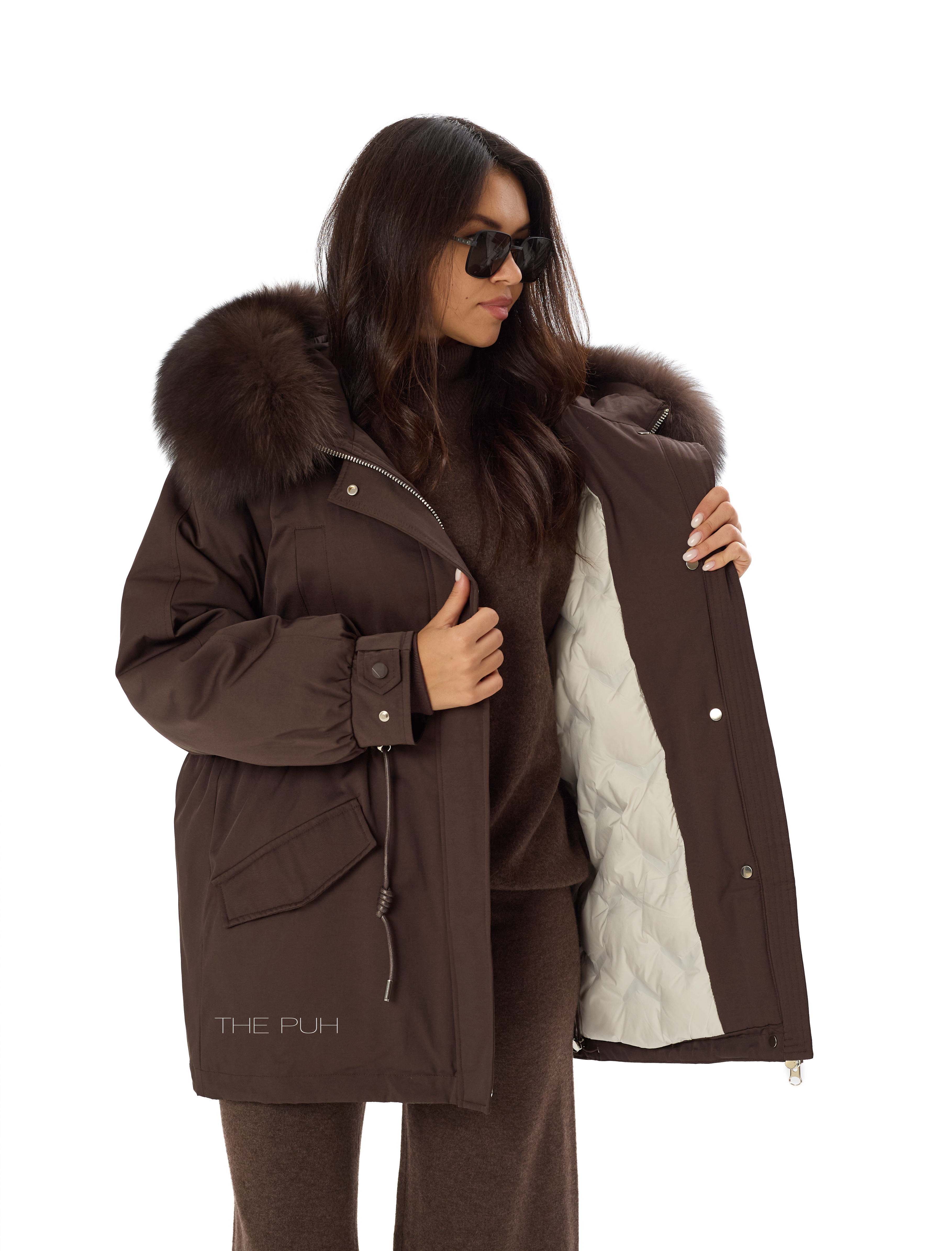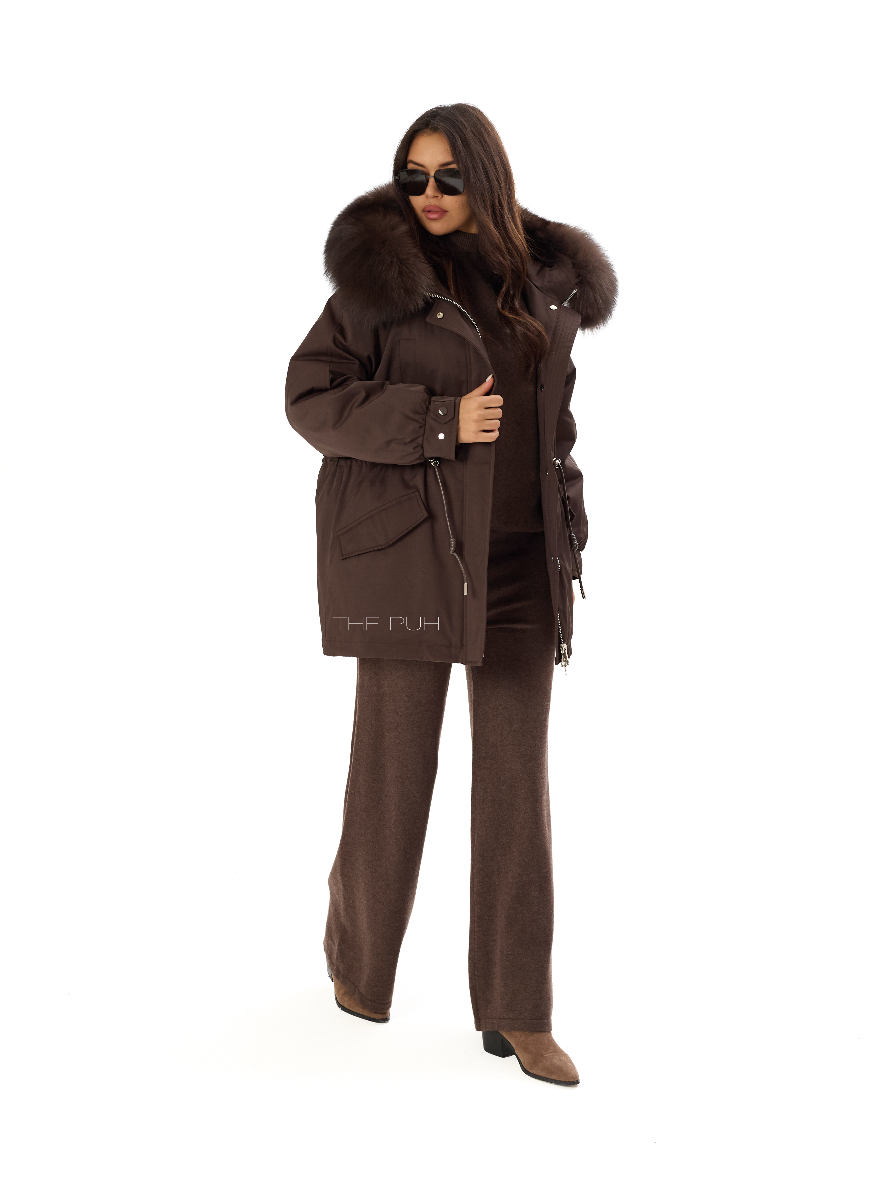 Шоколадная пуховая парка средней длины с оторочкой из меха песца на капюшоне. Модель с кулиской на талии позволяет контролировать прилегание и менять силуэт по желанию. Съемный мех защитит от ветра и осадков.