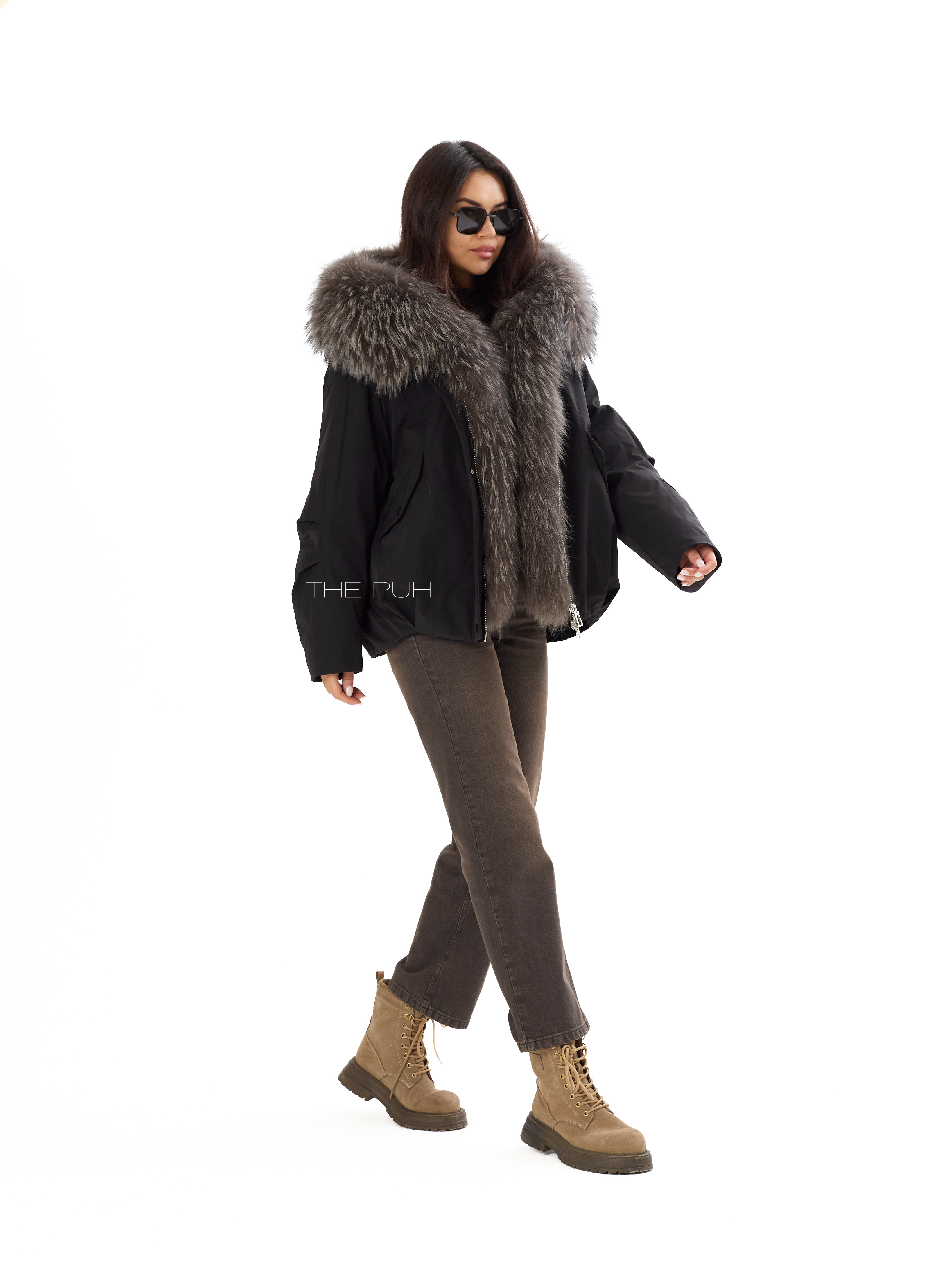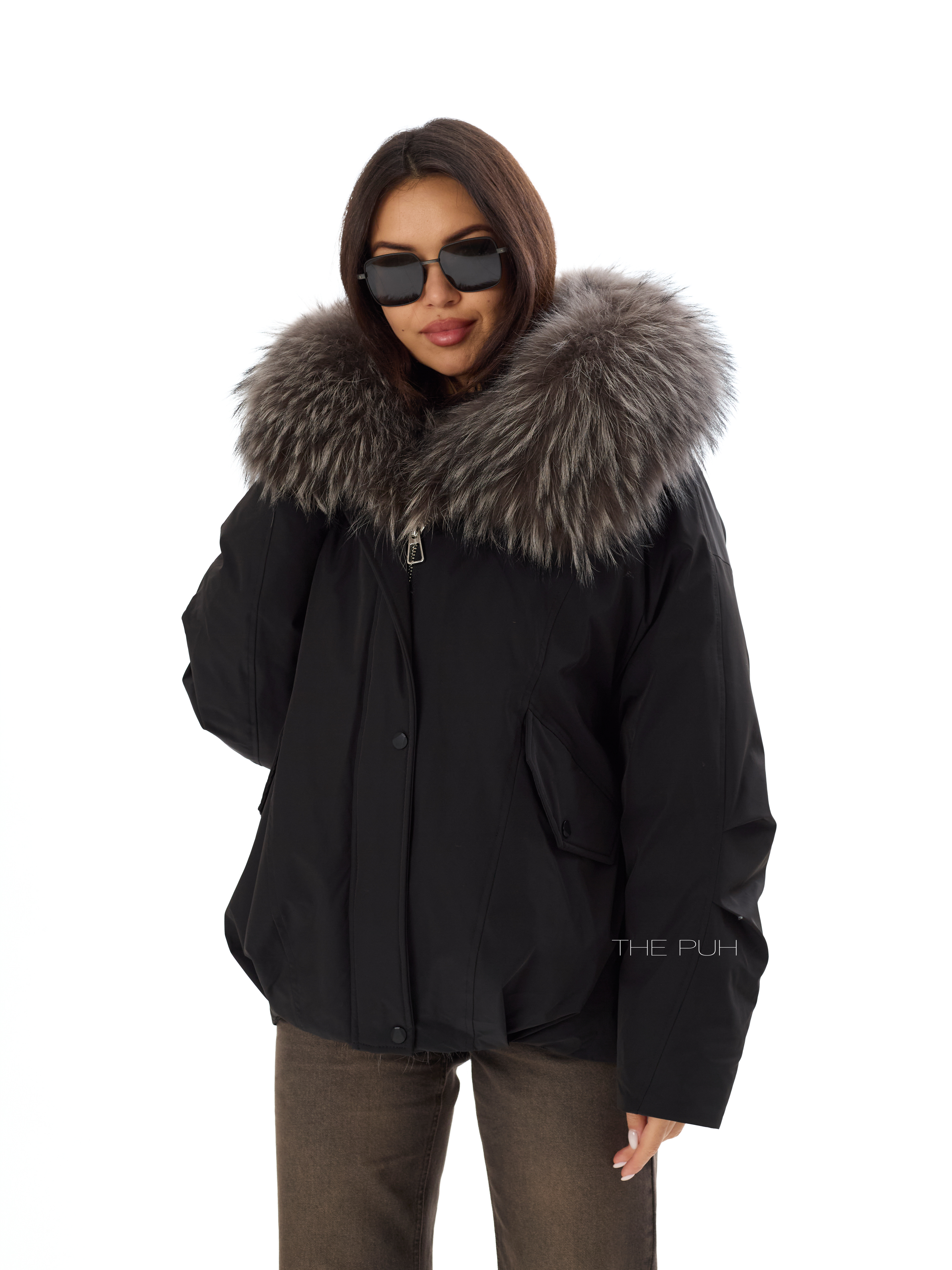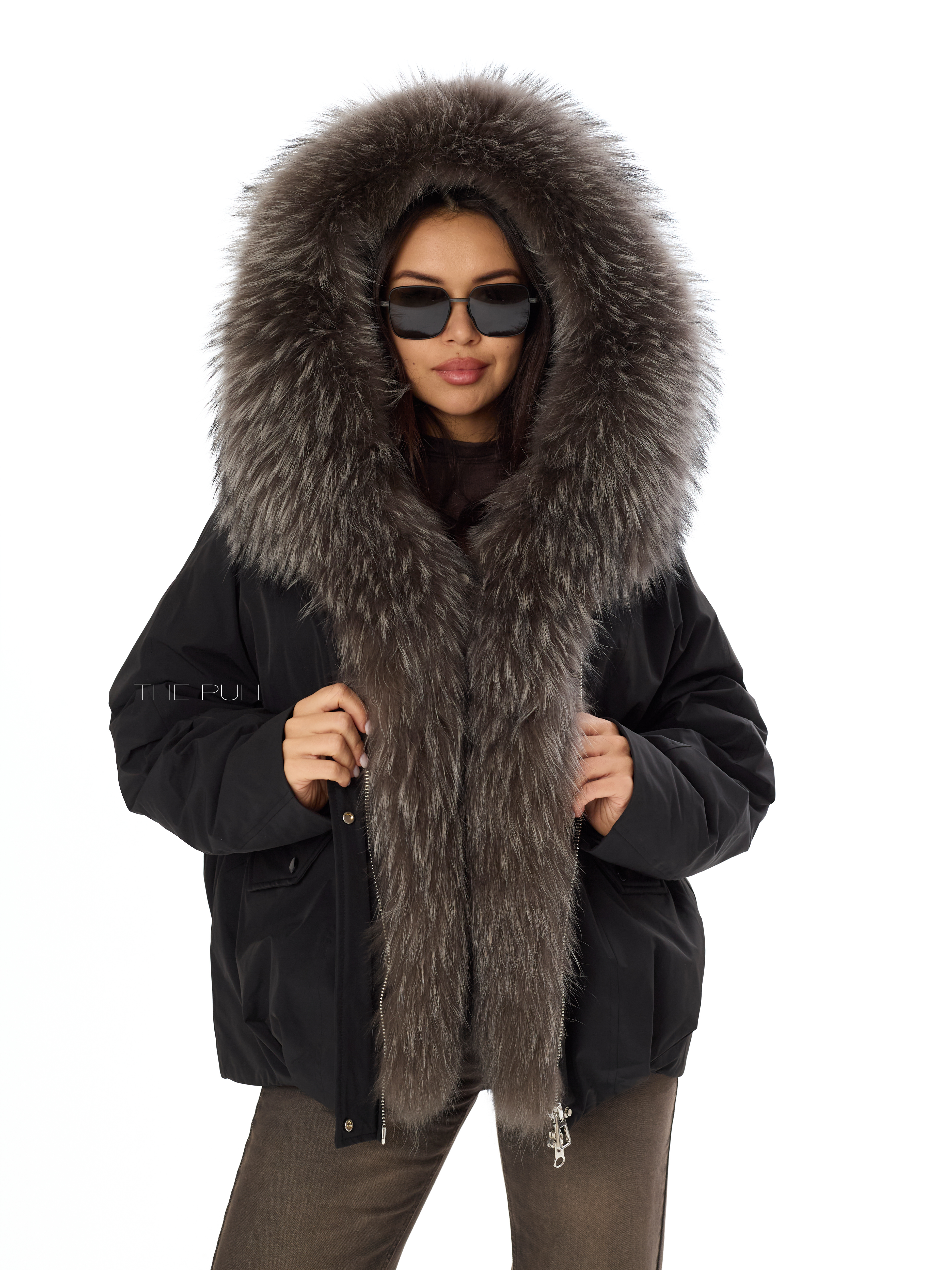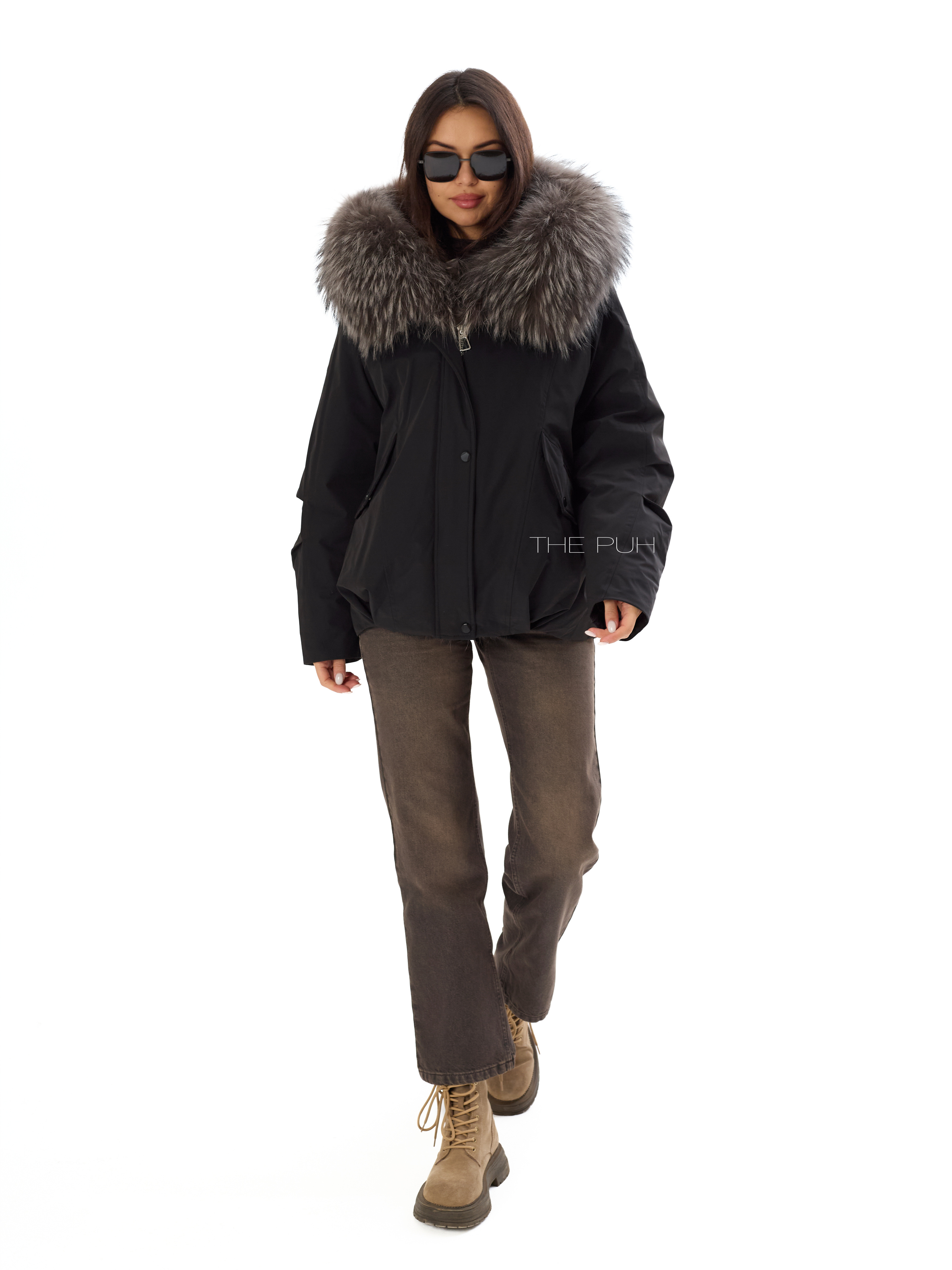 Объемная парка черного цвета, декорированная съемным воротником из меха енота. Модель утеплена натуральным гусиным пухом и отлично подойдет от первых прохладных дней поздней осени до первых заморозков.
