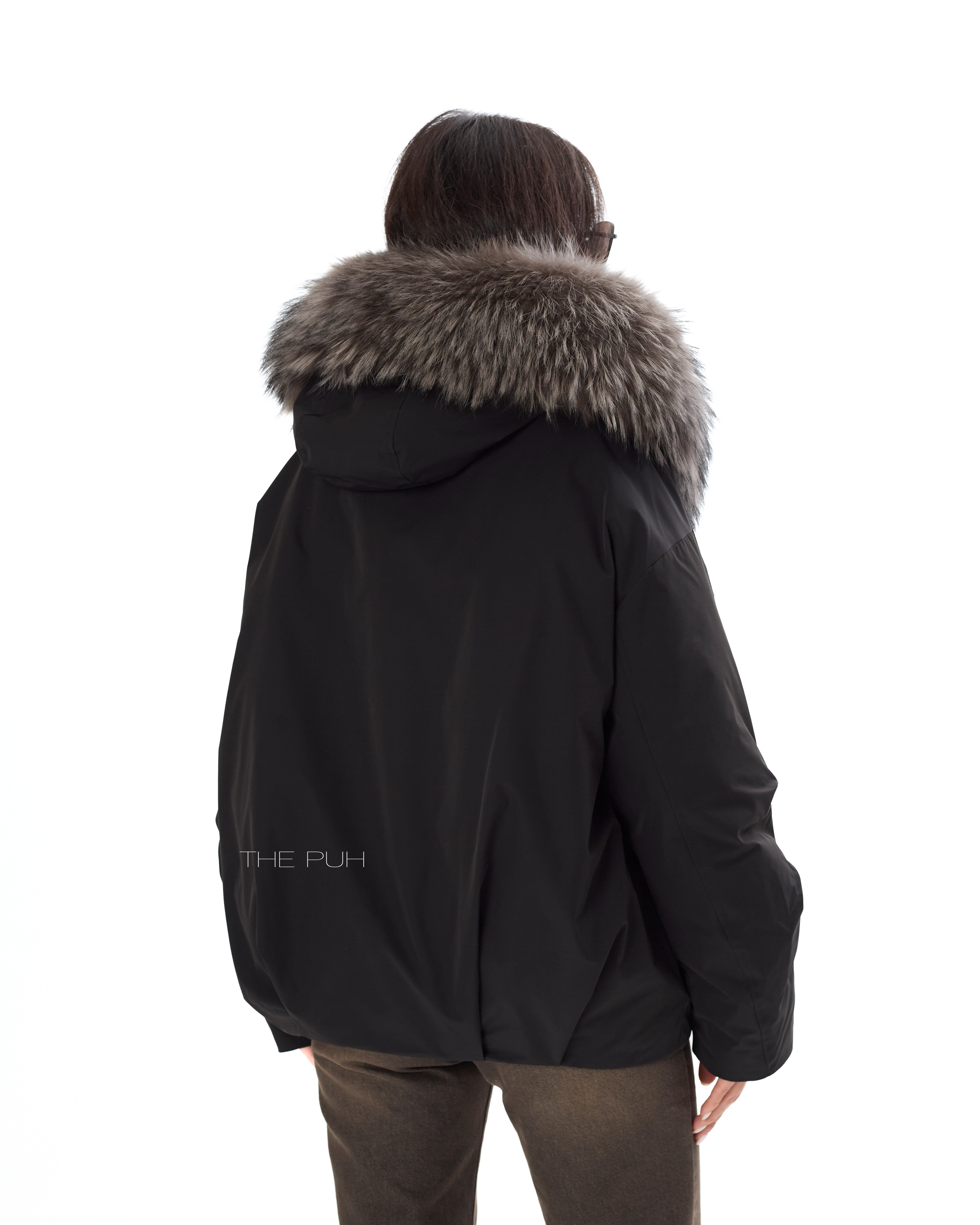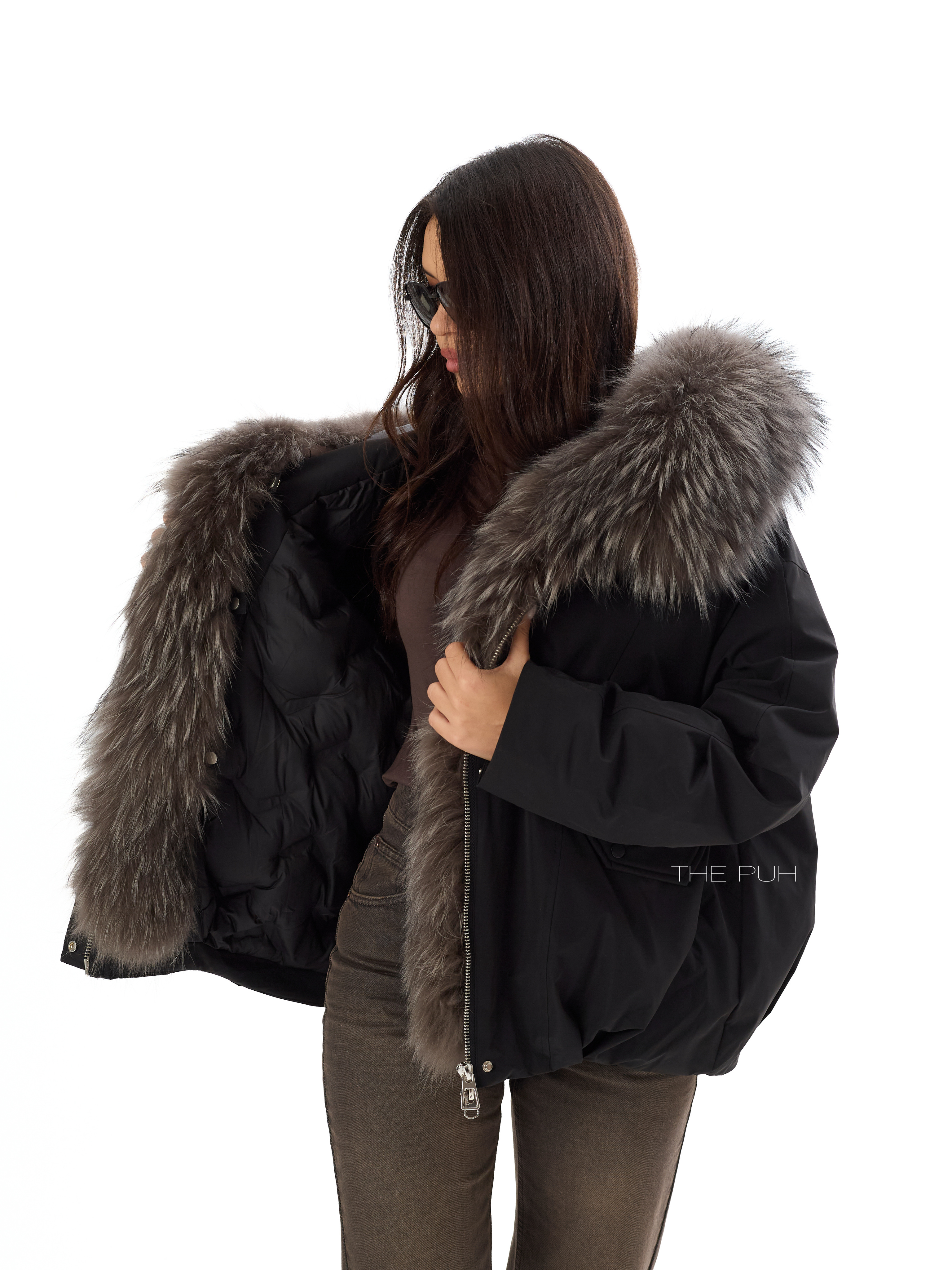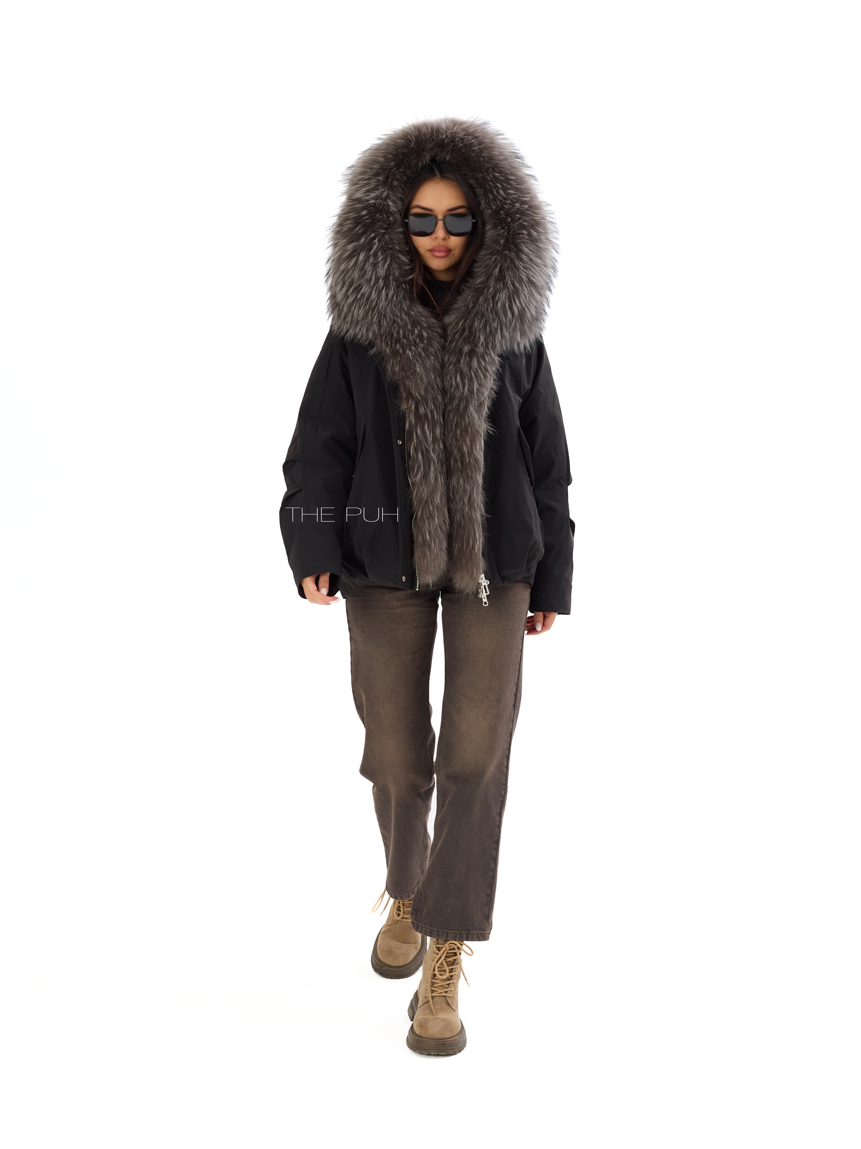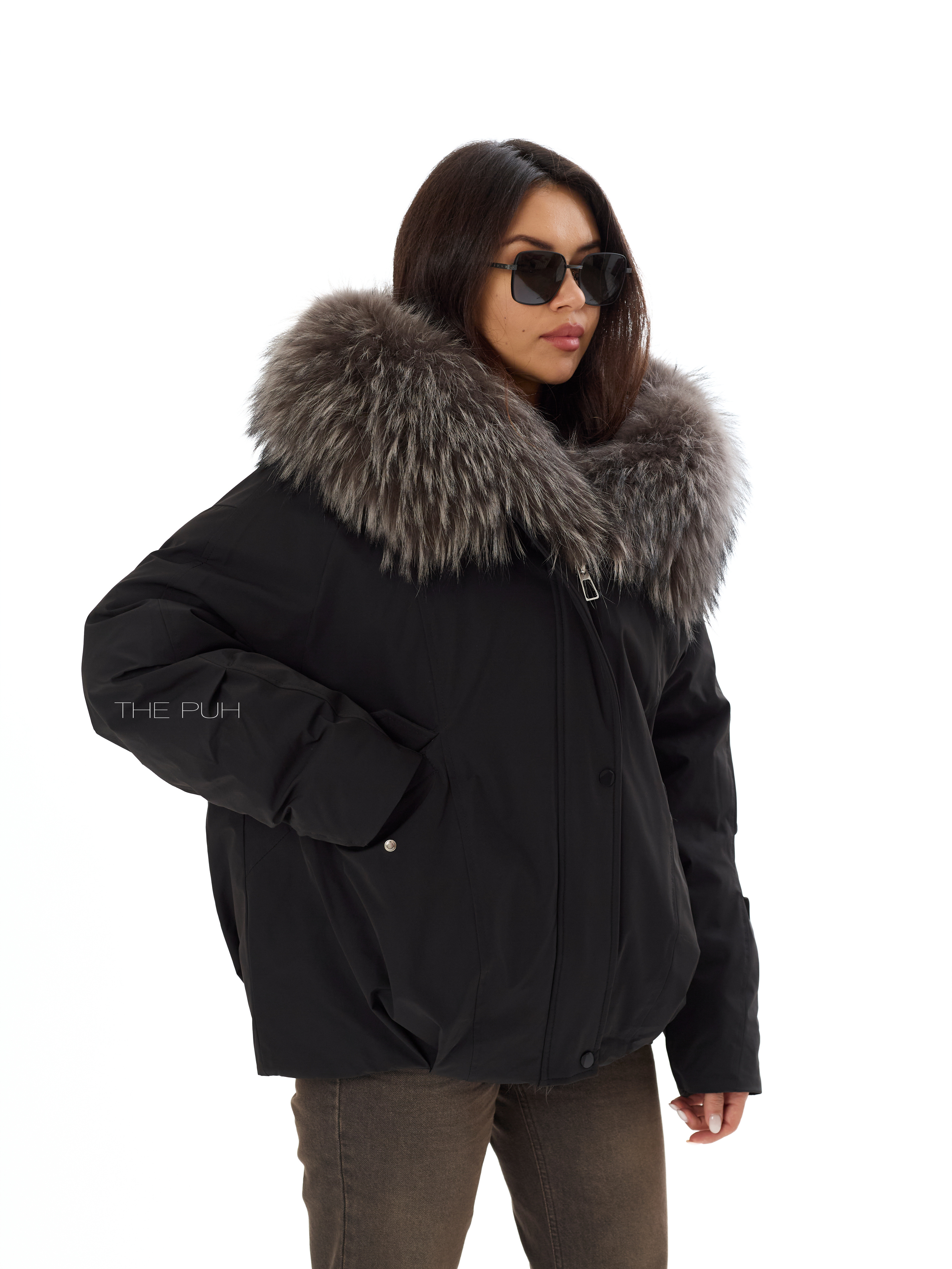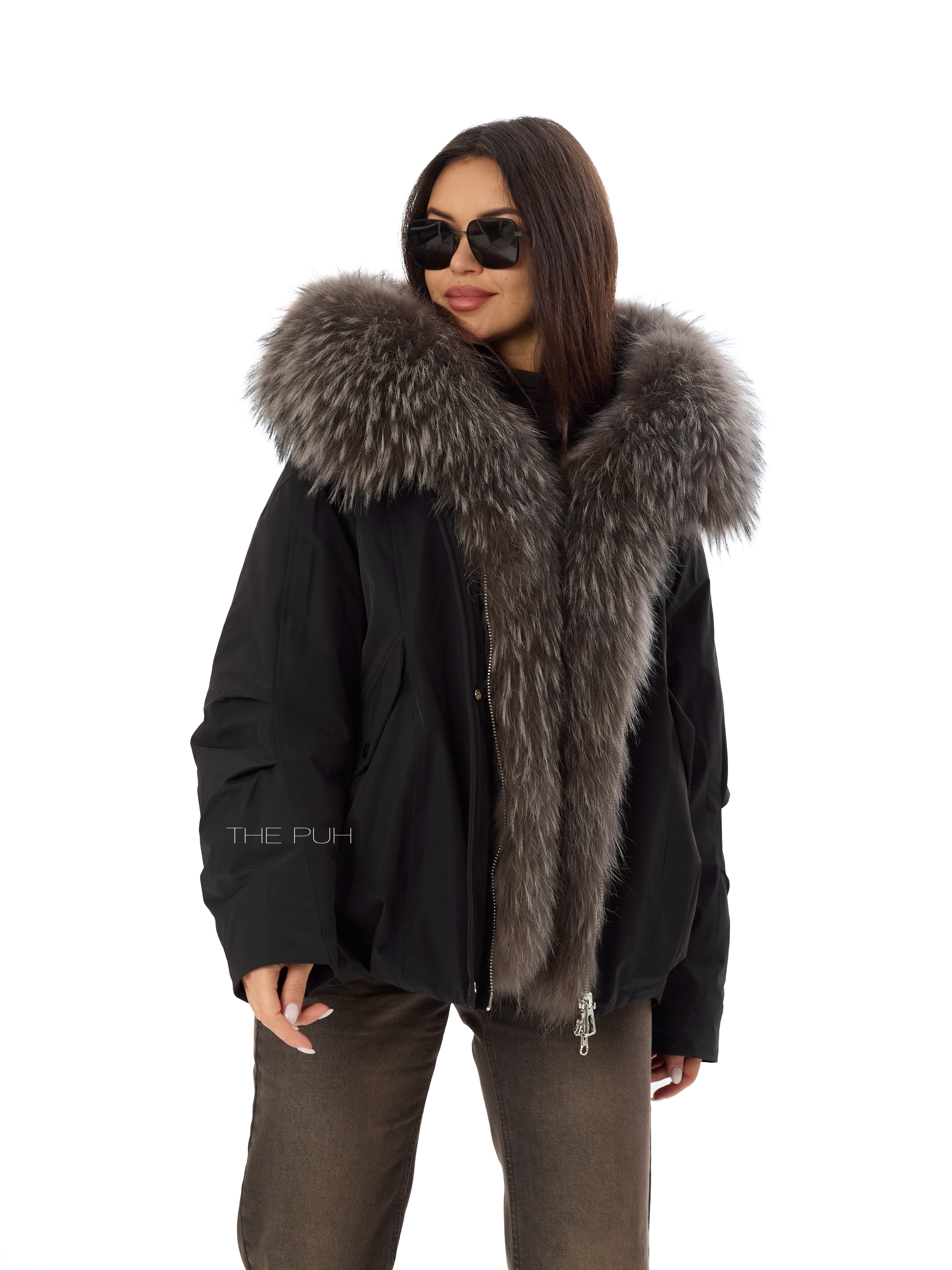 Объемная парка черного цвета, декорированная съемным воротником из меха енота. Модель утеплена натуральным гусиным пухом и отлично подойдет от первых прохладных дней поздней осени до первых заморозков.