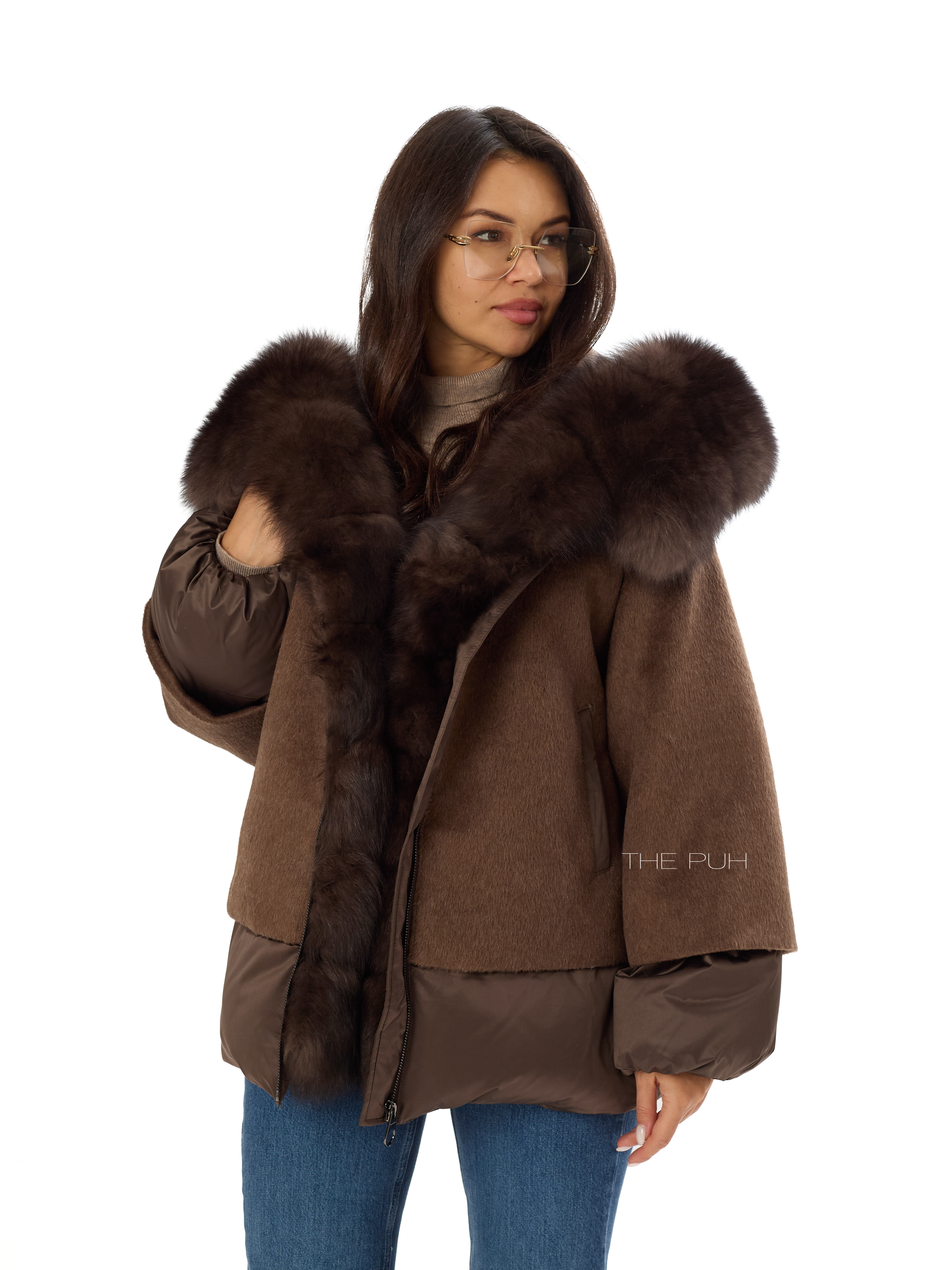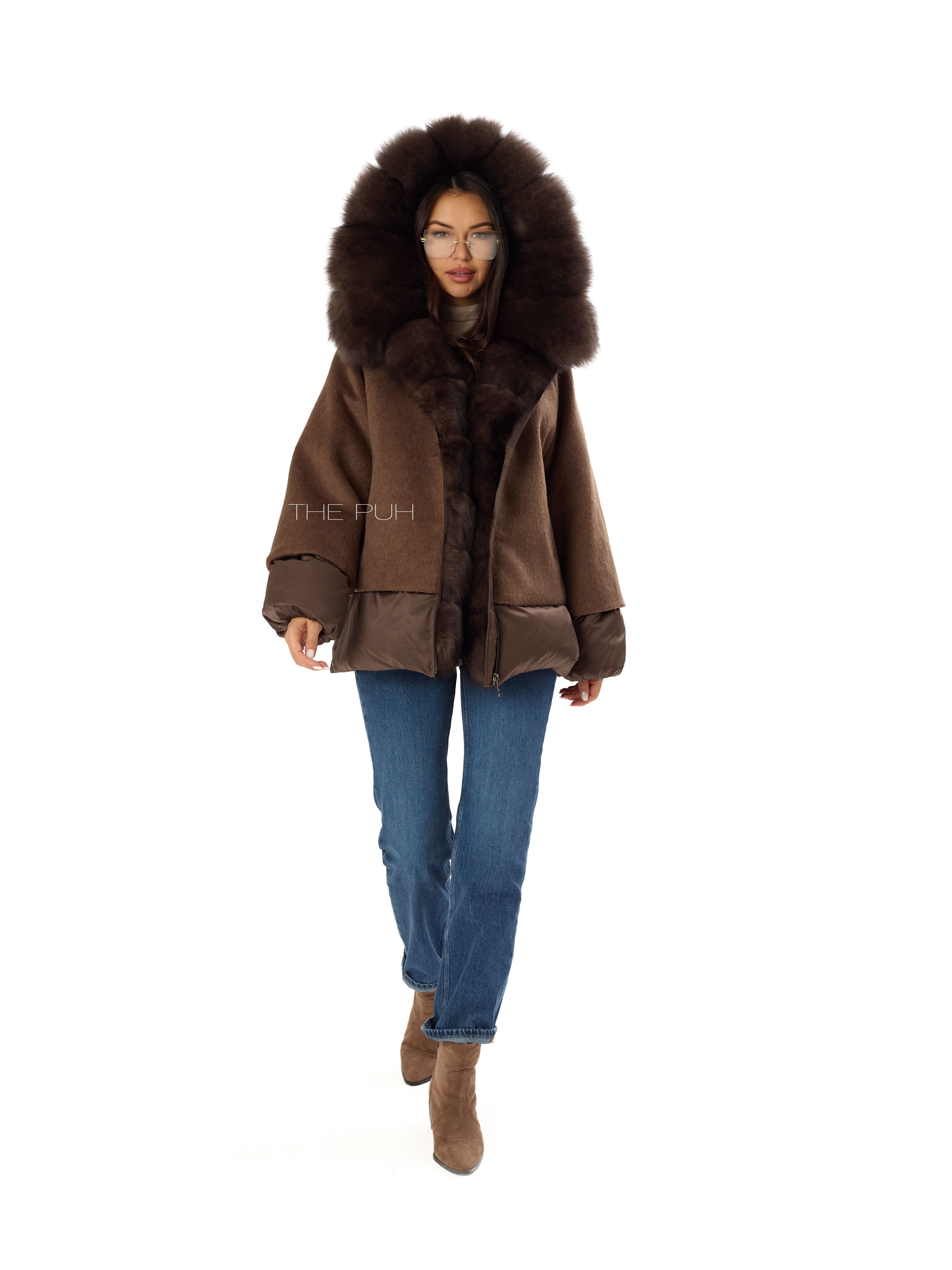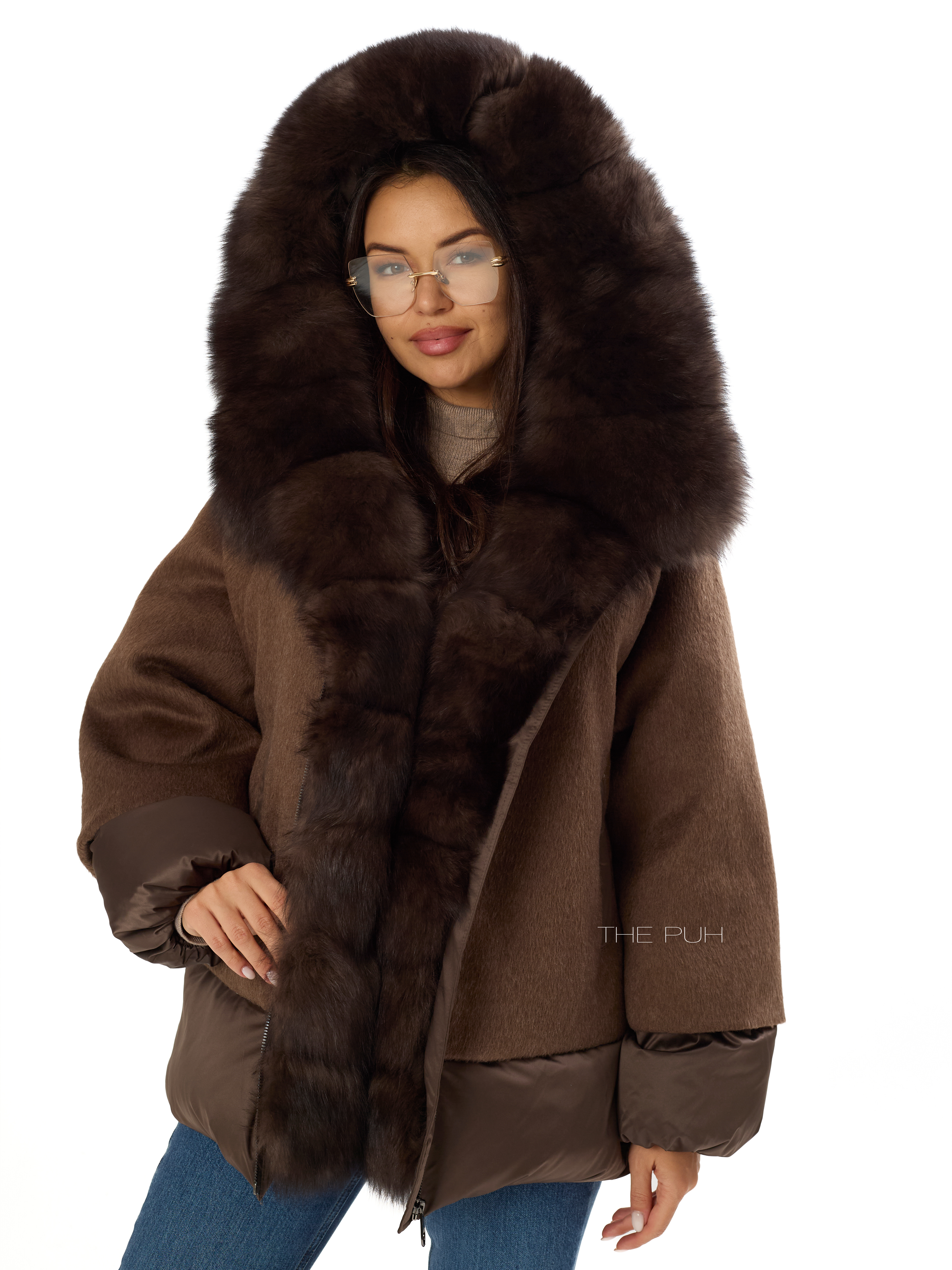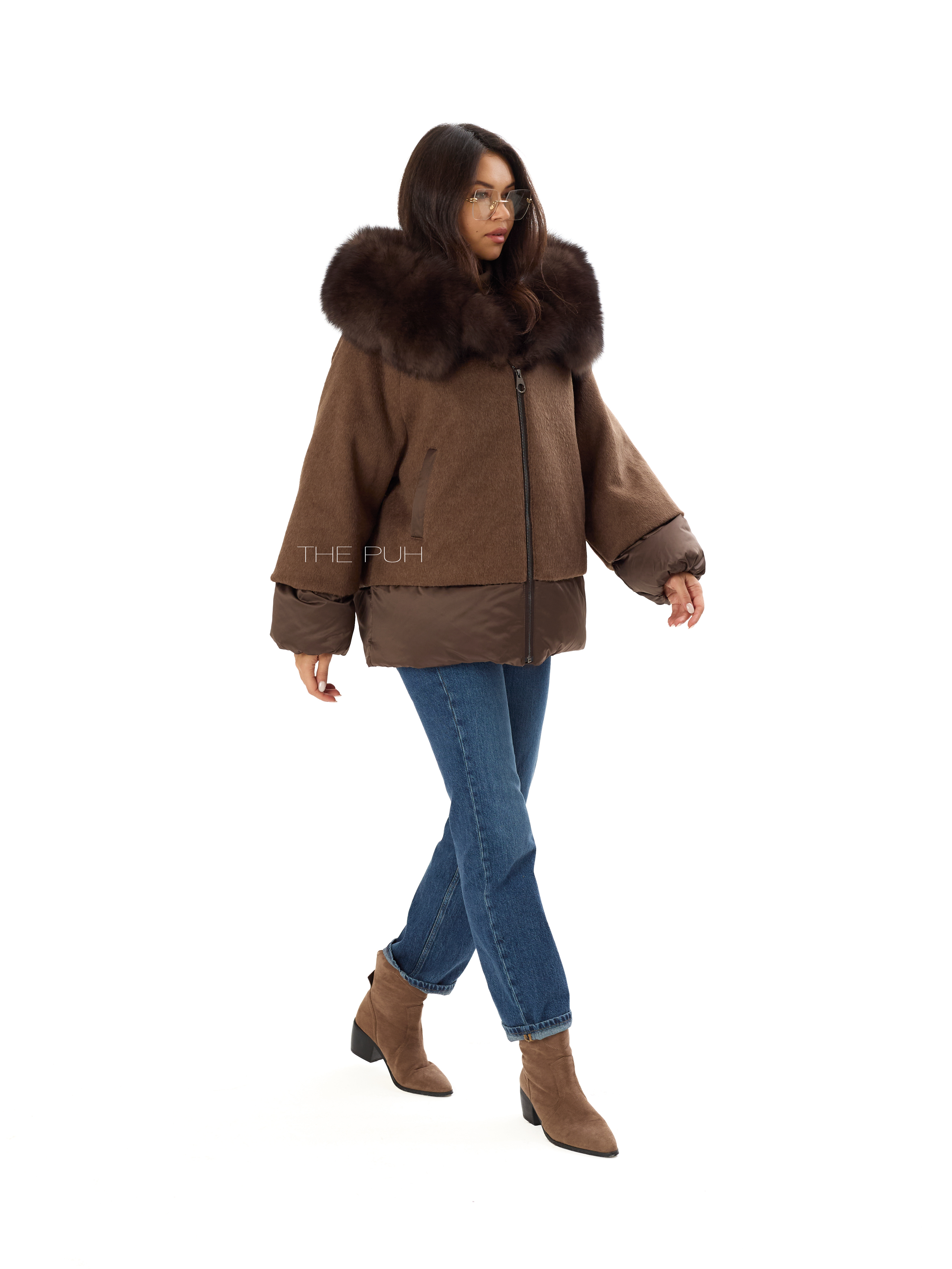 Объемный шоколадный пуховик выполнен из комбинированных материалов и дополнен съемной оторочкой из меха песца на полочках и капюшоне. Модель прямого свободного кроя с кулиской по низу.