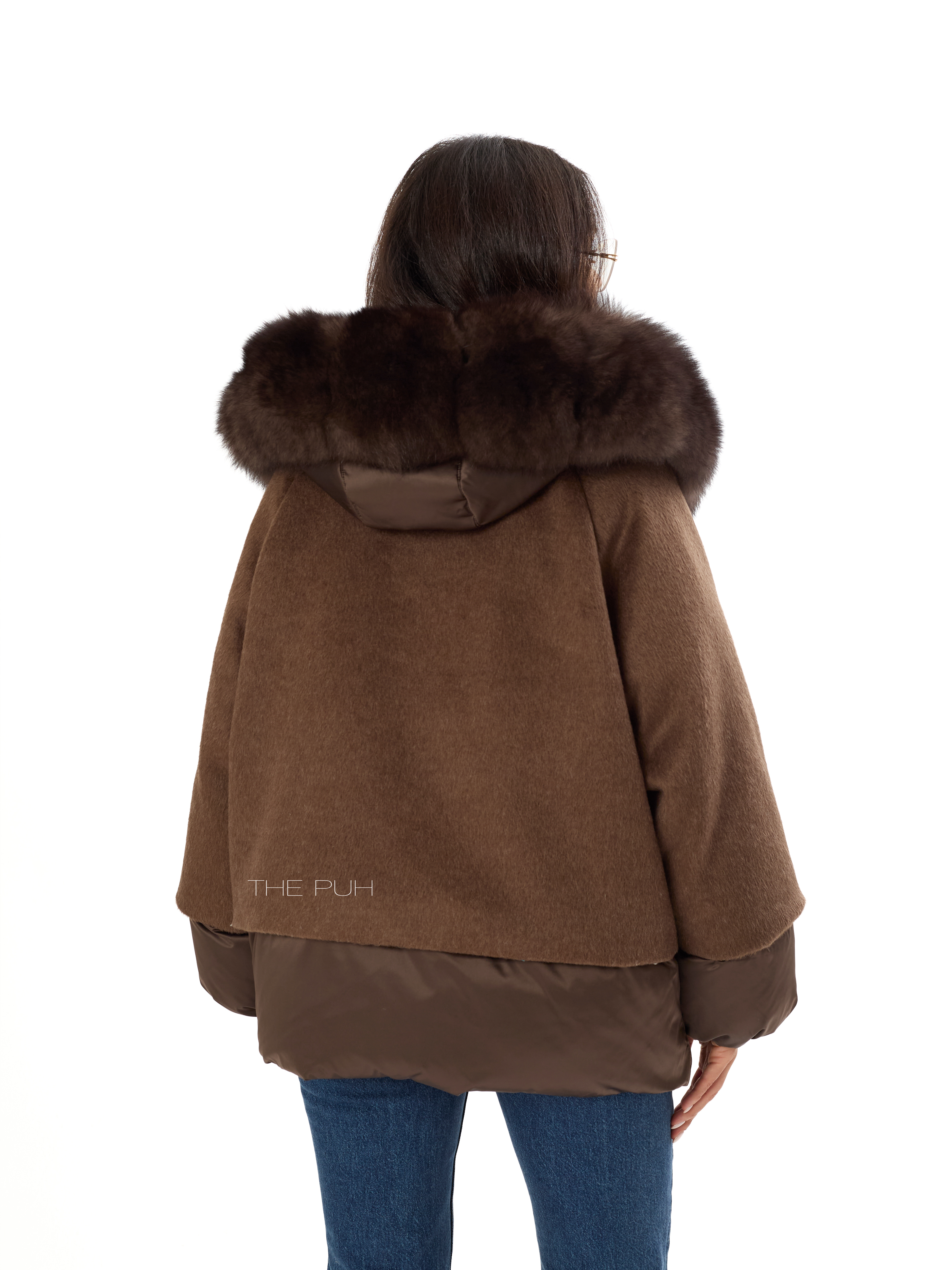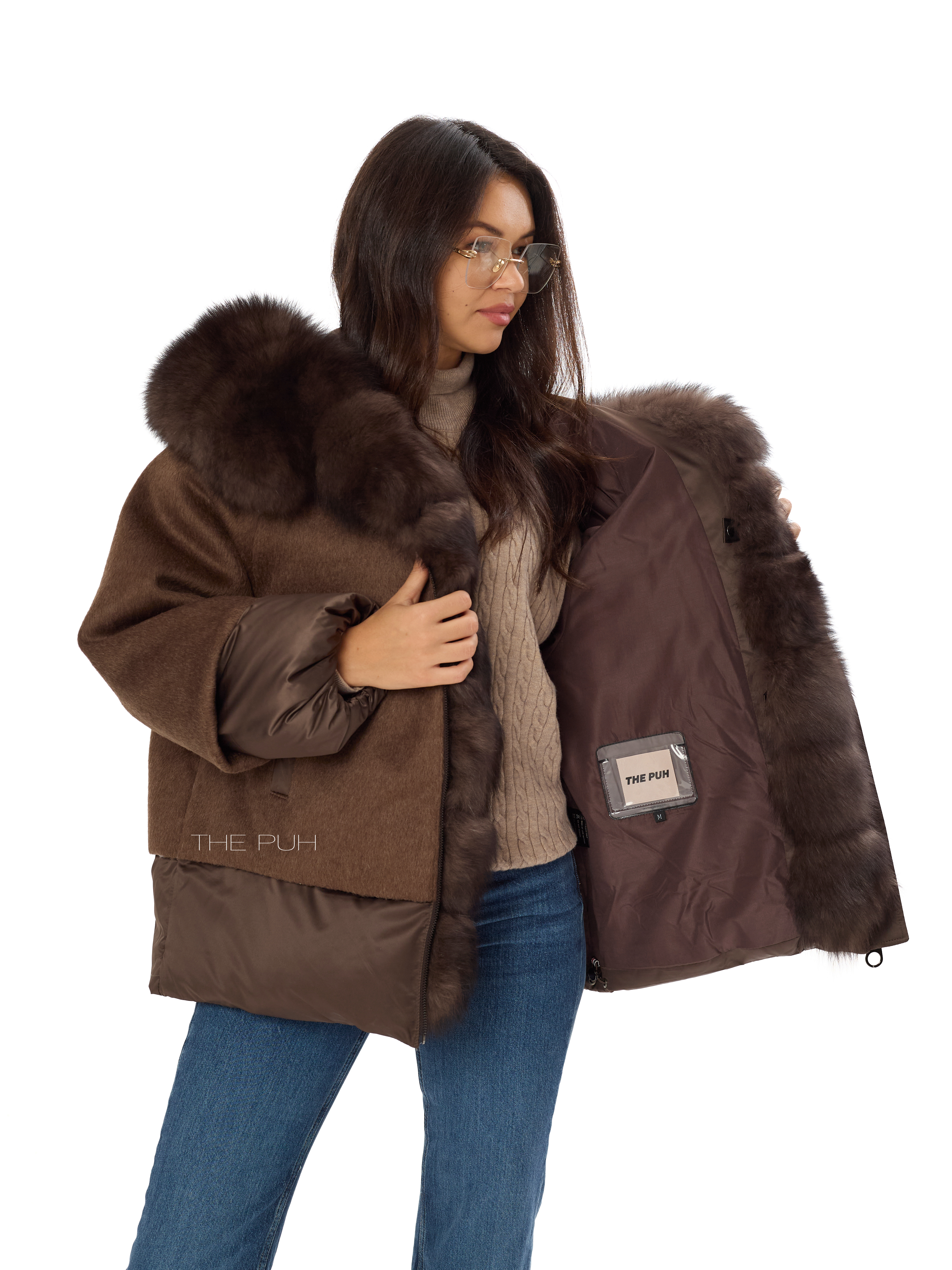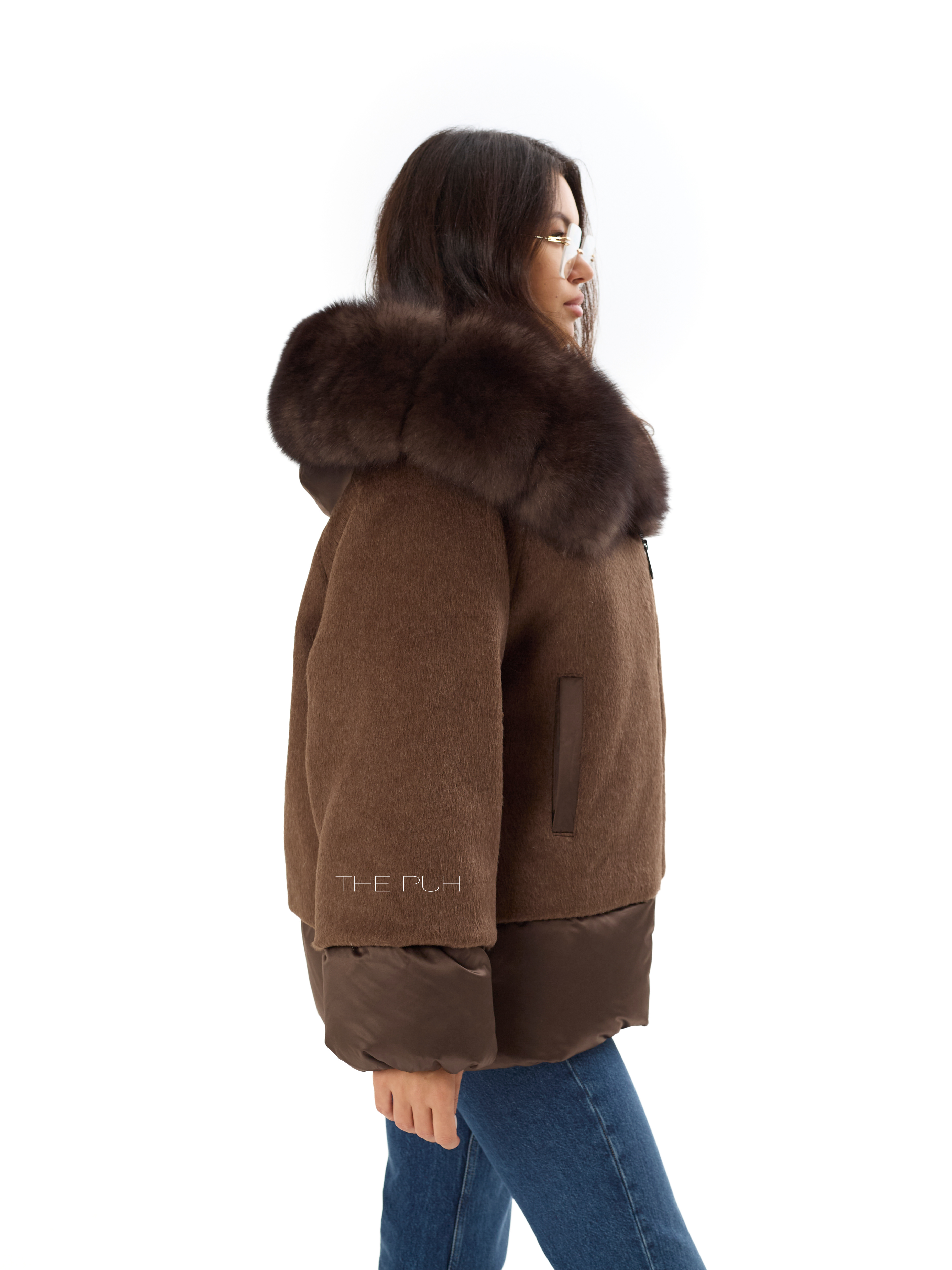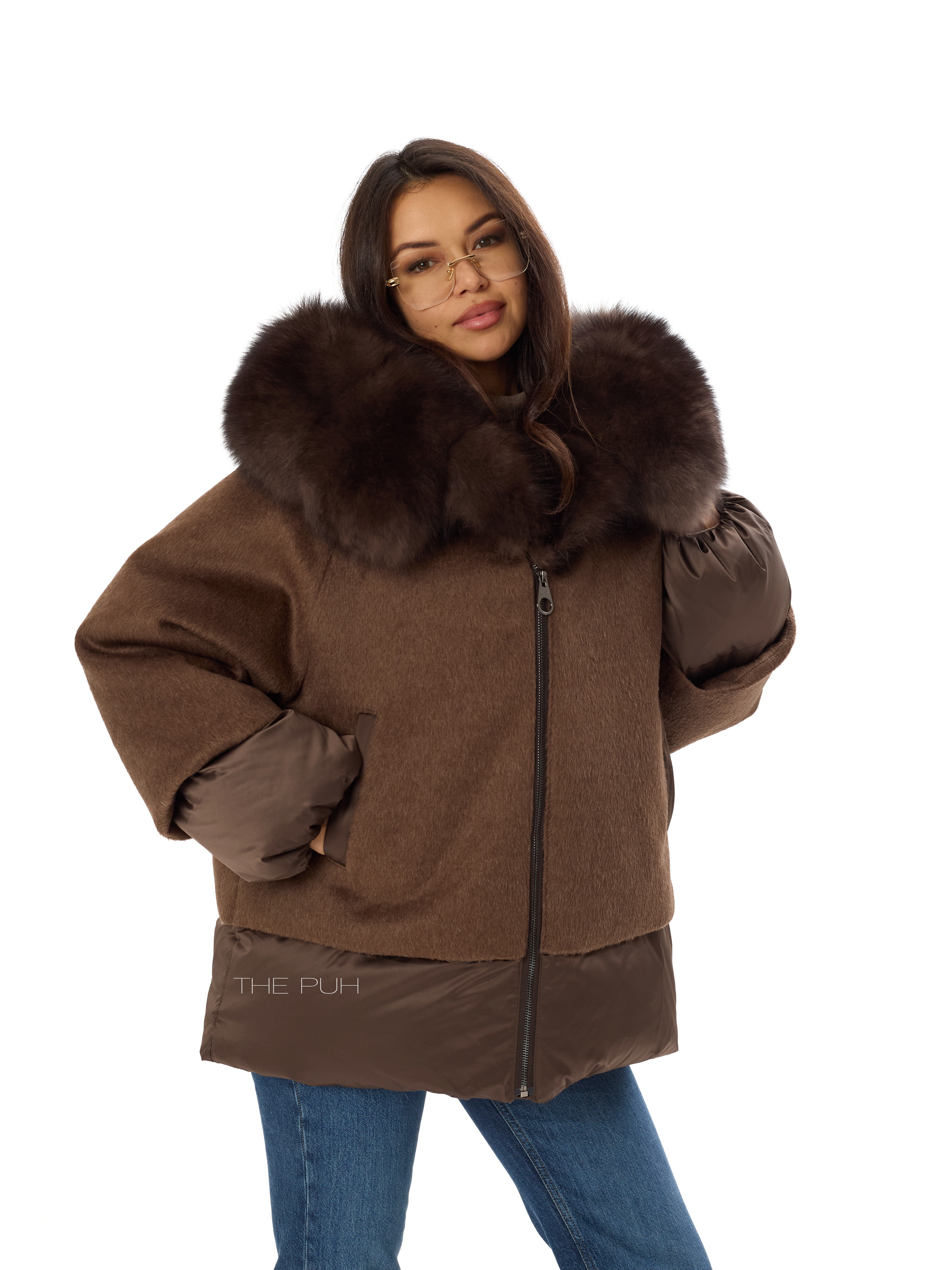 Объемный шоколадный пуховик выполнен из комбинированных материалов и дополнен съемной оторочкой из меха песца на полочках и капюшоне. Модель прямого свободного кроя с кулиской по низу.