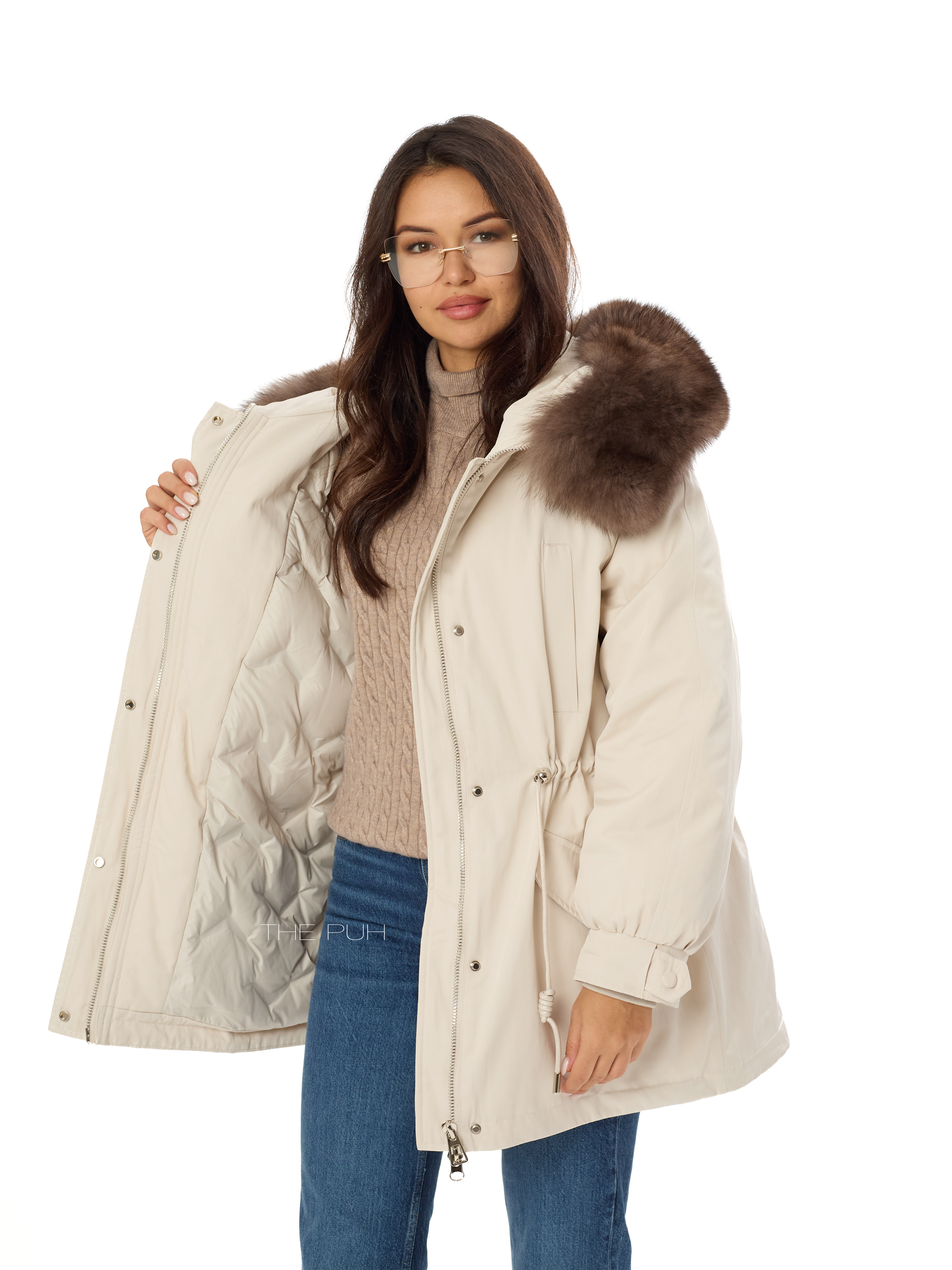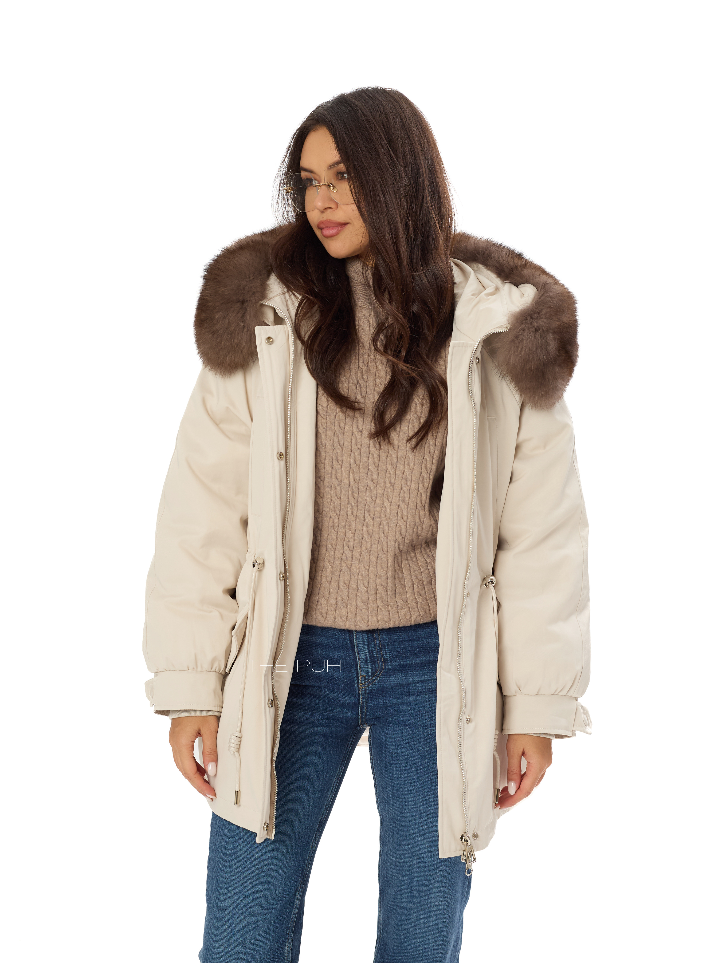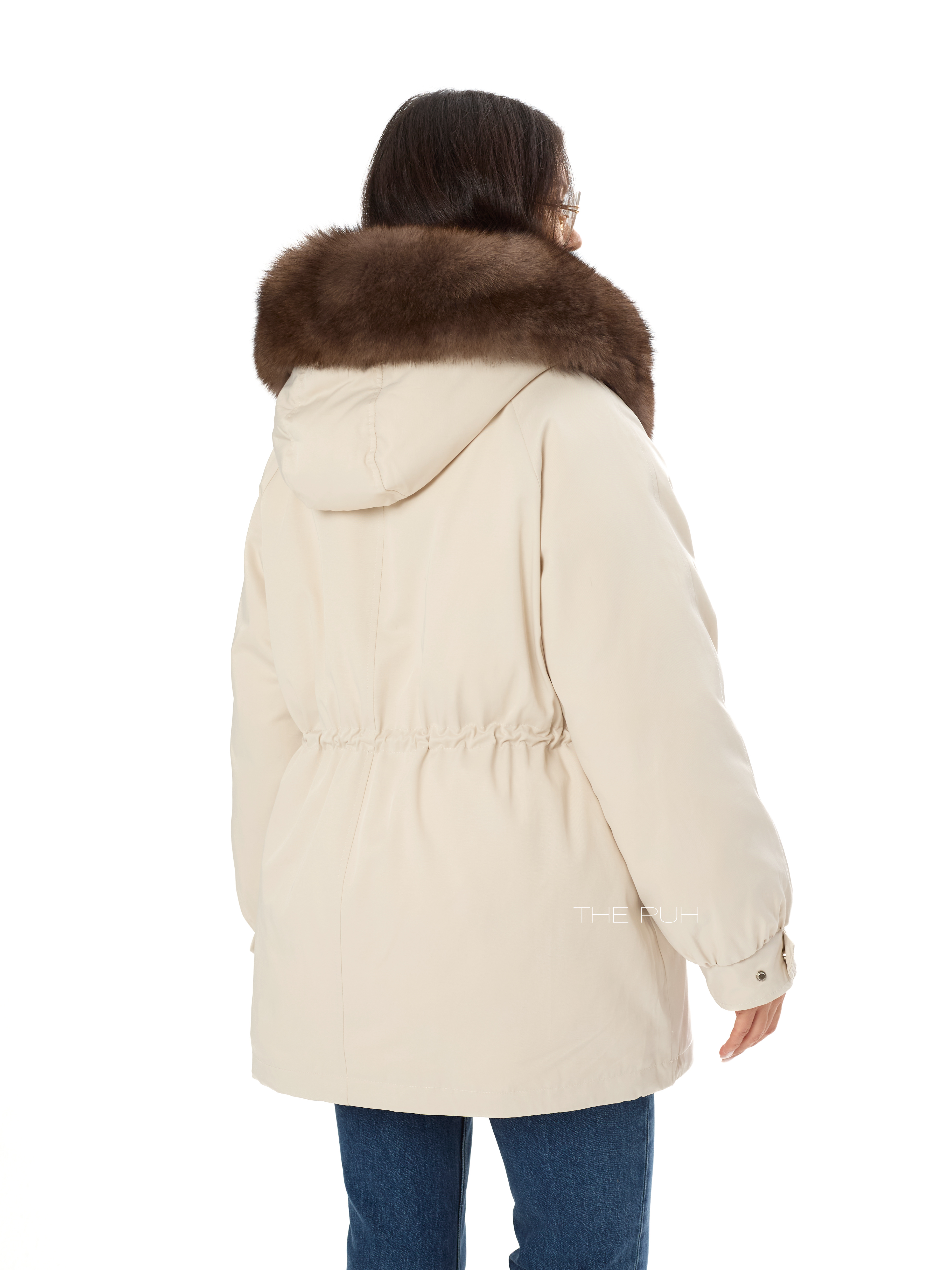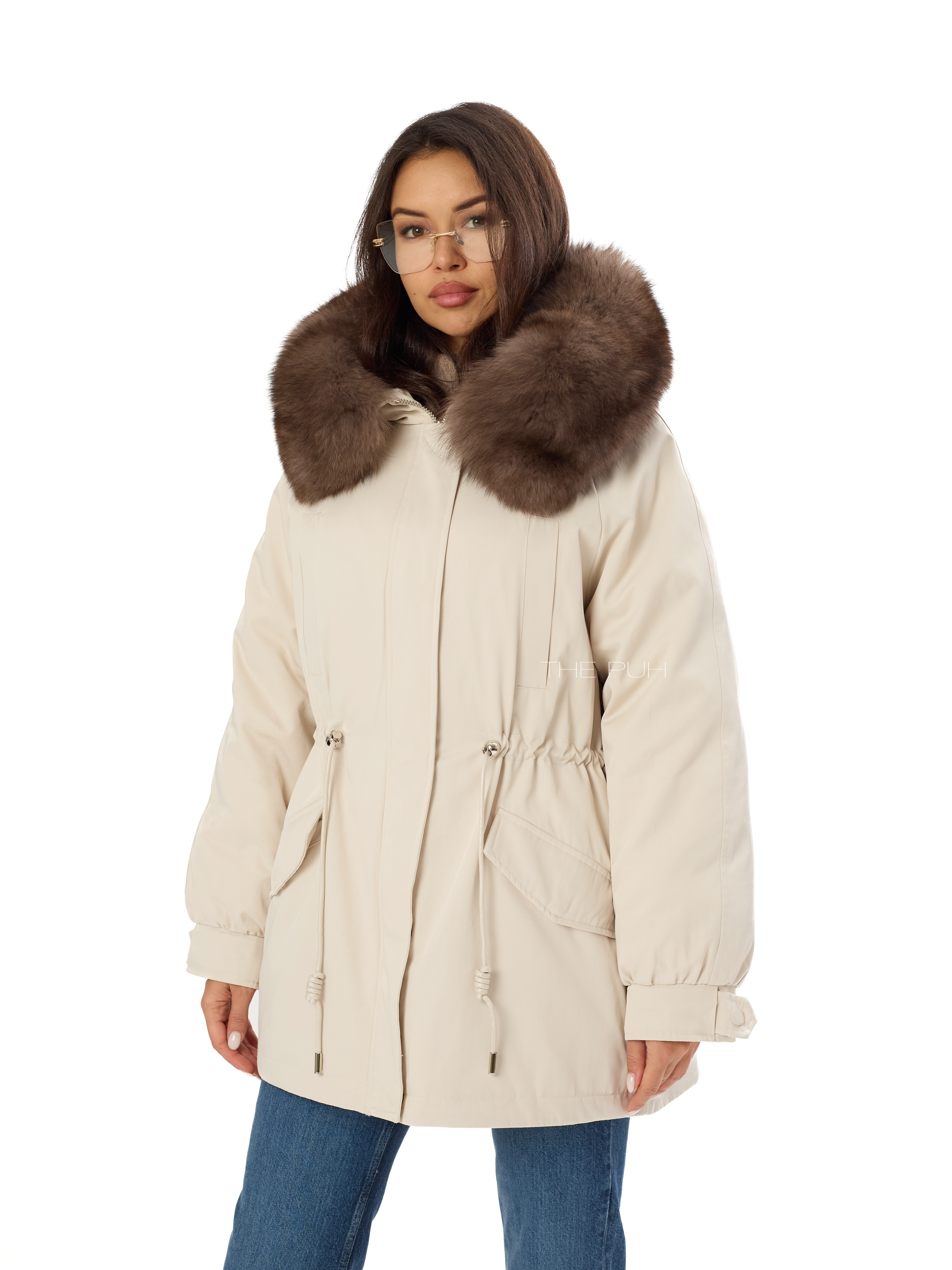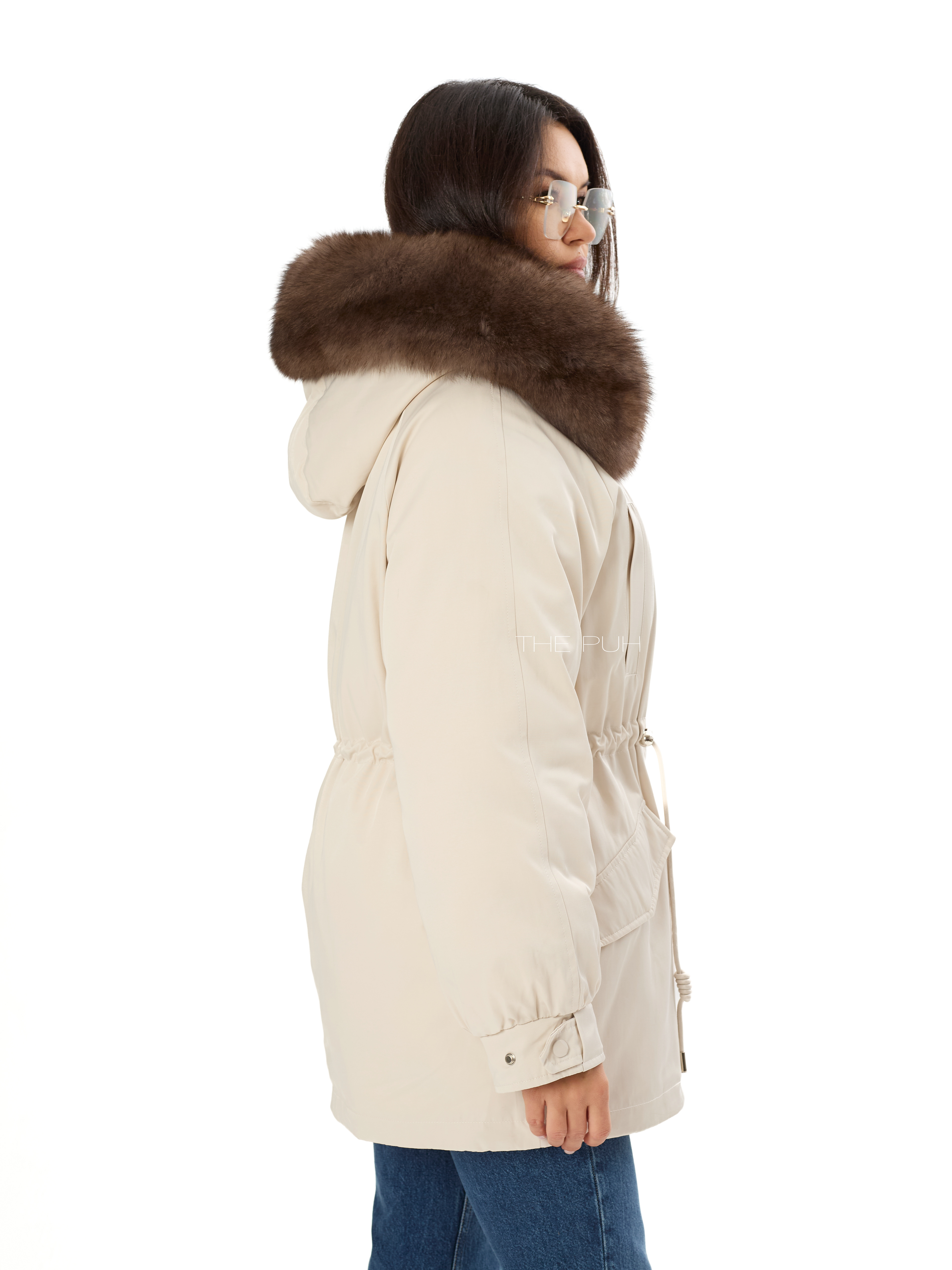 Молочная пуховая парка средней длины с оторочкой из меха песца на капюшоне. Модель с кулиской на талии позволяет контролировать прилегание и менять силуэт по желанию. Съемный мех защитит от ветра и осадков.