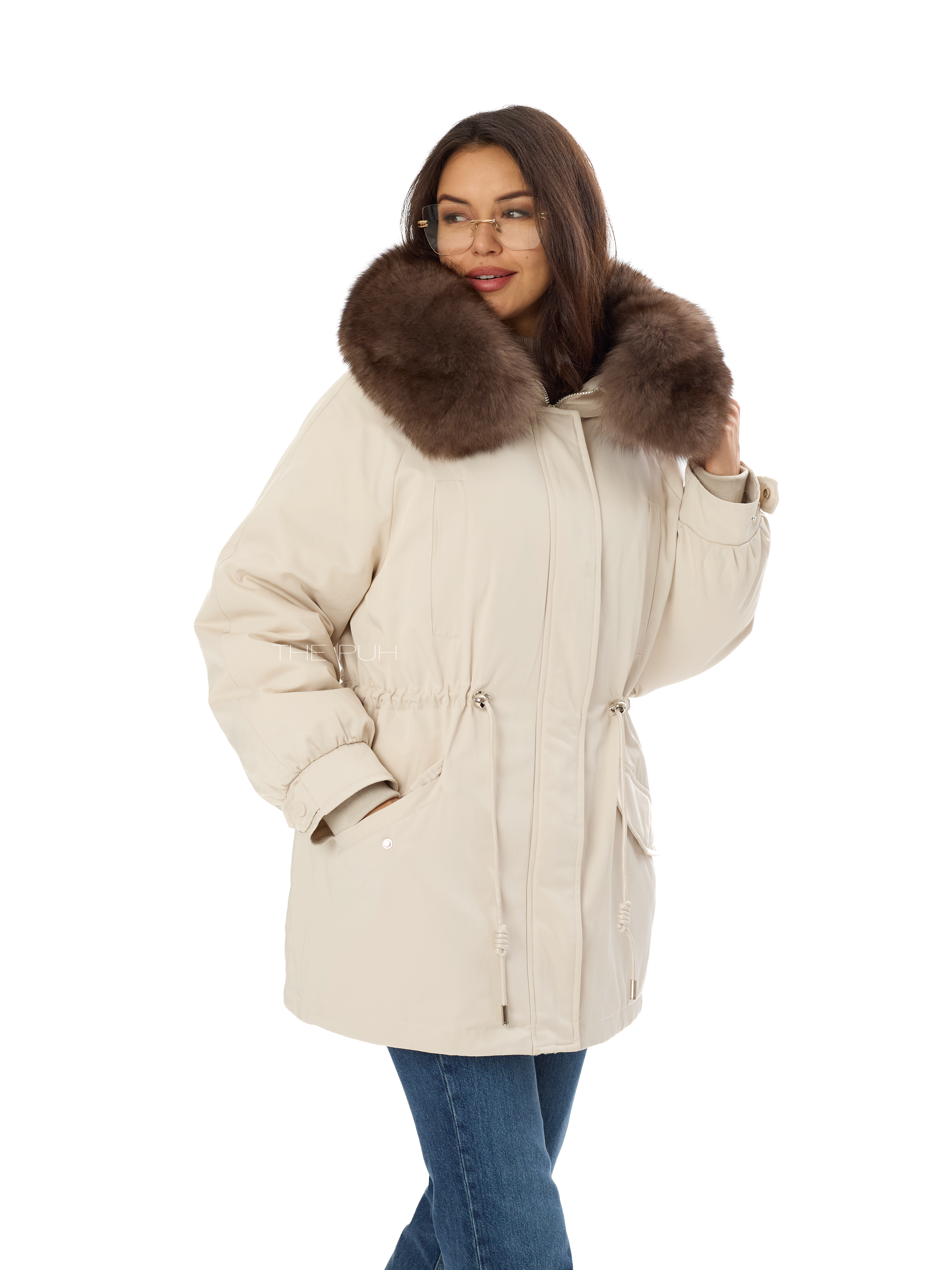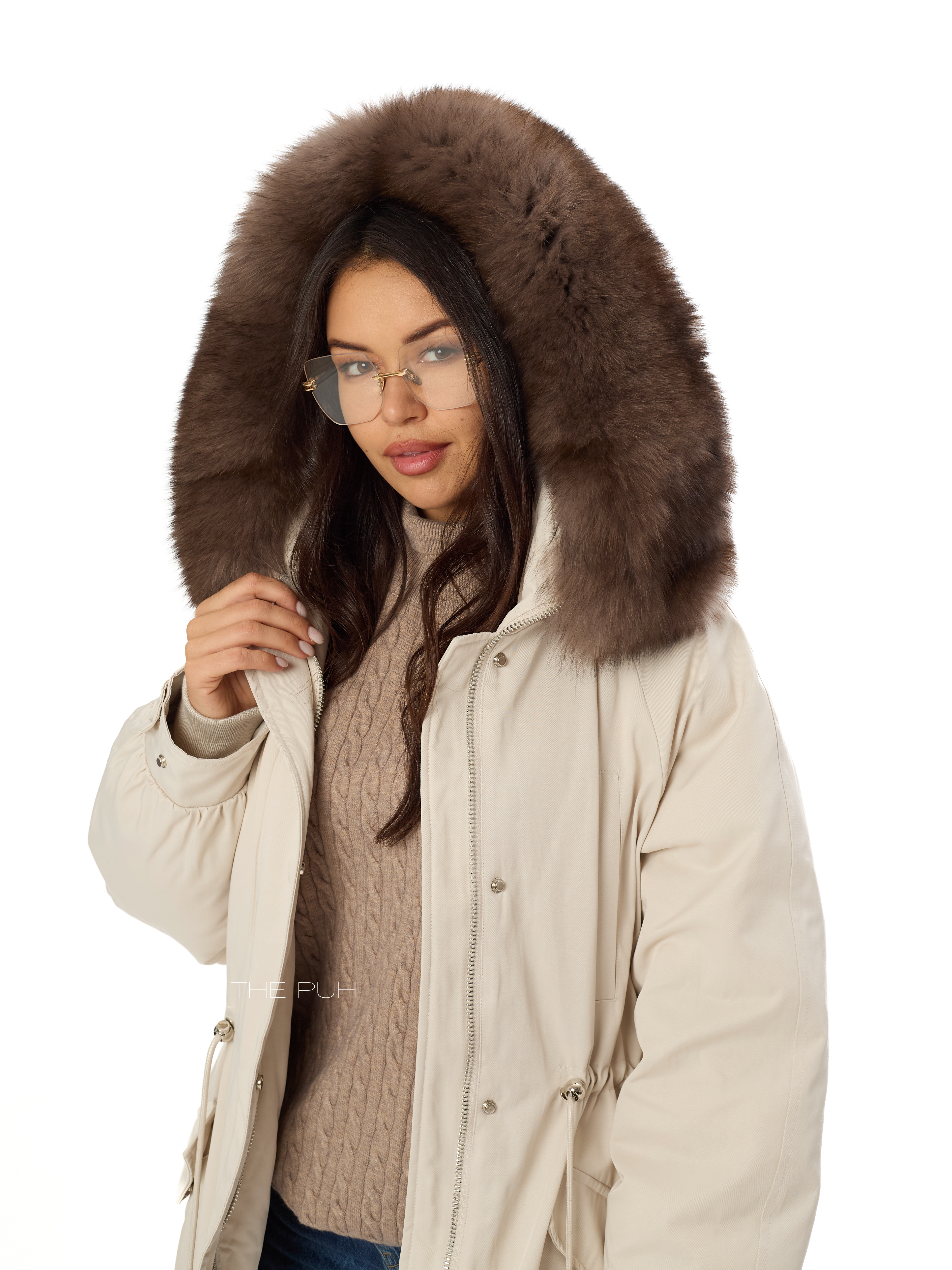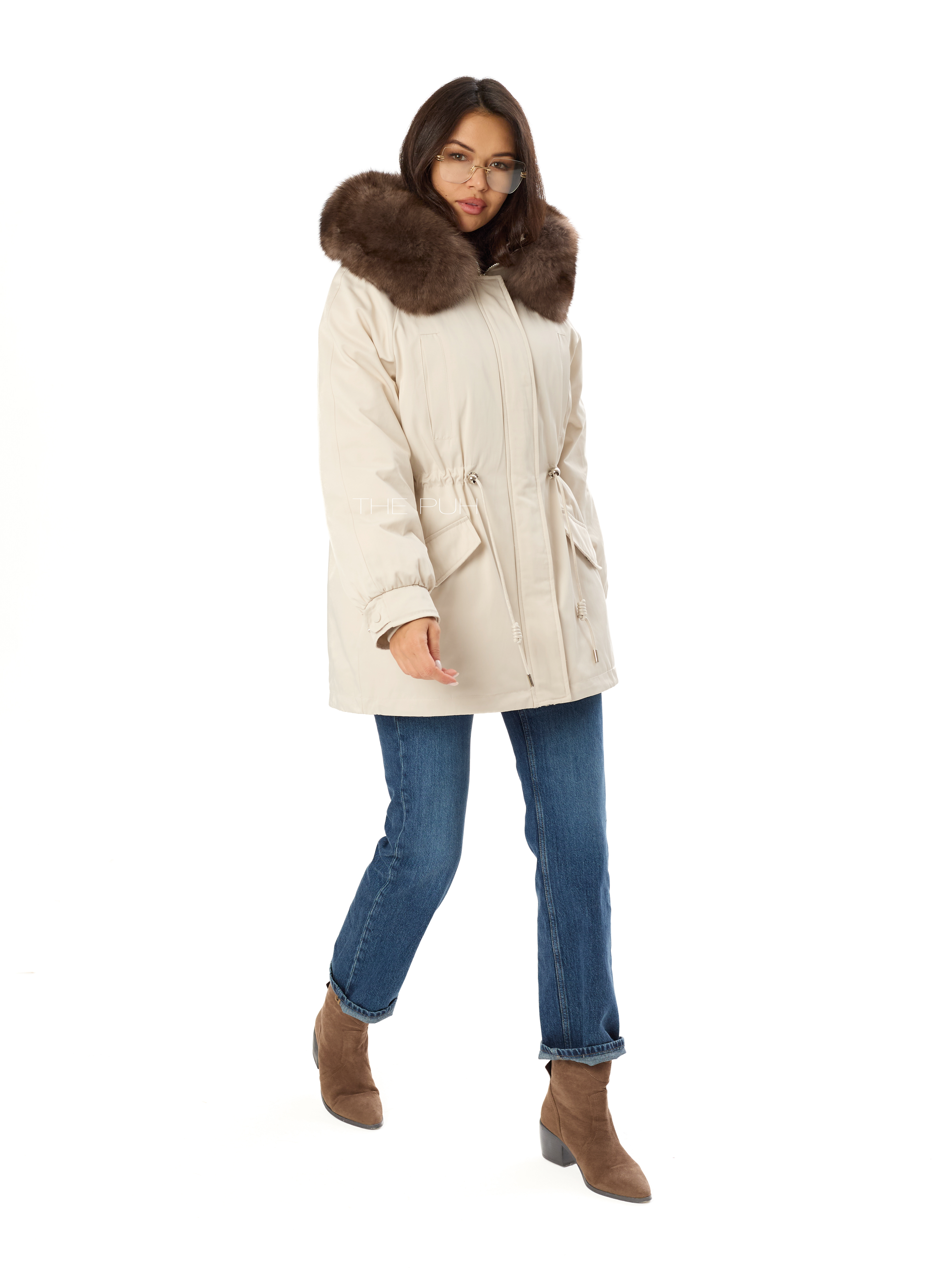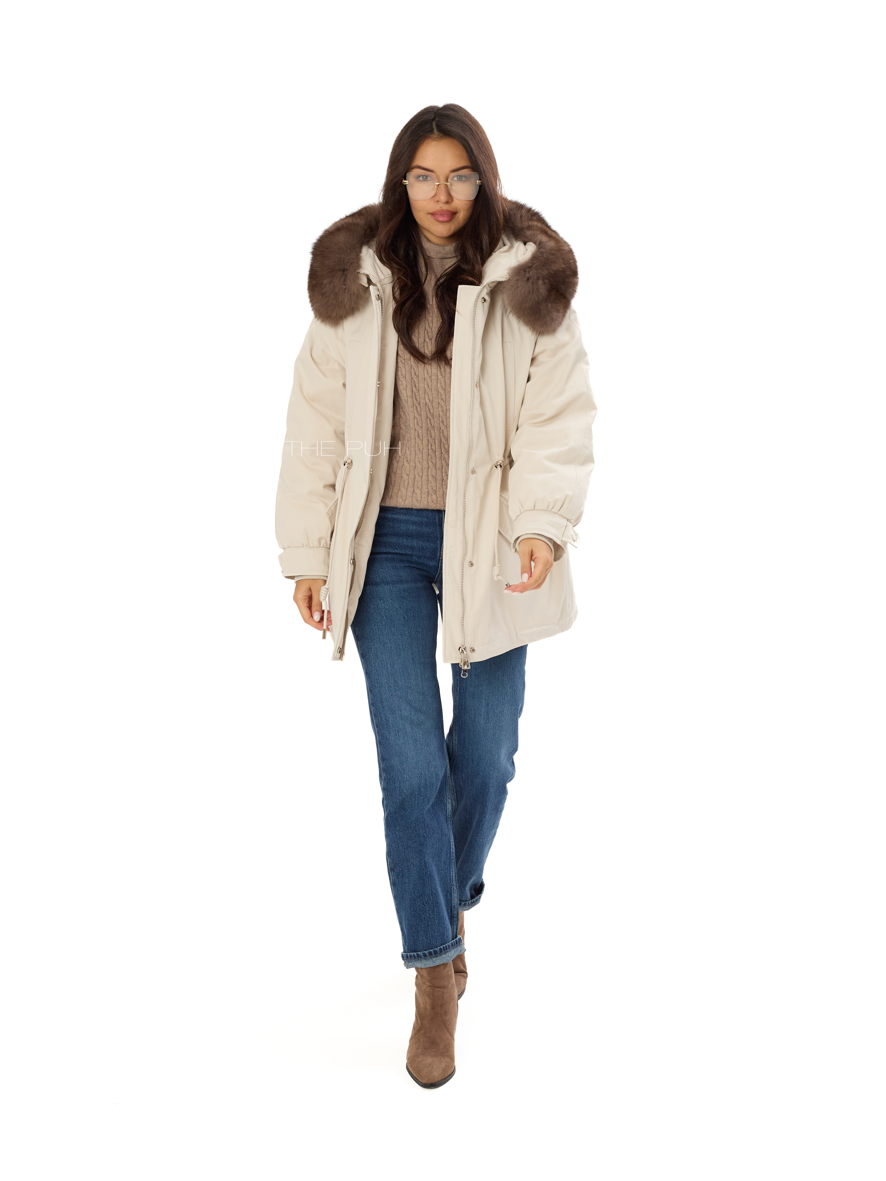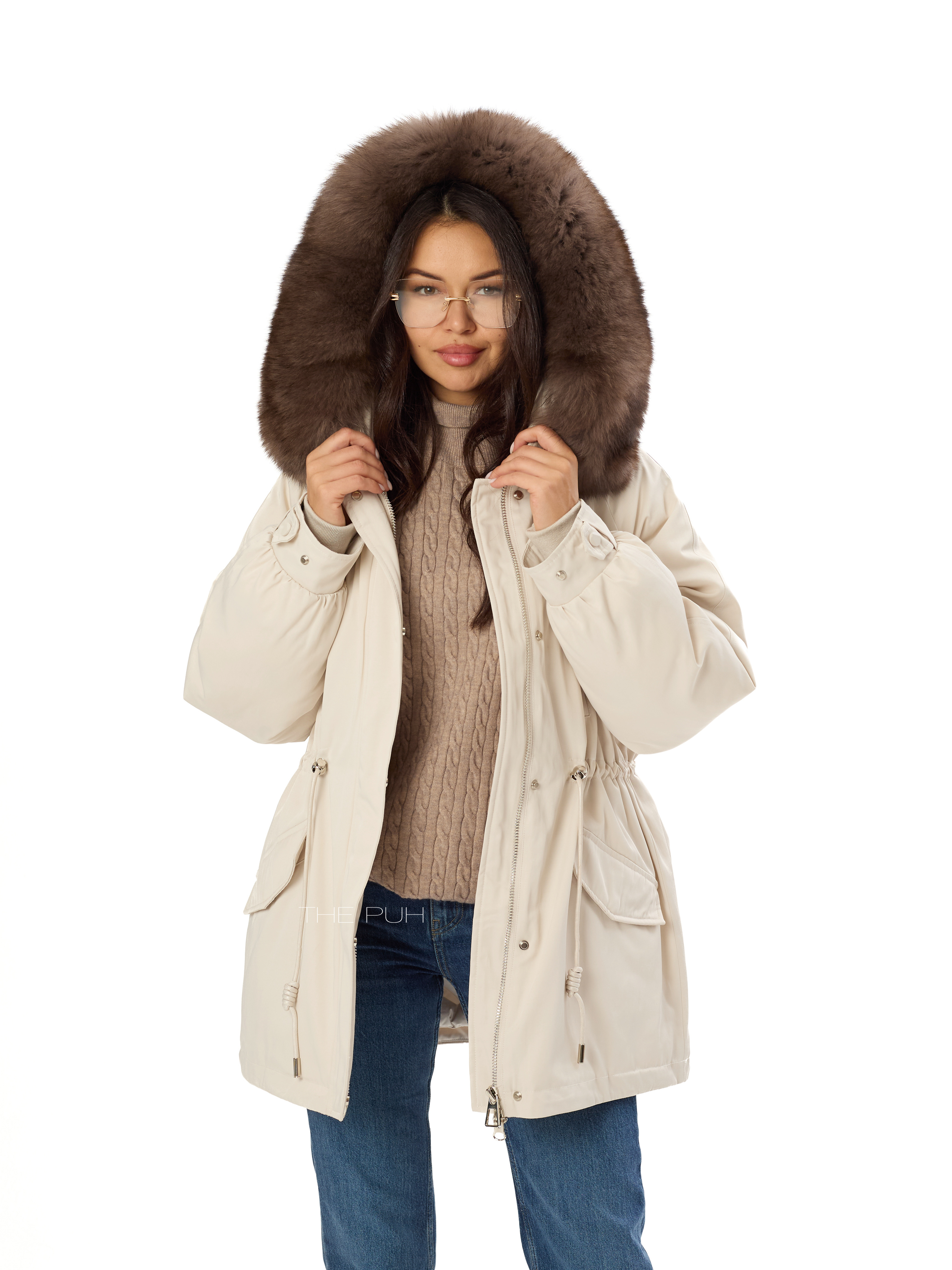 Молочная пуховая парка средней длины с оторочкой из меха песца на капюшоне. Модель с кулиской на талии позволяет контролировать прилегание и менять силуэт по желанию. Съемный мех защитит от ветра и осадков.