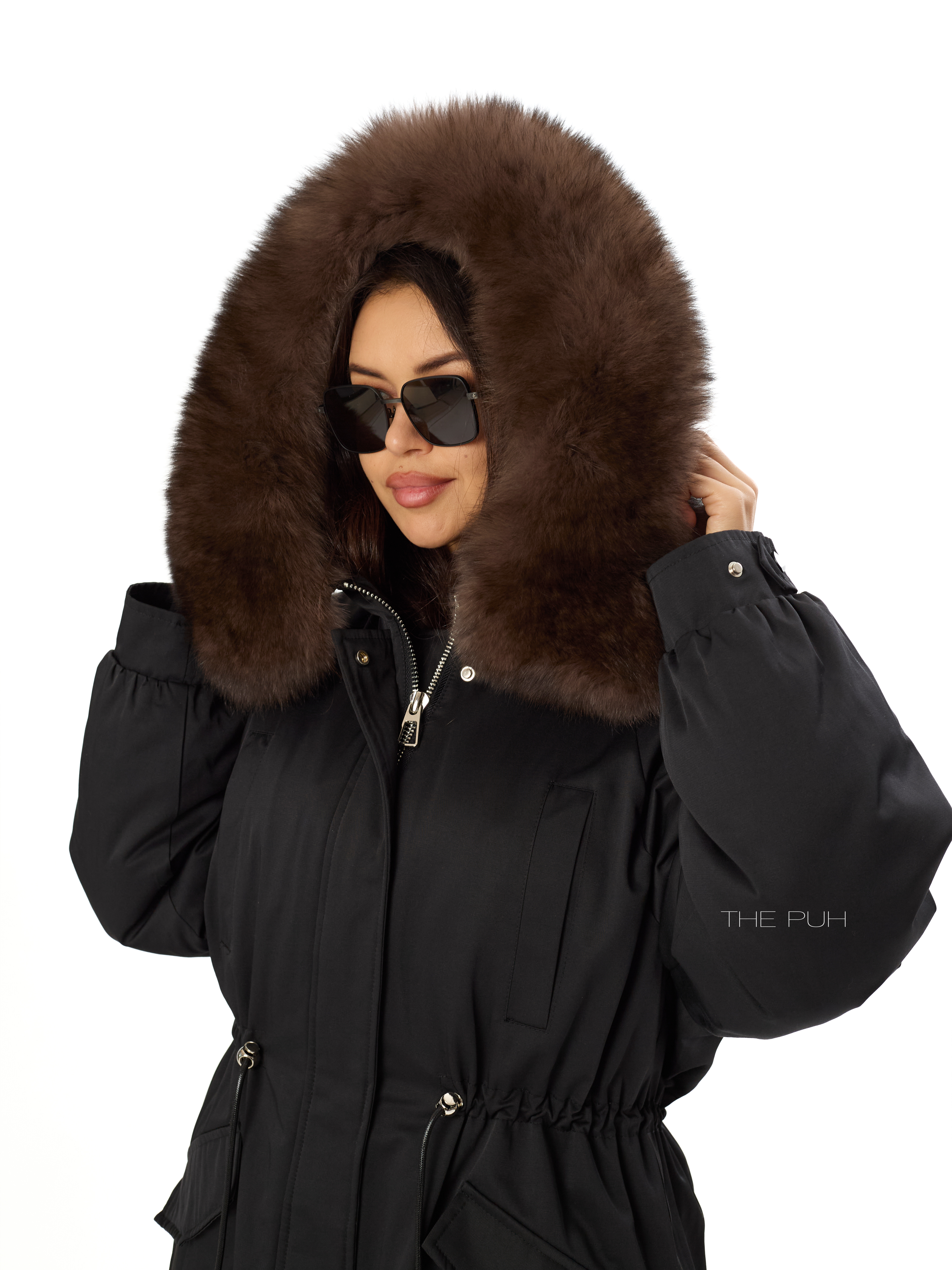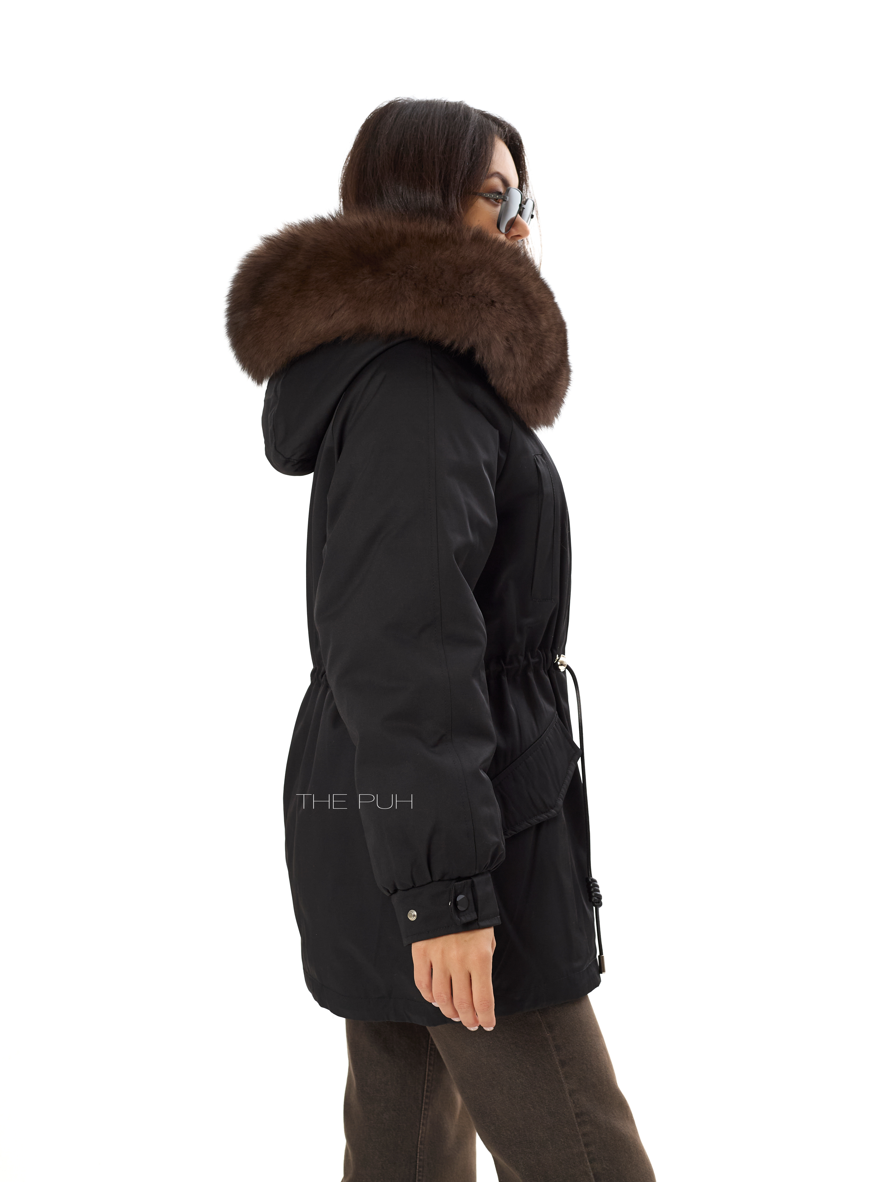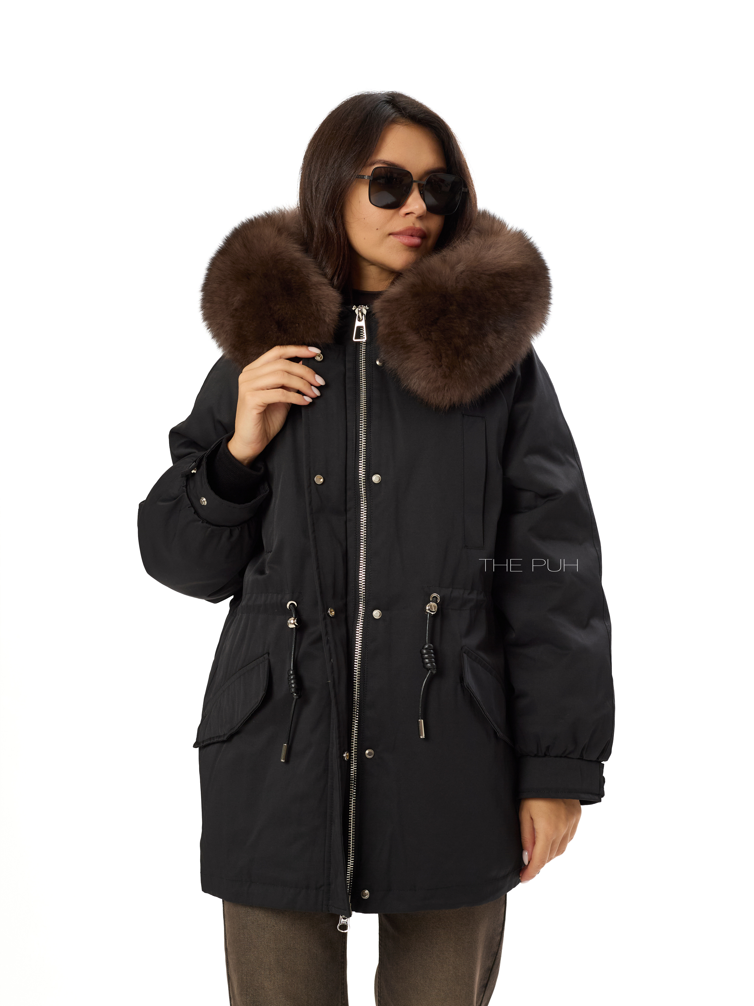 Черная пуховая парка средней длины с оторочкой из меха песца на капюшоне. Модель с кулиской на талии позволяет контролировать прилегание и менять силуэт по желанию. Съемный мех защитит от ветра и осадков.