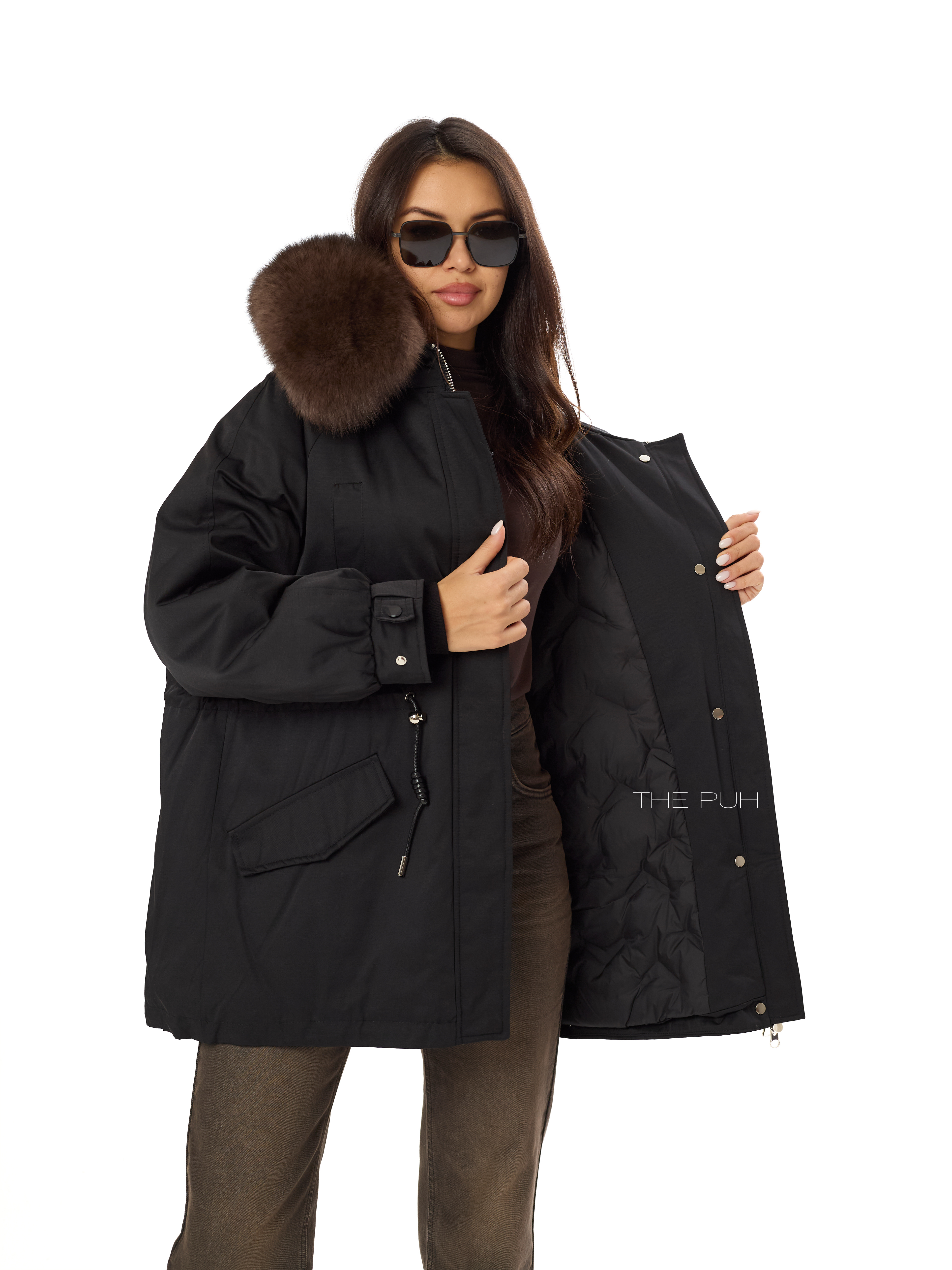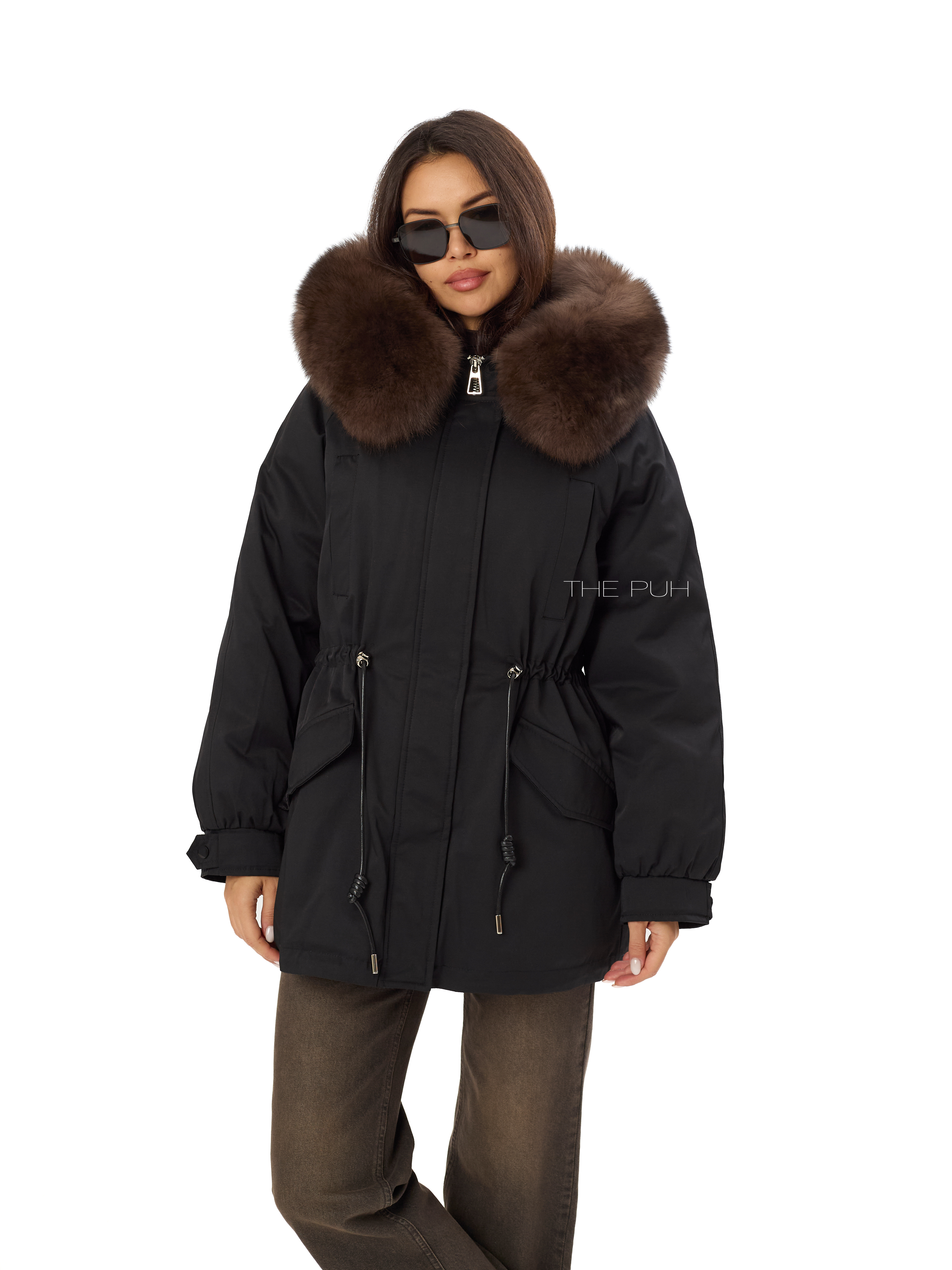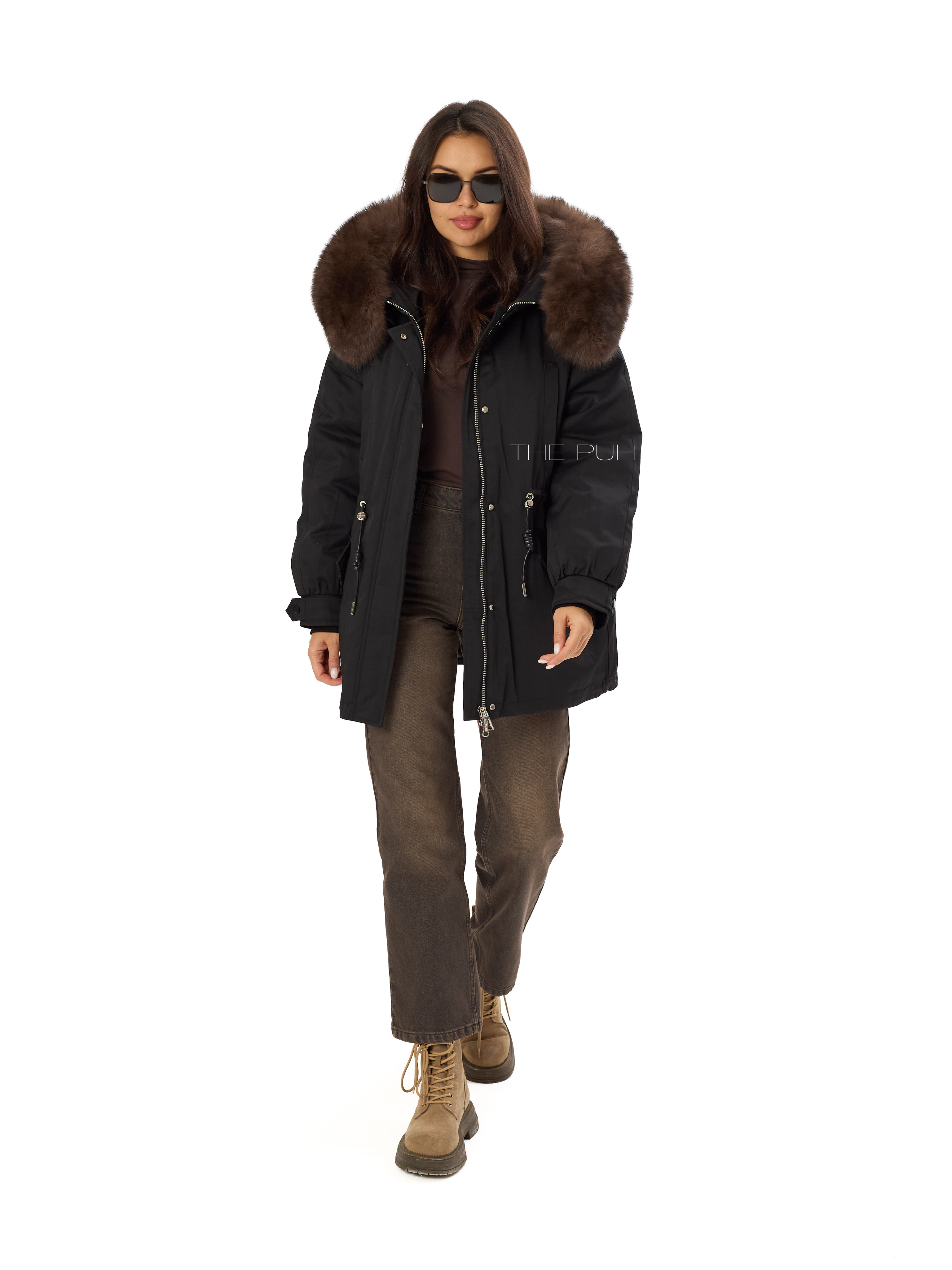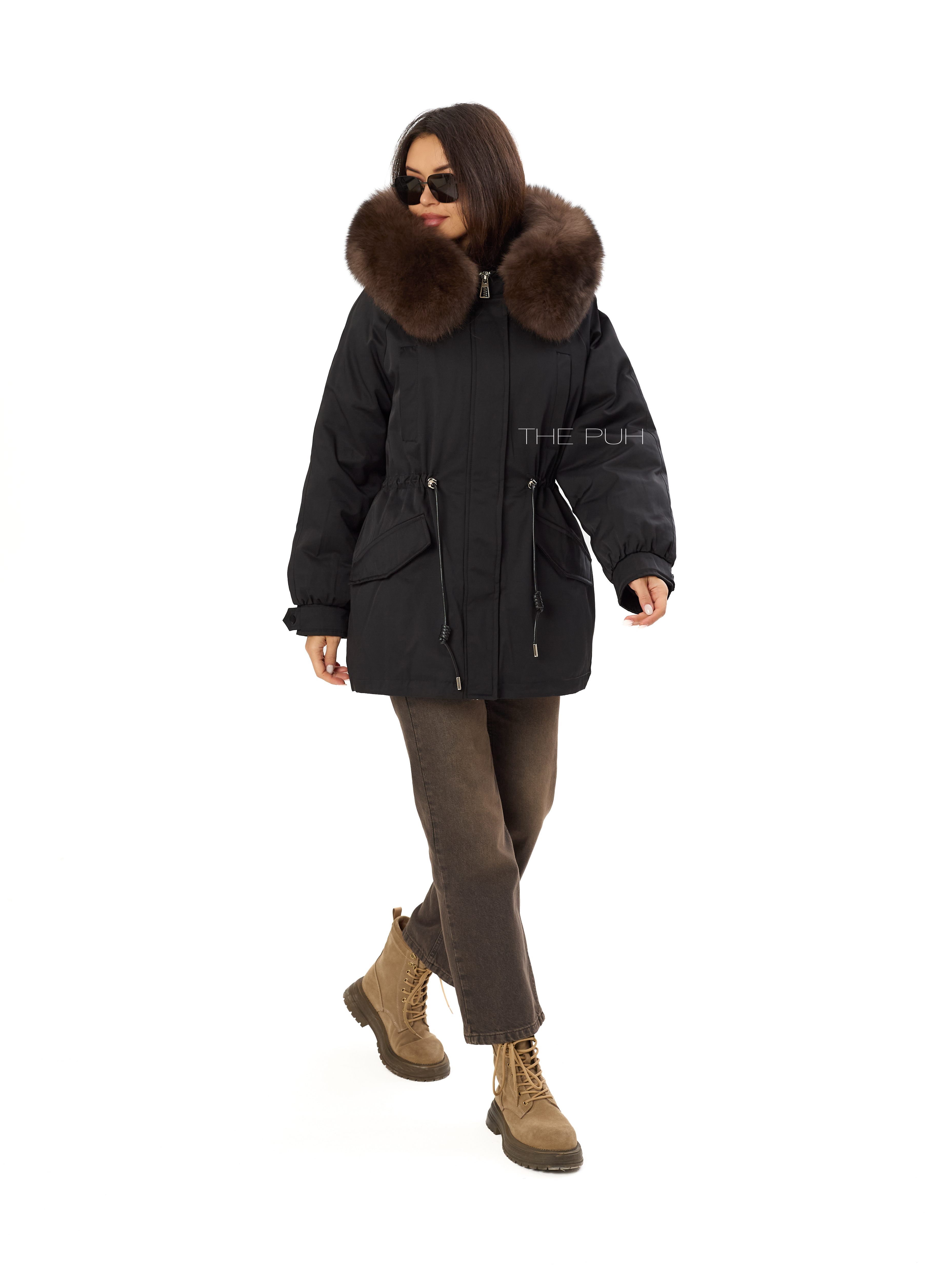 Черная пуховая парка средней длины с оторочкой из меха песца на капюшоне. Модель с кулиской на талии позволяет контролировать прилегание и менять силуэт по желанию. Съемный мех защитит от ветра и осадков.