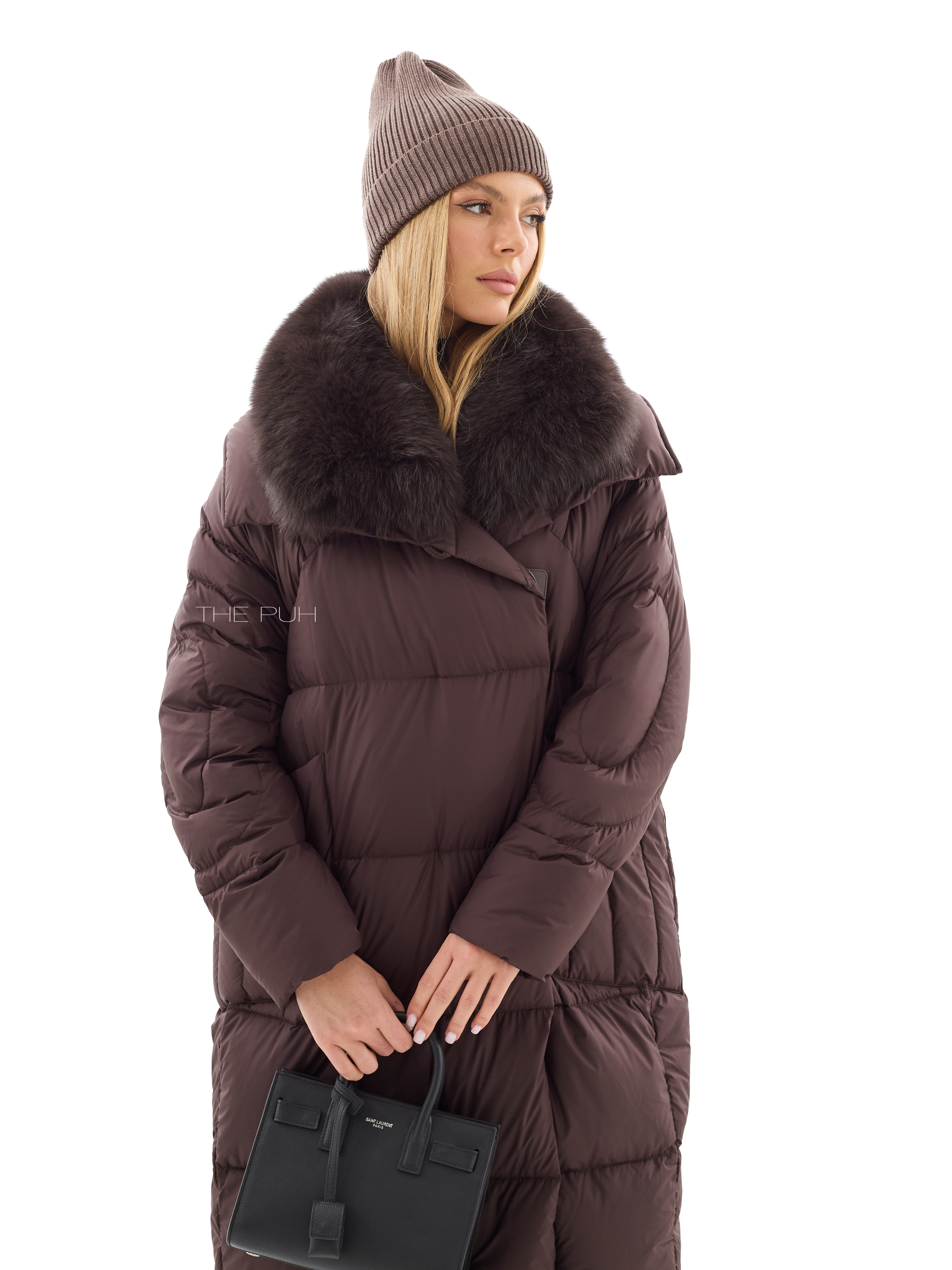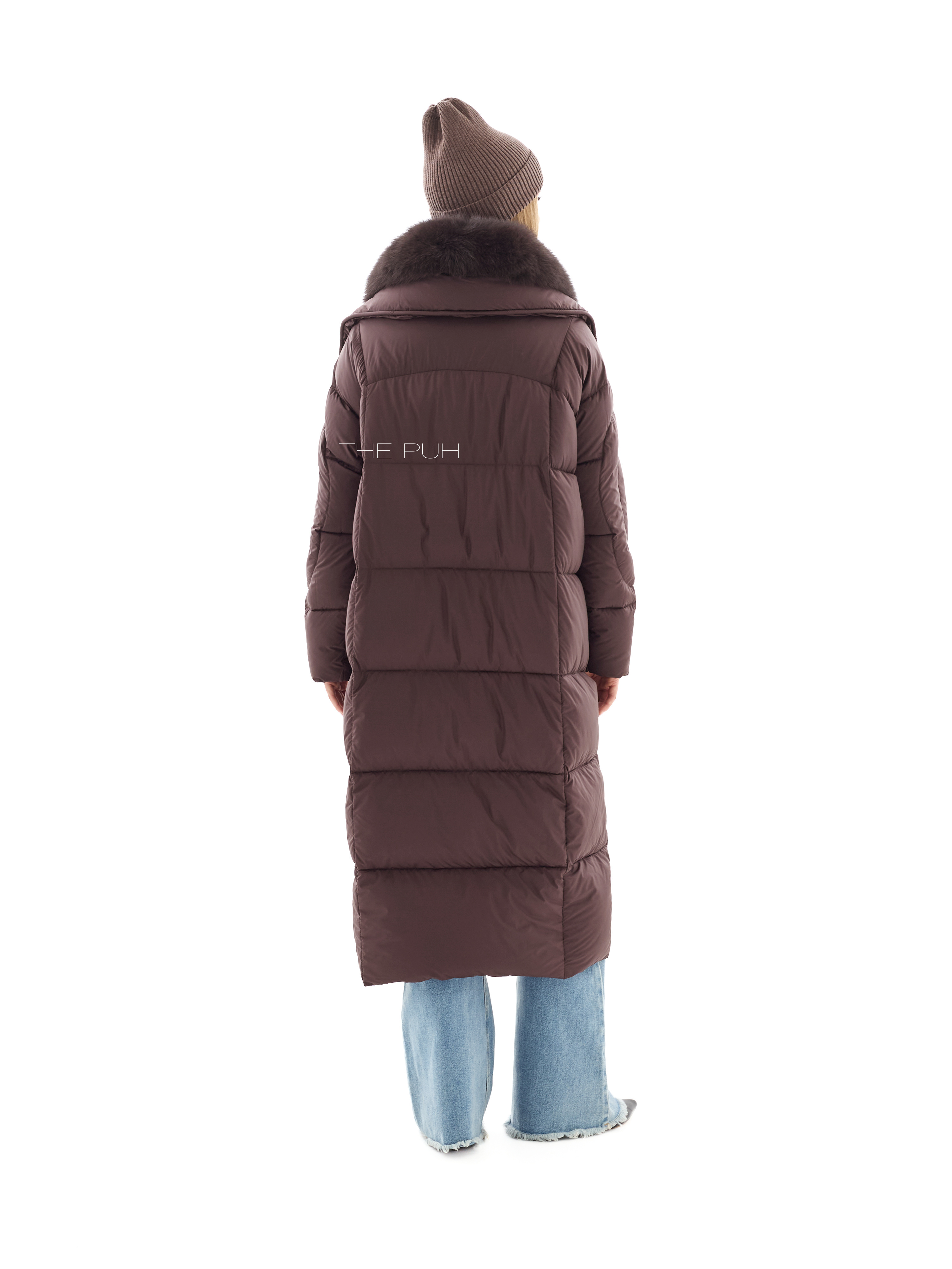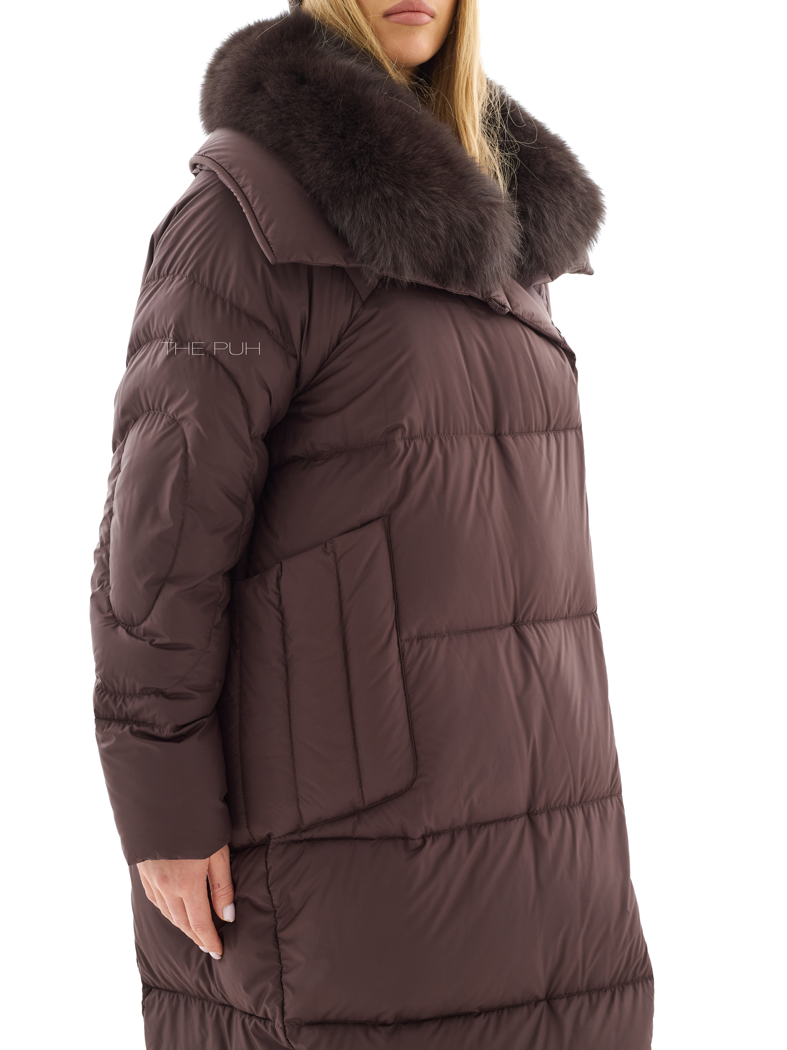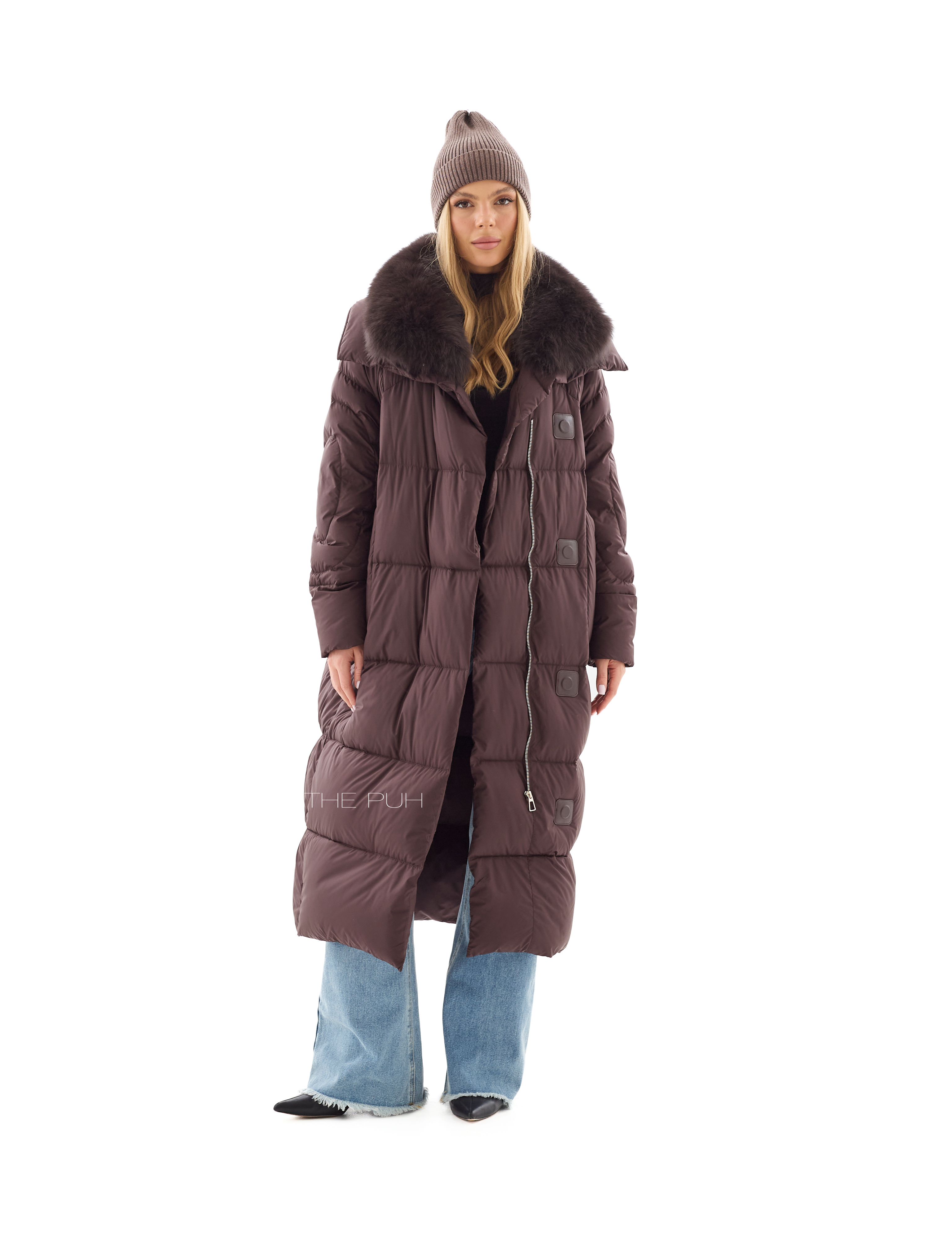Длинный шоколадный пуховик со съемным воротником из меха песца в тон. Модель утеплена натуральным пухом и дополнена круговой стежкой на рукавах. Застегивается на молнию и ветрозащитную планку на магнитах.