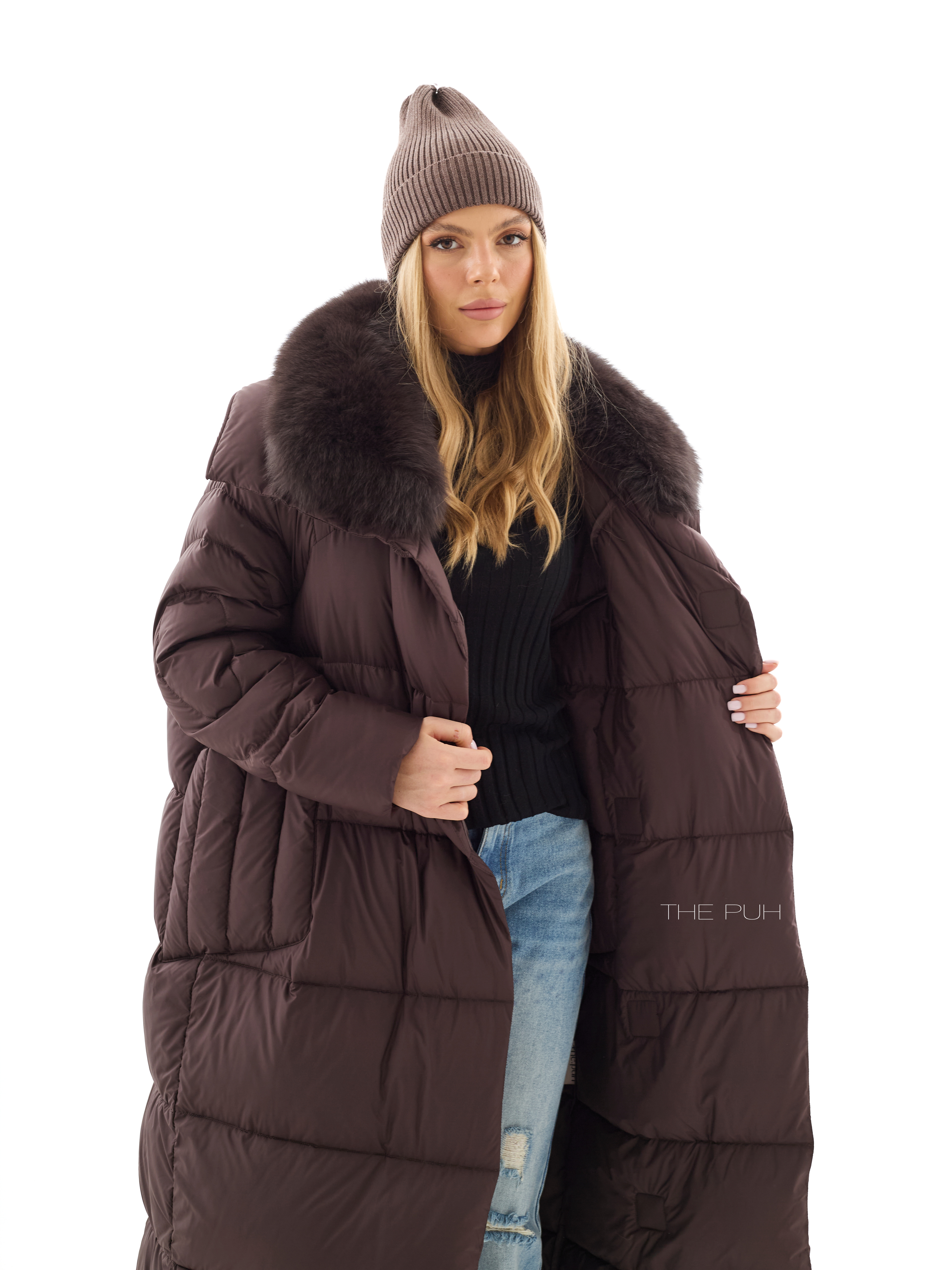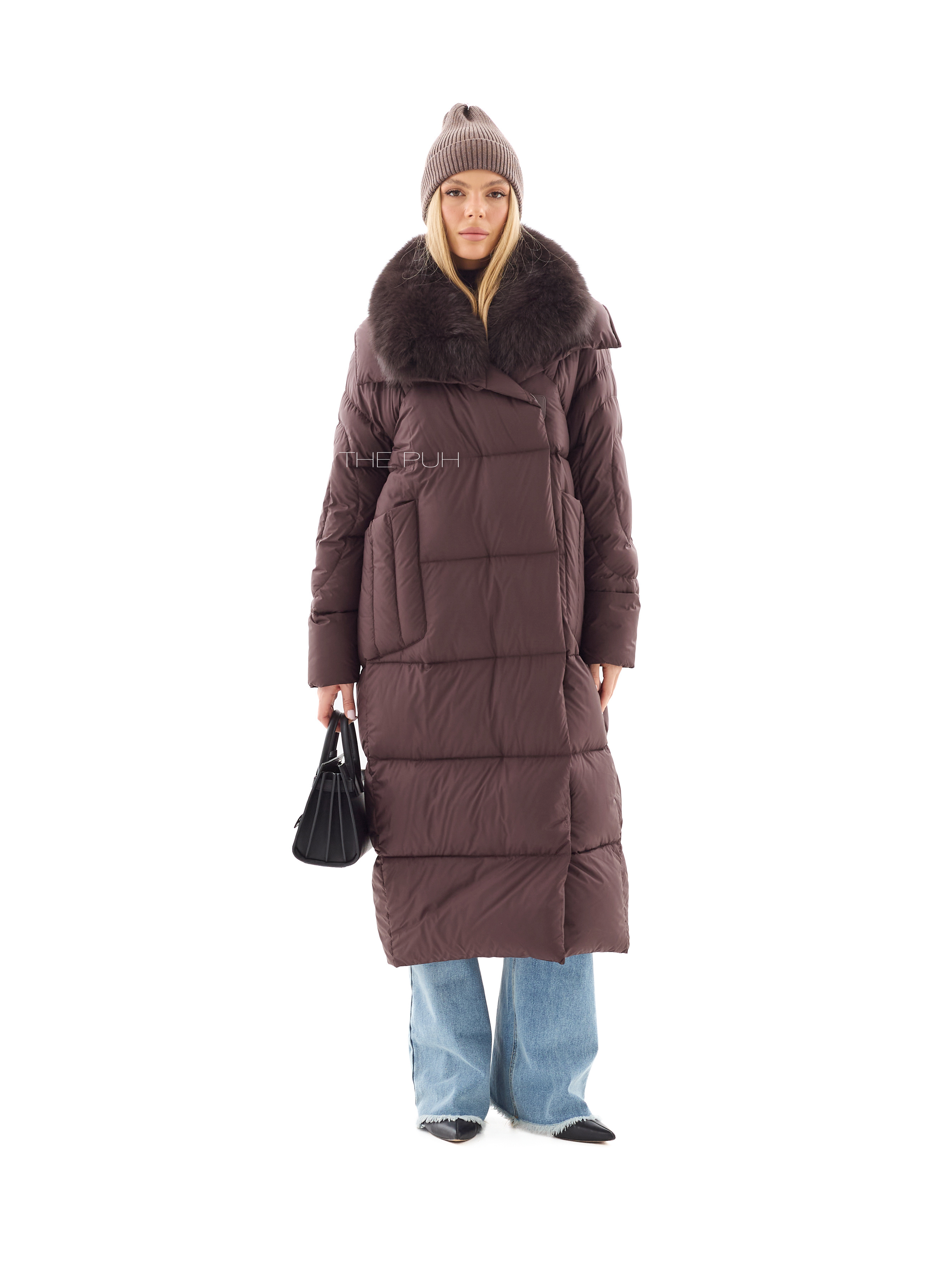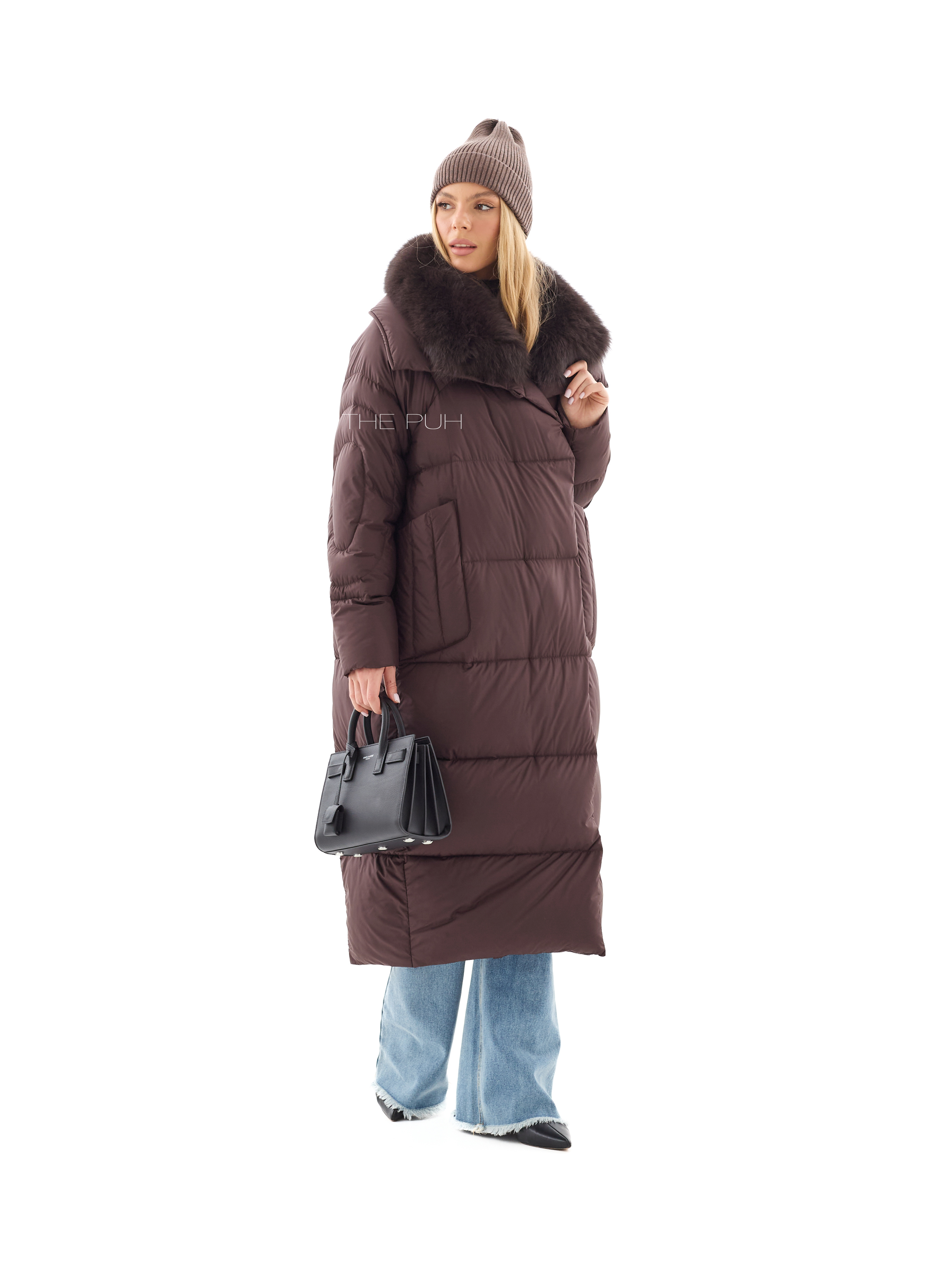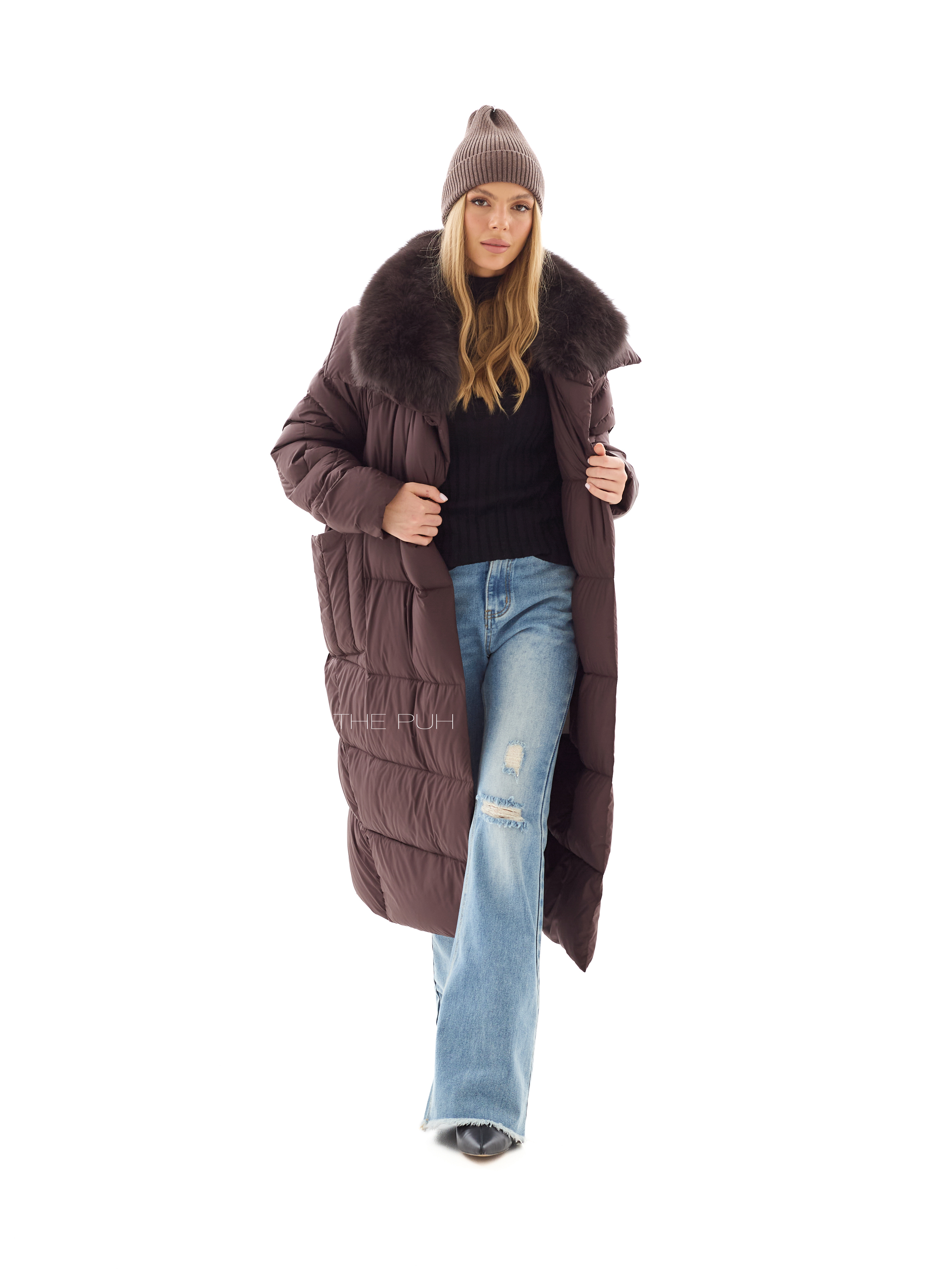 Длинный шоколадный пуховик со съемным воротником из меха песца в тон. Модель утеплена натуральным пухом и дополнена круговой стежкой на рукавах. Застегивается на молнию и ветрозащитную планку на магнитах.