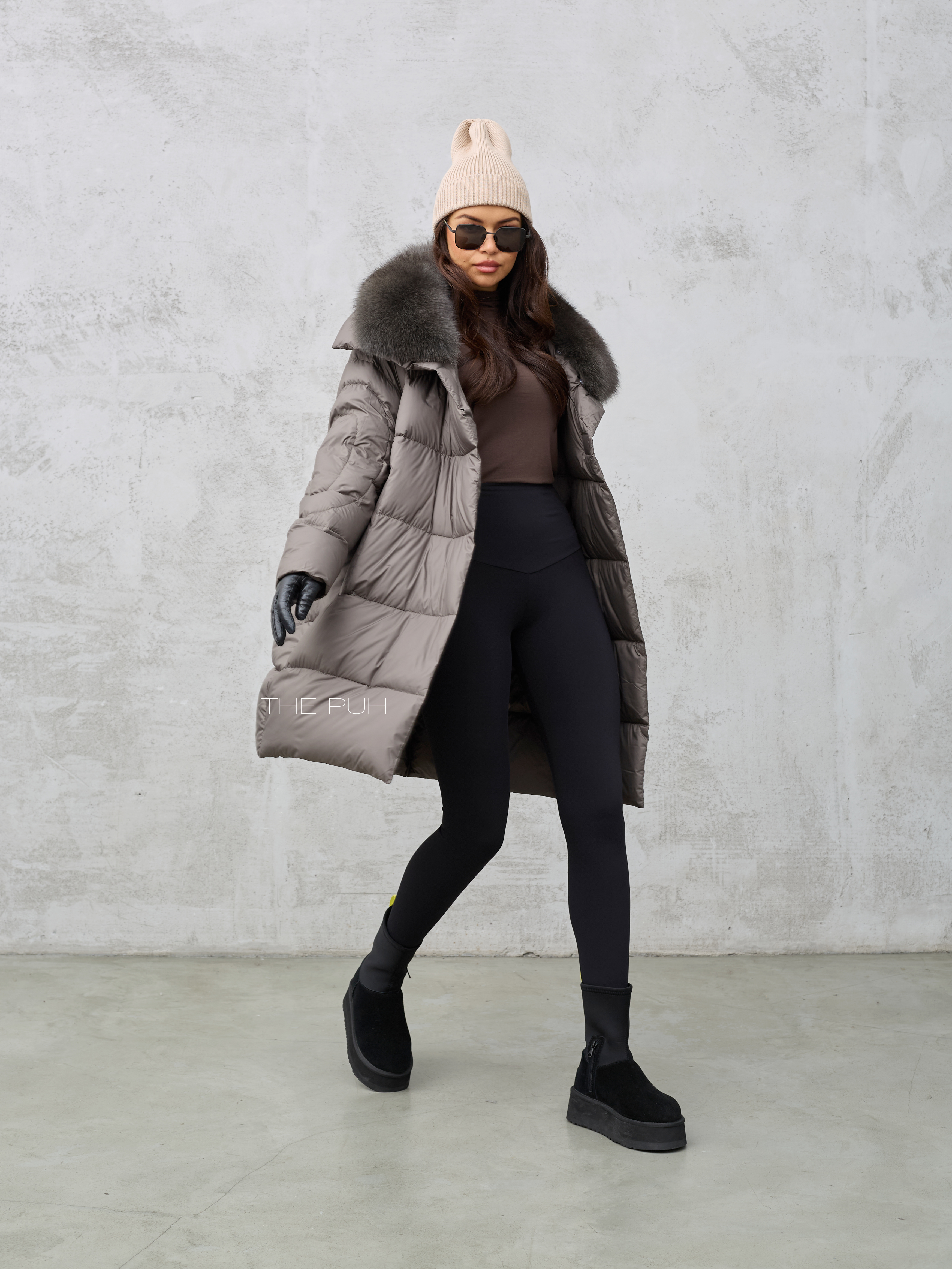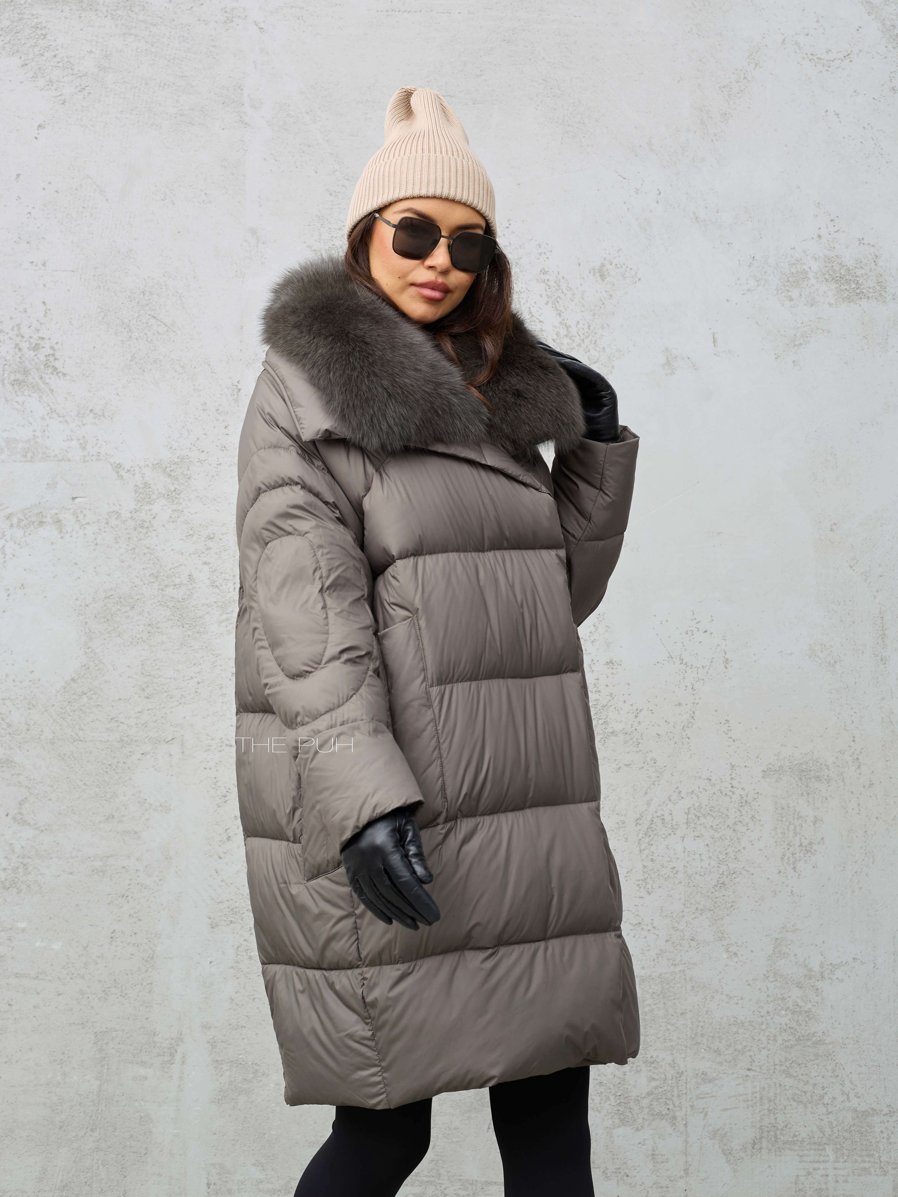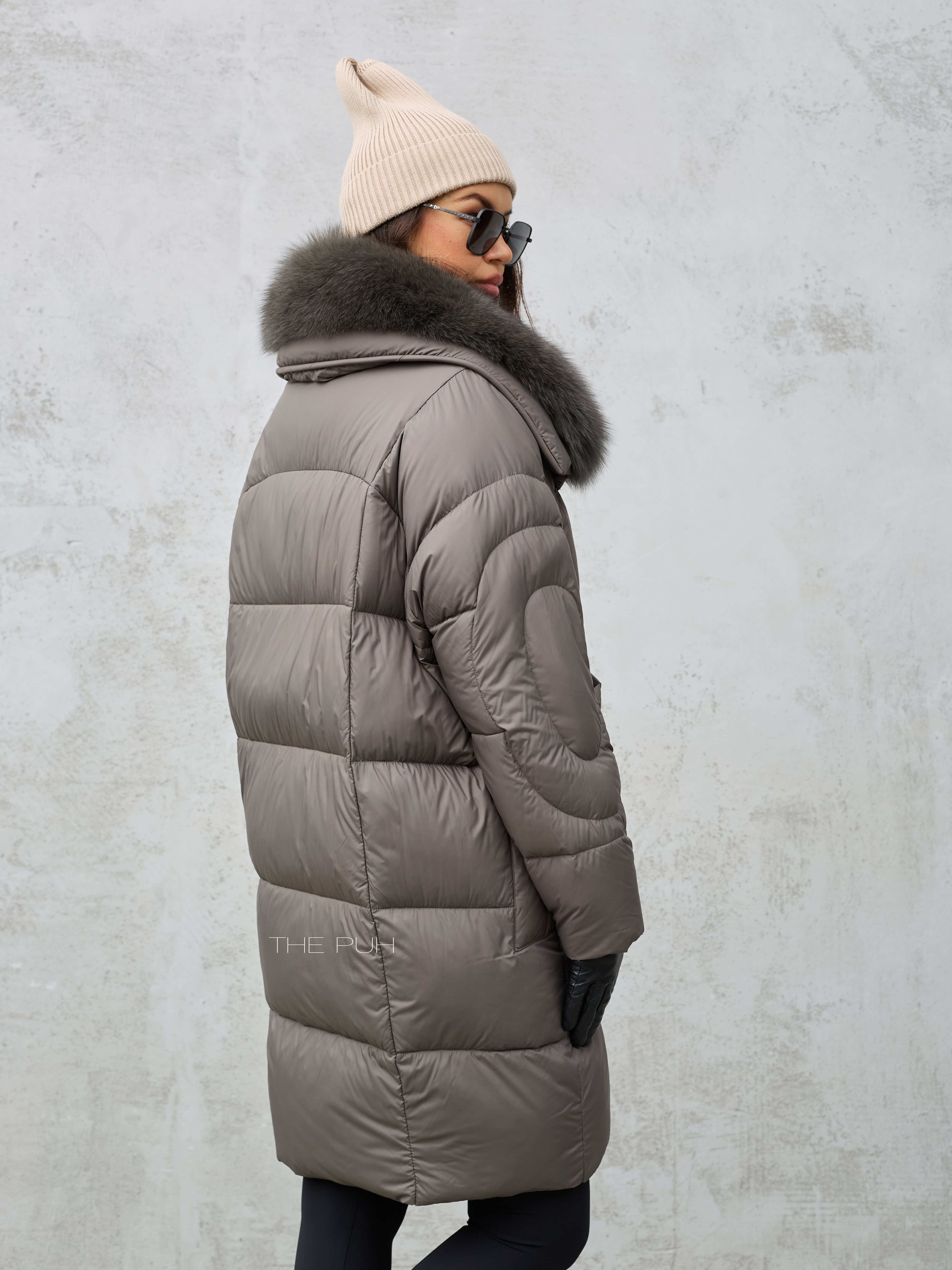 Удлиненный пуховик из текстиля шоколадного цвета с меховым воротником из песца и натуральным утеплителем из пуха и пера.