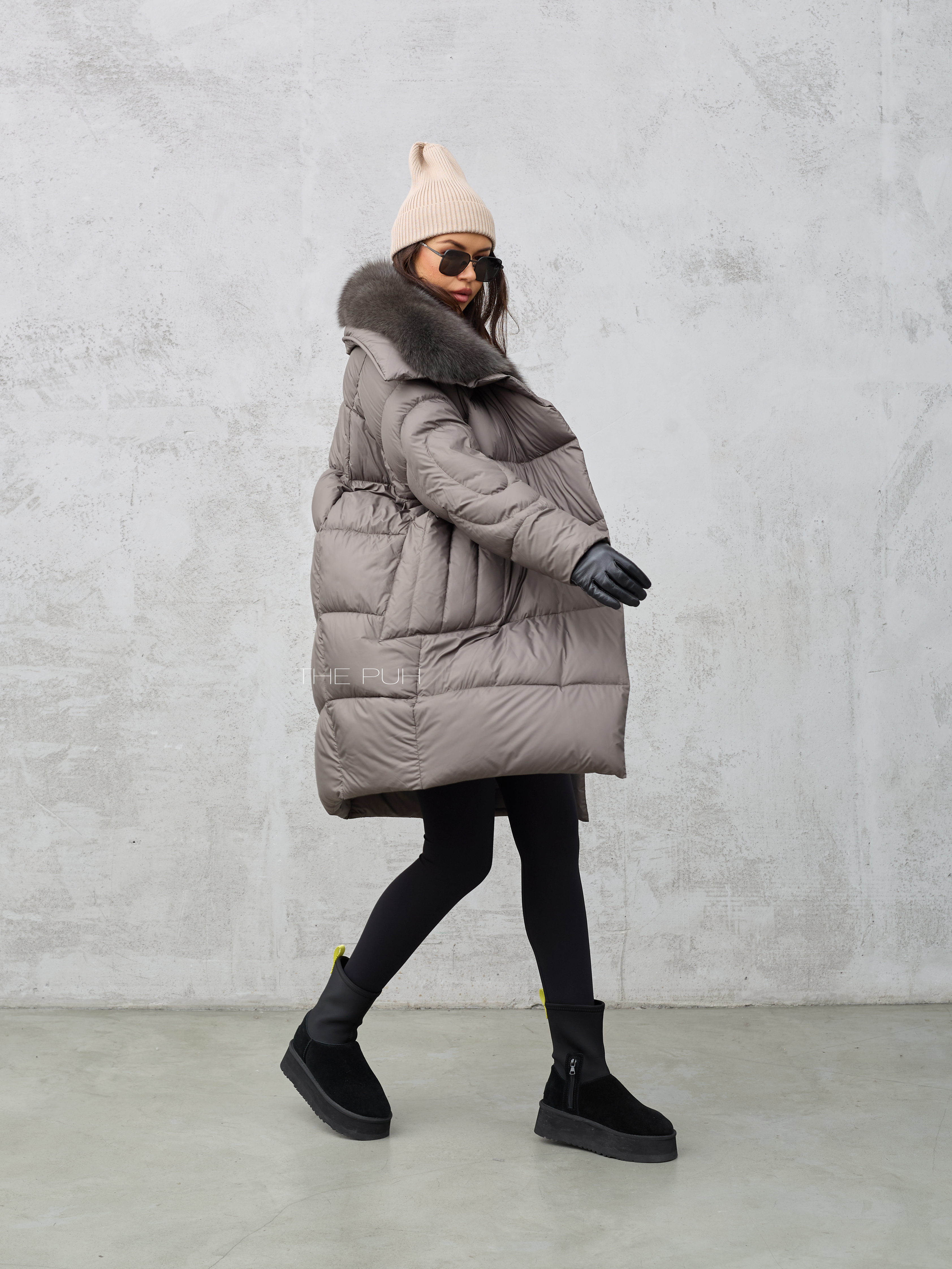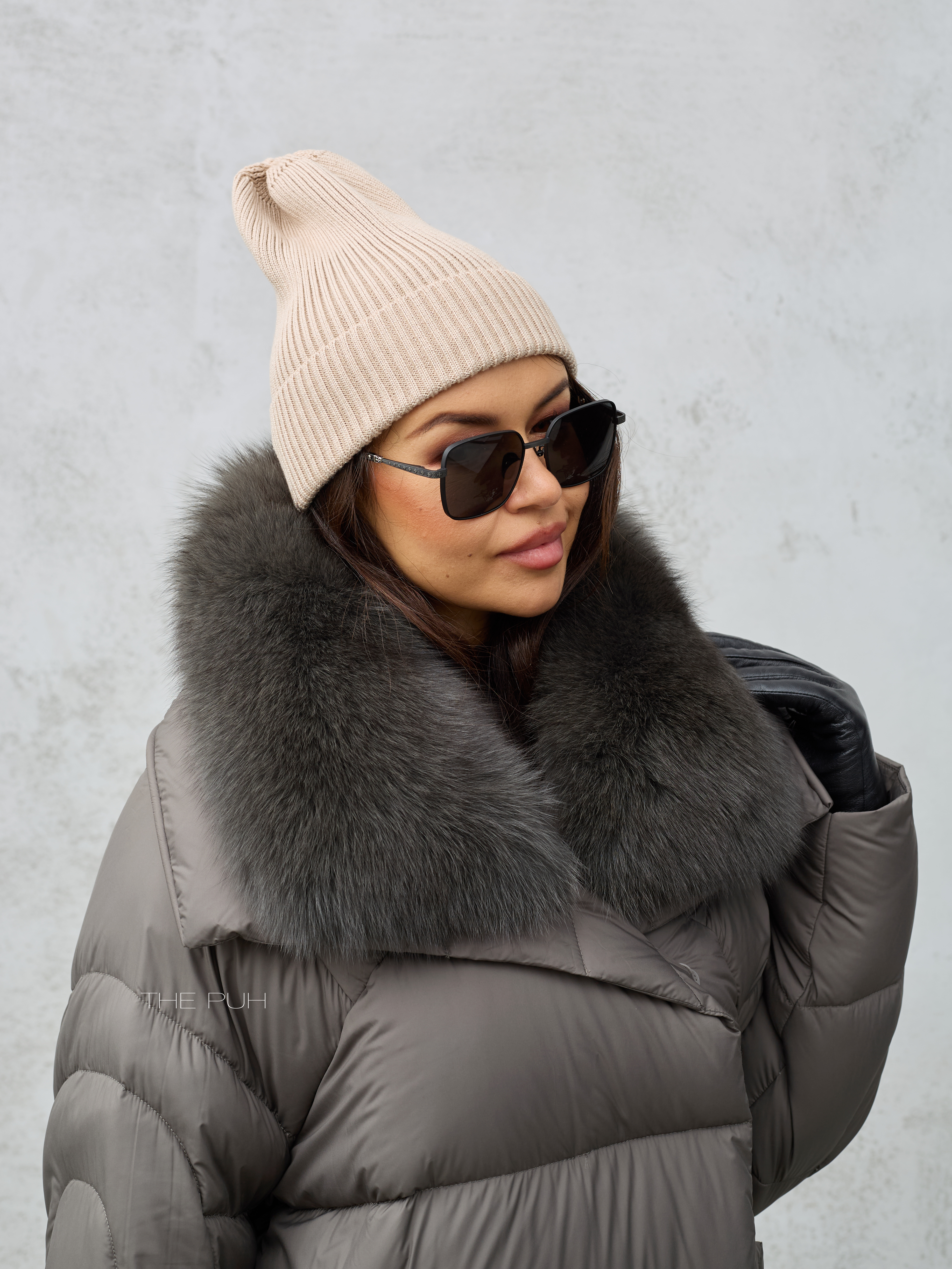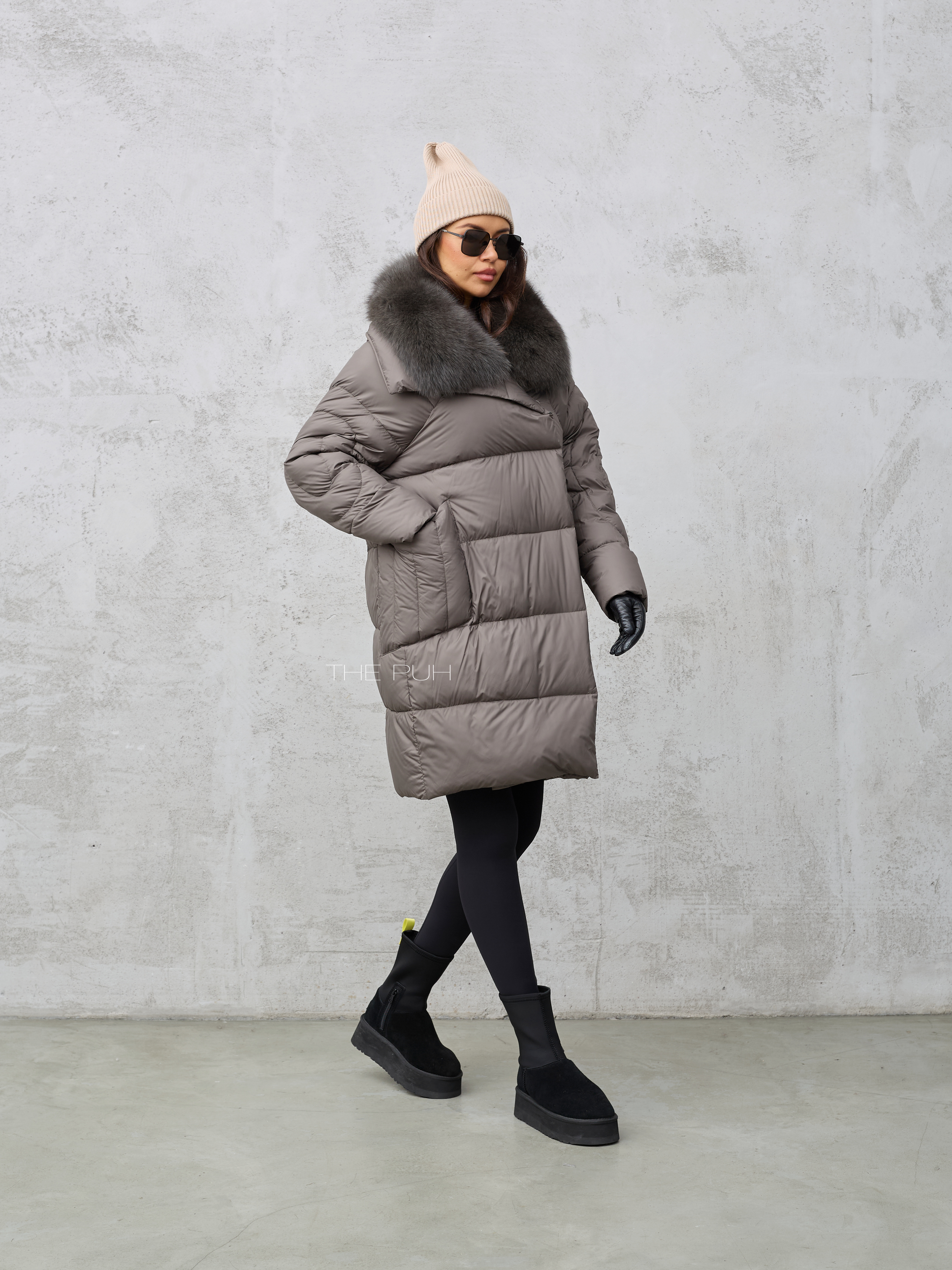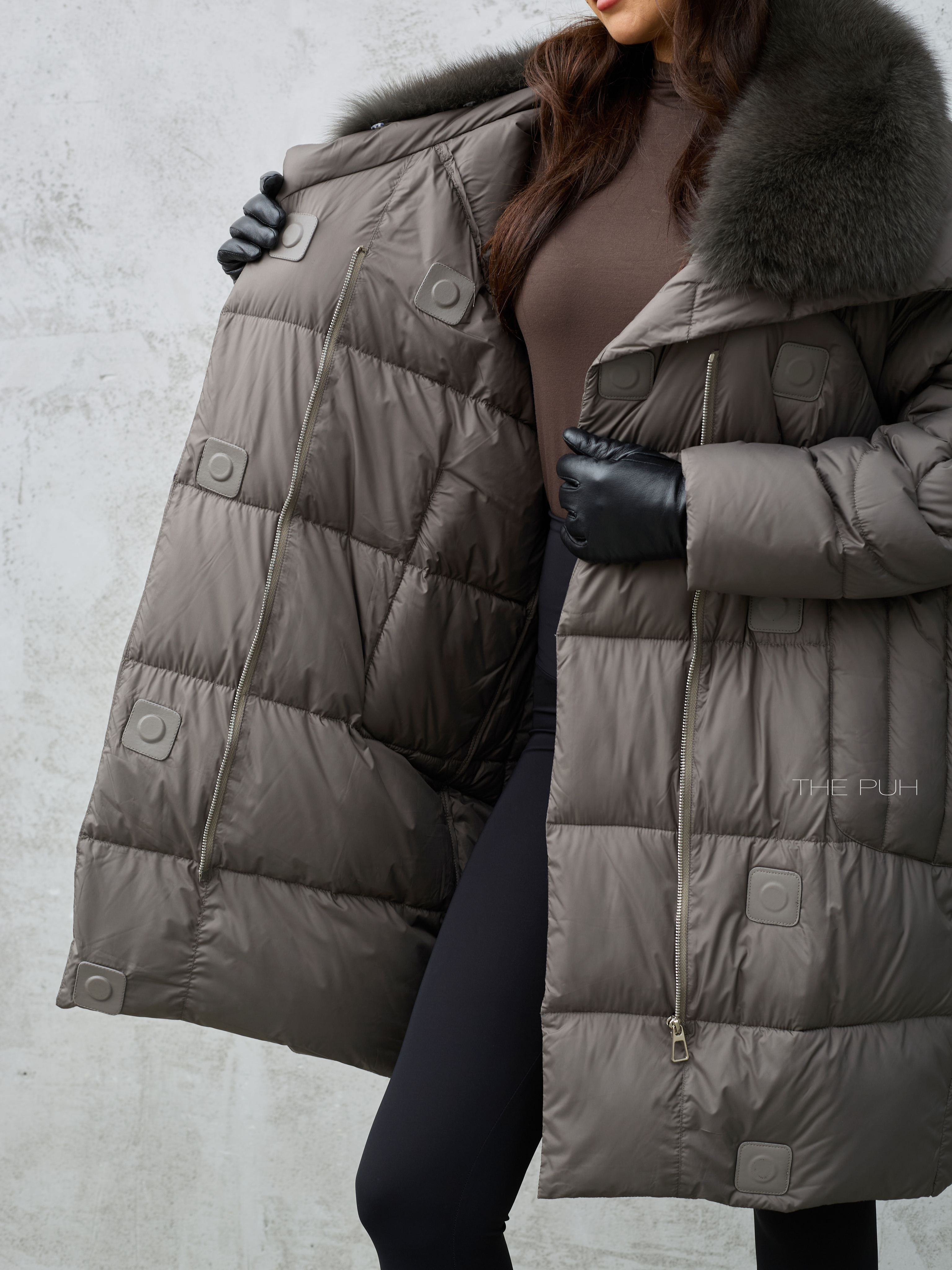 Удлиненный пуховик из текстиля шоколадного цвета с меховым воротником из песца и натуральным утеплителем из пуха и пера.
