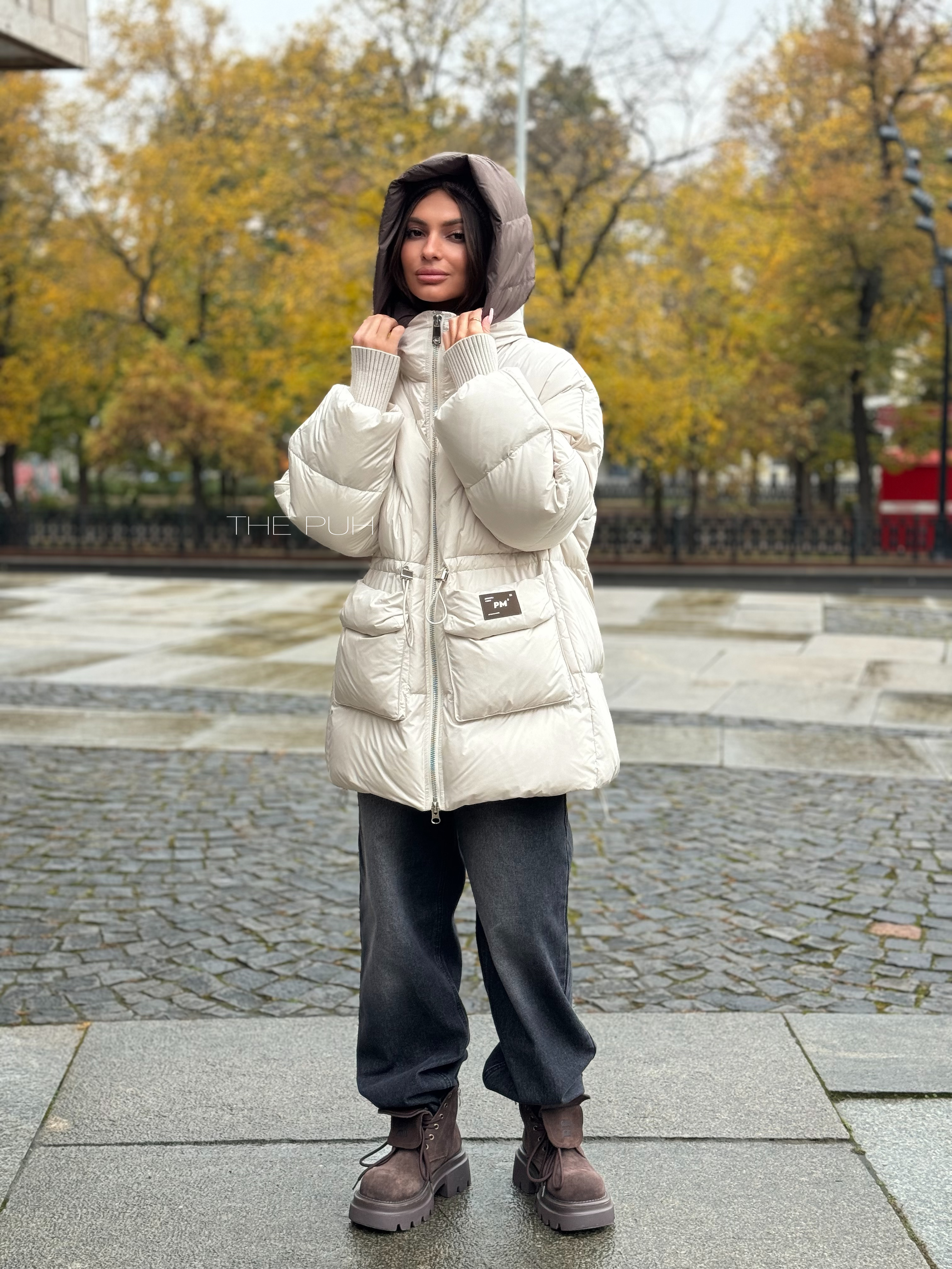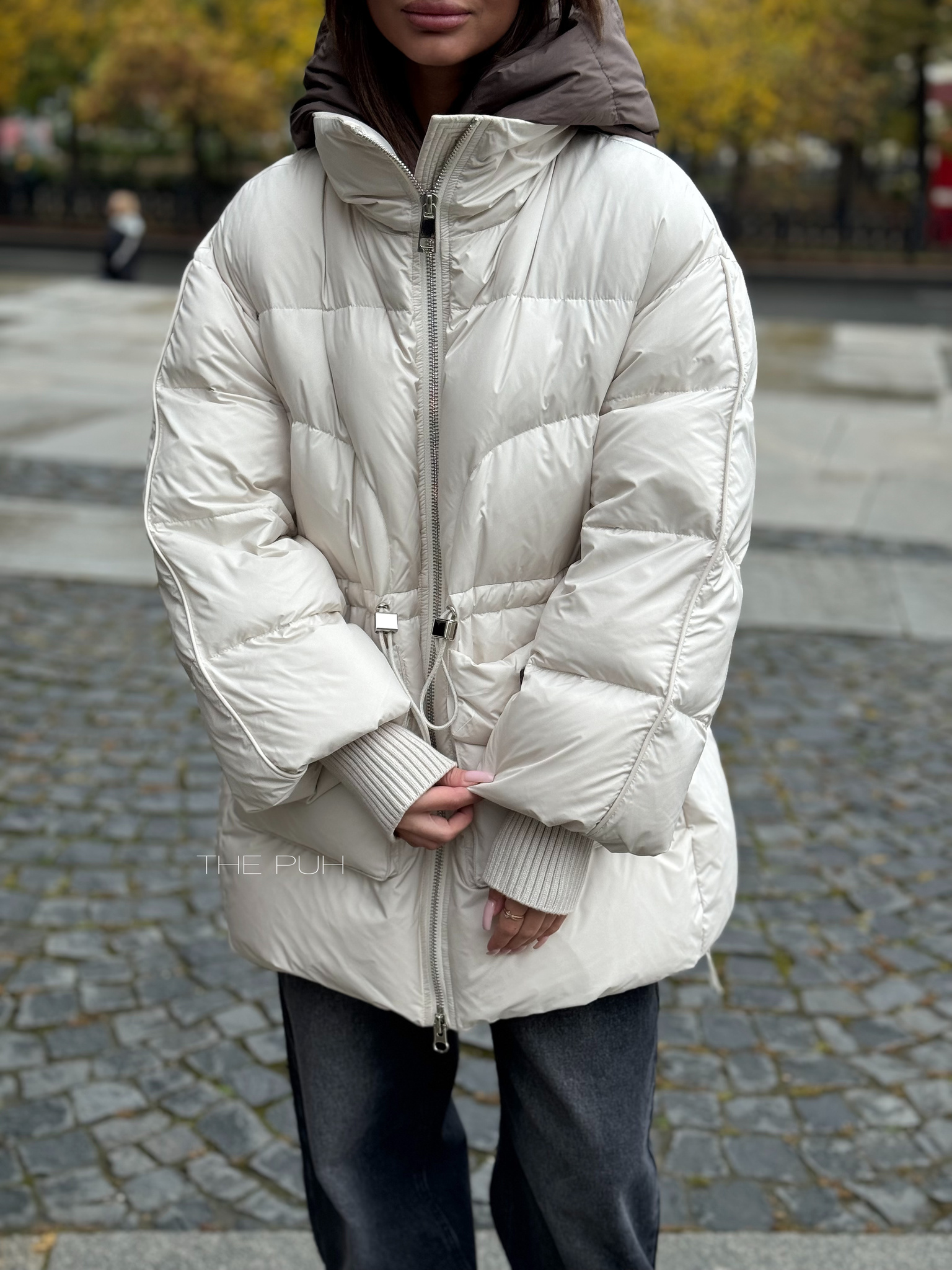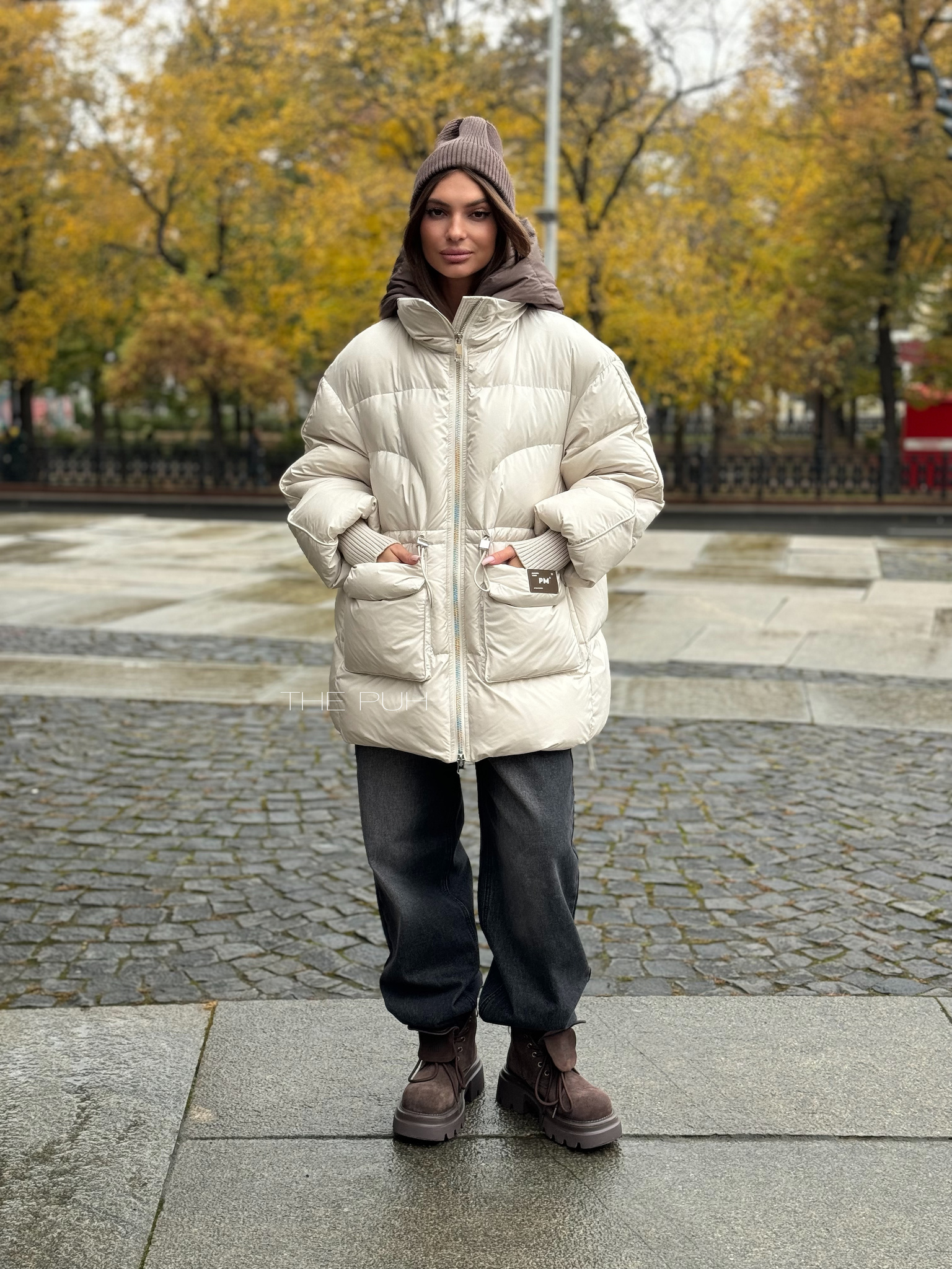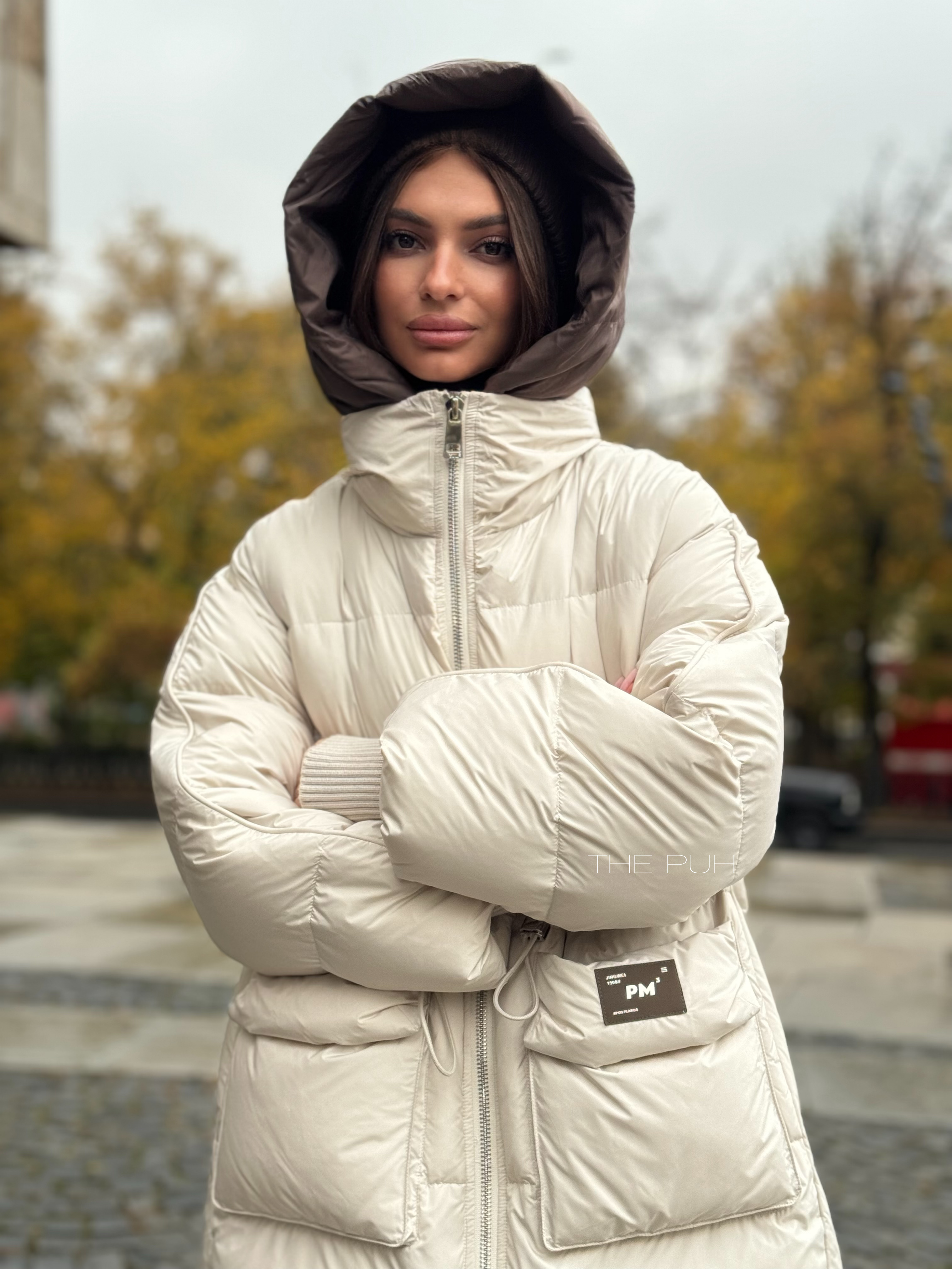 Удлиненный светло-бежевый пуховик на молнии с кулиской на поясе и контрастным капюшоном. Модель также дополнена удлиненными вязаными манжетами, которые защитят от холода и ветра.