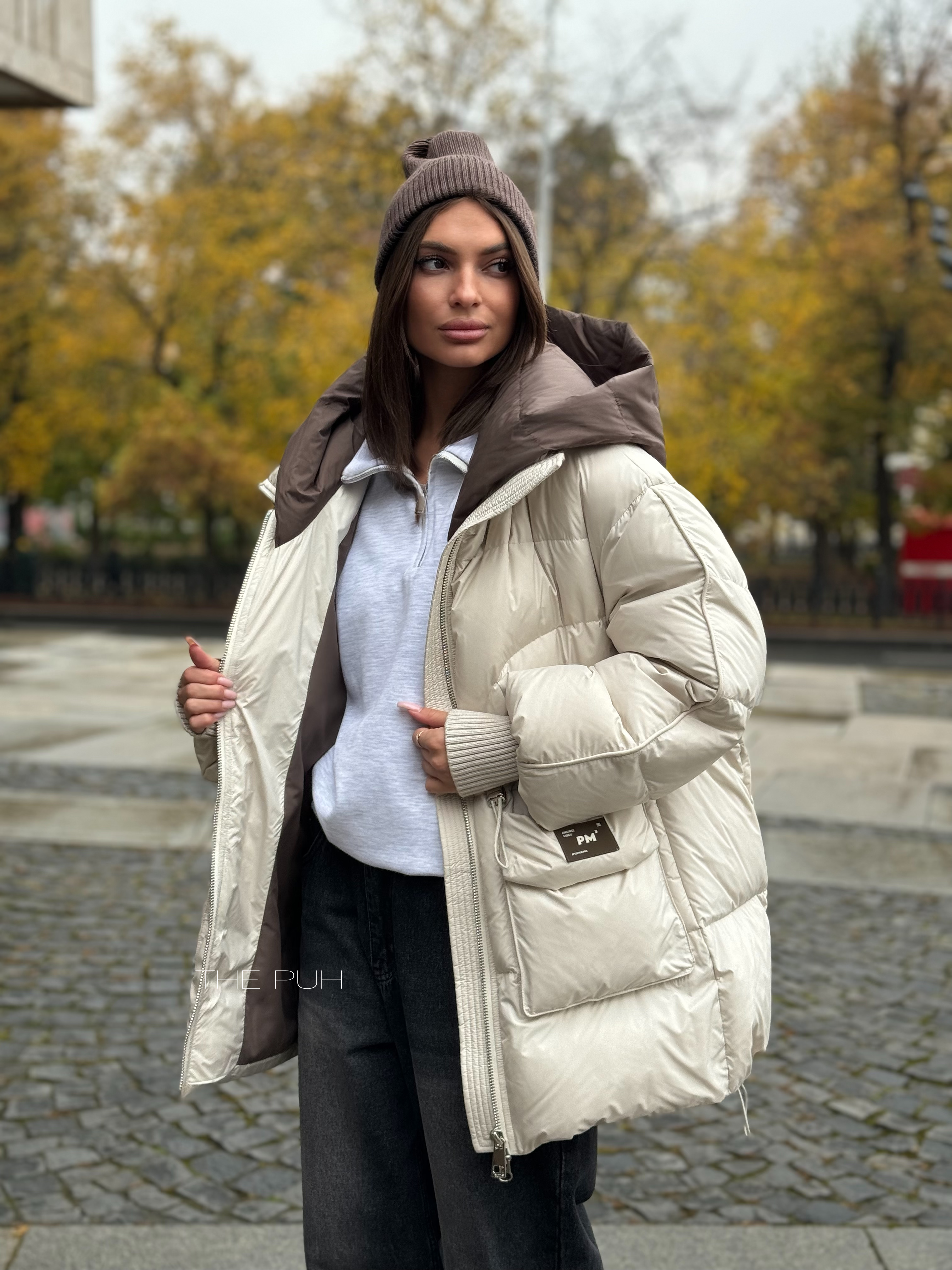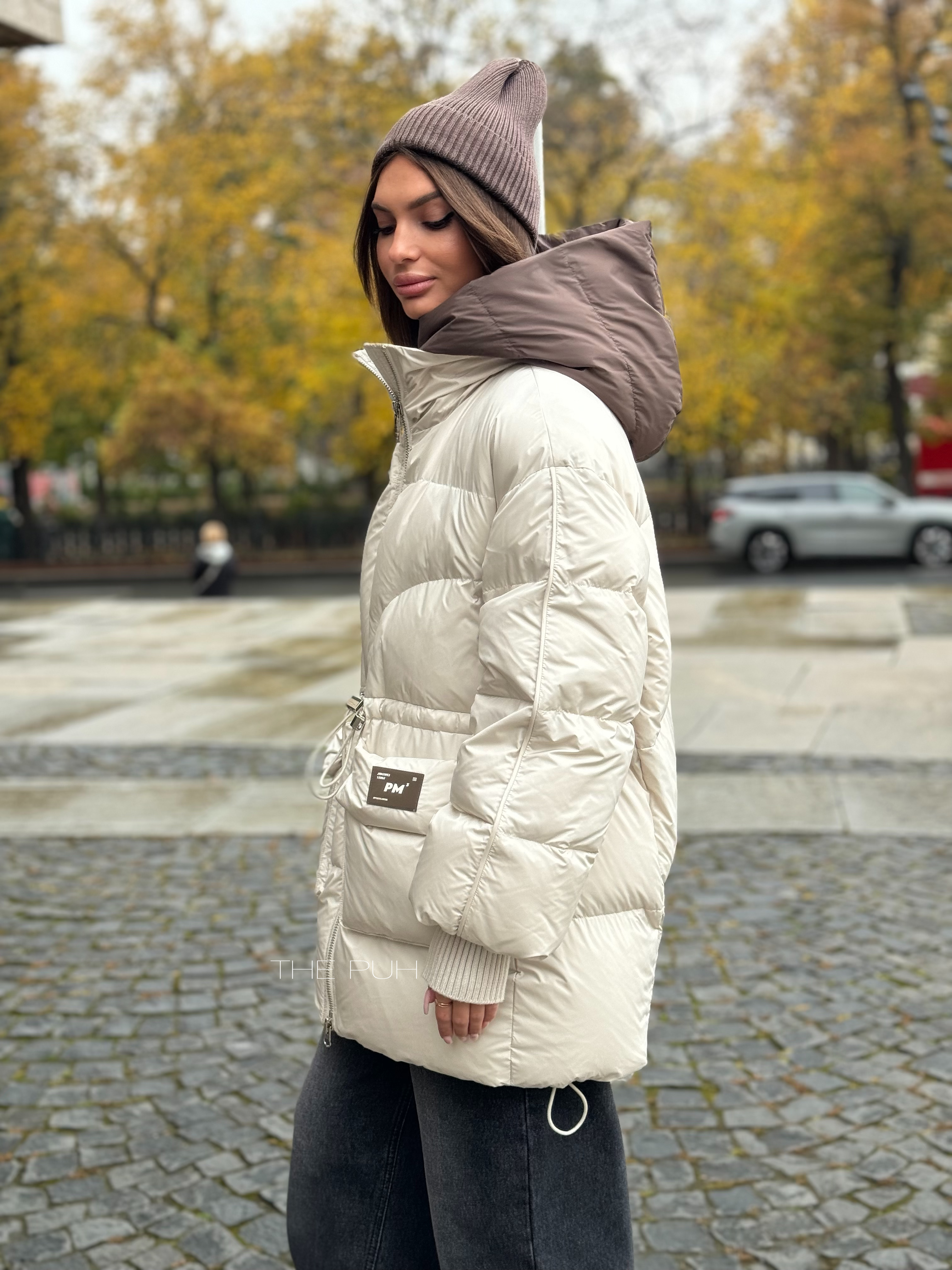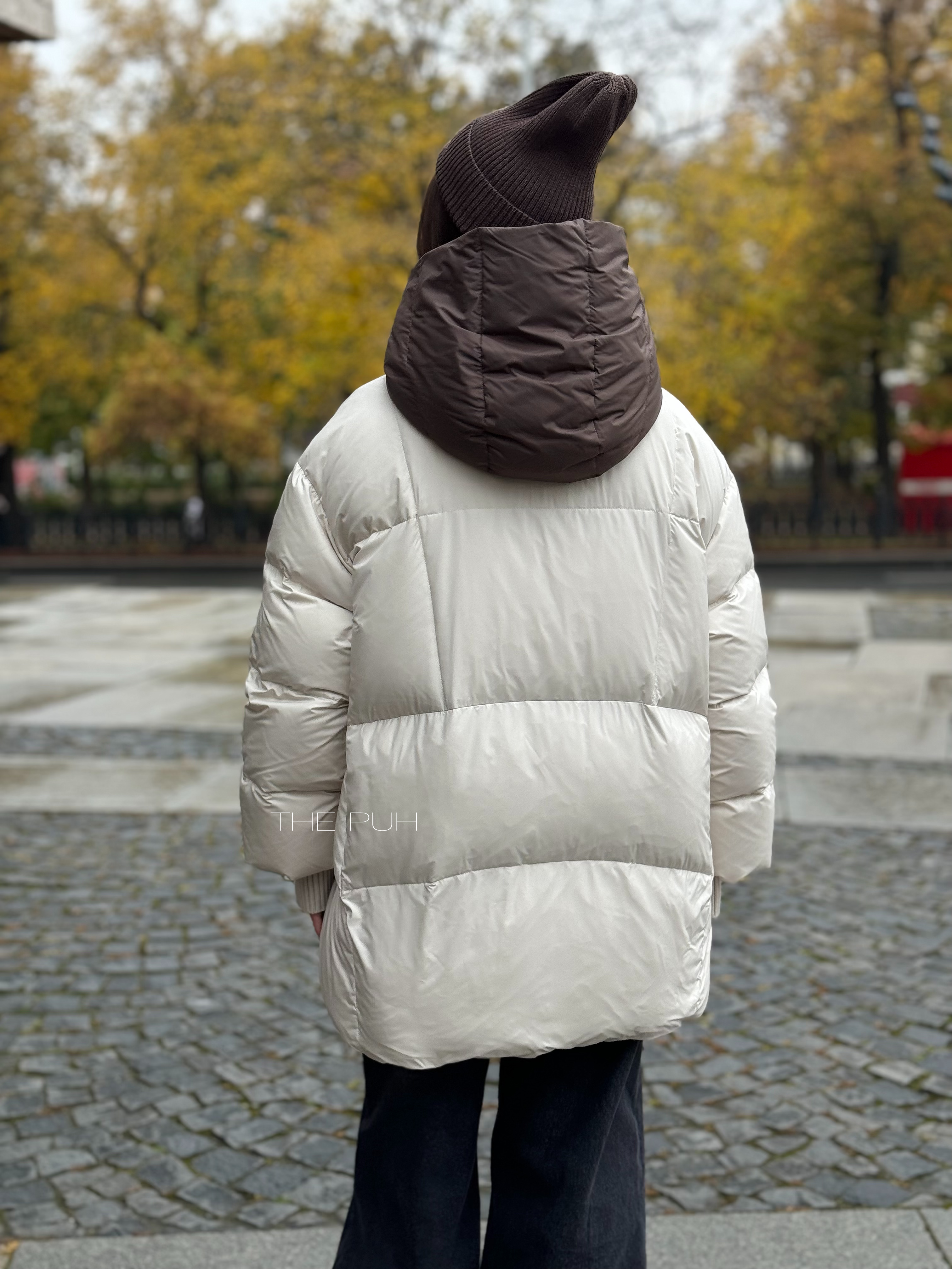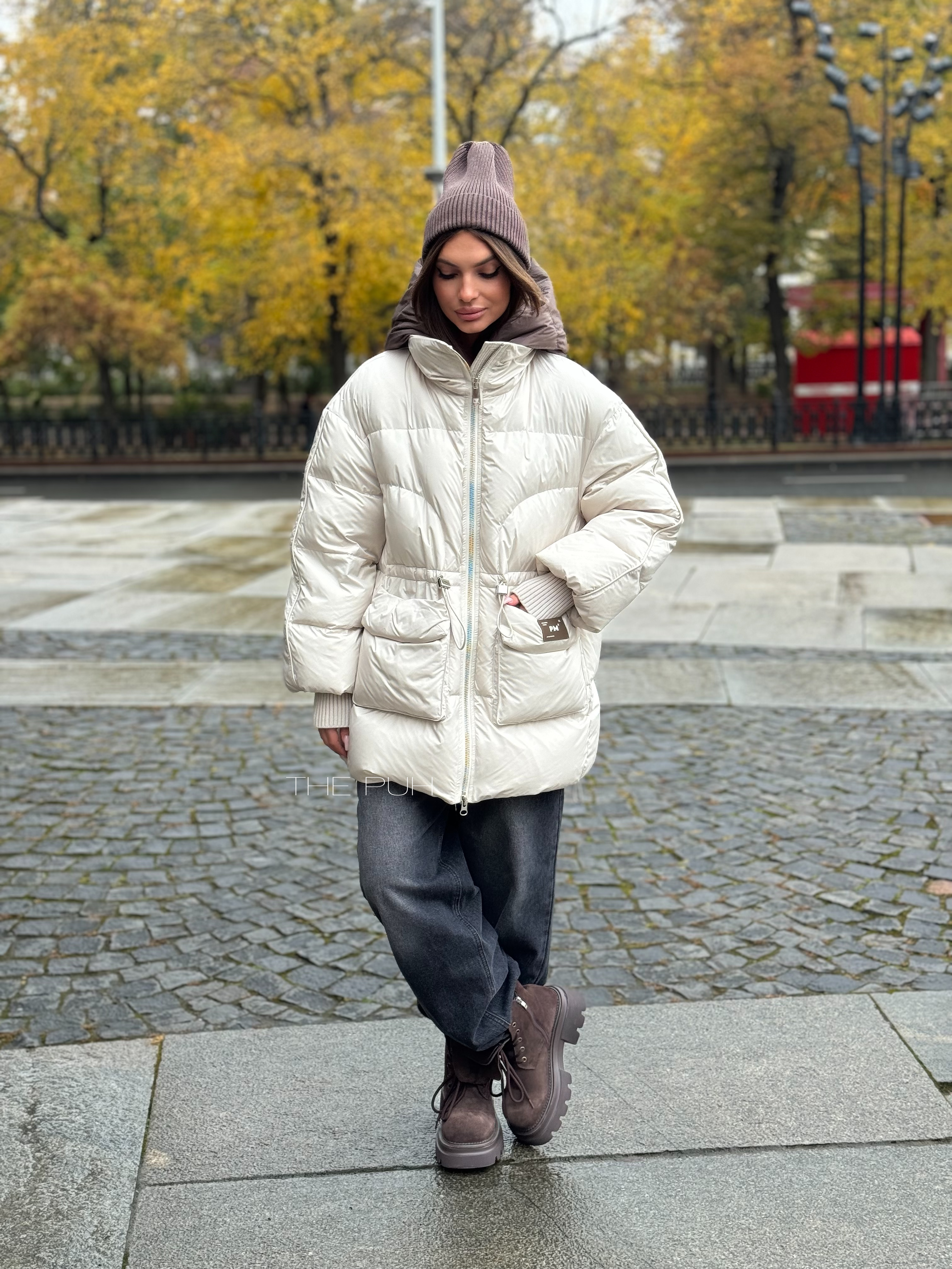 Удлиненный светло-бежевый пуховик на молнии с кулиской на поясе и контрастным капюшоном. Модель также дополнена удлиненными вязаными манжетами, которые защитят от холода и ветра.