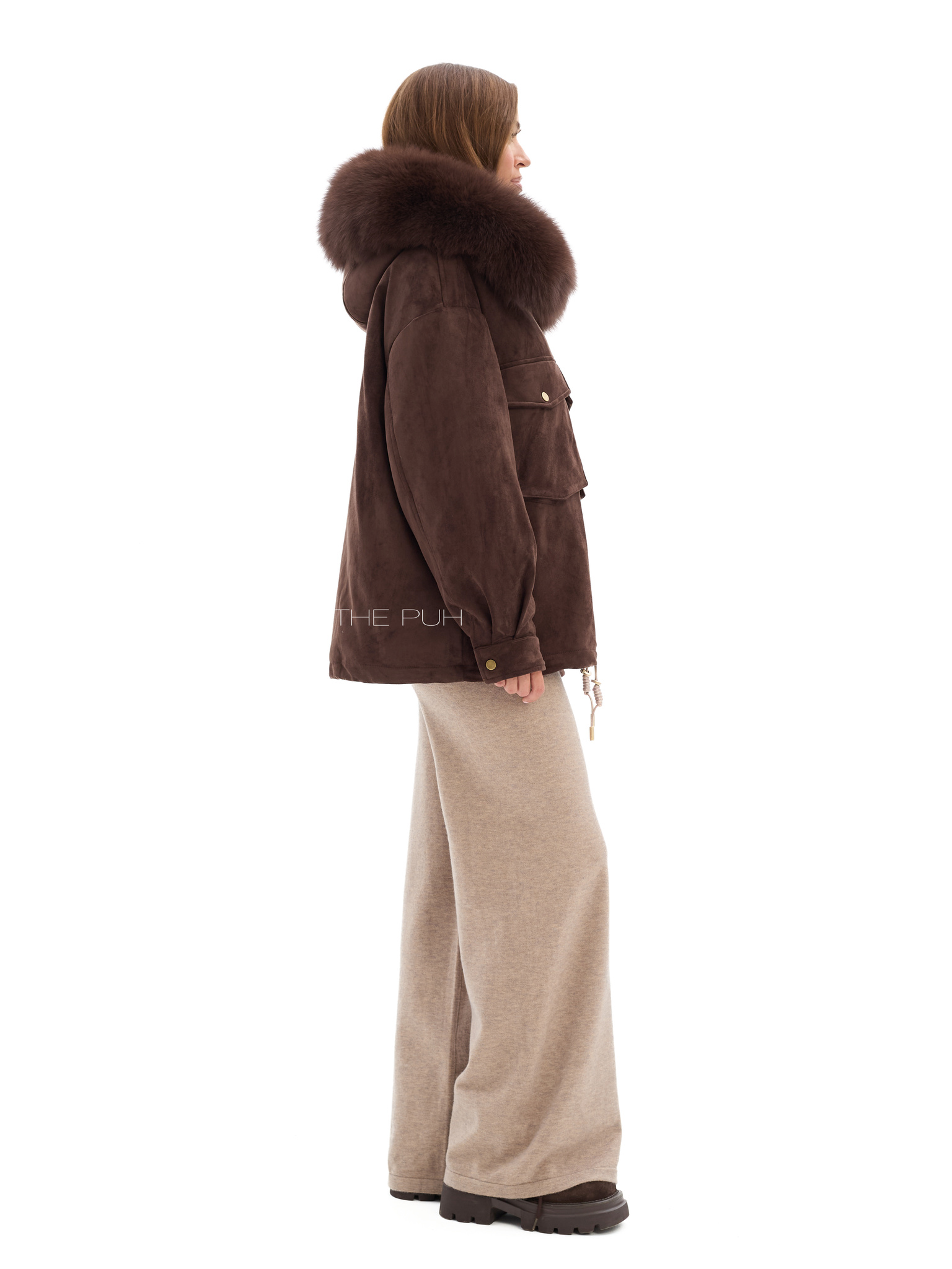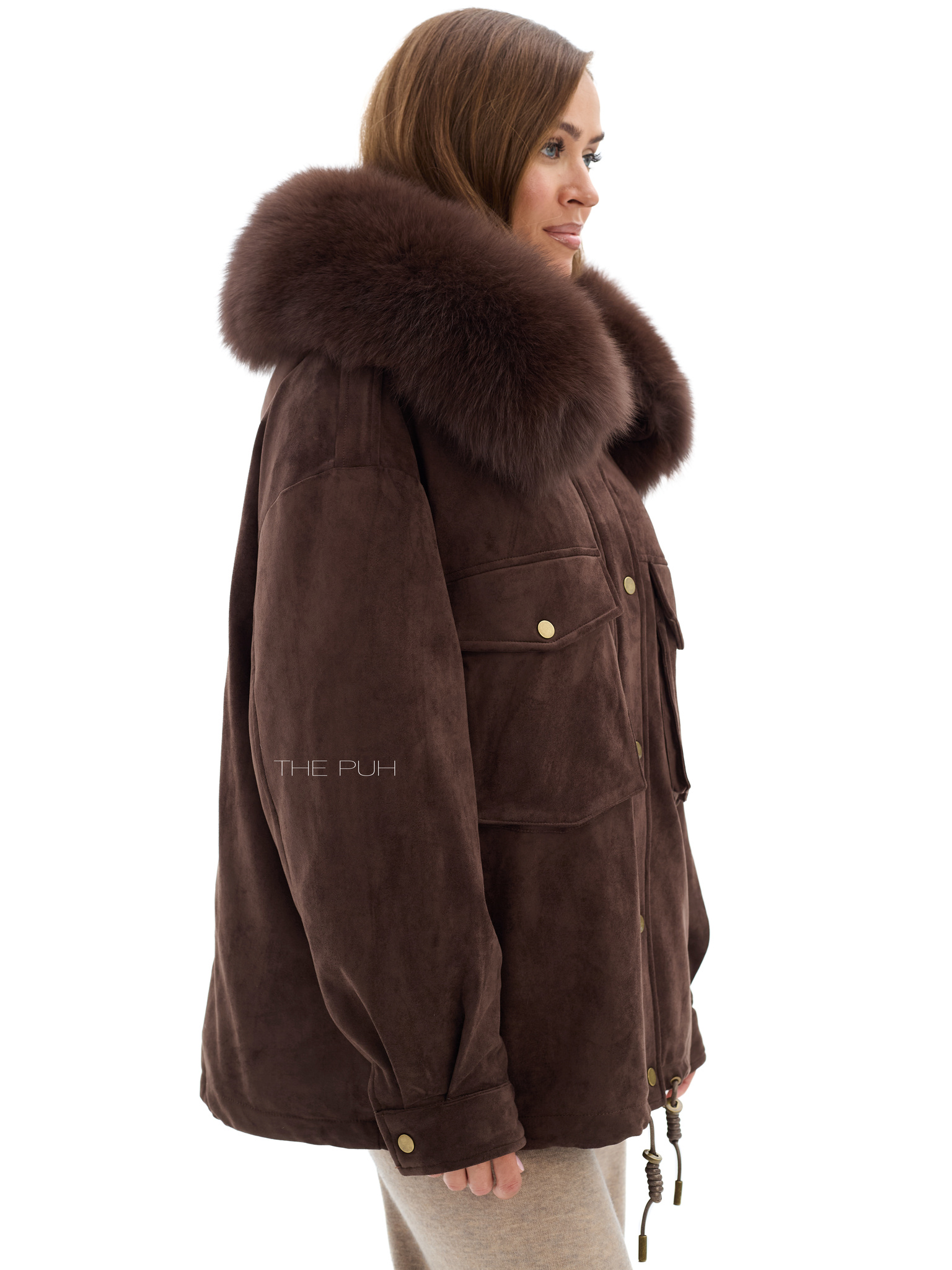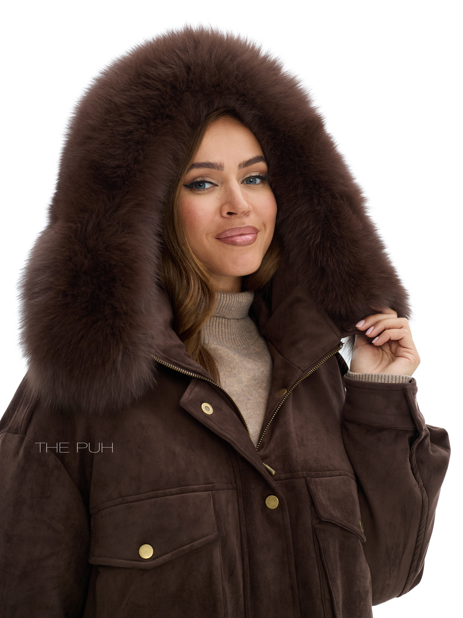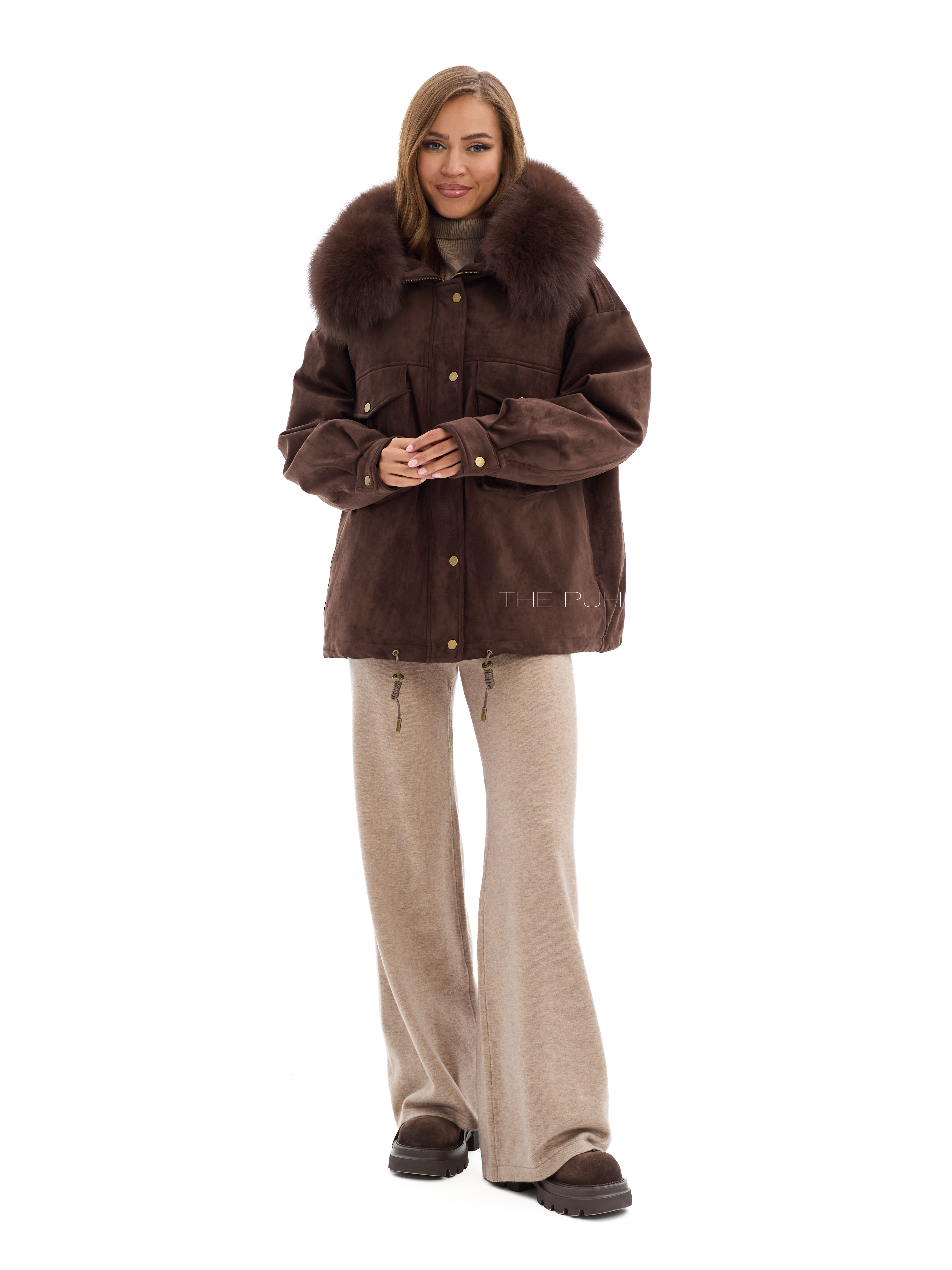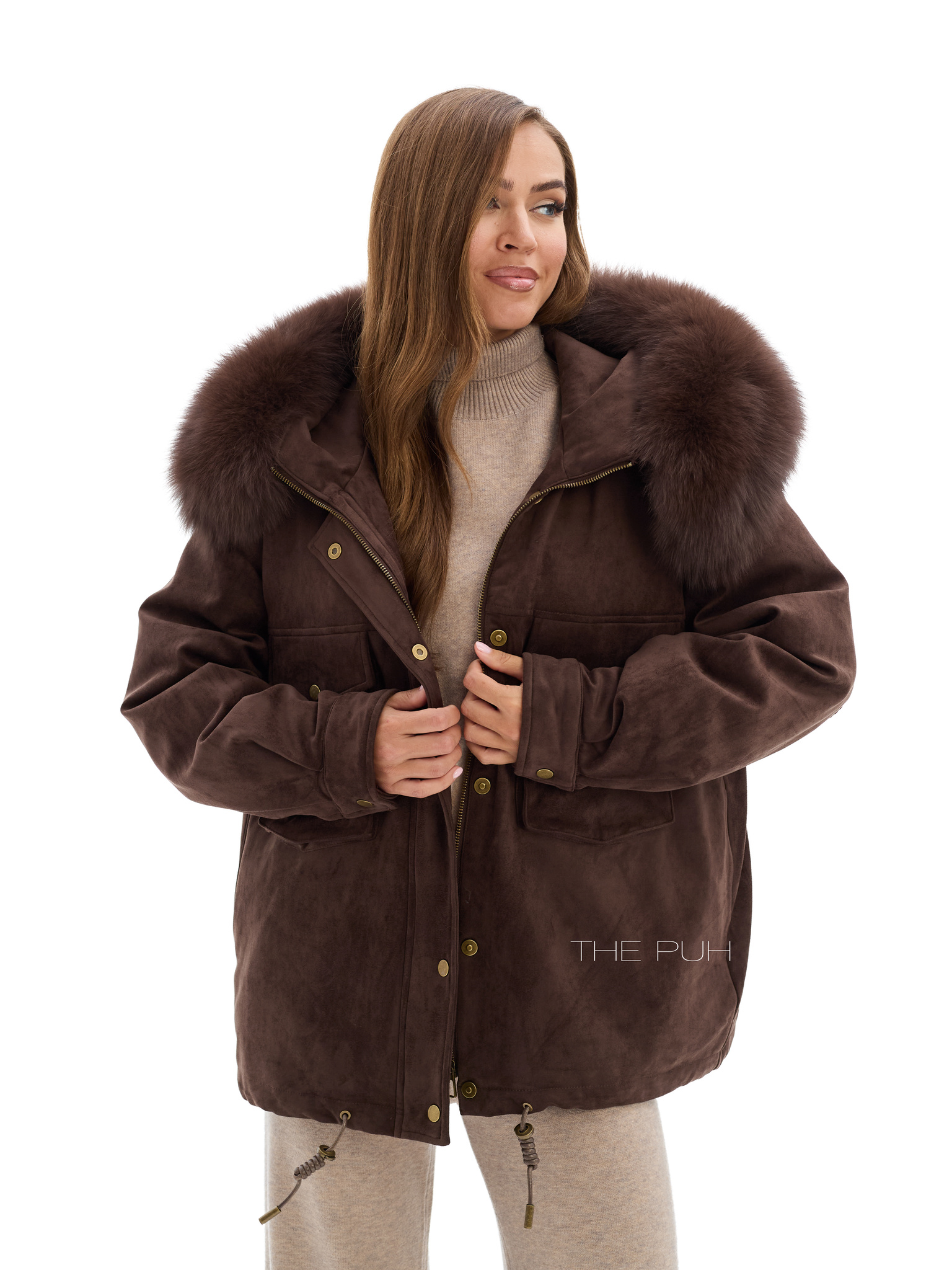 Объемная парка из мягкой замши шоколадного оттенка создает утонченный образ, подчеркивая безупречный вкус. Функциональные нагрудные карманы и роскошный съемный меховой воротник из меха песца добавляют образу практичности и статусности, а утеплитель из натурального пуха согреет в холодные дни.