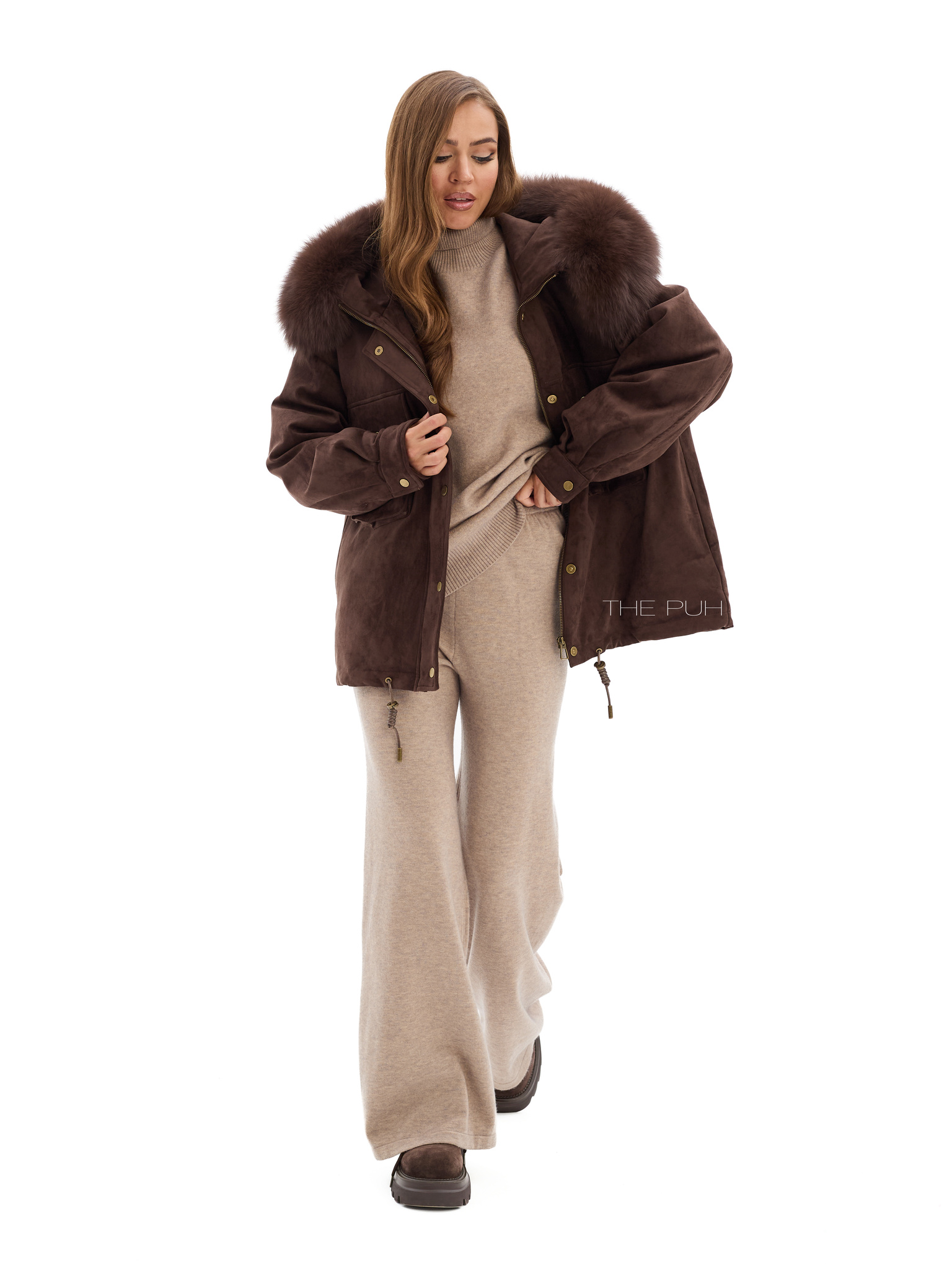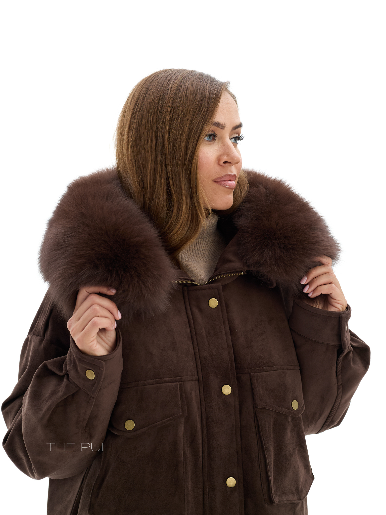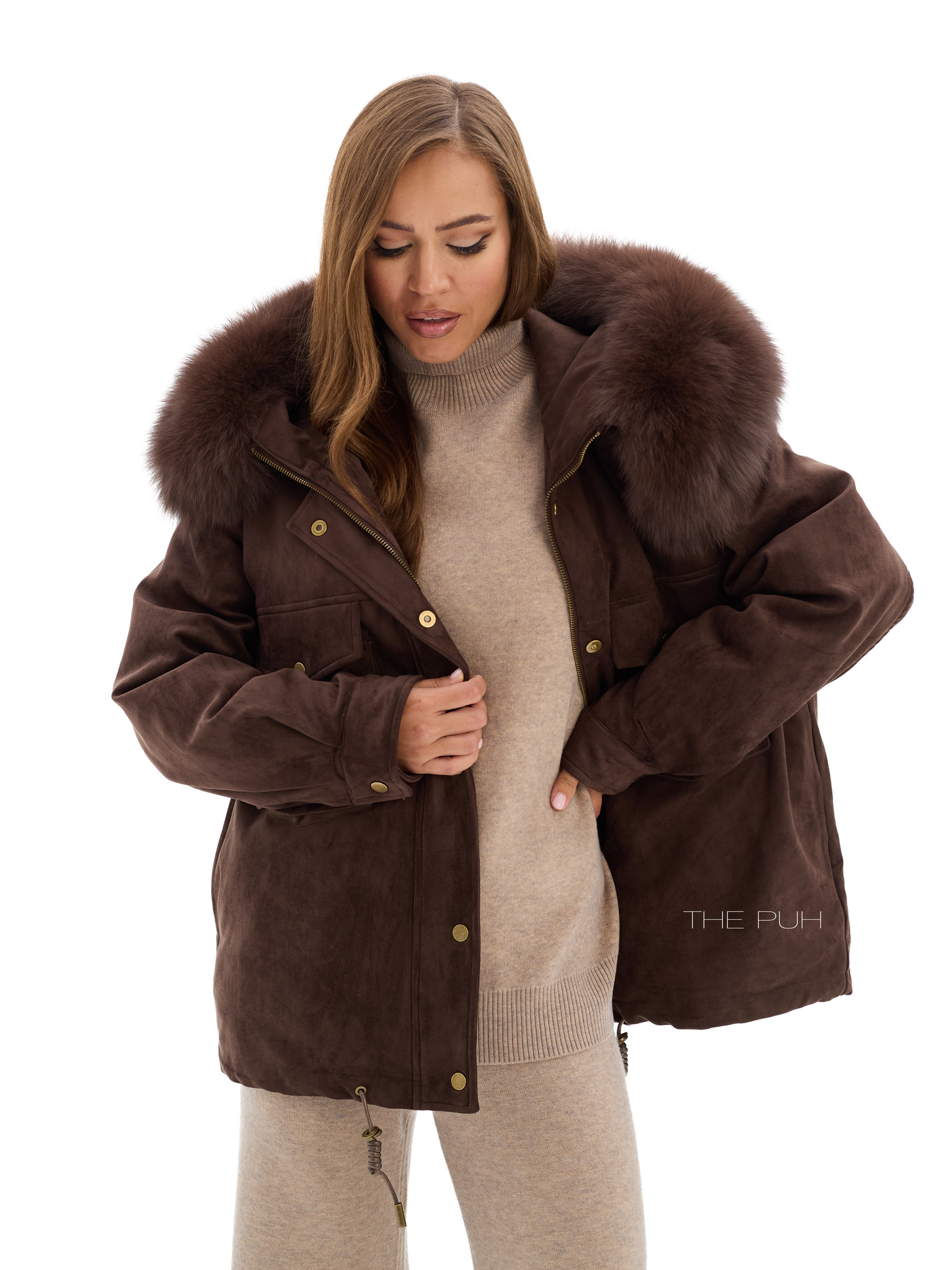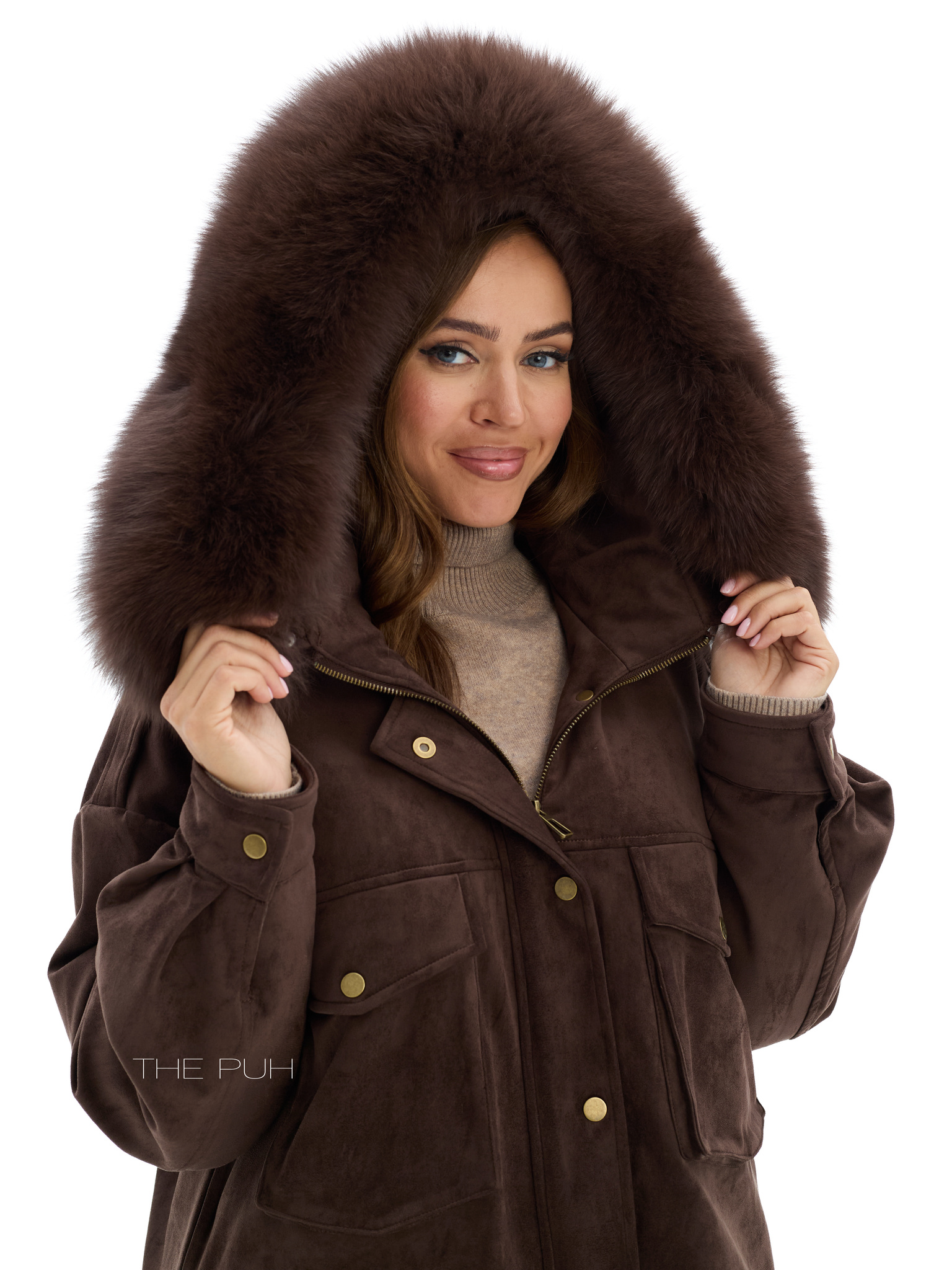 Объемная парка из мягкой замши шоколадного оттенка создает утонченный образ, подчеркивая безупречный вкус. Функциональные нагрудные карманы и роскошный съемный меховой воротник из меха песца добавляют образу практичности и статусности, а утеплитель из натурального пуха согреет в холодные дни.