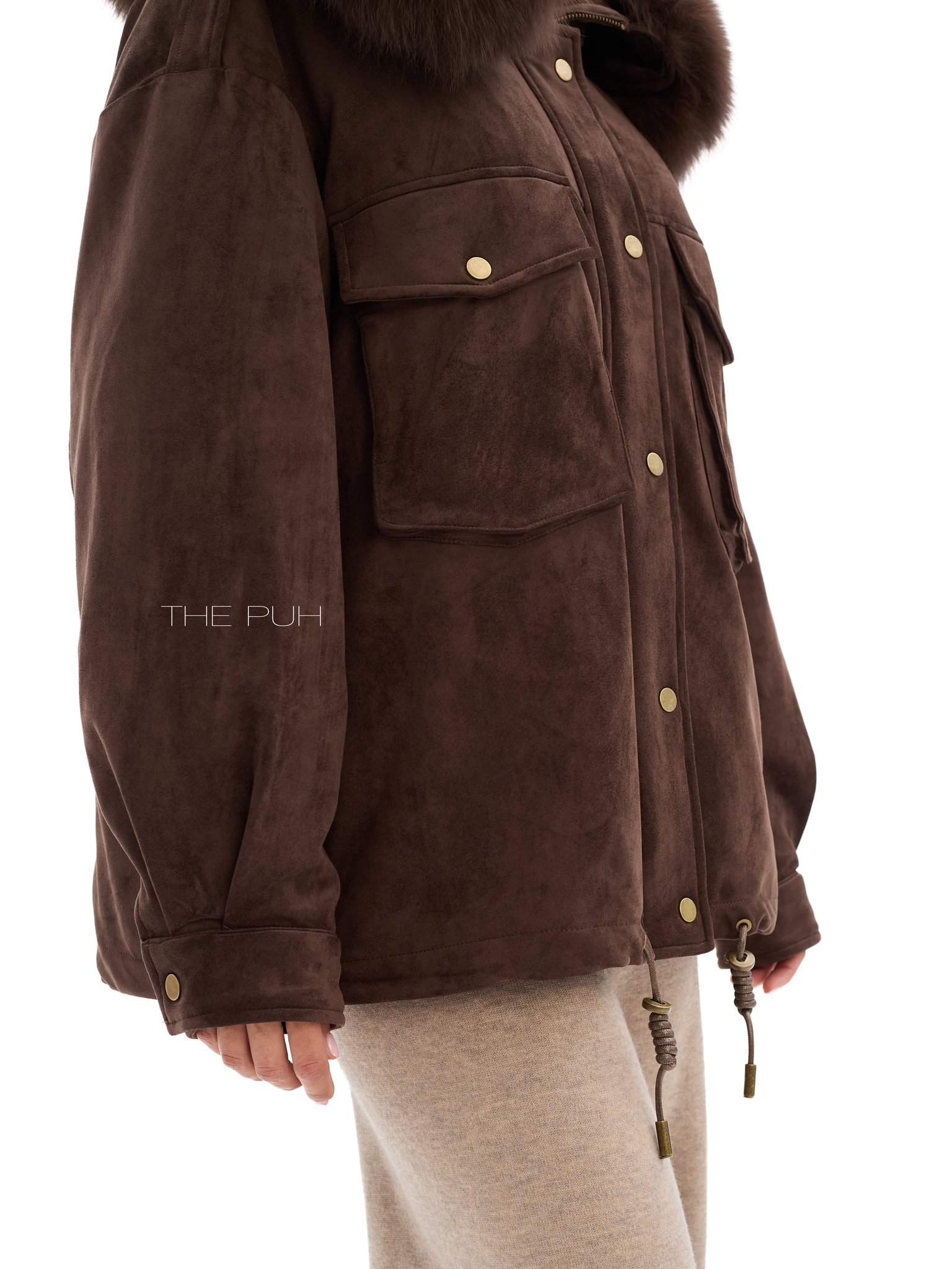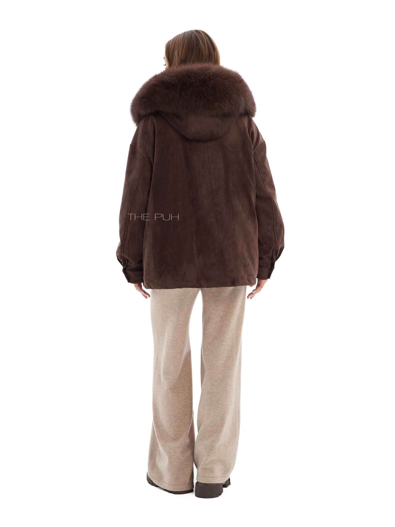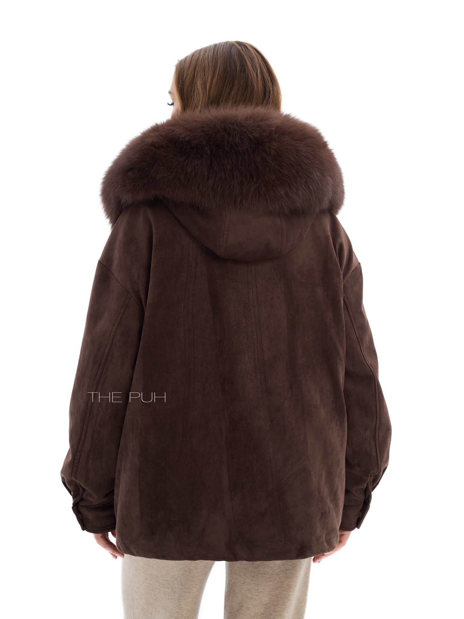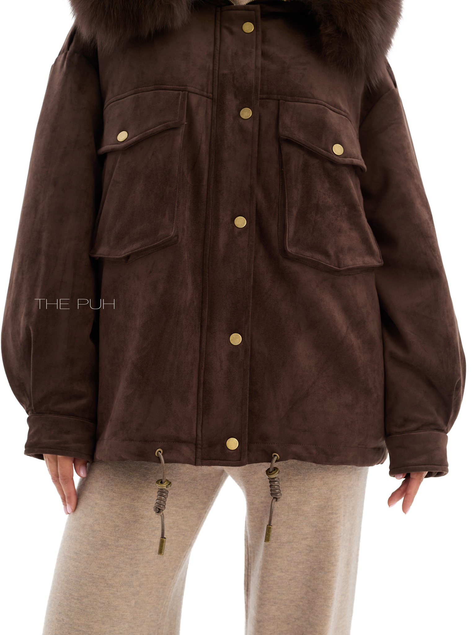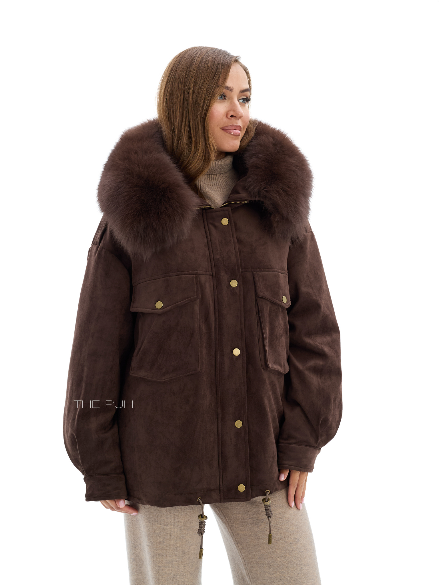 Объемная парка из мягкой замши шоколадного оттенка создает утонченный образ, подчеркивая безупречный вкус. Функциональные нагрудные карманы и роскошный съемный меховой воротник из меха песца добавляют образу практичности и статусности, а утеплитель из натурального пуха согреет в холодные дни.